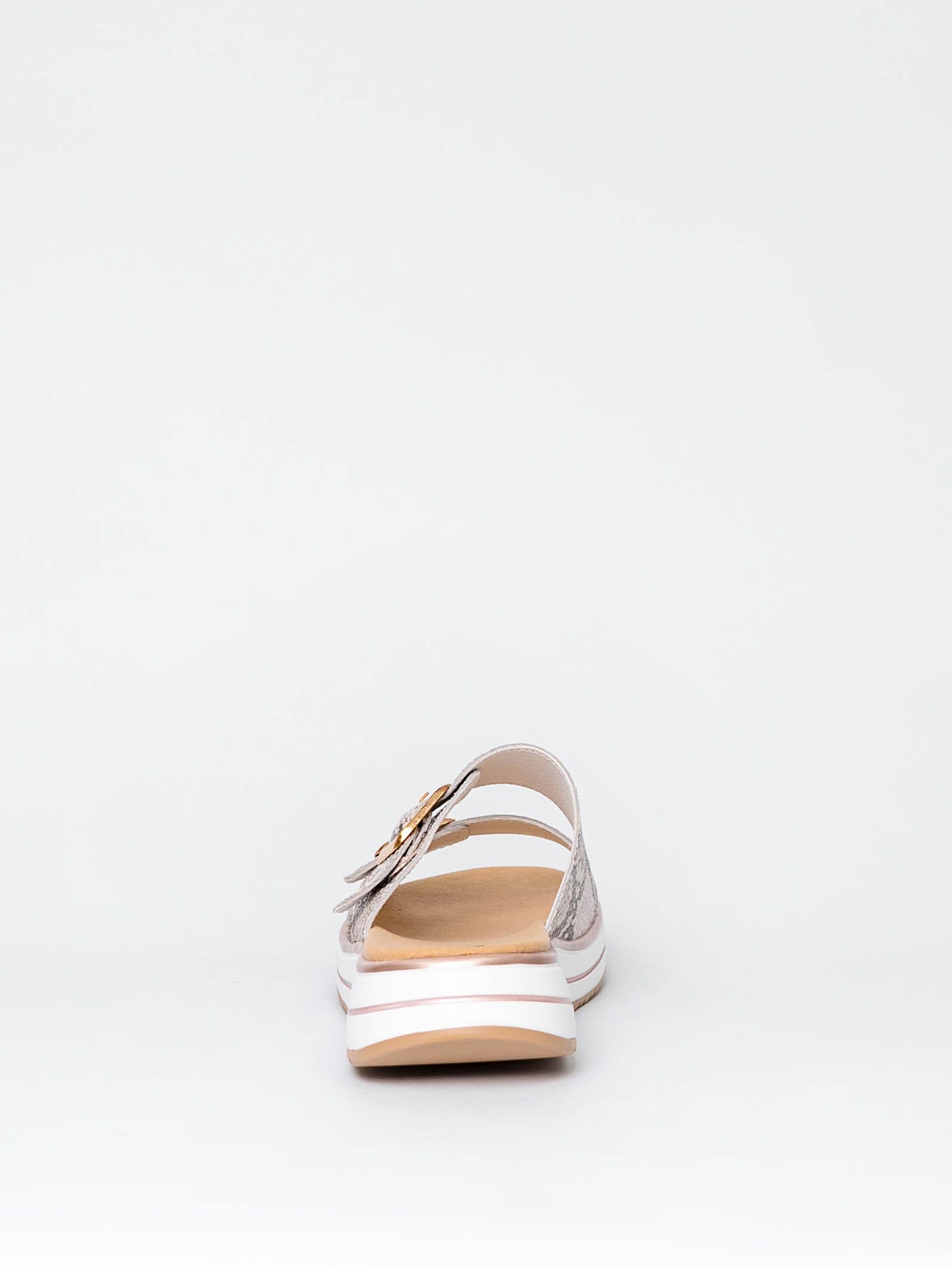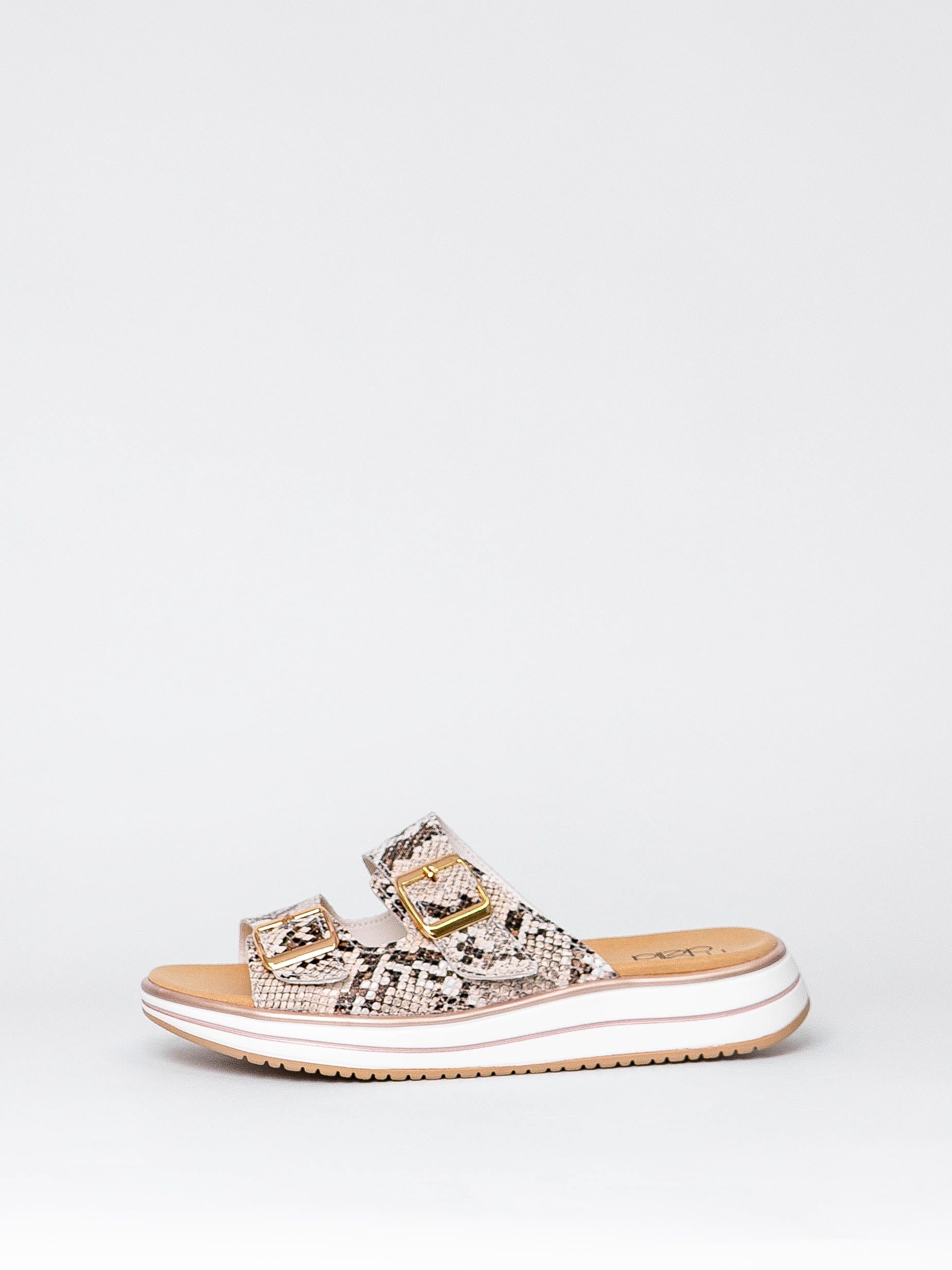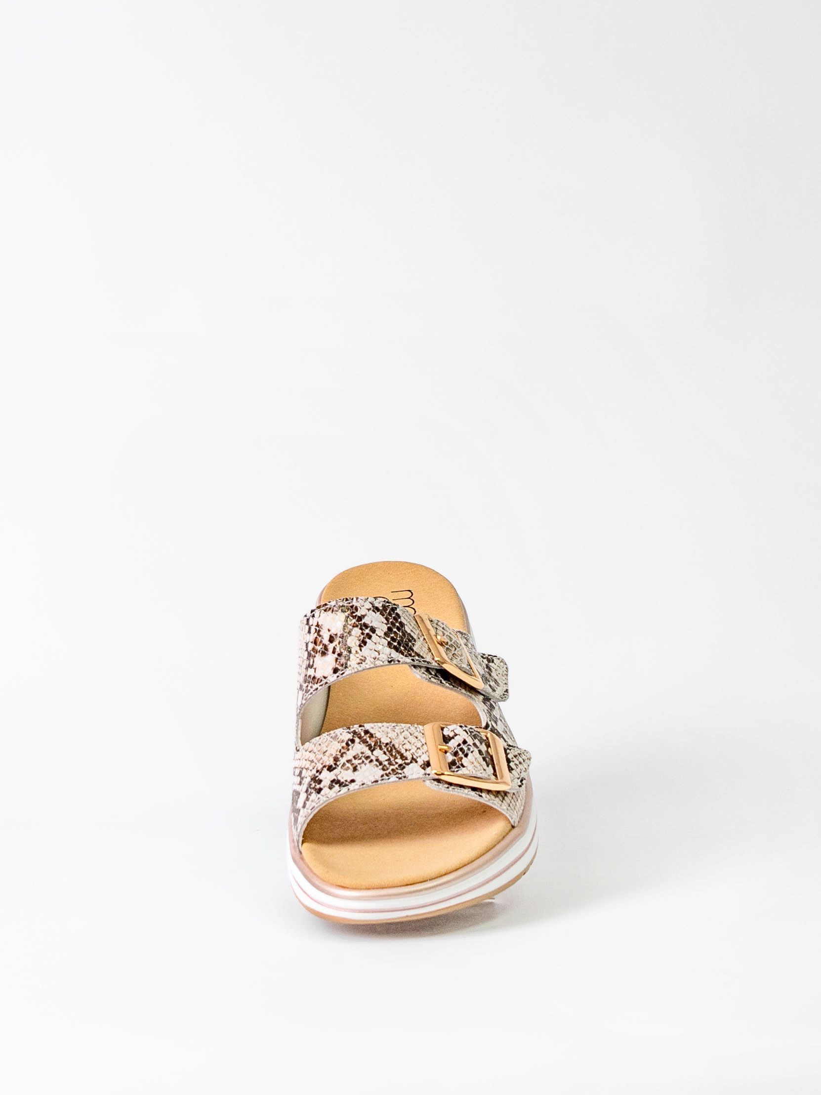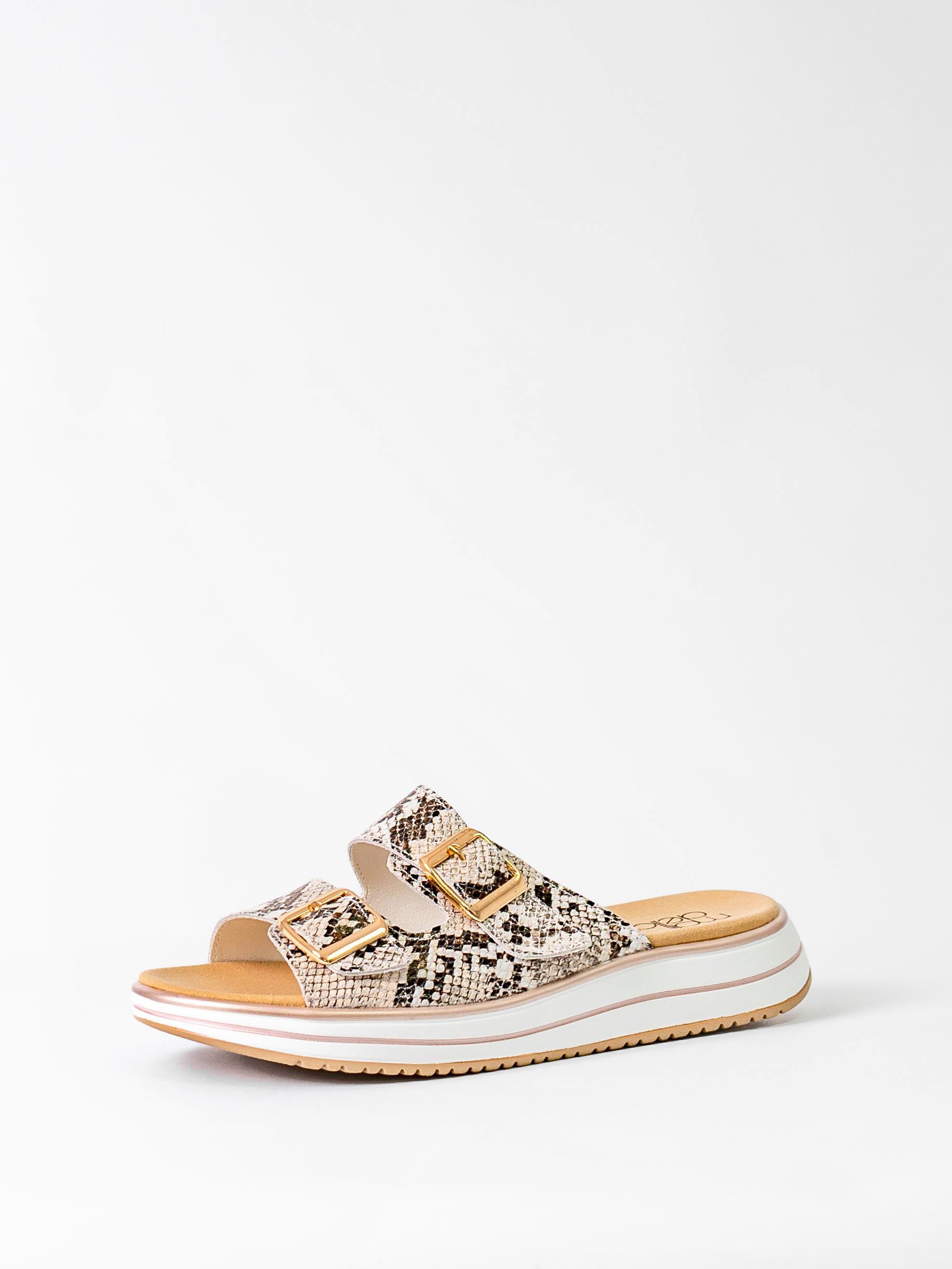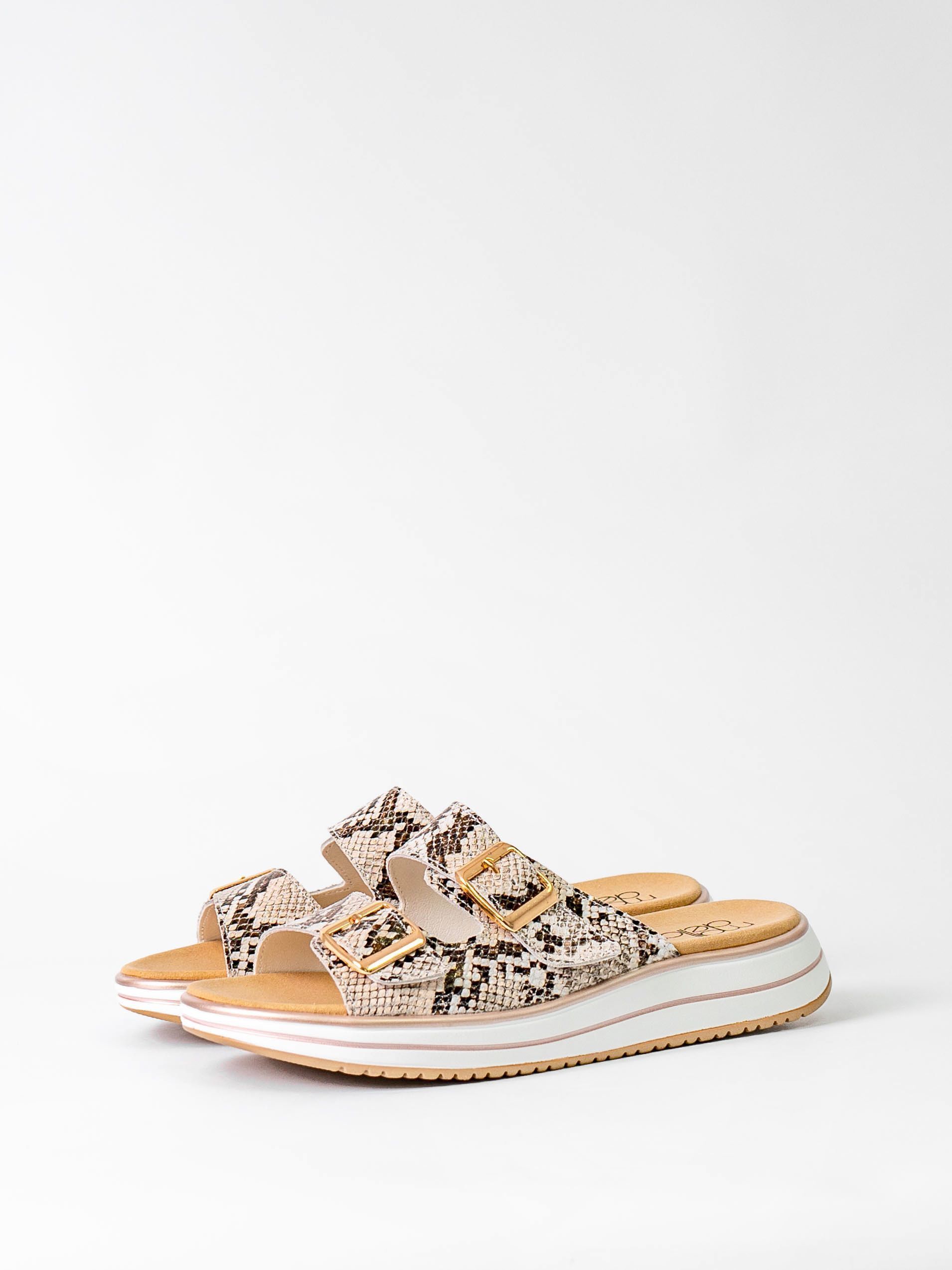 Сабо бежевого цвета со змеиным принтом сочетаются с разной палитрой одежды и сделают Ваш образ более ярким и привлекательным.