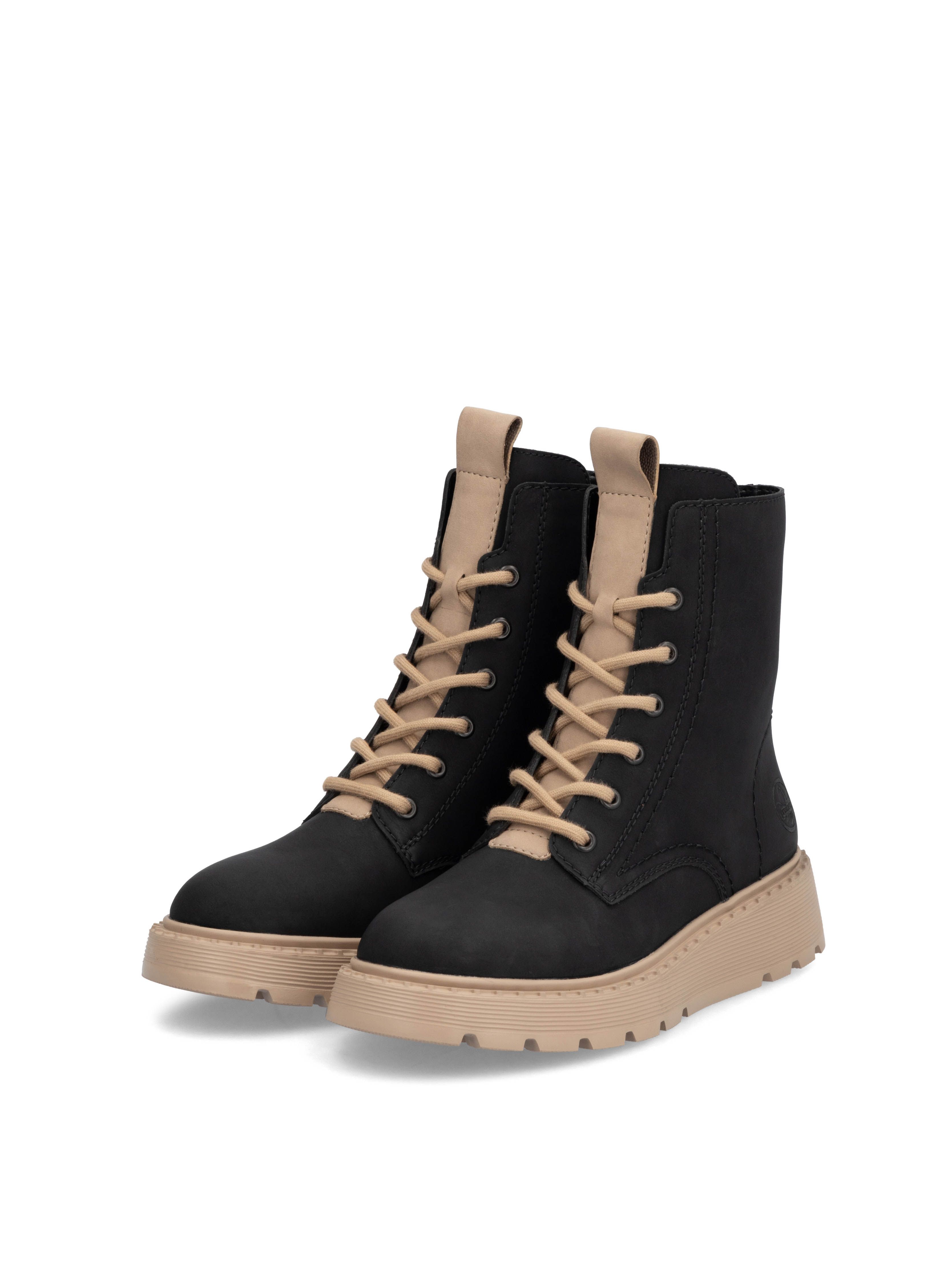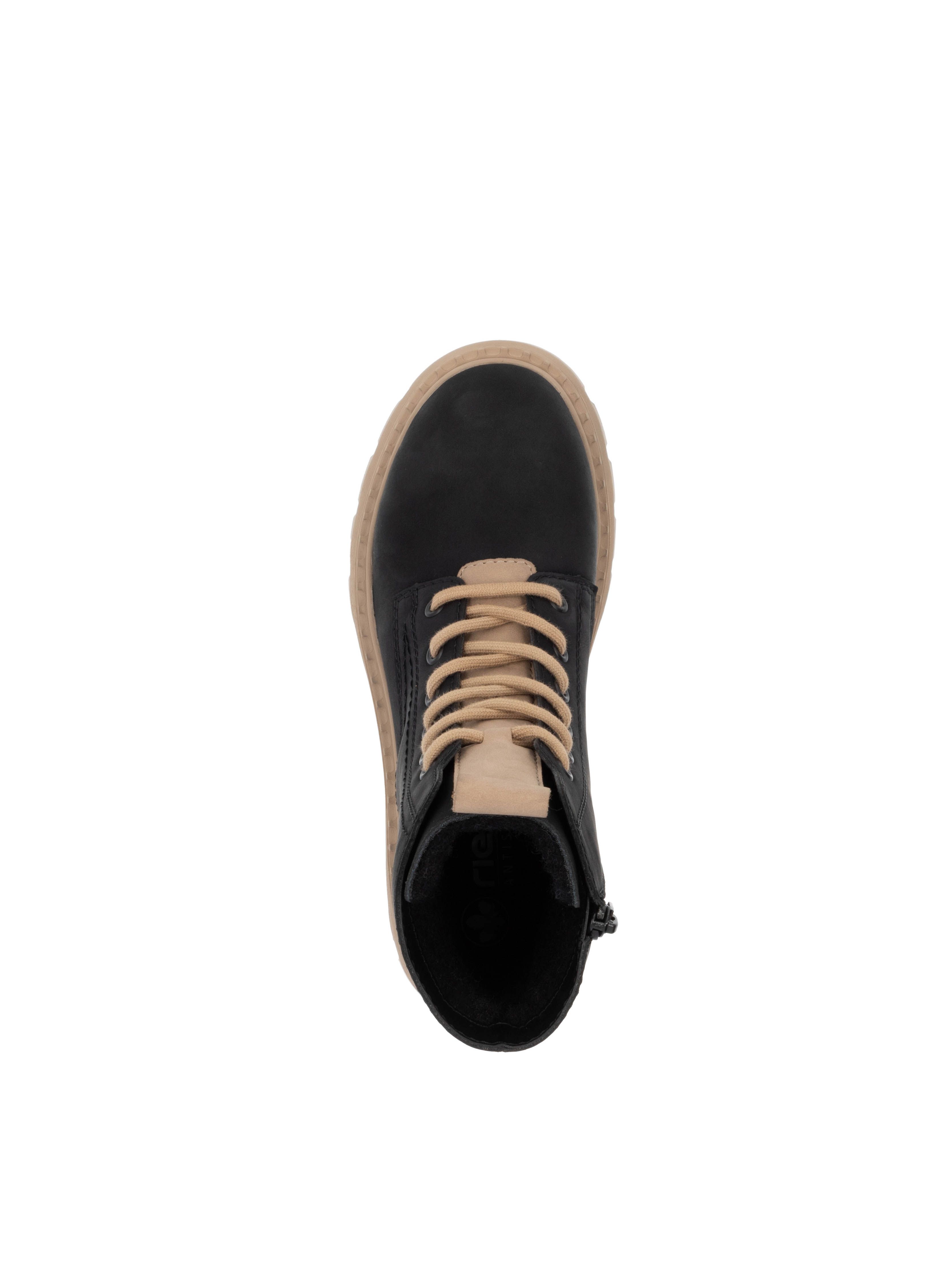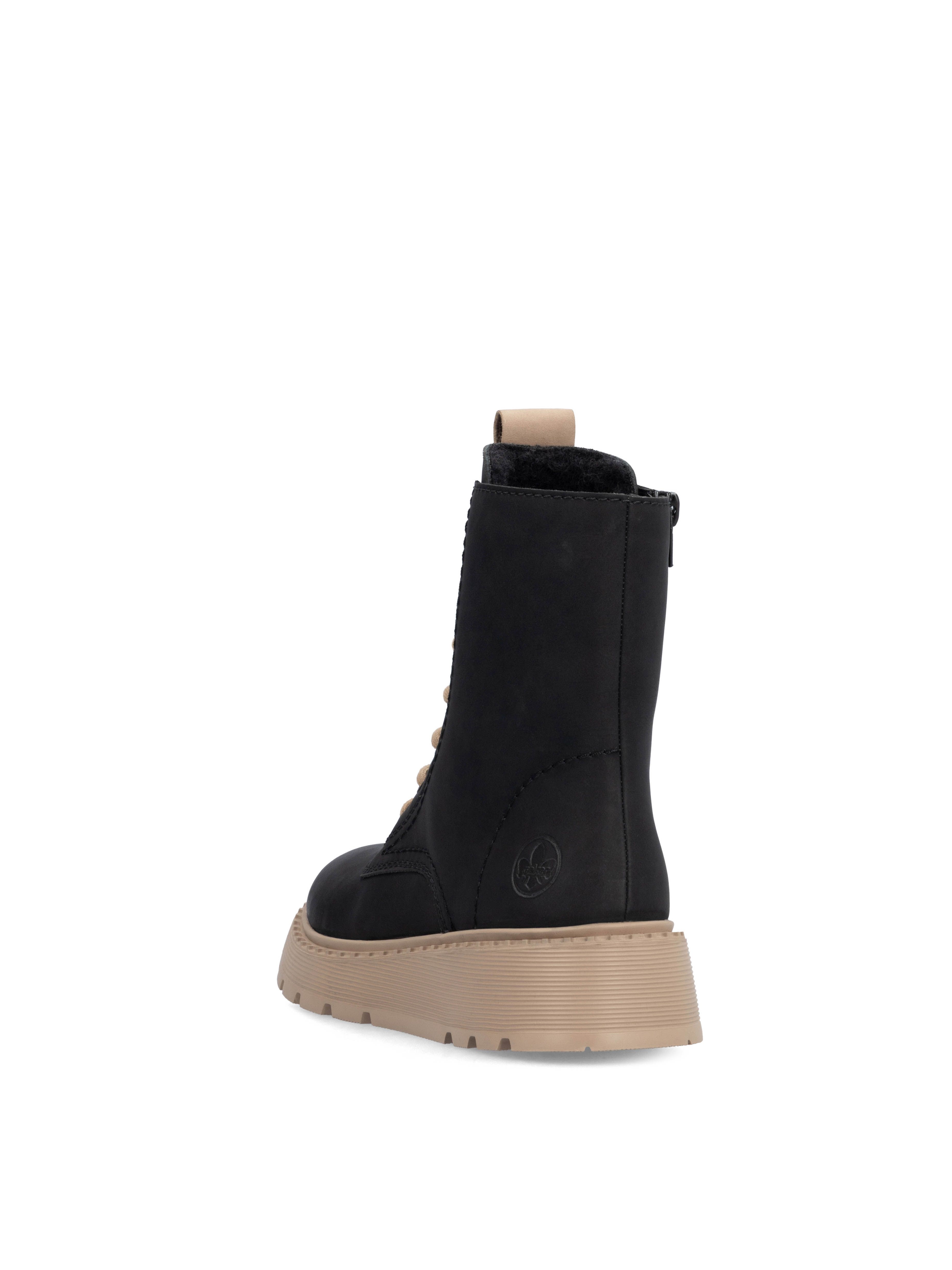 Рекомендуем рассмотреть черные женские ботинки на молнии и шнурках от бренда Rieker, сочетающие в себе качество, комфорт, простой и современный дизайн.