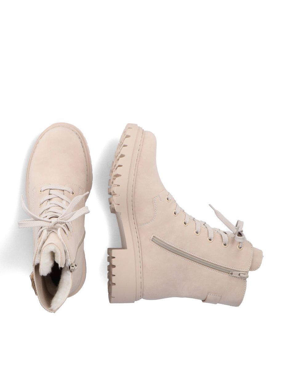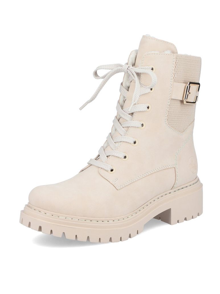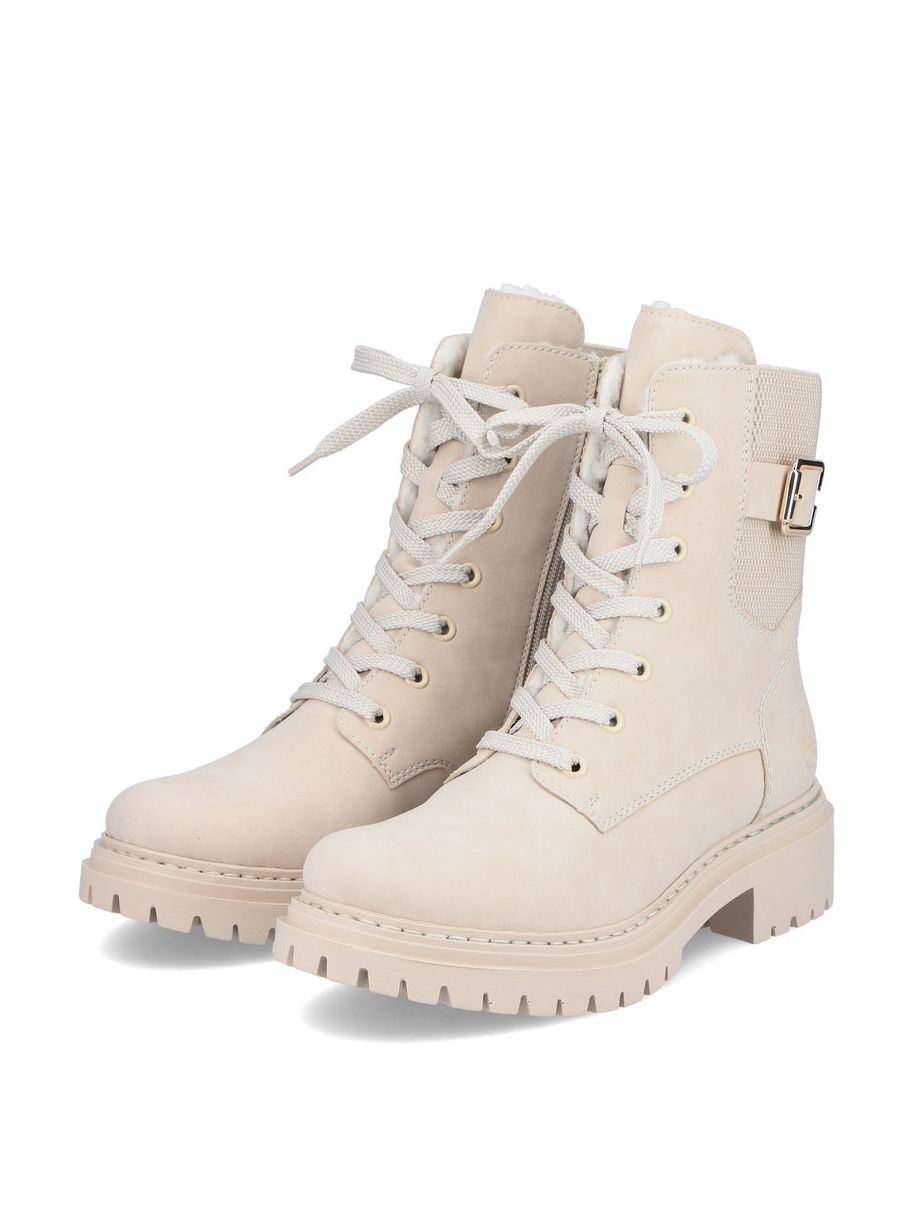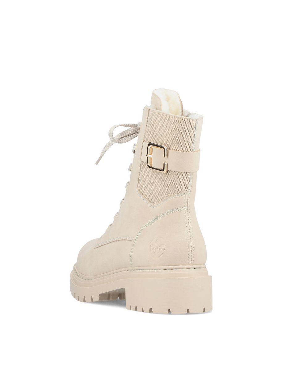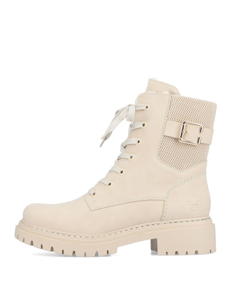 Рекомендуем рассмотреть бежевые женские высокие ботинки на шнурках от немецкого бренда Rieker, сочетающие в себе качество, комфорт, простой и современный дизайн