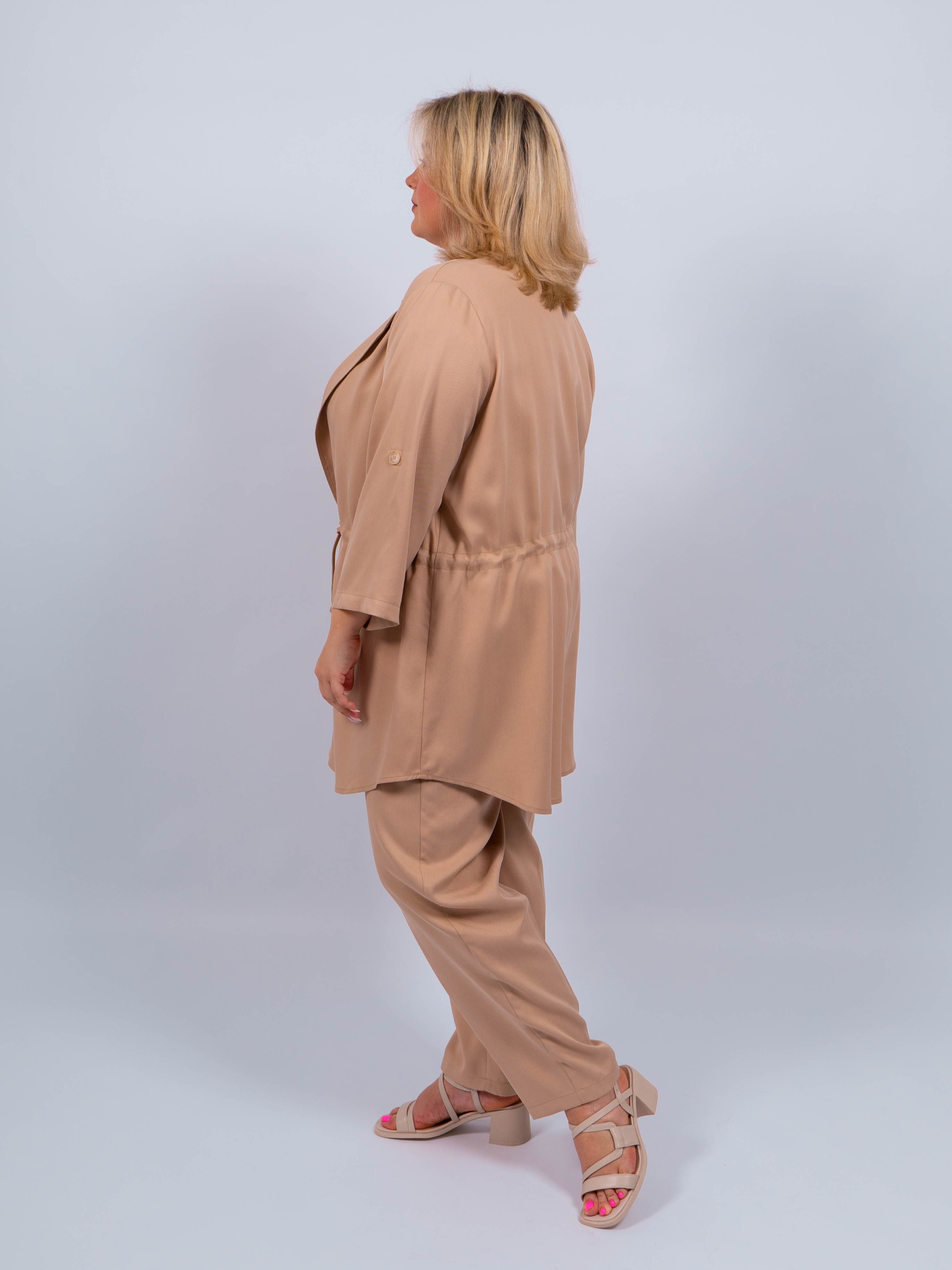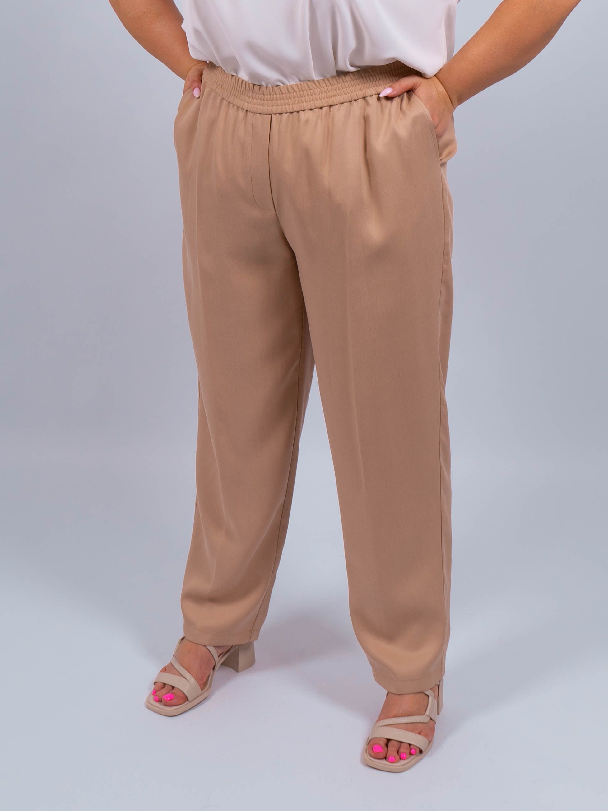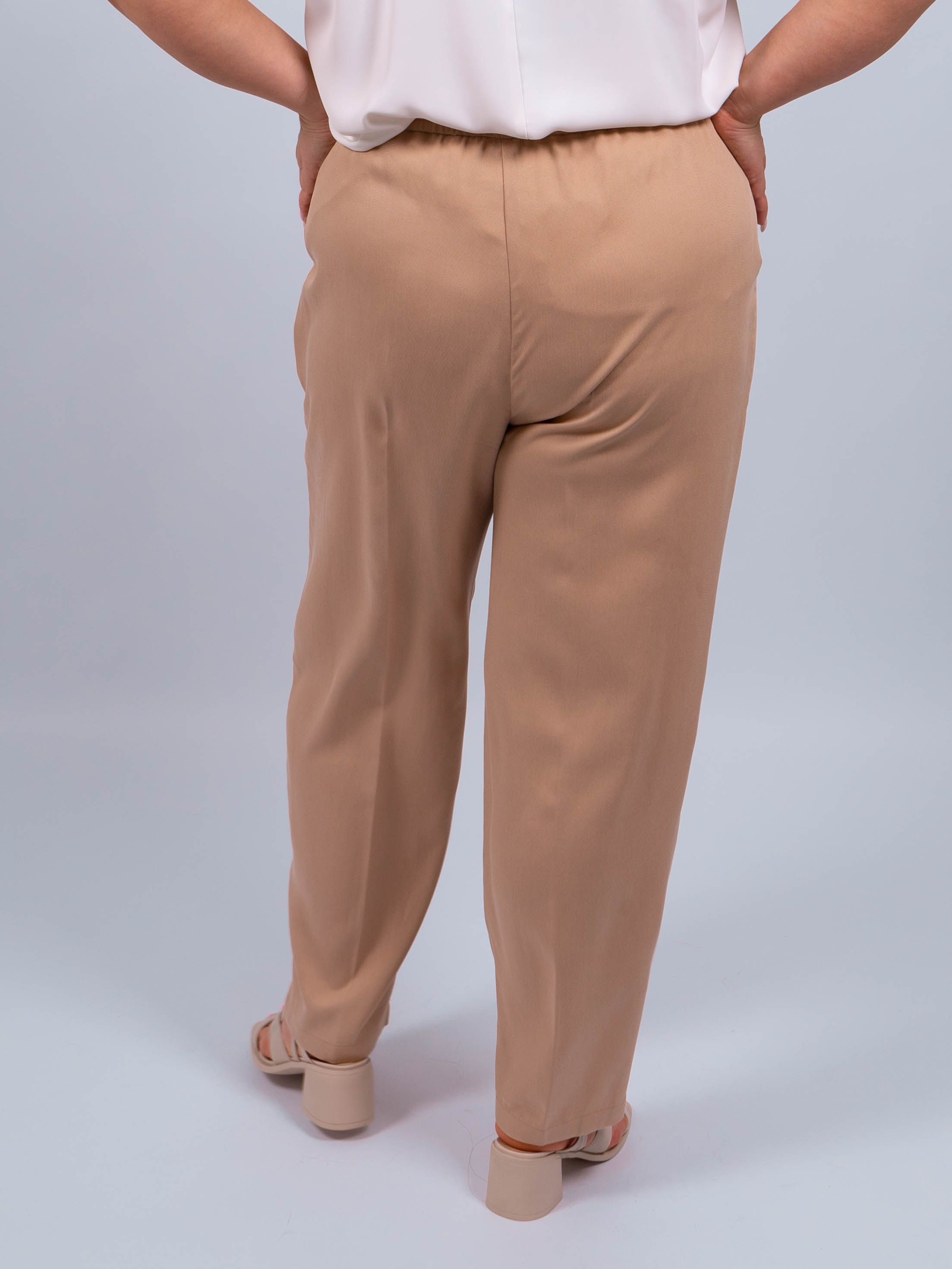 Брюки выполнены из высококачественного материала, обеспечивающего комфорт и приятные тактильные ощущения. Песочный цвет придает им особый шарм и стильный вид.