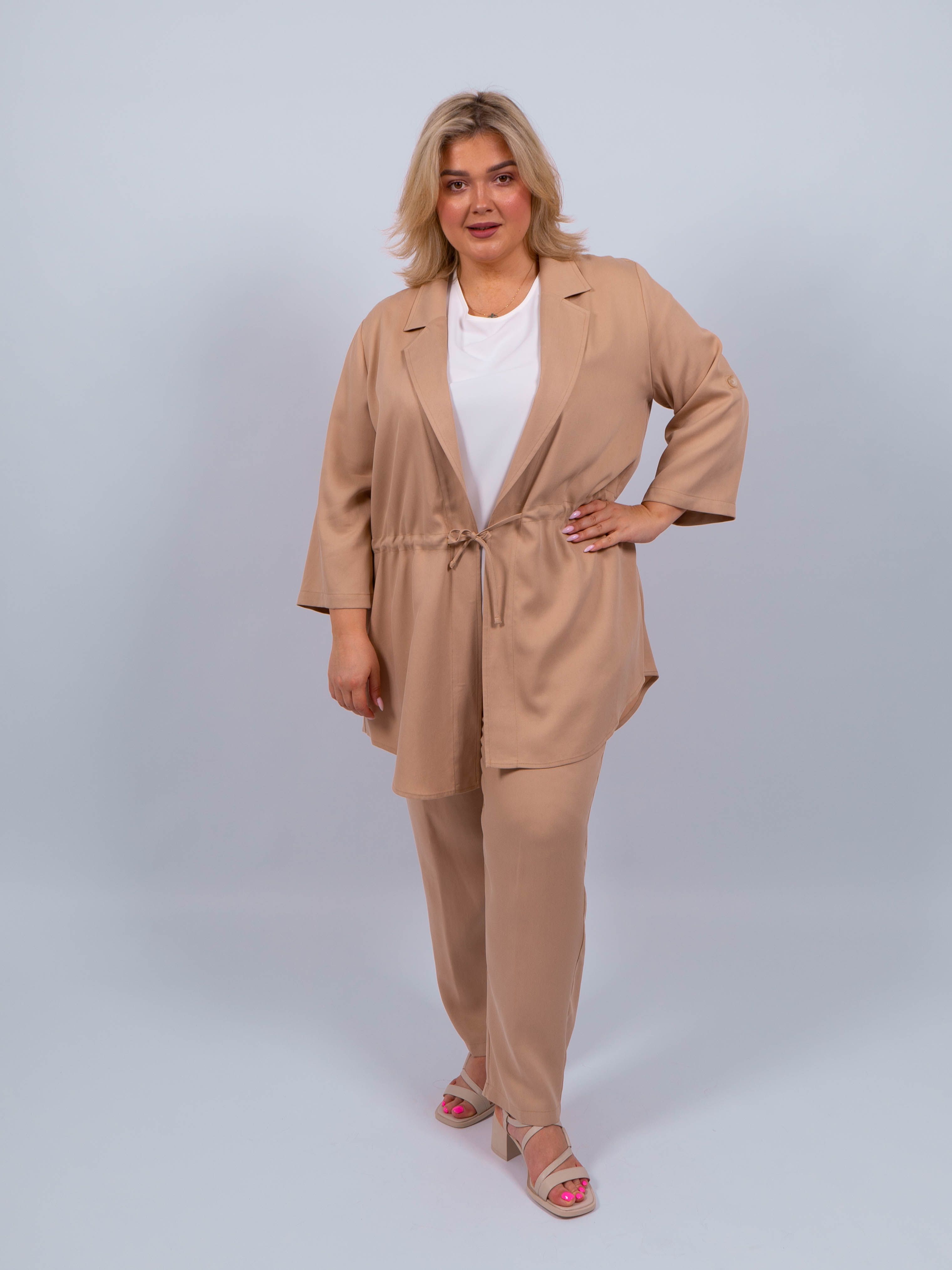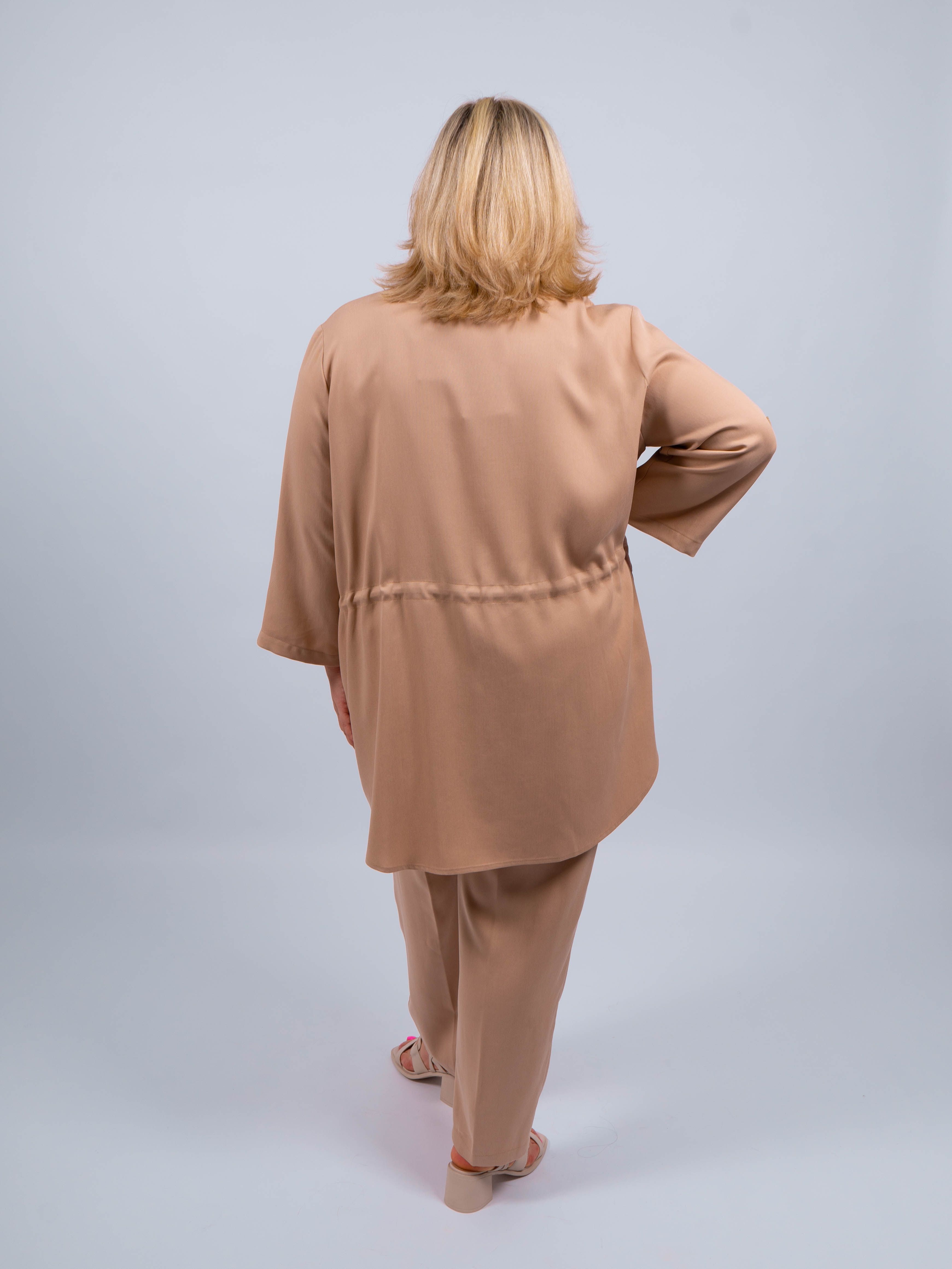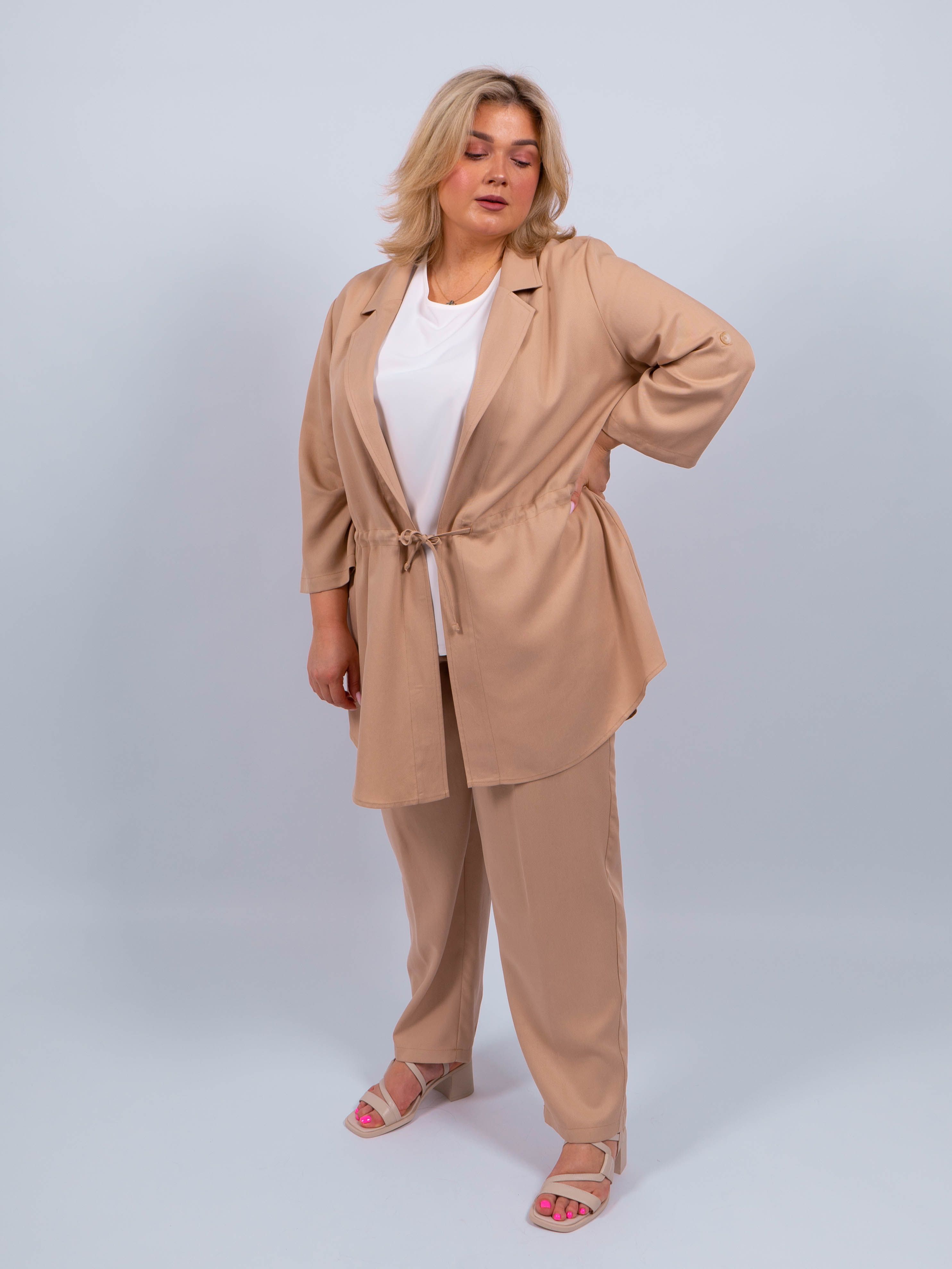 Брюки выполнены из высококачественного материала, обеспечивающего комфорт и приятные тактильные ощущения. Песочный цвет придает им особый шарм и стильный вид.
