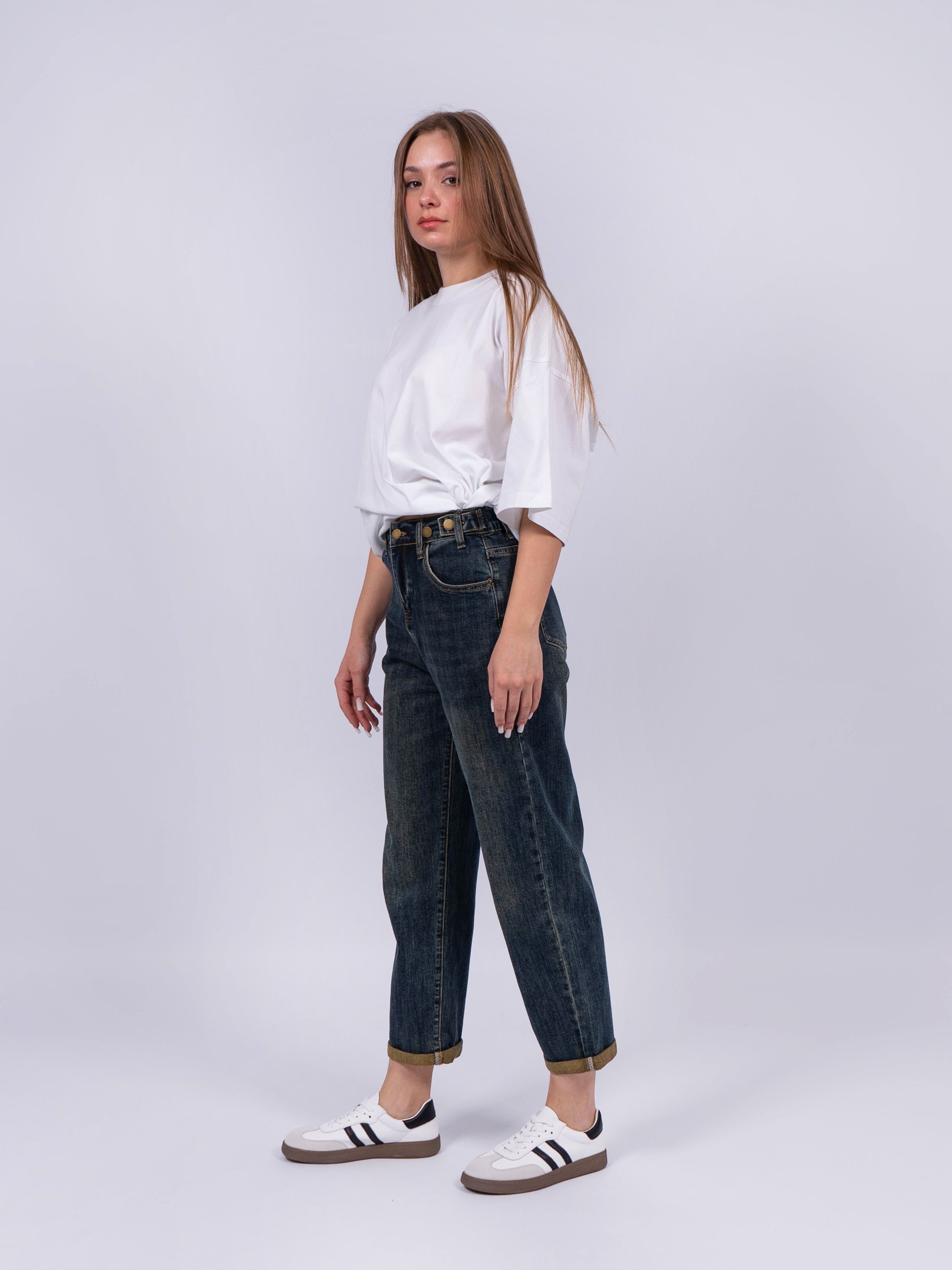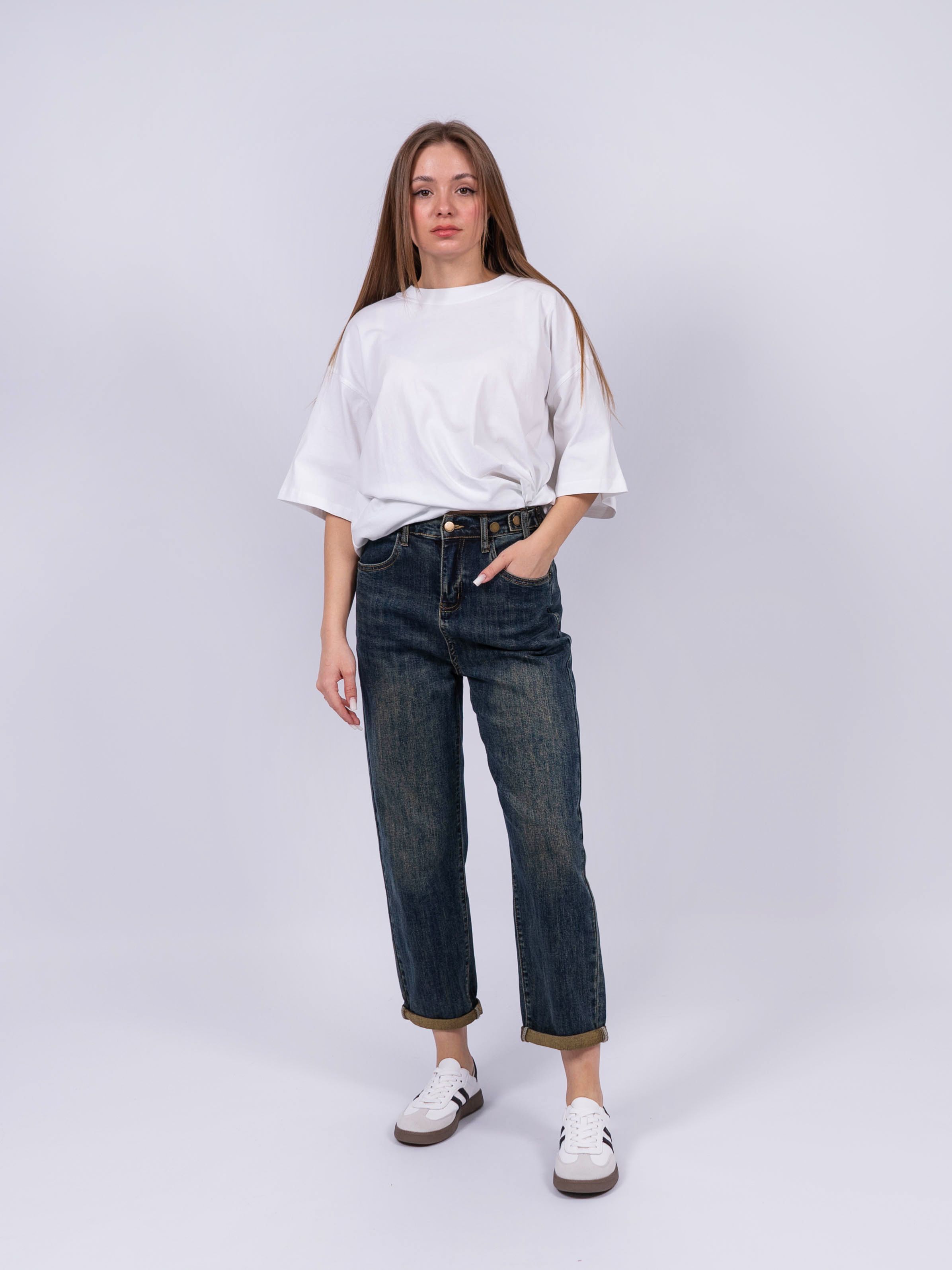 Эти женские джинсы с эффектом потертости, мом (mom) джинсы - повседневная классика для любой девушки. Модные, стильные джинсы стрейч из мягкой ткани, которая состоит из хлопка и спандекса, впишутся в гардероб каждой представительницы прекрасного пола и будут гармонировать с любым стилем одежды будь это оверсайз (oversize) или стиль кэжуал (casual), вечерний наряд или офисный деловой стиль. Молодежные момсы можно использовать как уличную, школьную и домашнюю вещь. Джинсы бананы свободного кроя широко сидят на бедре, а штанины имеют к низу зауженную форму. Их можно сочетать с различными вещами, верхней одеждой, аксессуарами и создавать классические, офисные, нарядные и праздничные образы. Завышенные штаны с удобной посадкой на талии имеют застежку на пуговице и молнии на поясе, обеспечивают комфорт во время носки. Стильные, модные, красивые джинсы подходят подросткам, молодым девушкам, так и взрослым женщинам. Джинсы прямого кроя можно носить в весенний, летний и осенний период. Качественный плотный материал не дает усадку, не линяет и сохраняет свой первоначальный вид. Вещи из денима (denim) не теряют свою актуальность уже долгое время.