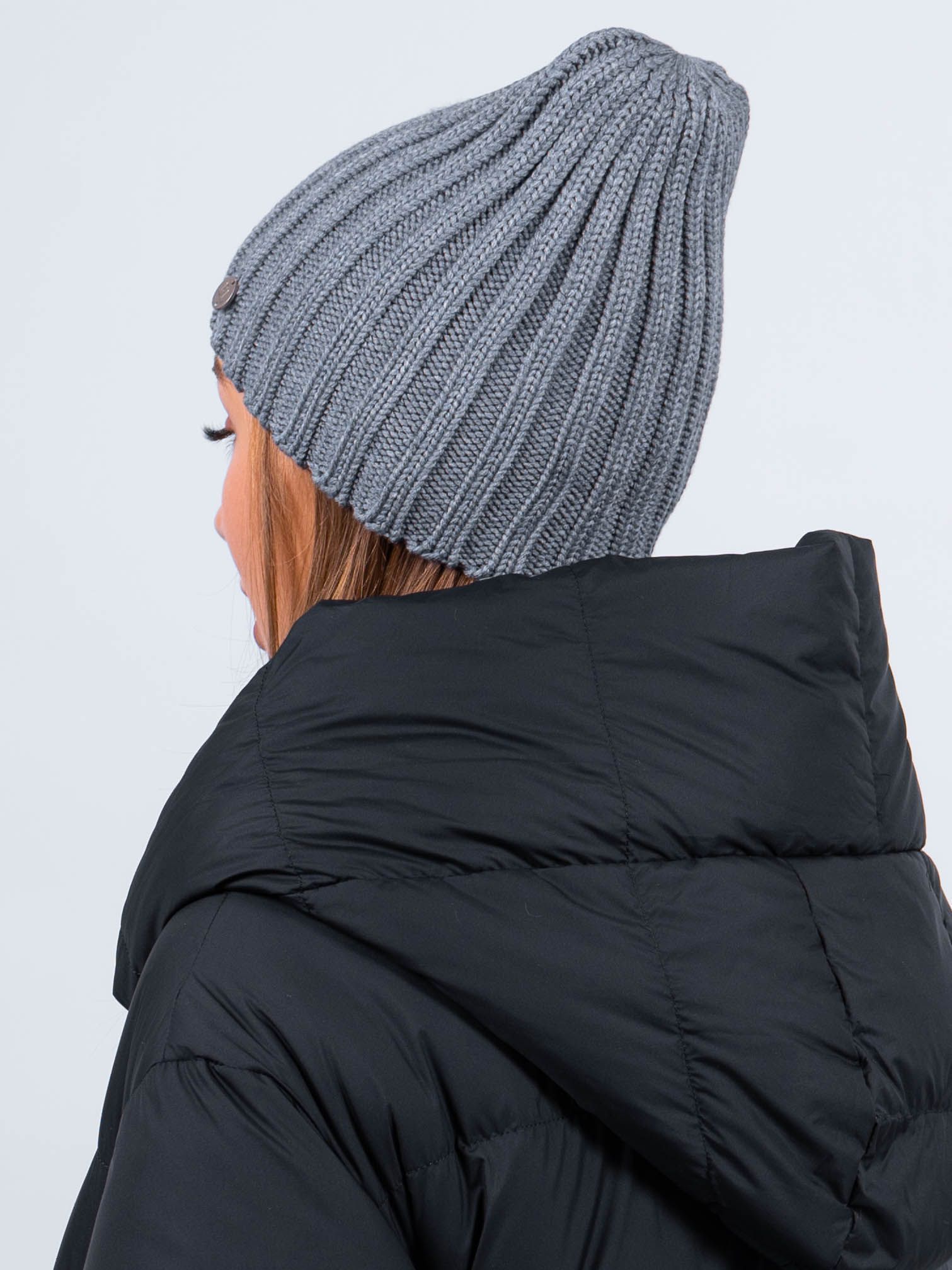 Вязаная шапка темно-серого цвета с декоративной фурнитурой – это идеальный выбор для тех, кто ценит комфорт и уют в холодное время года.