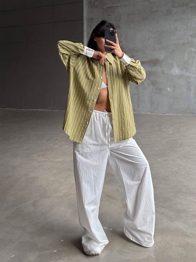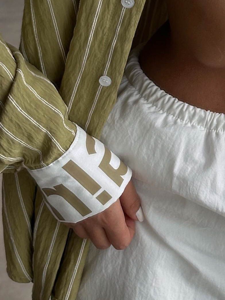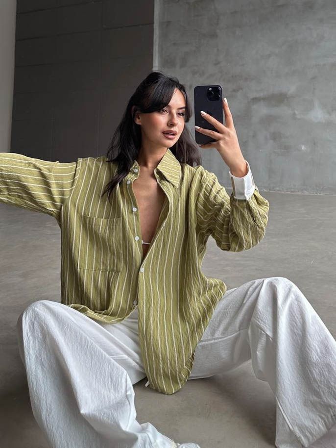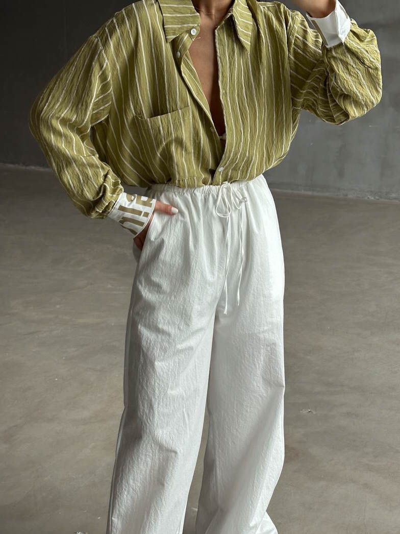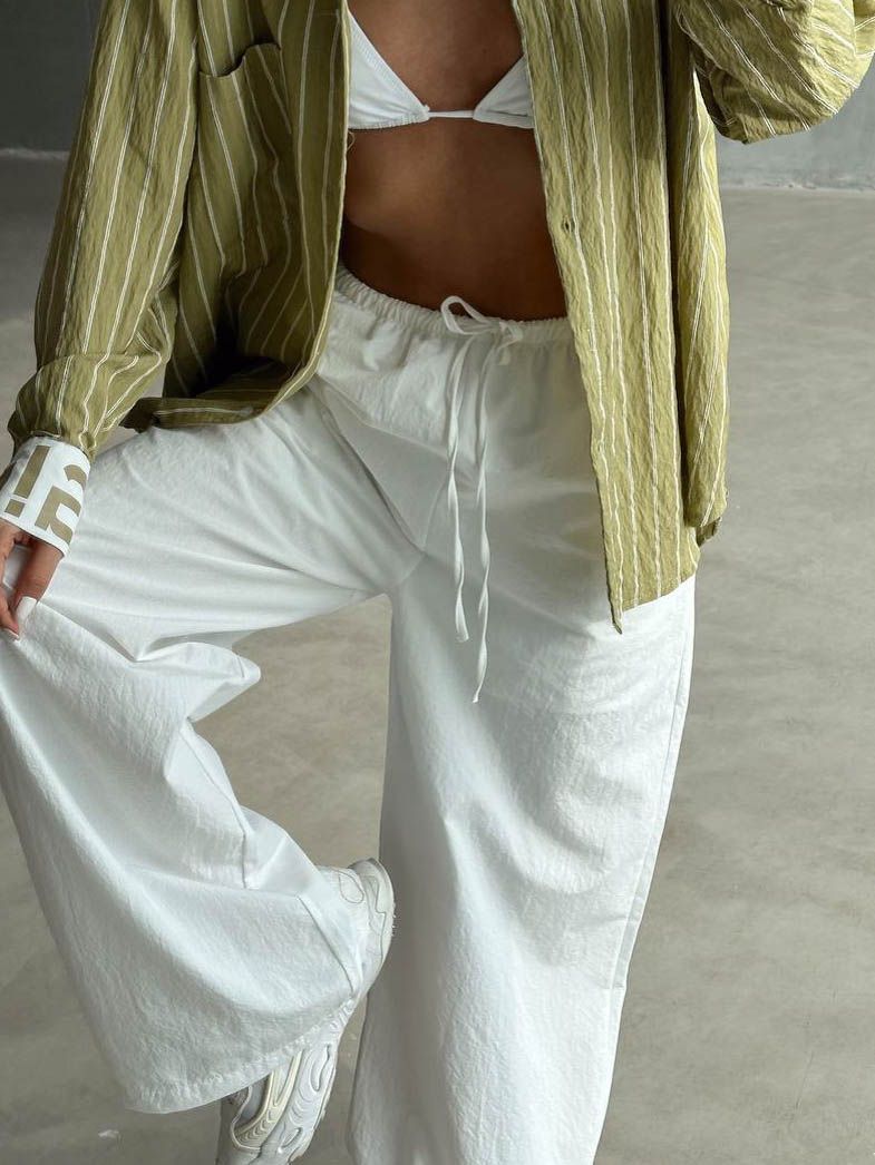 Летний женский легкий брючный костюм свободного кроя. Этот стильный и комфортный костюм станент незаменимым в вашем гардеробе для отпуска, пляжа и повседневных прогулок. Дышащий материал делает костюм максимально комфортным в жаркую погоду. Брюки палаццо однотонные белые отлично сочетаются с классической рубашкой в полоску в пижамном стиле зеленого цвета. Рубашка имеет классический ворот, застежку на пуговицах, длинный рукав с манжетой. Наш женский костюм отличный вариант для женщин всех возрастов и типов фигуры.
