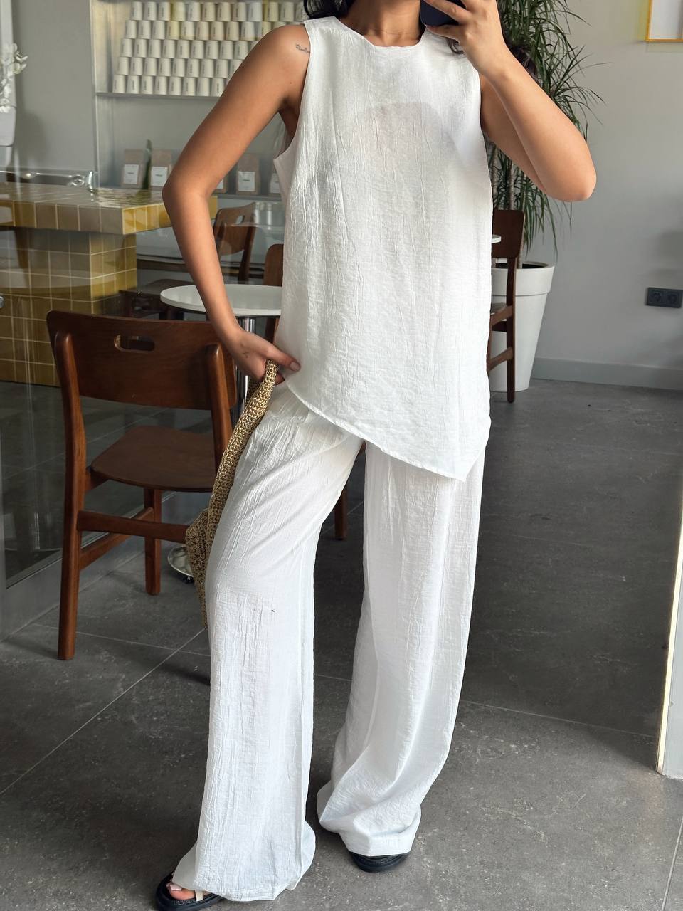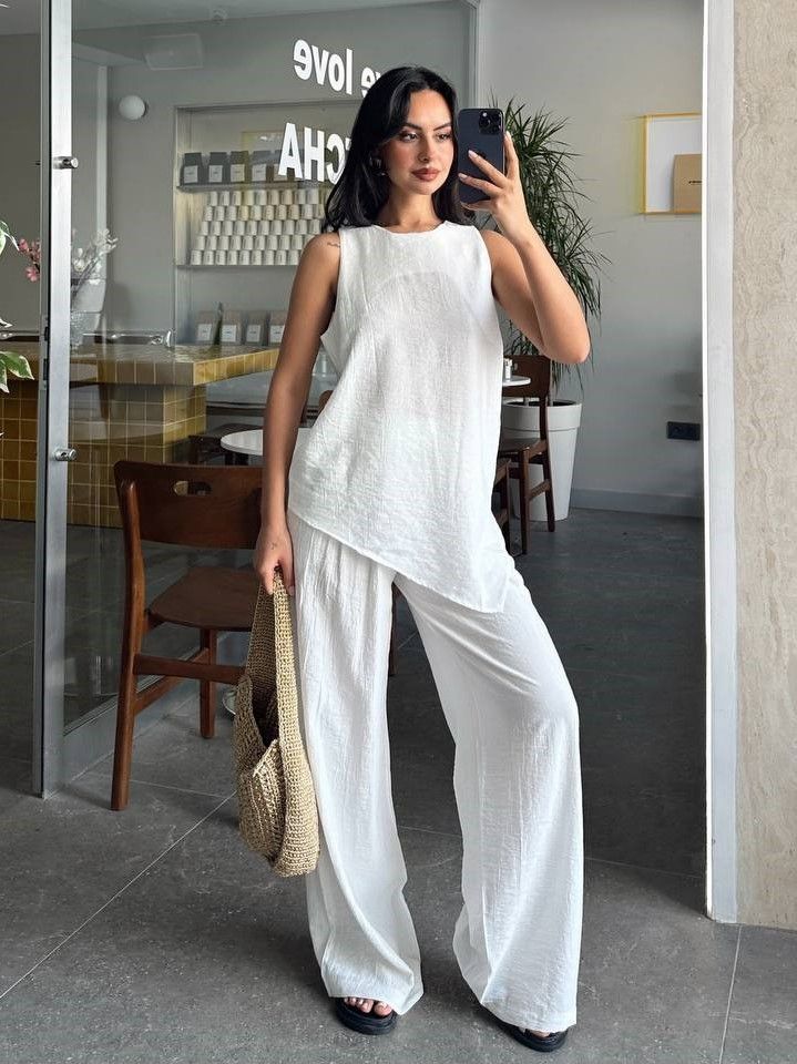 Летний женский легкий брючный костюм белого цвета свободного кроя. Этот стильный и комфортный костюм станент незаменимым в вашем гардеробе для отпуска, пляжа и повседневных прогулок. Дышащий материал делает костюм максимально комфортным в жаркую погоду. Брюки палаццо однотонные на резинке с карманами отлично сочетаются с топом без рукава. Кофта имеет круглый вырез и ассиметричный низ. Наш женский костюм отличный вариант для женщин всех возрастов и типов фигуры.
