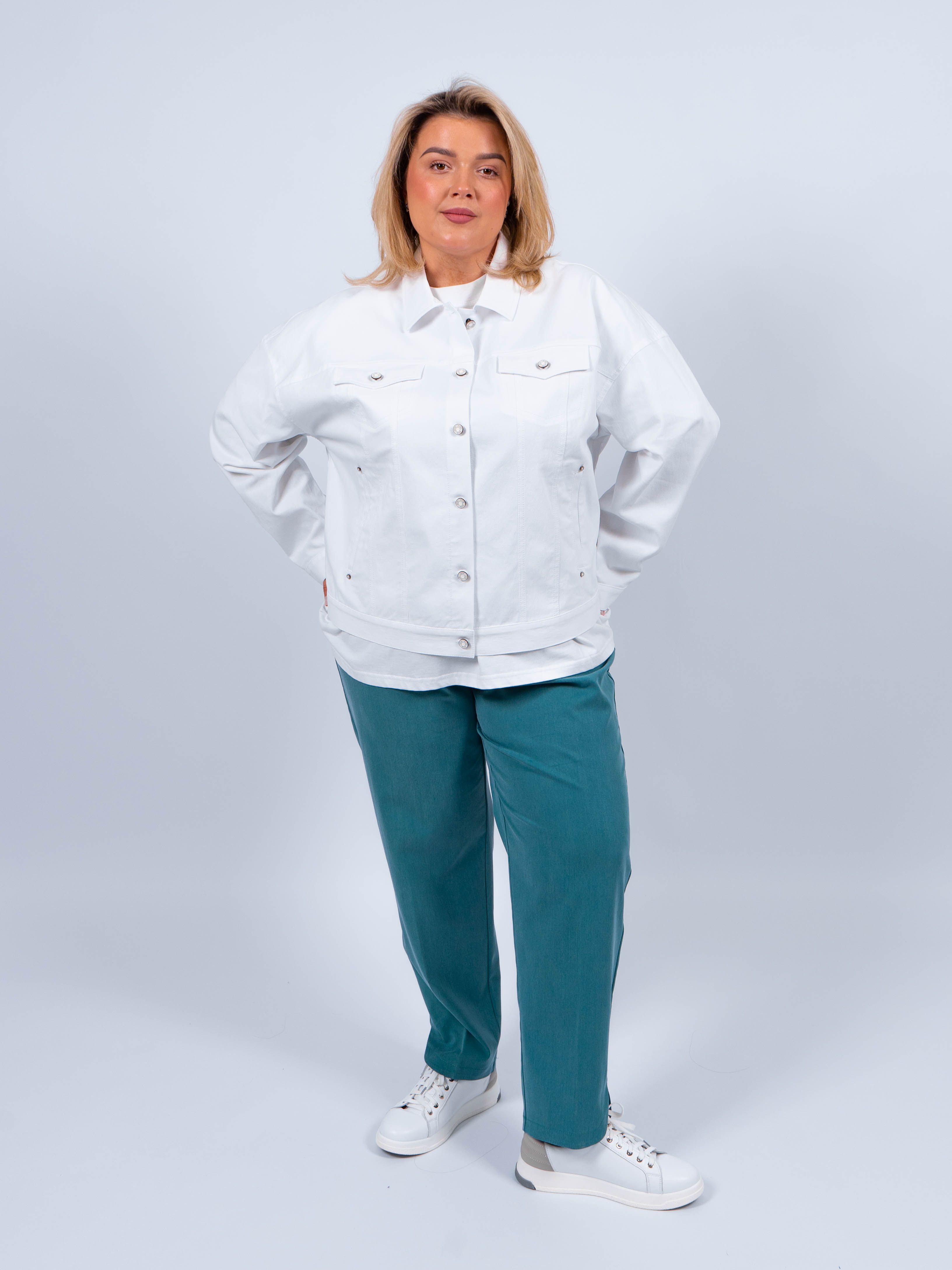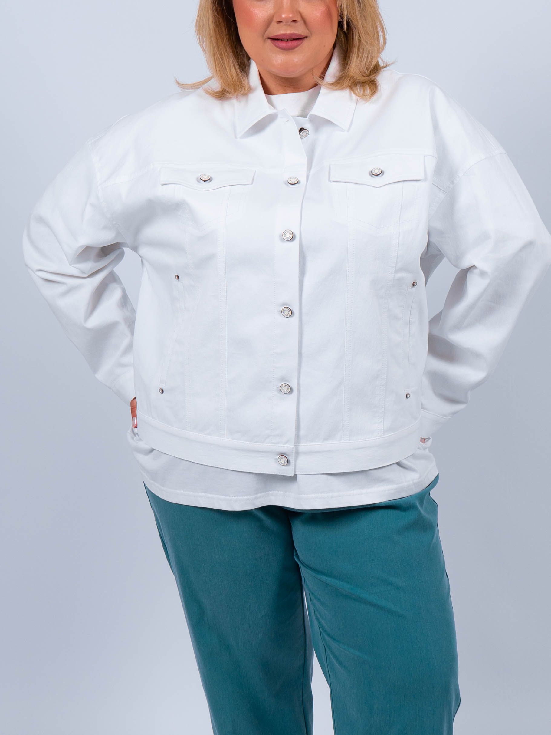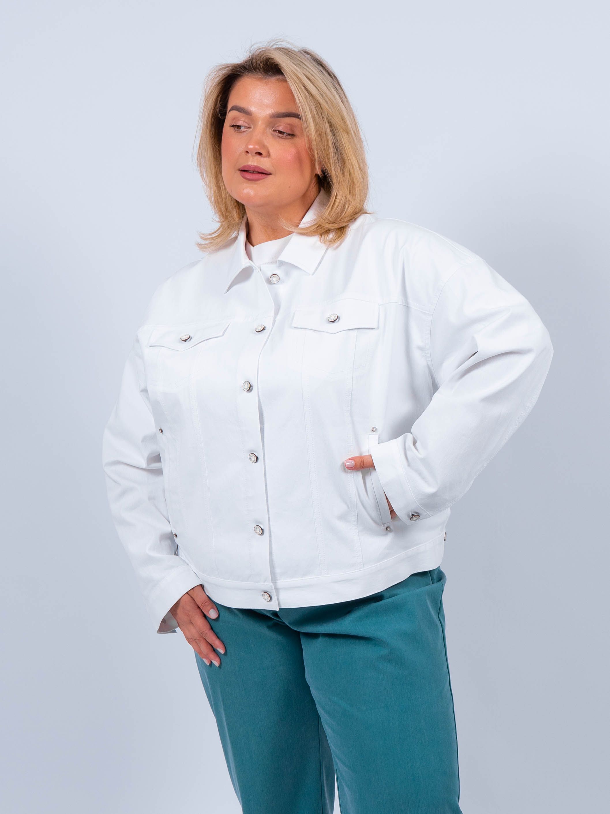 Джинсовка выполнена из высококачественного материала, обеспечивающего комфорт и приятные тактильные ощущения. Белый цвет придает ей особый шарм и стильный вид.