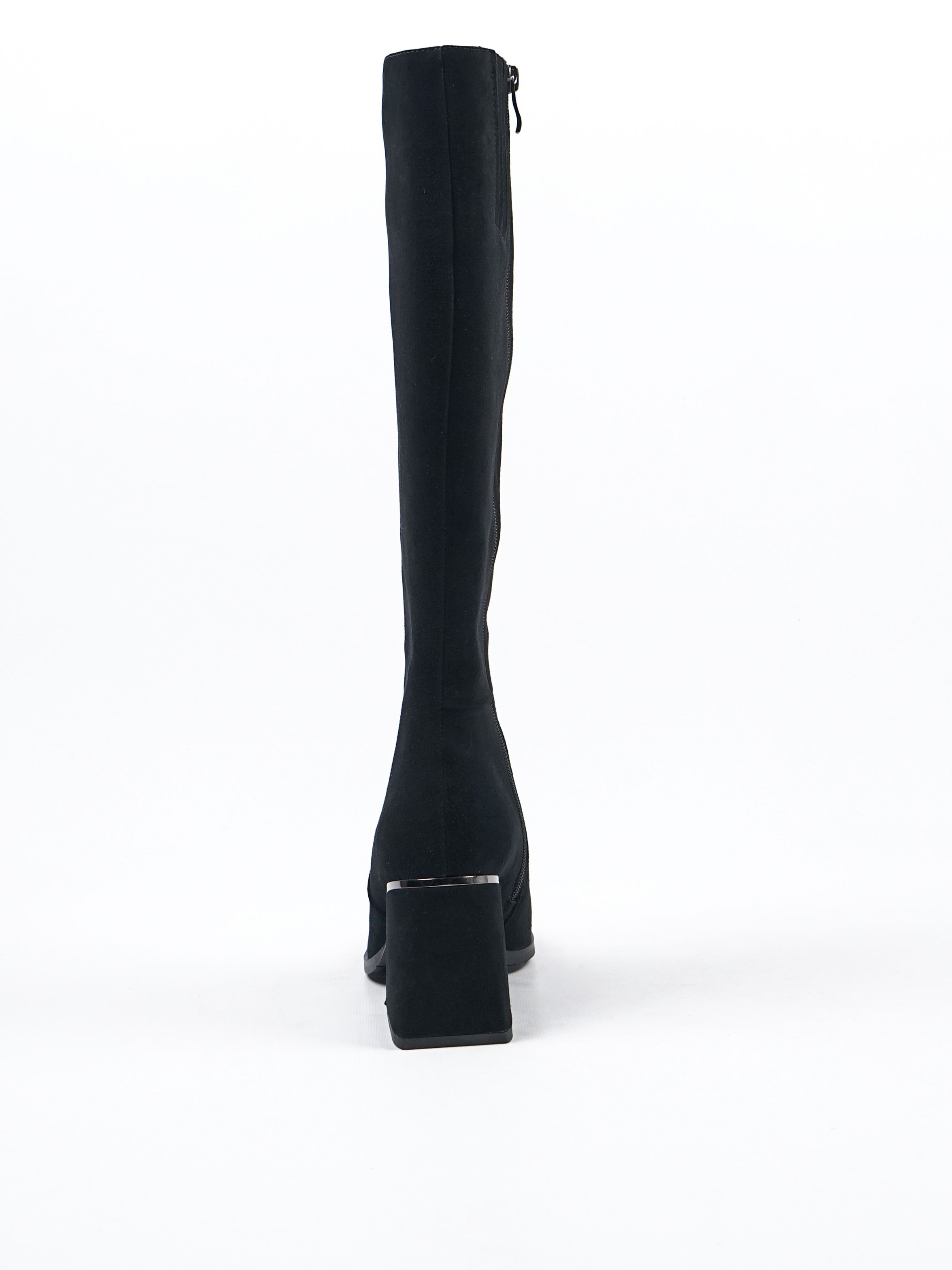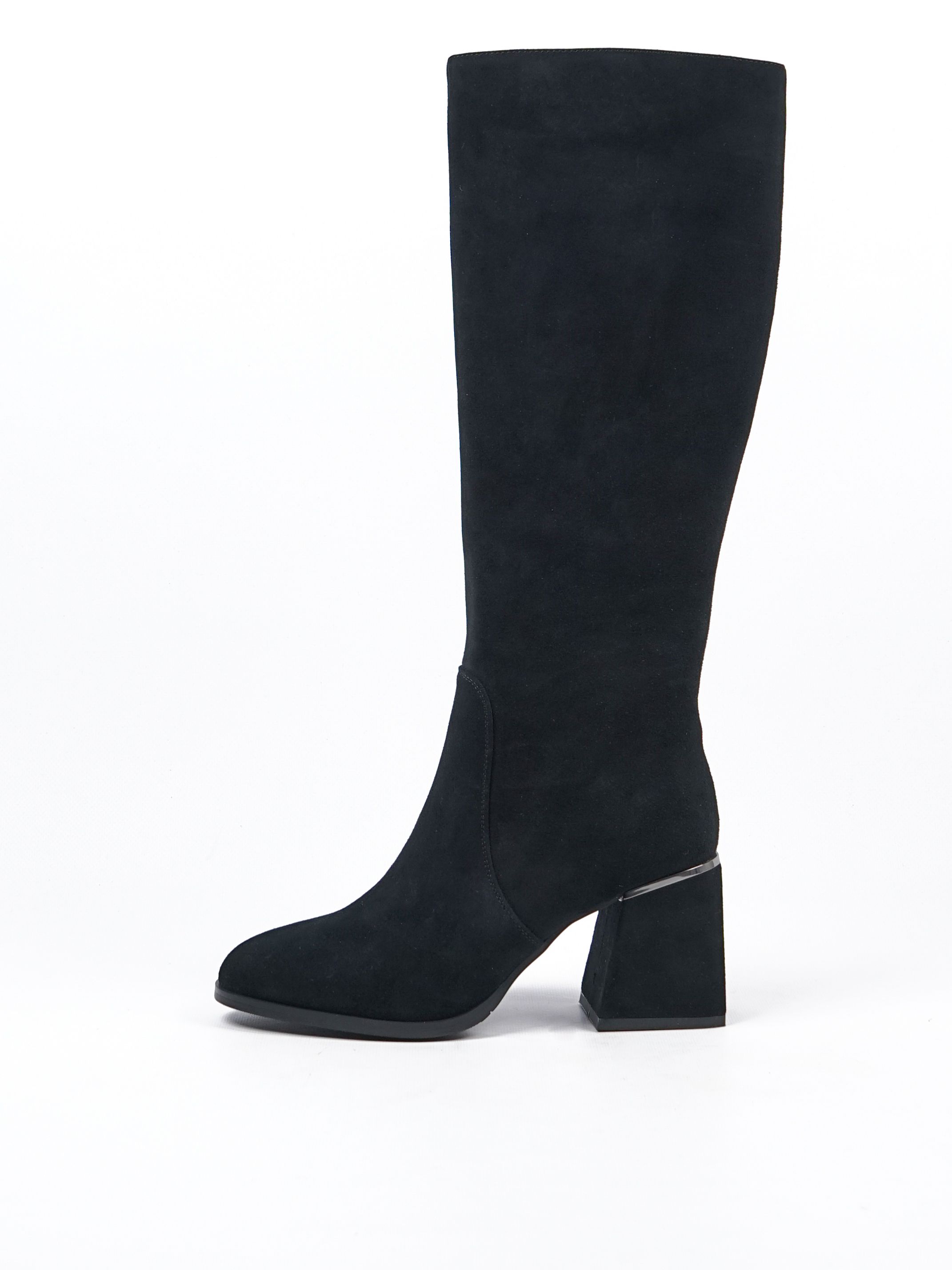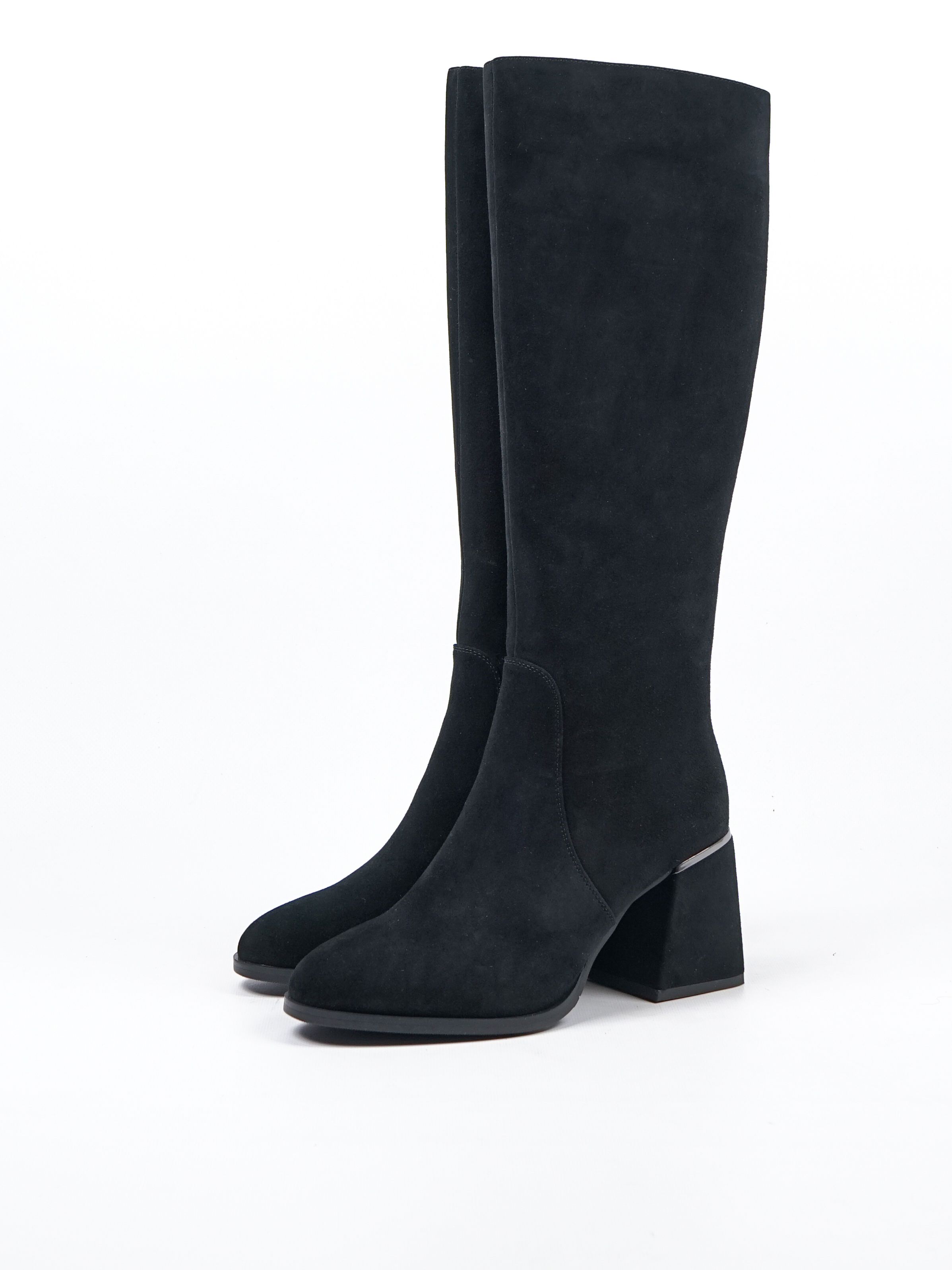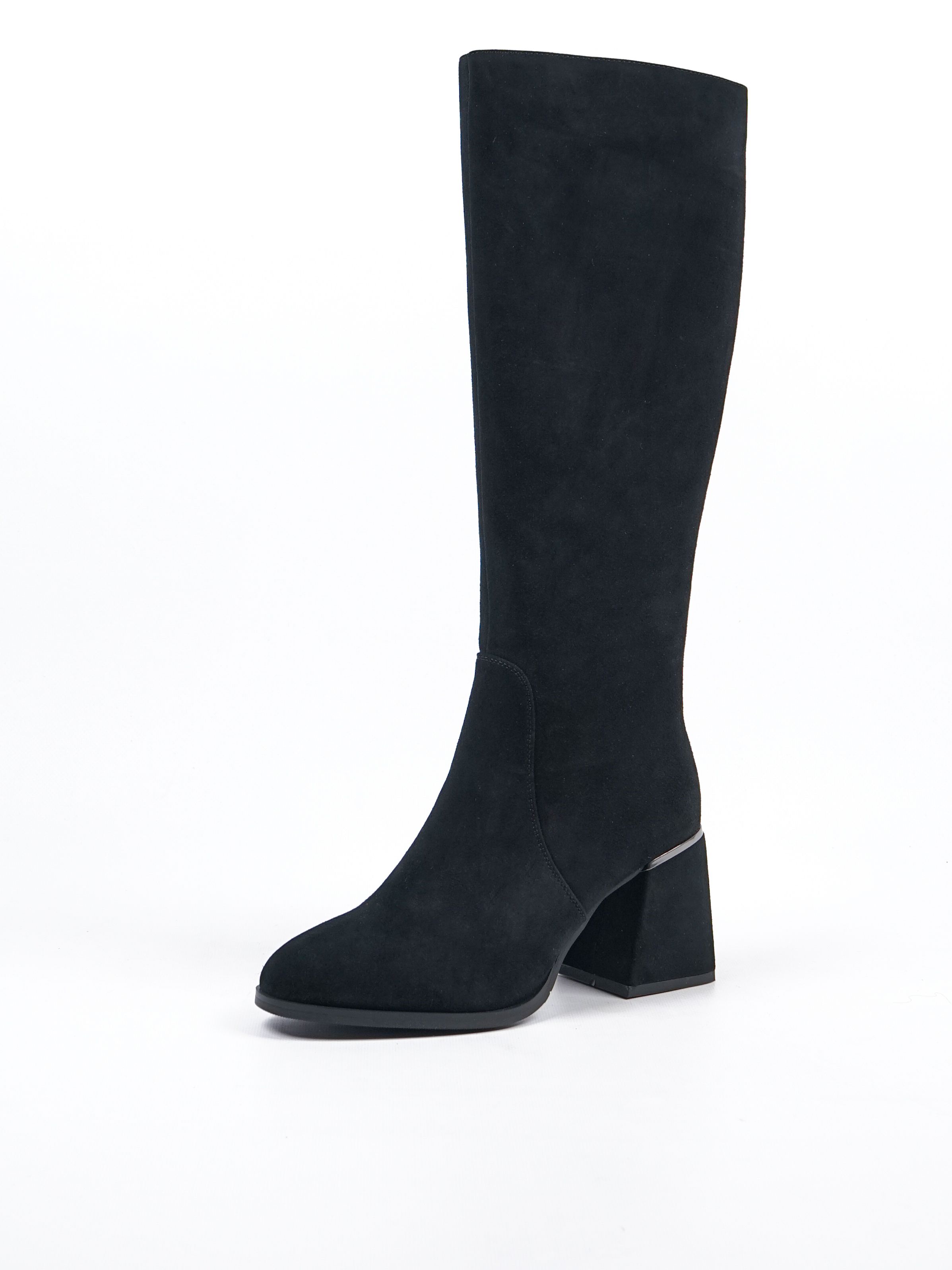 Женские сапоги из натуральной замши от Covani — это идеальное сочетание элегантности и комфорта. Внутри тёплая подкладка из байки, которая защитит ваши ноги от холода. Универсальный чёрный цвет делает эти сапоги подходящими к любому образу.