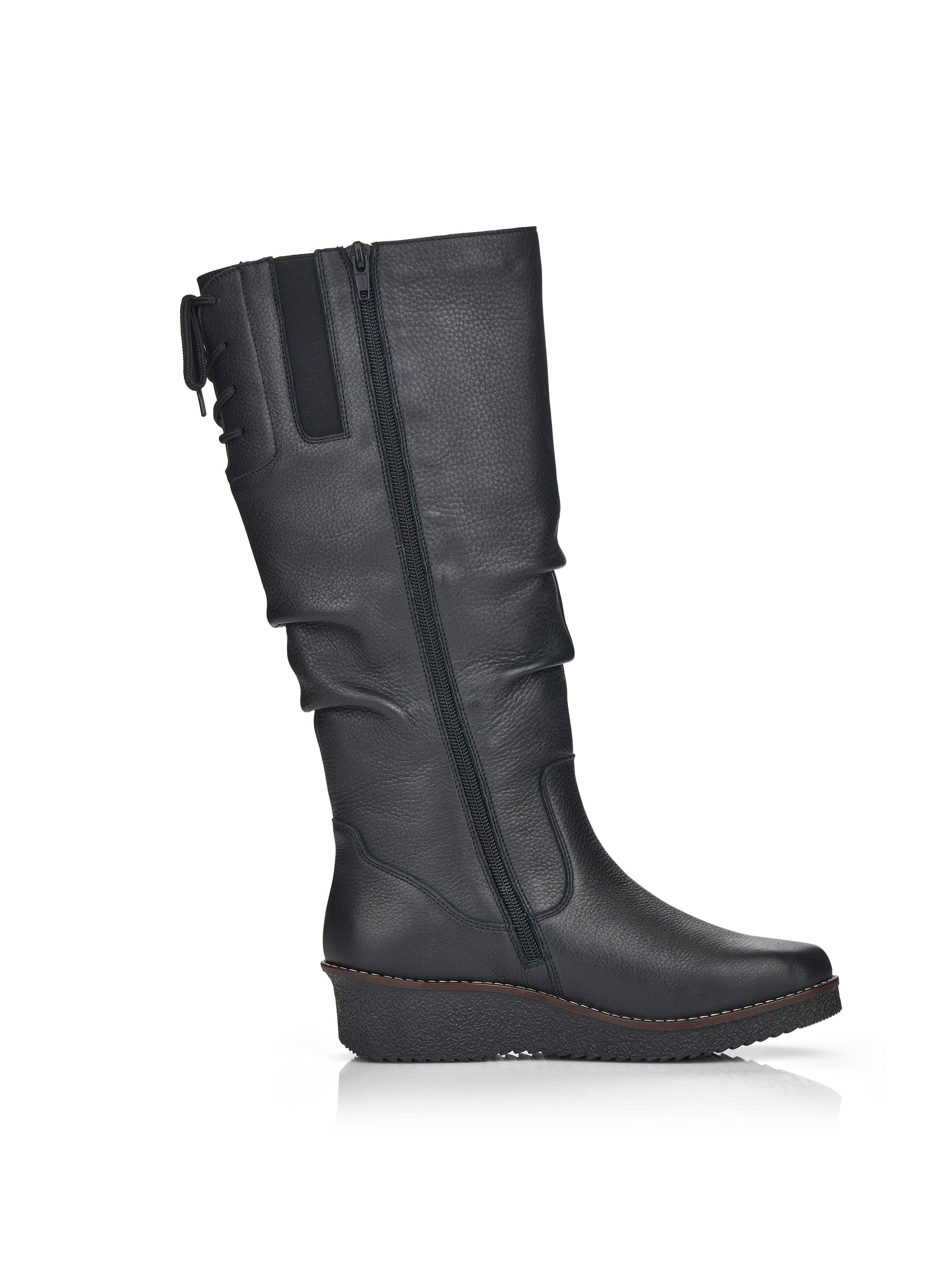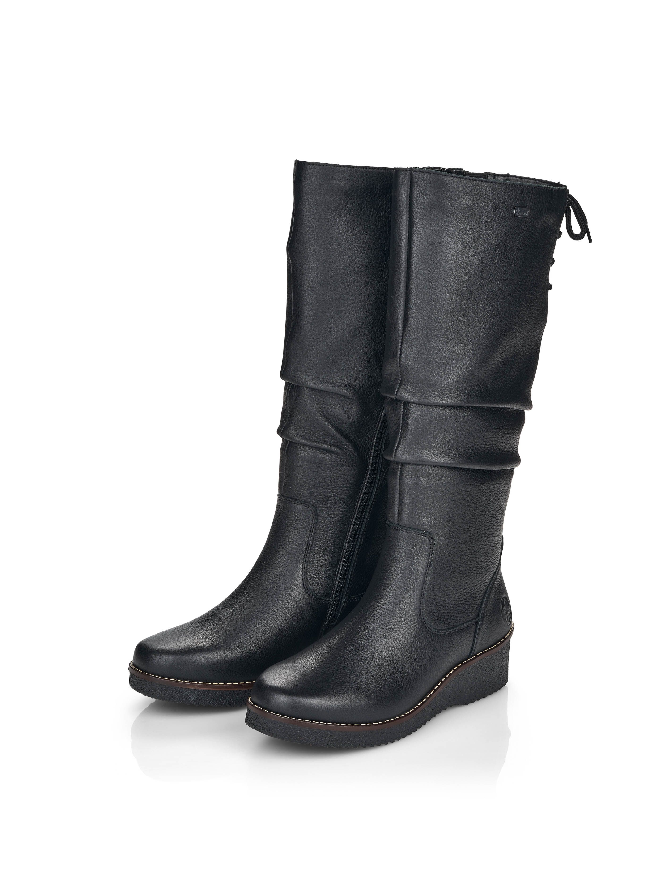 Рекомендуем рассмотреть черные женские сапоги на молнии от немецкого бренда Rieker, сочетающие в себе качество, комфорт, простой и современный дизайн.