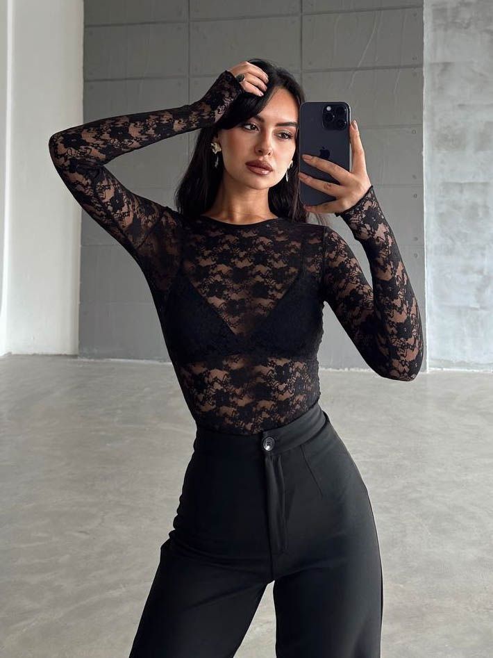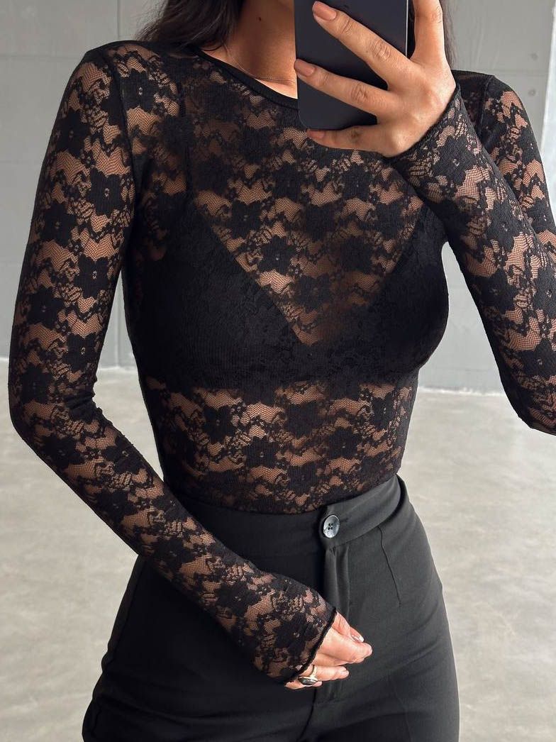 Обтягивающий полупрозрачный лонгслив из гипюра с длинным рукавом для модниц. Отлично подходит на высоких и невысоких девушек.Идеальный вариант на корпоратив или вечеринку в клубе. Отлично сочетается с топом, корсетом, жакетом, с джинсами, брюками, юбкой, шортами.