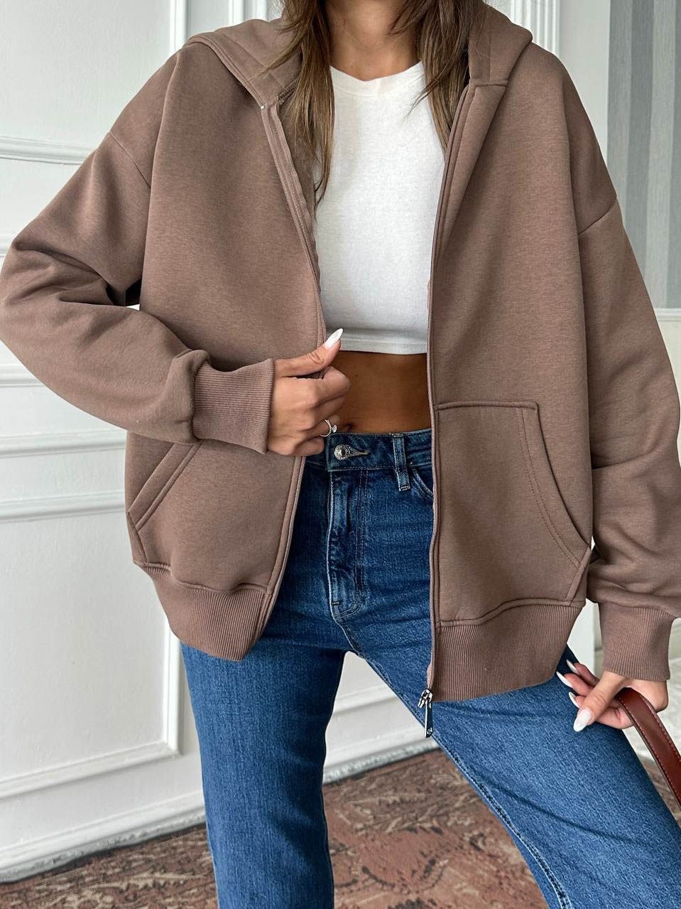 Худи с капюшоном на молнии - прекрасная основа для любого гардероба. Можно носить как повседневный вариант, на работу, на учебу, для дома, для занятий спортом на свежем воздухе. Прямой свободный крой и комфортная длина не стесняет движения и подходит для любого роста и фигуры. Свитер женский с длинным рукавом на манжете красиво подчеркивает силуэт, прекрасно сочетается с джинсами, леггинсами и брюками с высокой посадкой.