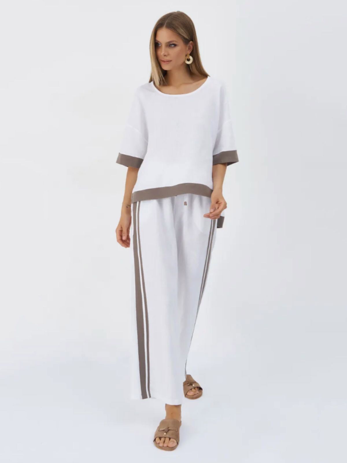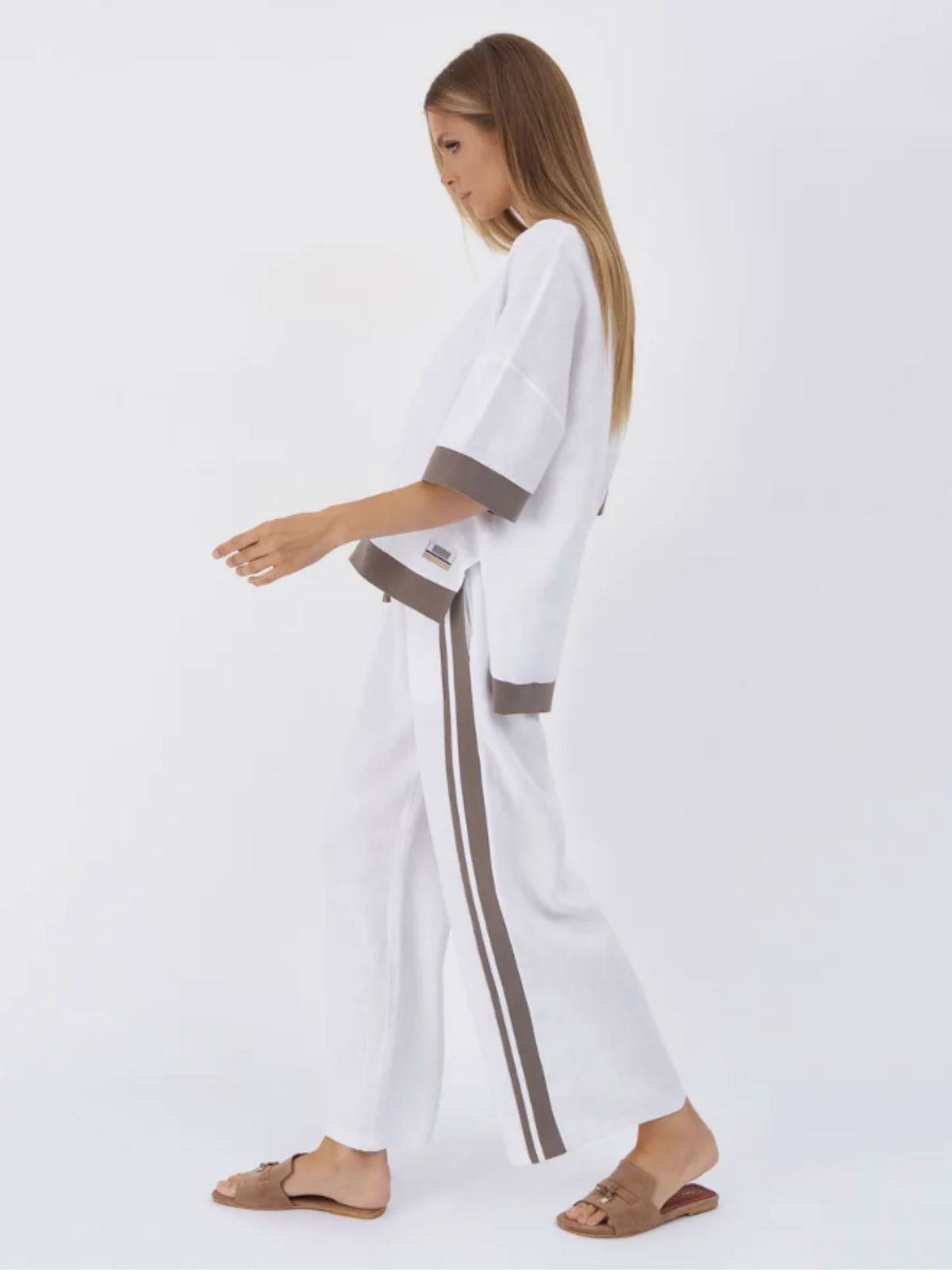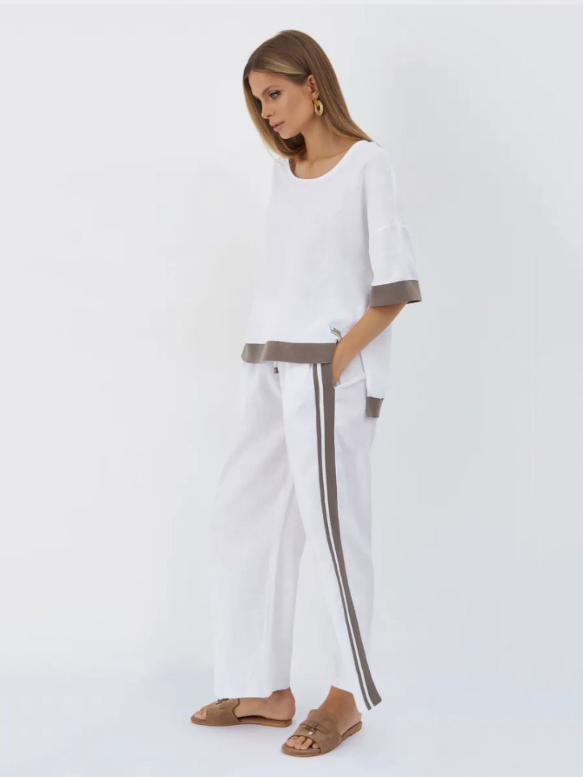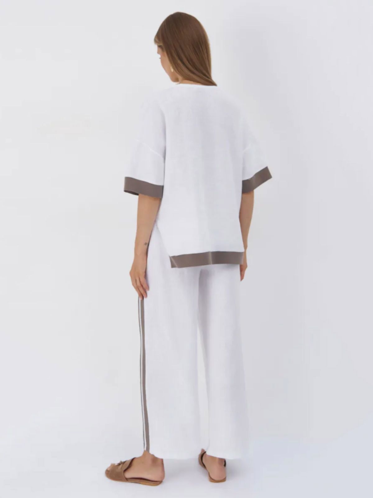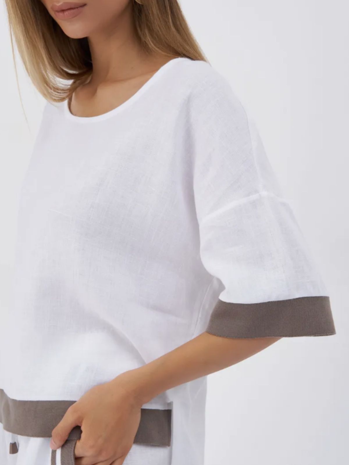 Модная женская льняная блузка бело-графитового цвета. Блуза удачно сочетаются с джинсами, разными моделями брюк и юбок. Она станет достойной альтернативой обычной майки или футболки. Кофточка из льна делает образ более женственным и привлекательным. Эта необычная свободная модель выполнена из 100% льна высокого качества, благодаря этому она легкая и удобная в носке. Благодаря классическому круглому вырезу, натуральному цвету и стильному прямому дизайну средней длины, блузка подчеркнет ваш индивидуальный женский стиль и добавит нотку необычности в ваш гардероб, украсит любые параметры полных дам. Не упустите возможность приобрести эту оригинальную красоту, которая станет ярким акцентом и позволит выглядеть модно, современно и молодежно в любое время года. Покупайте качественную натуральную женскую одежду и наслаждайтесь комфортом и элегантностью!