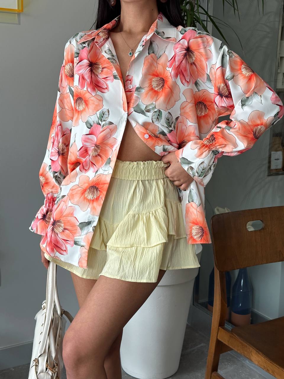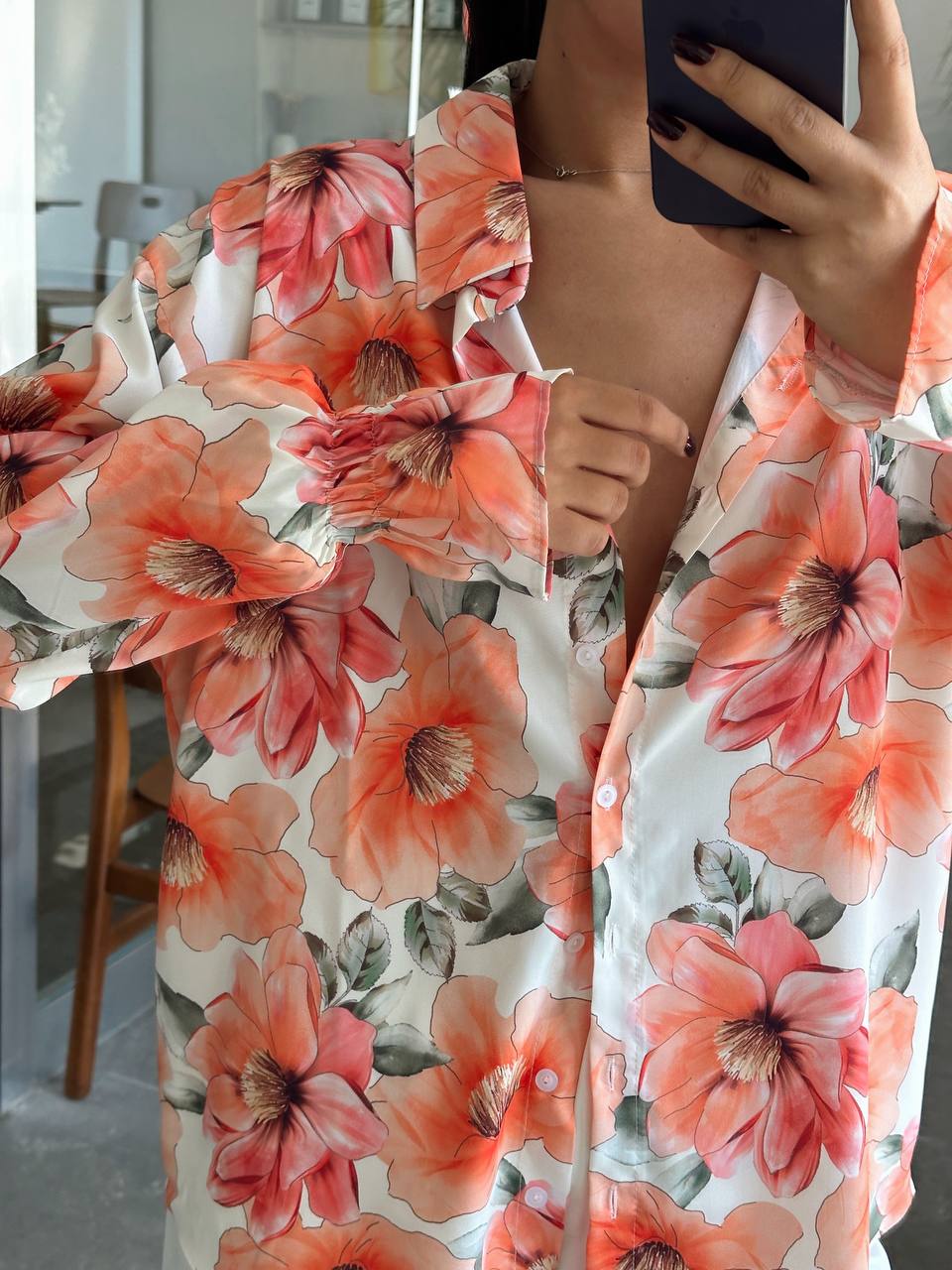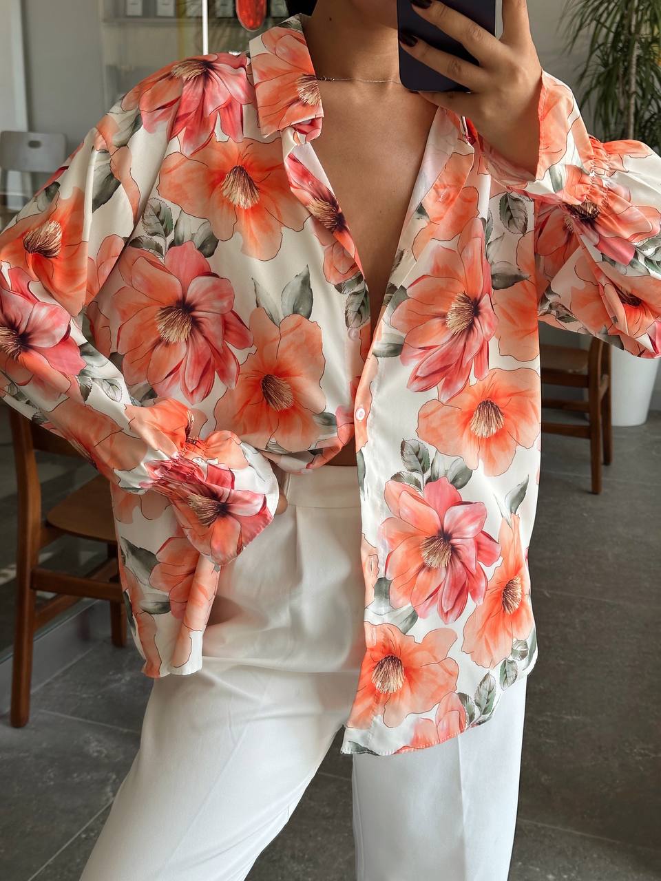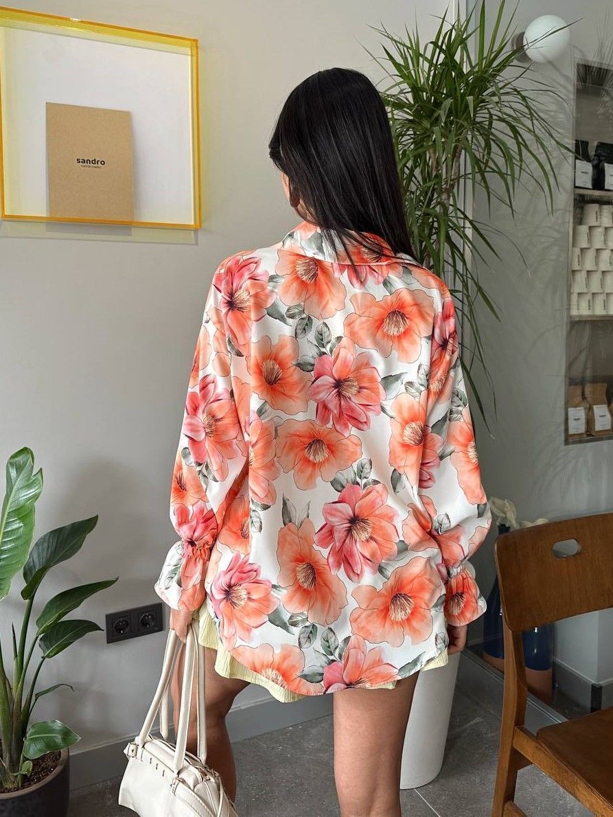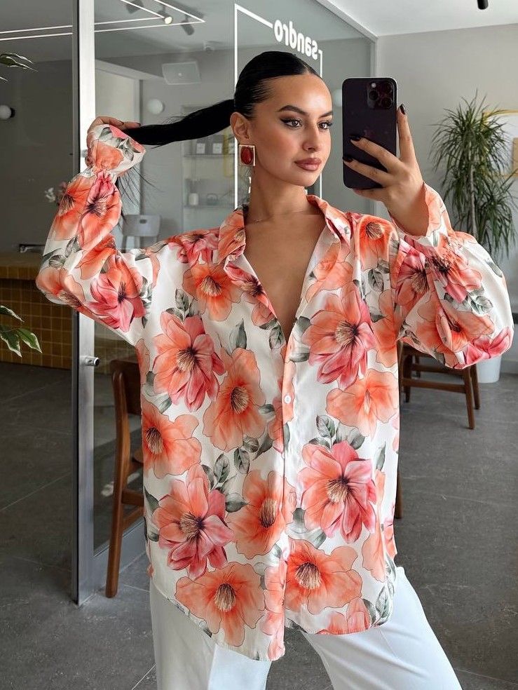 Рубашка для женщин шелковая прекрасно сочетается с различной верхней одеждой, обувью, другими деталями. Модная блузка с длинным рукавом с цветочным принтом подходит для любого времени года, будет комфортно и летним, прохладным вечером, и как весенний, осенний или зимний вариант. Удобно носить под верхнюю одежду, с кардиганом, толстовкой или пиджаком, футболкой, создать эффект многослойности. Комбинировать женскую рубашку с юбкой, брюками, джинсами, шортами. Очень легкая блуза, подходящая для ежедневной носки. Стиль свободный оверсайз, удлиненная спинка, классический воротник, спереди застежка на пуговицы, втачной широкий рукав с манжетами на пуговицах, по бокам небольшие разрезы две вытачки сзади прекрасно дополняют образ. Женская блузка выполнена из натуральной ткани, пошита в Корее, аккуратные швы, не электризуется, дышит, не скатывается и не требует сложного ухода.