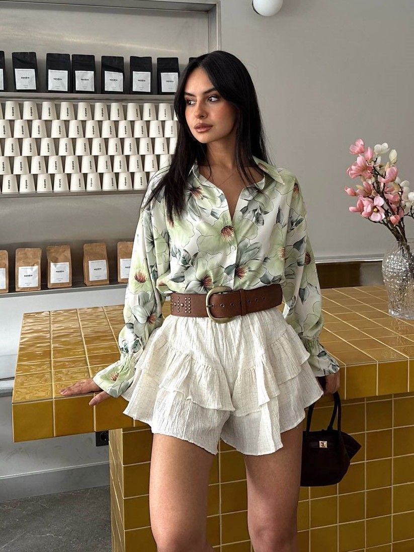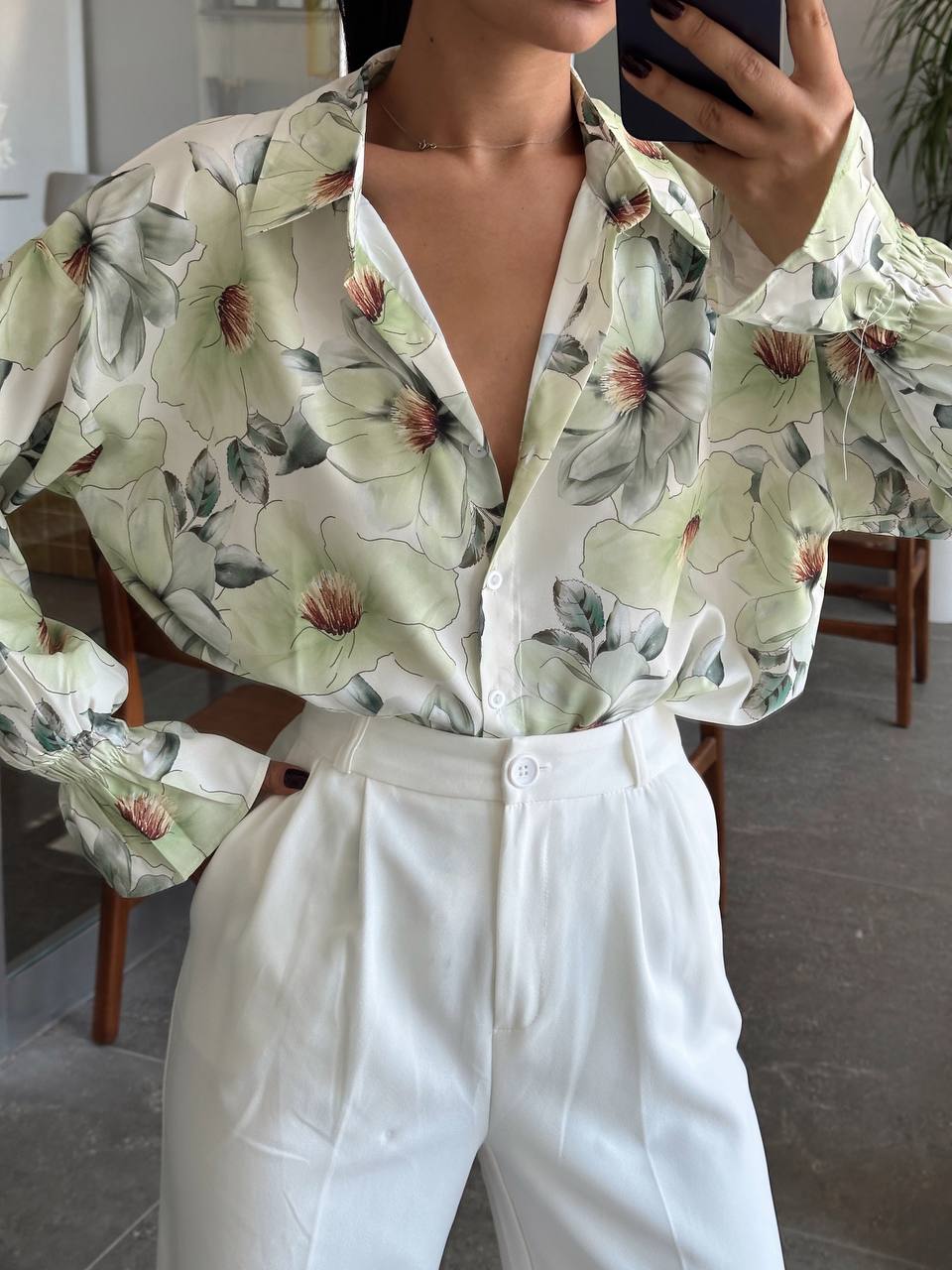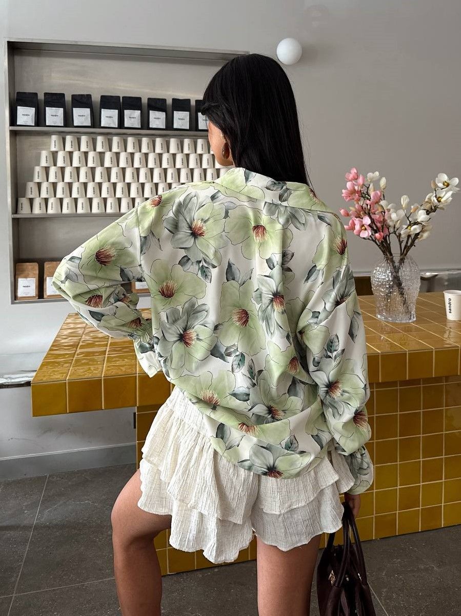 Рубашка для женщин шелковая прекрасно сочетается с различной верхней одеждой, обувью, другими деталями. Модная блузка с длинным рукавом с цветочным принтом подходит для любого времени года, будет комфортно и летним, прохладным вечером, и как весенний, осенний или зимний вариант. Удобно носить под верхнюю одежду, с кардиганом, толстовкой или пиджаком, футболкой, создать эффект многослойности. Комбинировать женскую рубашку с юбкой, брюками, джинсами, шортами. Очень легкая блуза, подходящая для ежедневной носки. Стиль свободный оверсайз, удлиненная спинка, классический воротник, спереди застежка на пуговицы, втачной широкий рукав с манжетами на пуговицах, по бокам небольшие разрезы две вытачки сзади прекрасно дополняют образ. Женская блузка выполнена из натуральной ткани, пошита в Корее, аккуратные швы, не электризуется, дышит, не скатывается и не требует сложного ухода.
