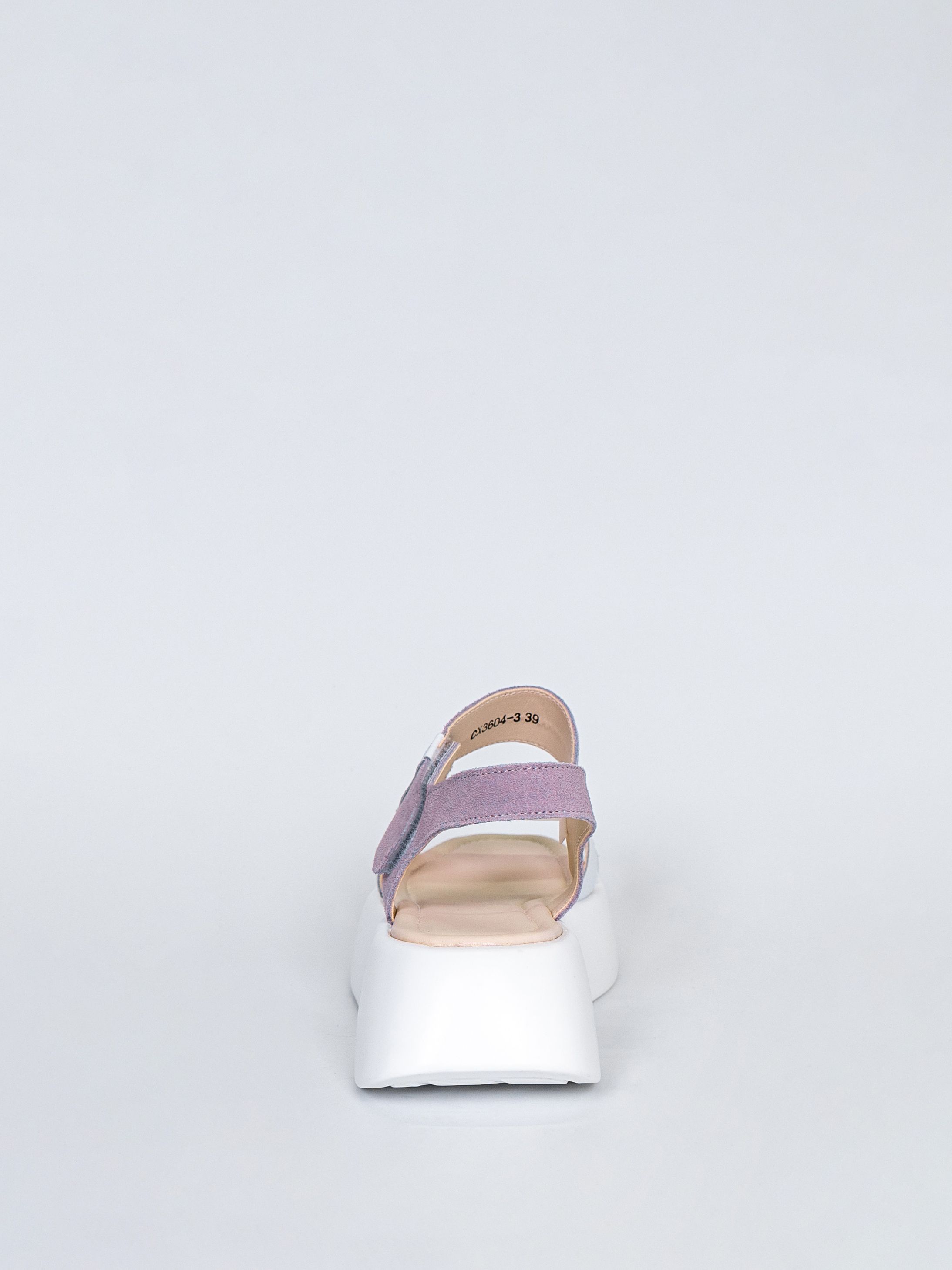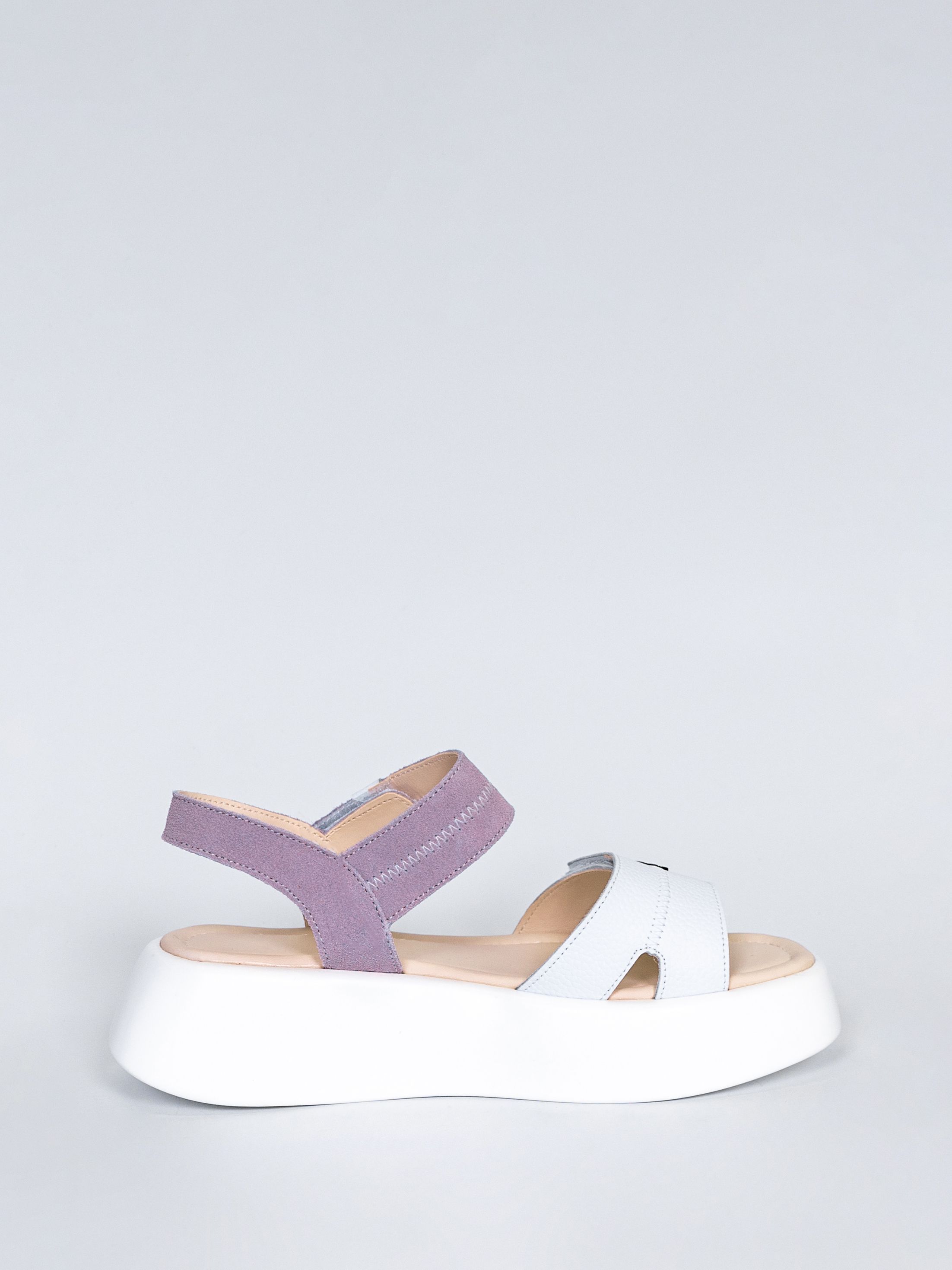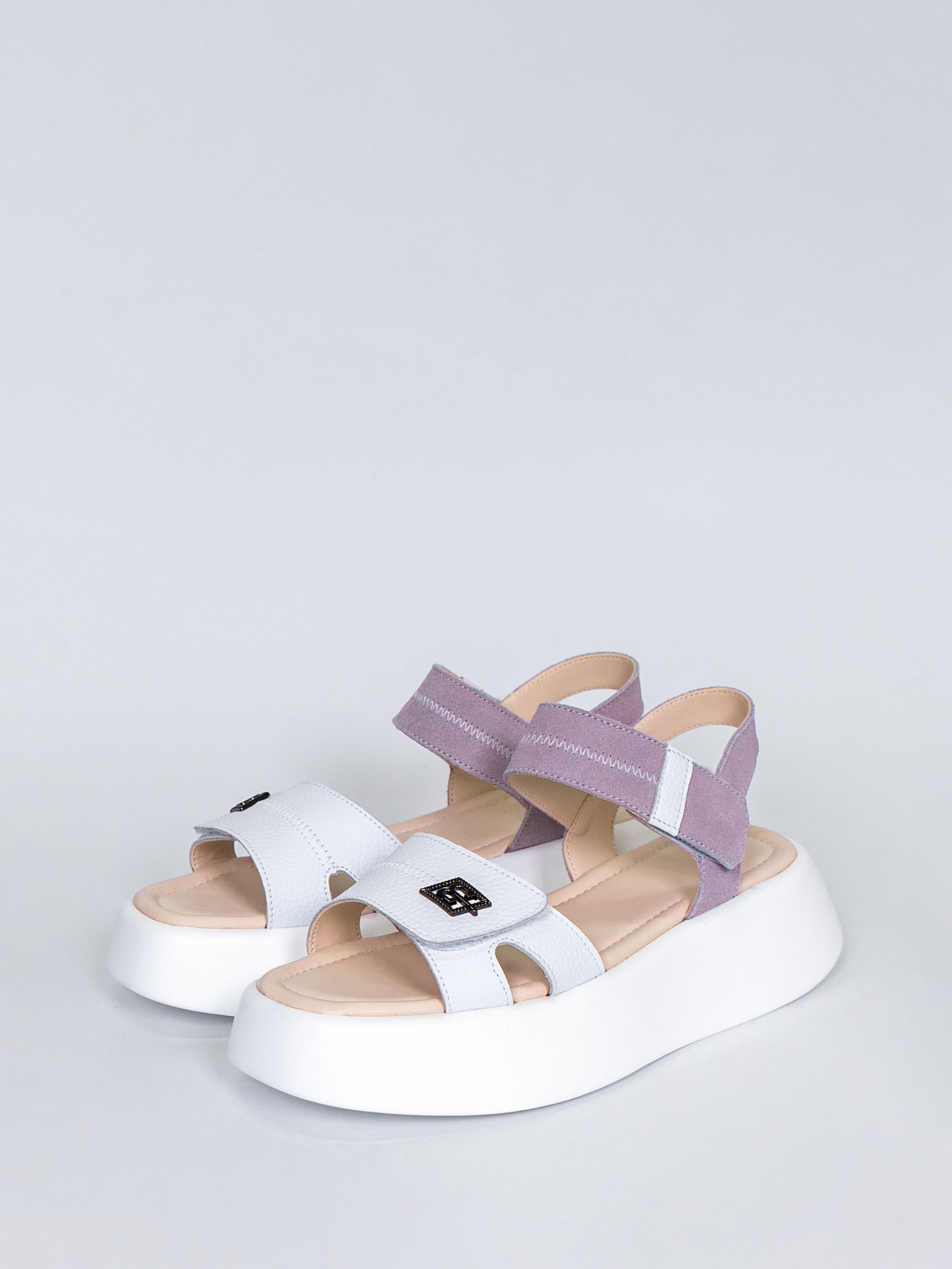 Босоножки женские выполнены из высококачественного натурального велюра и натуральной кожи, что обеспечивает комфорт и долговечность обуви. Внутренняя подкладка изготовлена из мягкой натуральной кожи, которая обеспечивает отличную вентиляцию и предотвращает натирание. Цвет босоножек - сочетание фиолетового и белого цветов, что подходит для любого наряда и стиля, делая их универсальным выбором для повседневной носки. Модель имеет удобную застежку на липучках, которая позволяет быстро и легко регулировать плотность посадки босоножек на ноге. Подошва изготовлена из прочного материала, которая обеспечивает отличное сцепление с поверхностью и долговечность обуви.