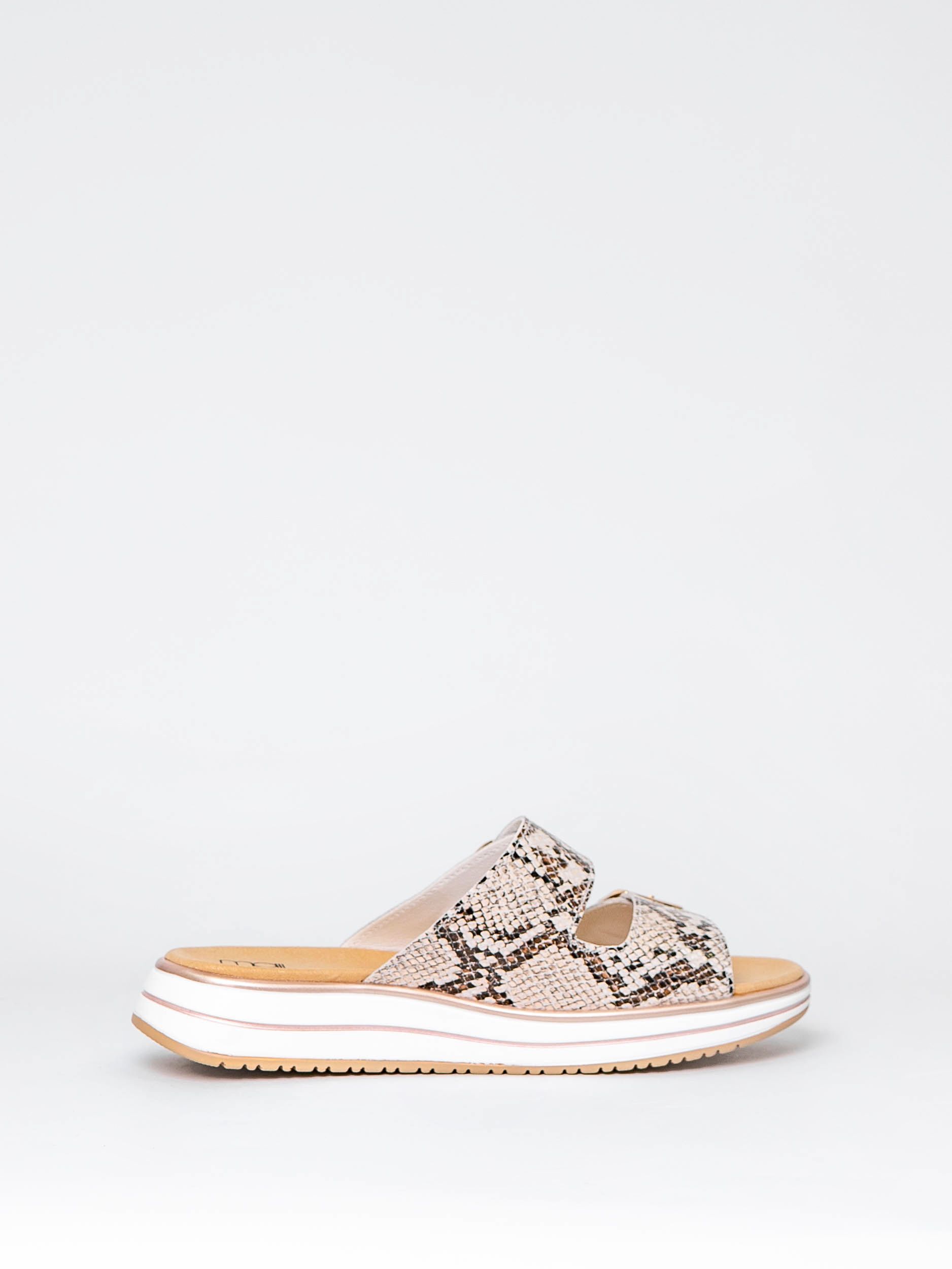 Сабо бежевого цвета со змеиным принтом сочетаются с разной палитрой одежды и сделают Ваш образ более ярким и привлекательным.