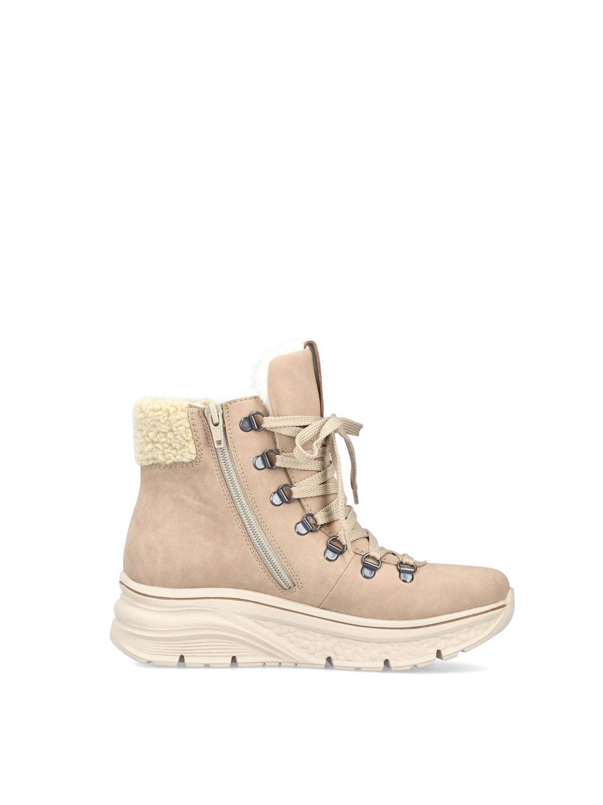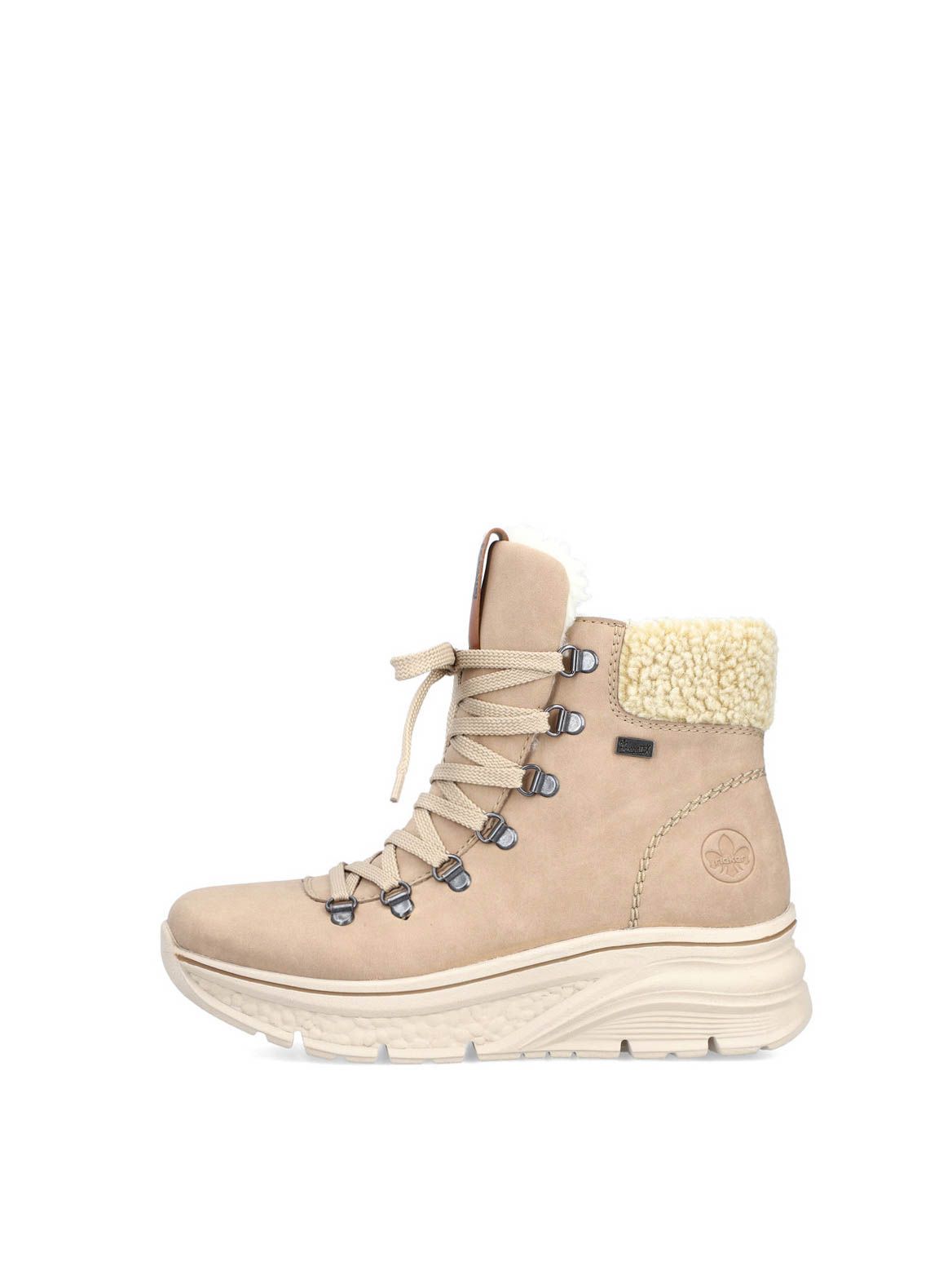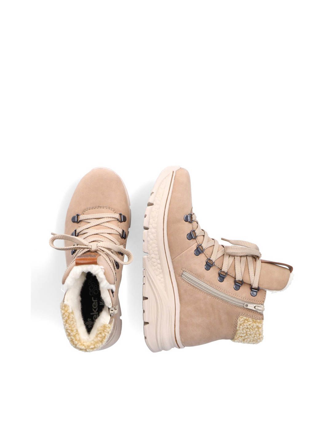 Ботинки женские немецкого бренда Rieker. Верх изготовлен из искусственной кожи и текстильного материала бежевого цвета. Материал подкладки искусственная шерсть с TEX-мембраной. Идеально подойдут на зиму и станут отличным завершением к Вашему гардеробу.