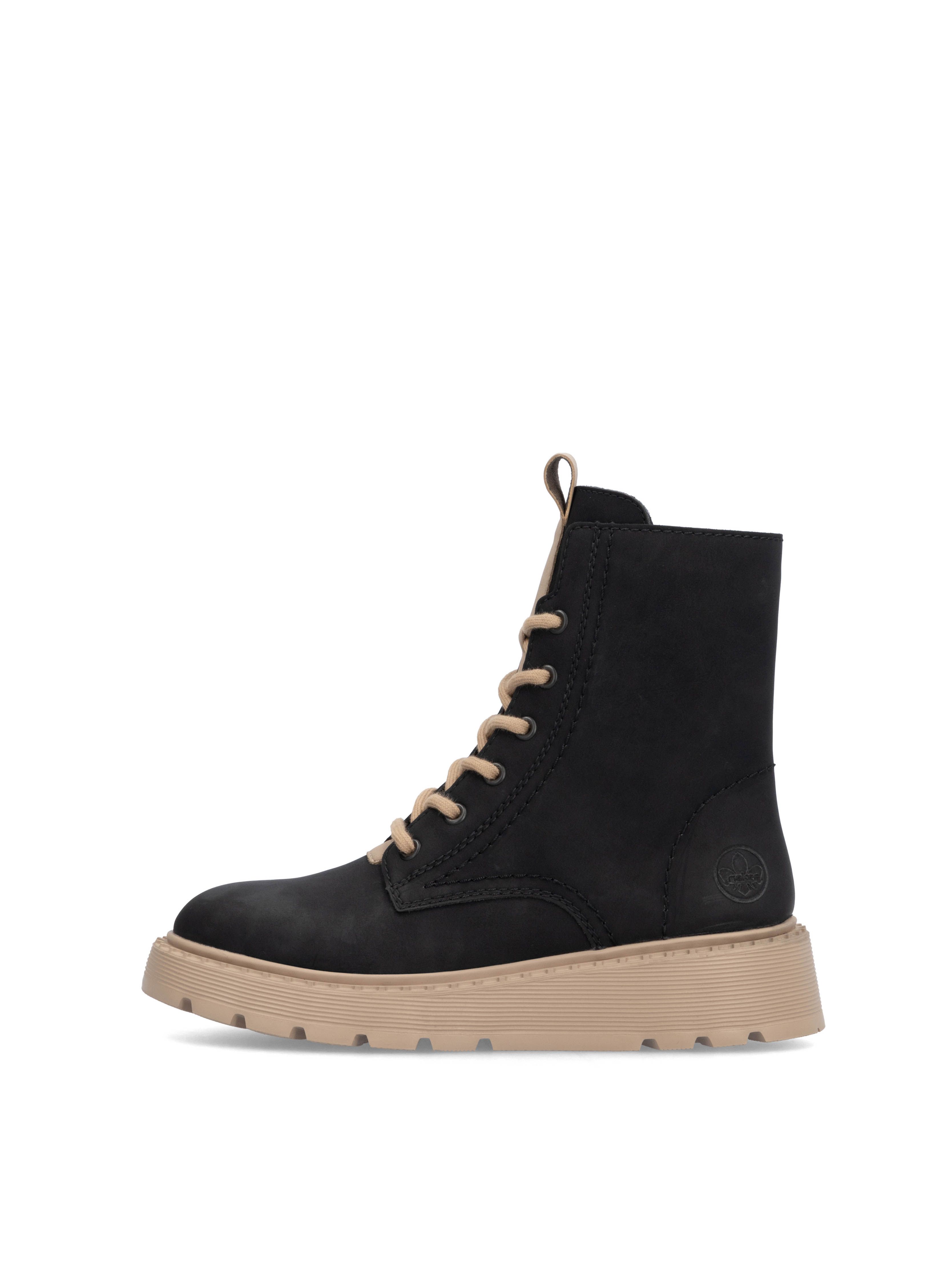 Рекомендуем рассмотреть черные женские ботинки на молнии и шнурках от бренда Rieker, сочетающие в себе качество, комфорт, простой и современный дизайн.