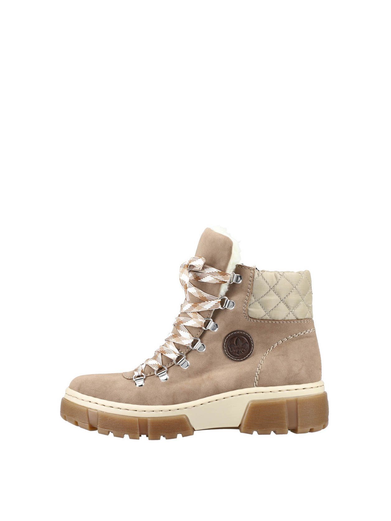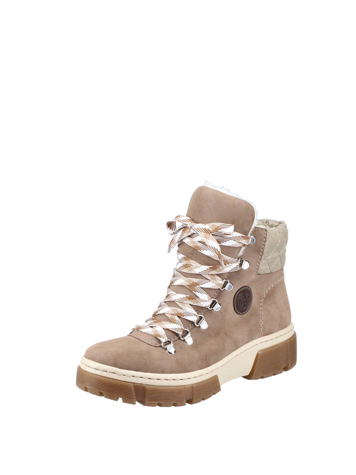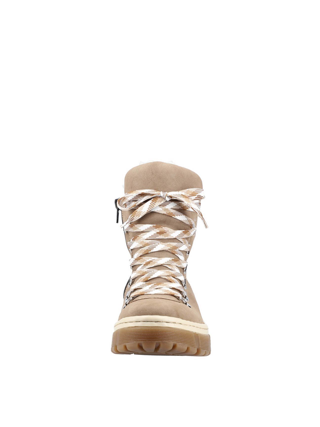 Ботинки женские немецкого бренда Rieker. Верх изготовлен из искусственной кожи и текстильного материала темно-бежевого цвета. Материал подкладки искусственная шерсть. Идеально подойдут на зиму и станут отличным завершением к Вашему гардеробу.