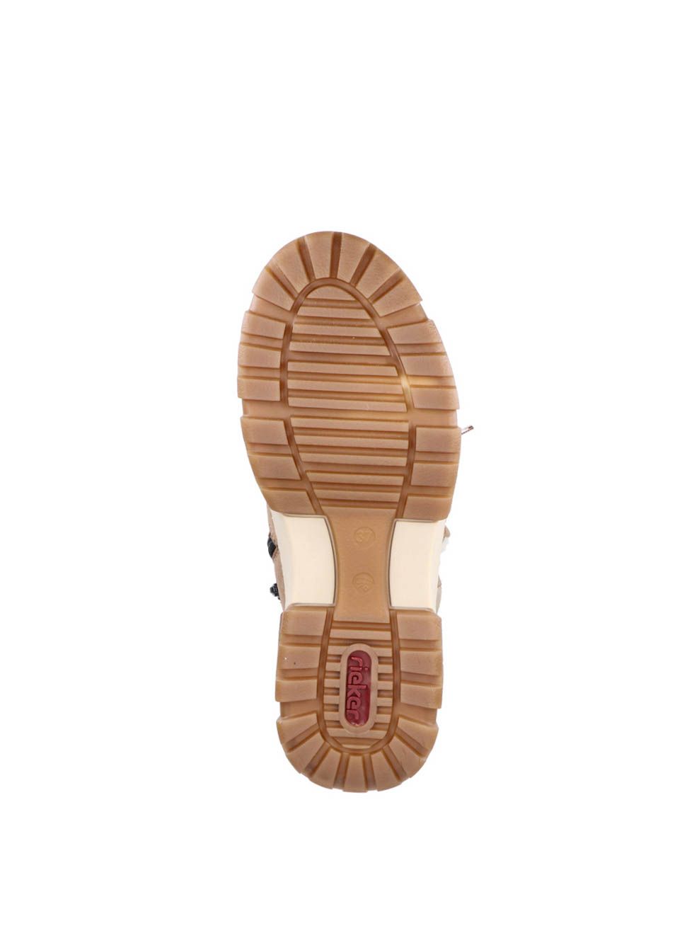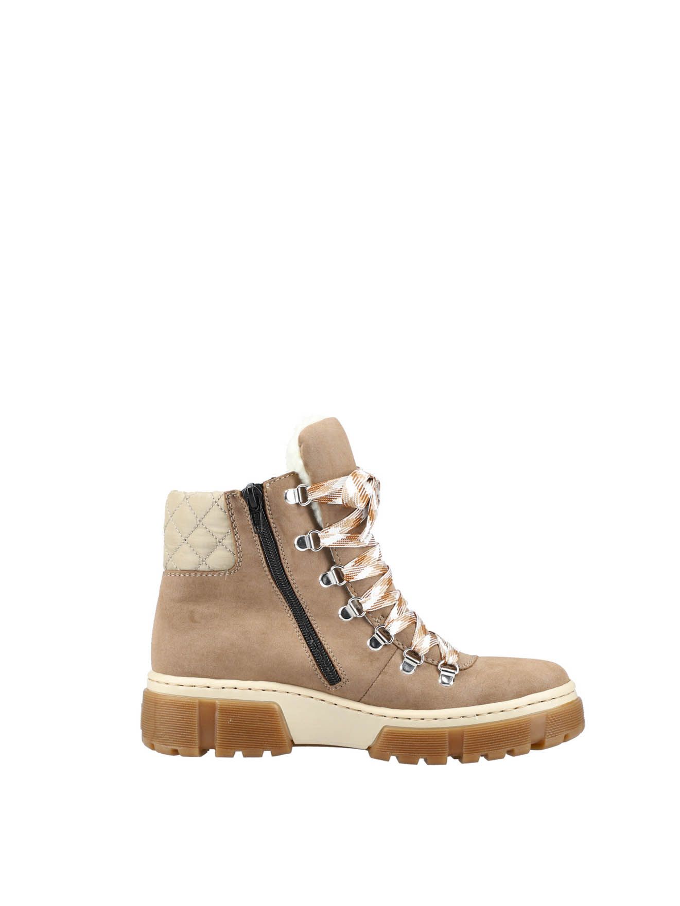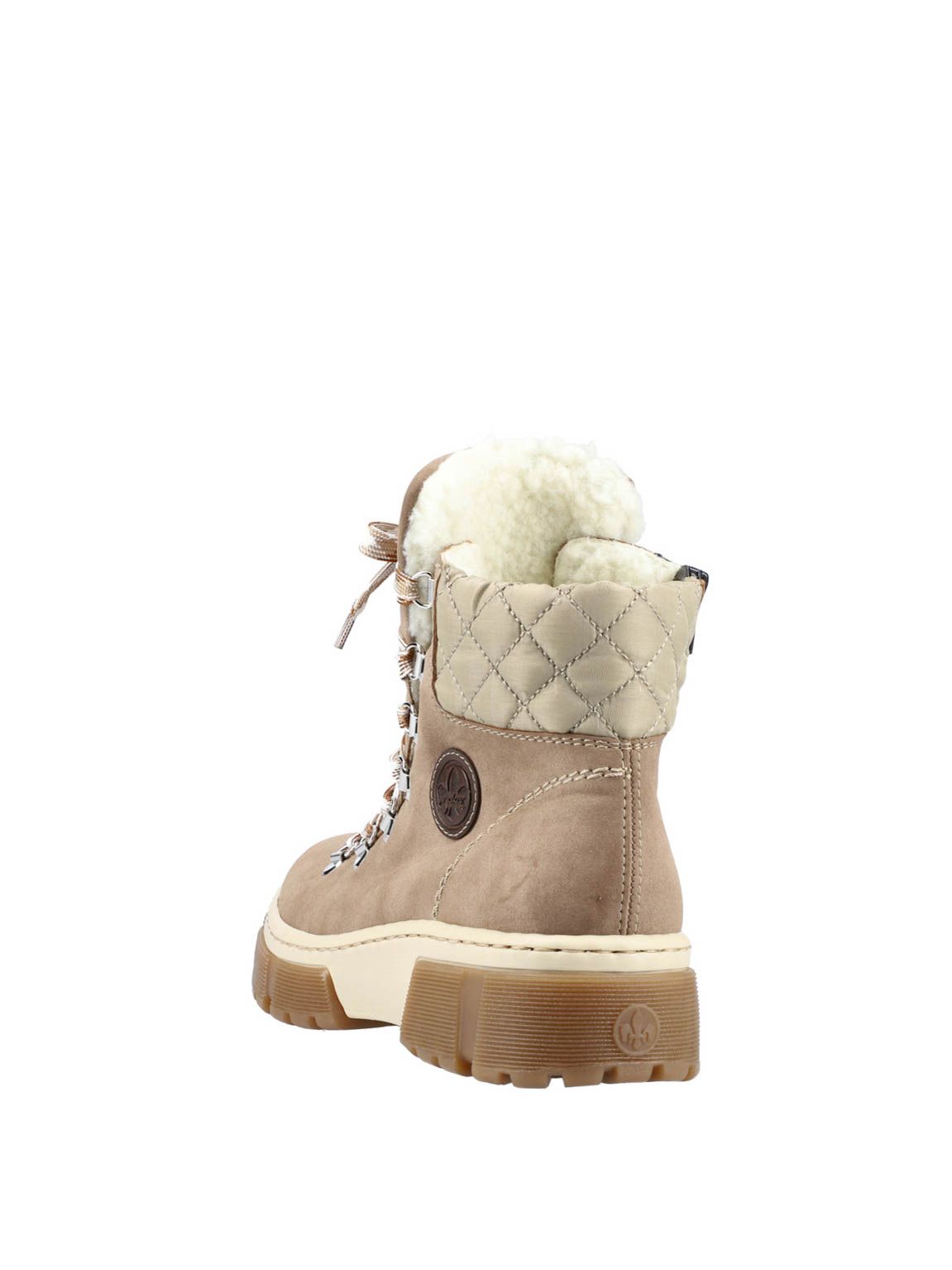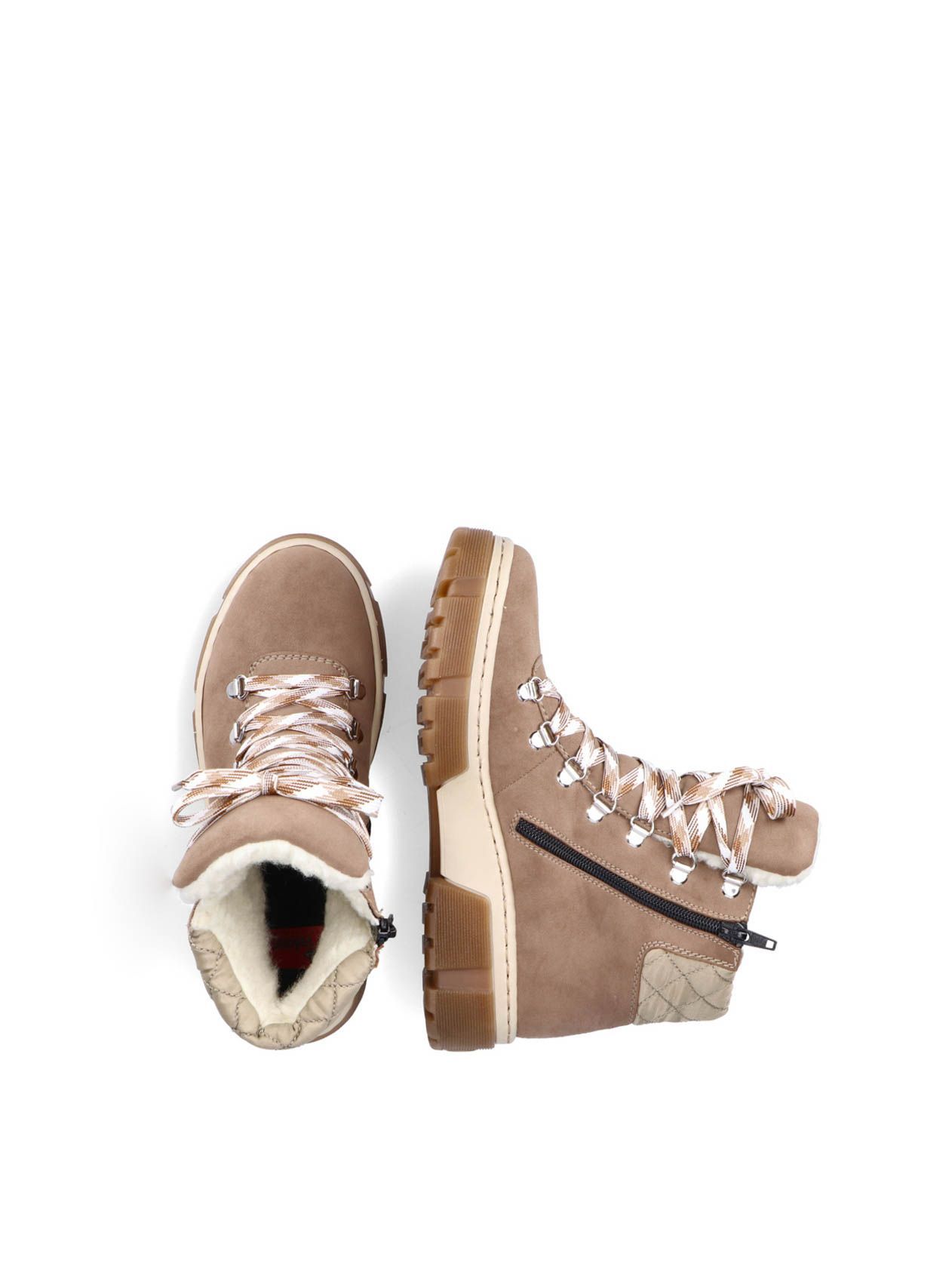 Ботинки женские немецкого бренда Rieker. Верх изготовлен из искусственной кожи и текстильного материала темно-бежевого цвета. Материал подкладки искусственная шерсть. Идеально подойдут на зиму и станут отличным завершением к Вашему гардеробу.