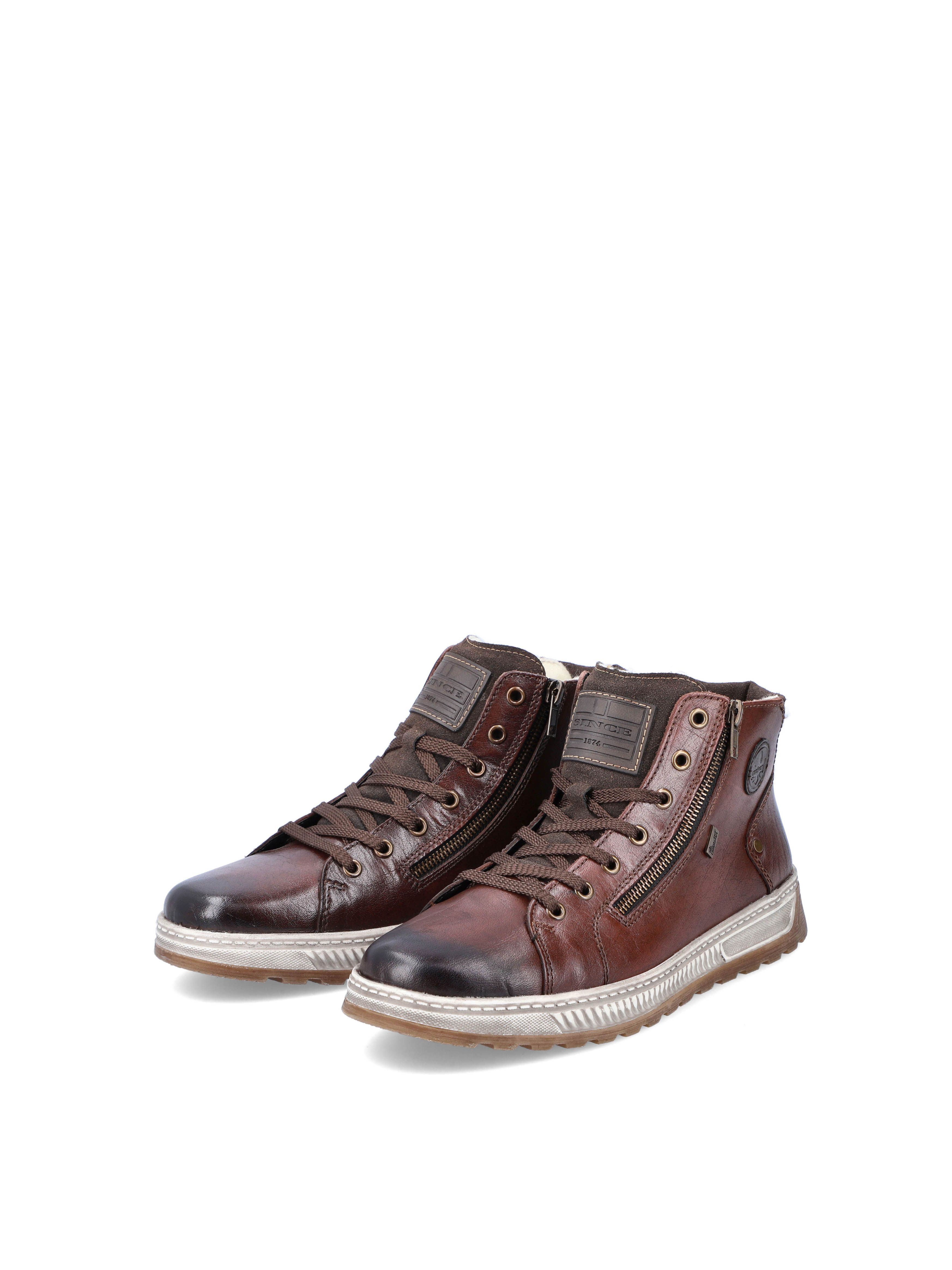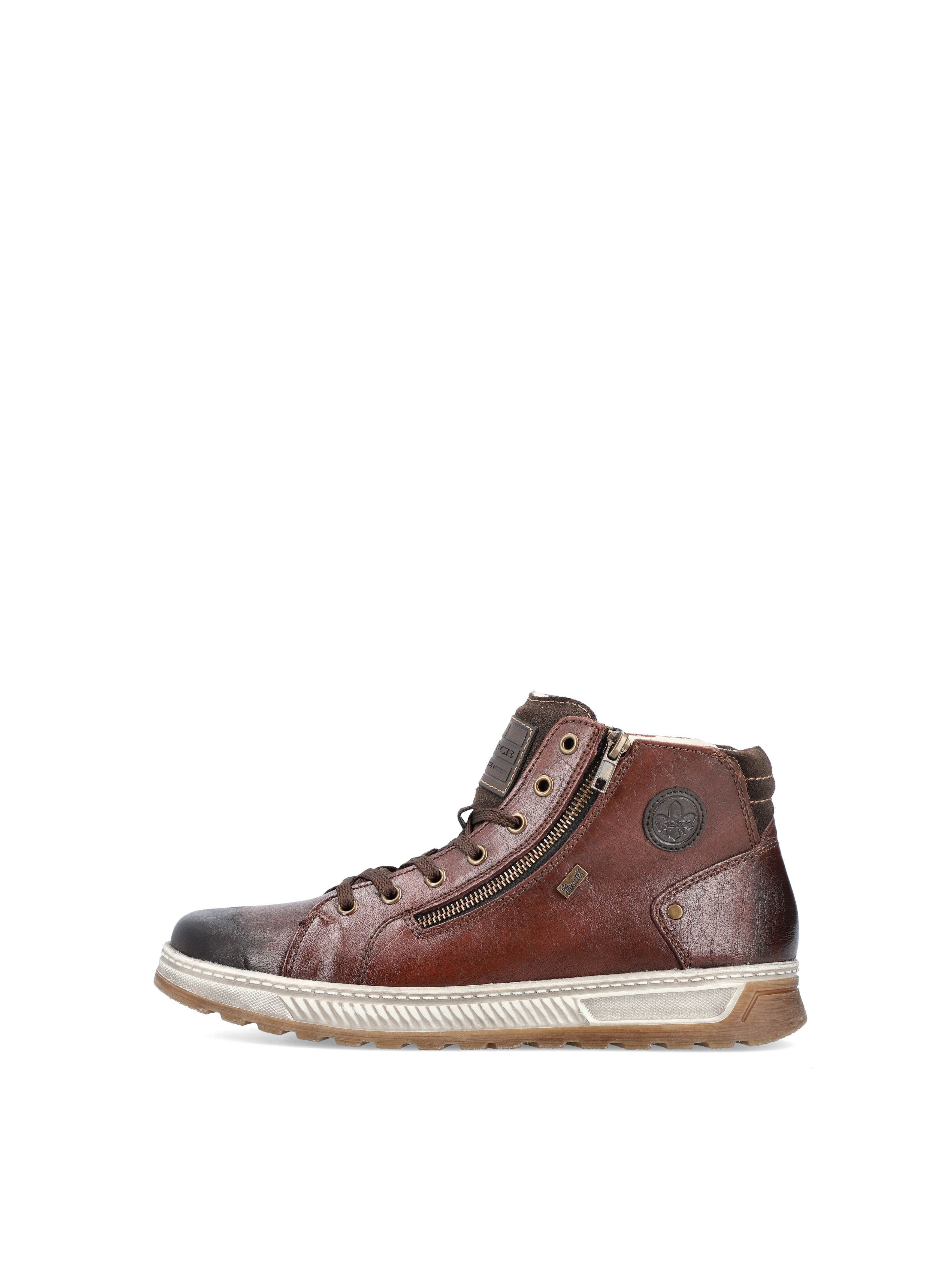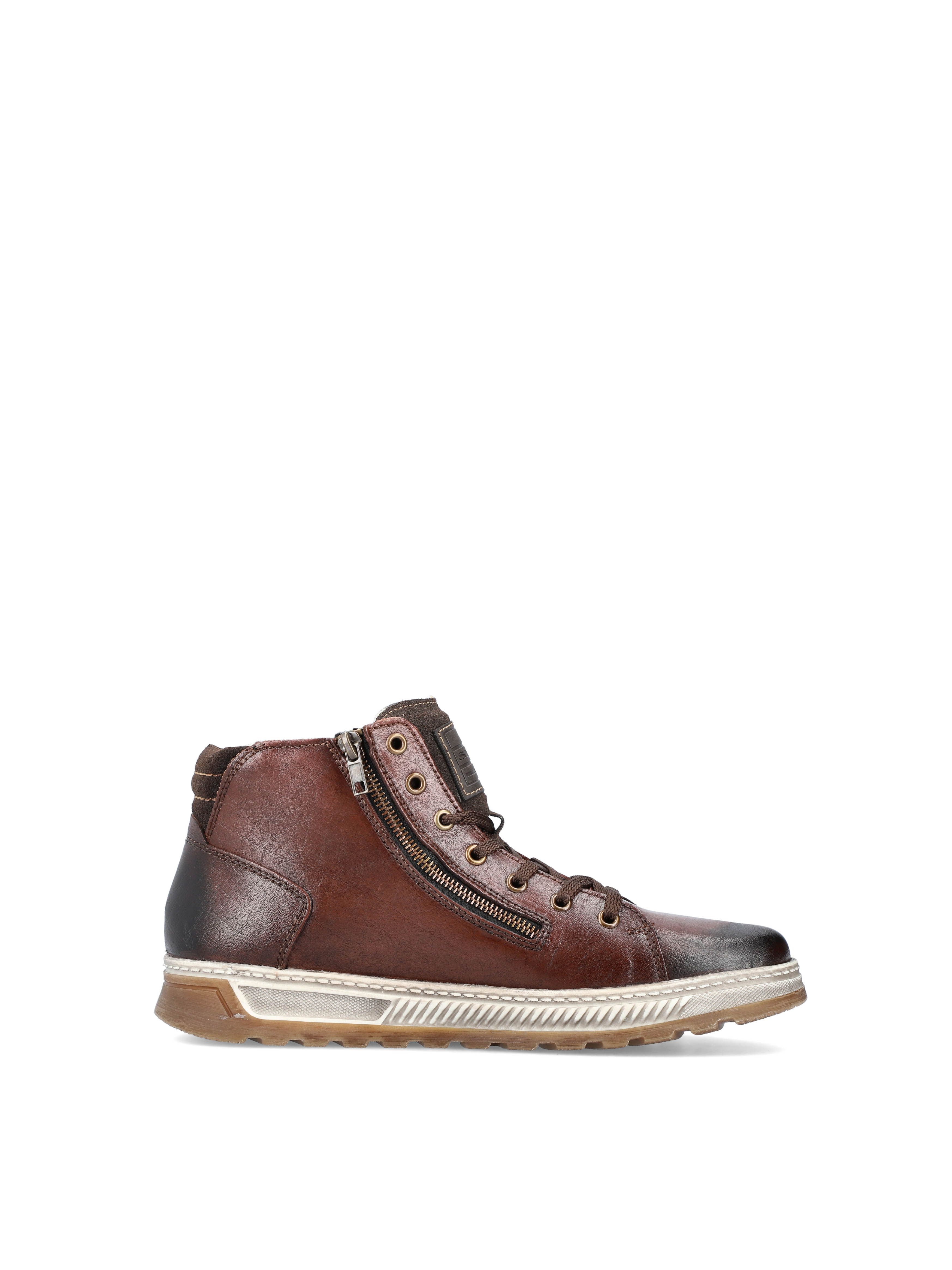 Рекомендуем рассмотреть коричневые мужские ботинки на молнии и шнурках от немецкого бренда Rieker, сочетающие в себе качество, комфорт, простой и современный дизайн.