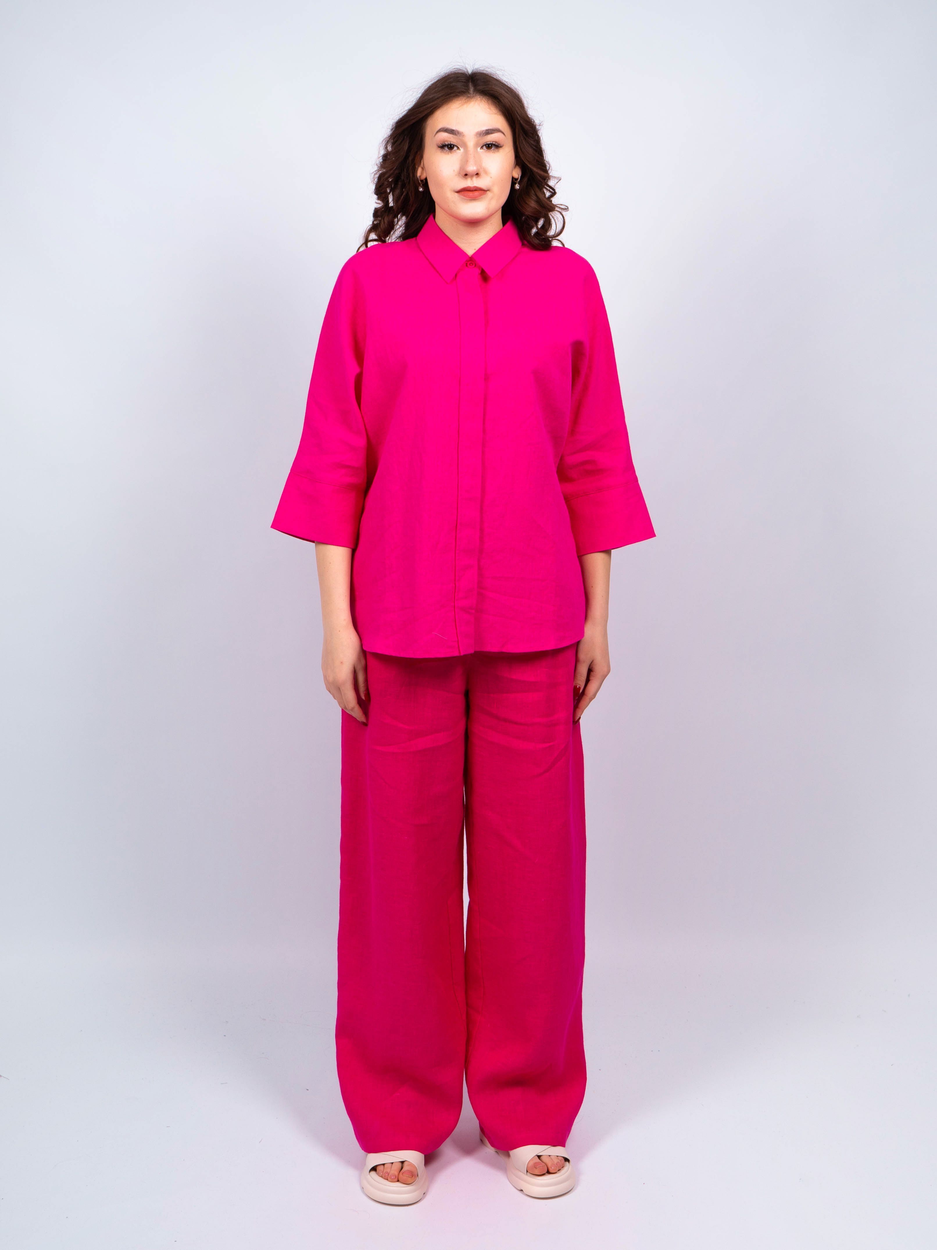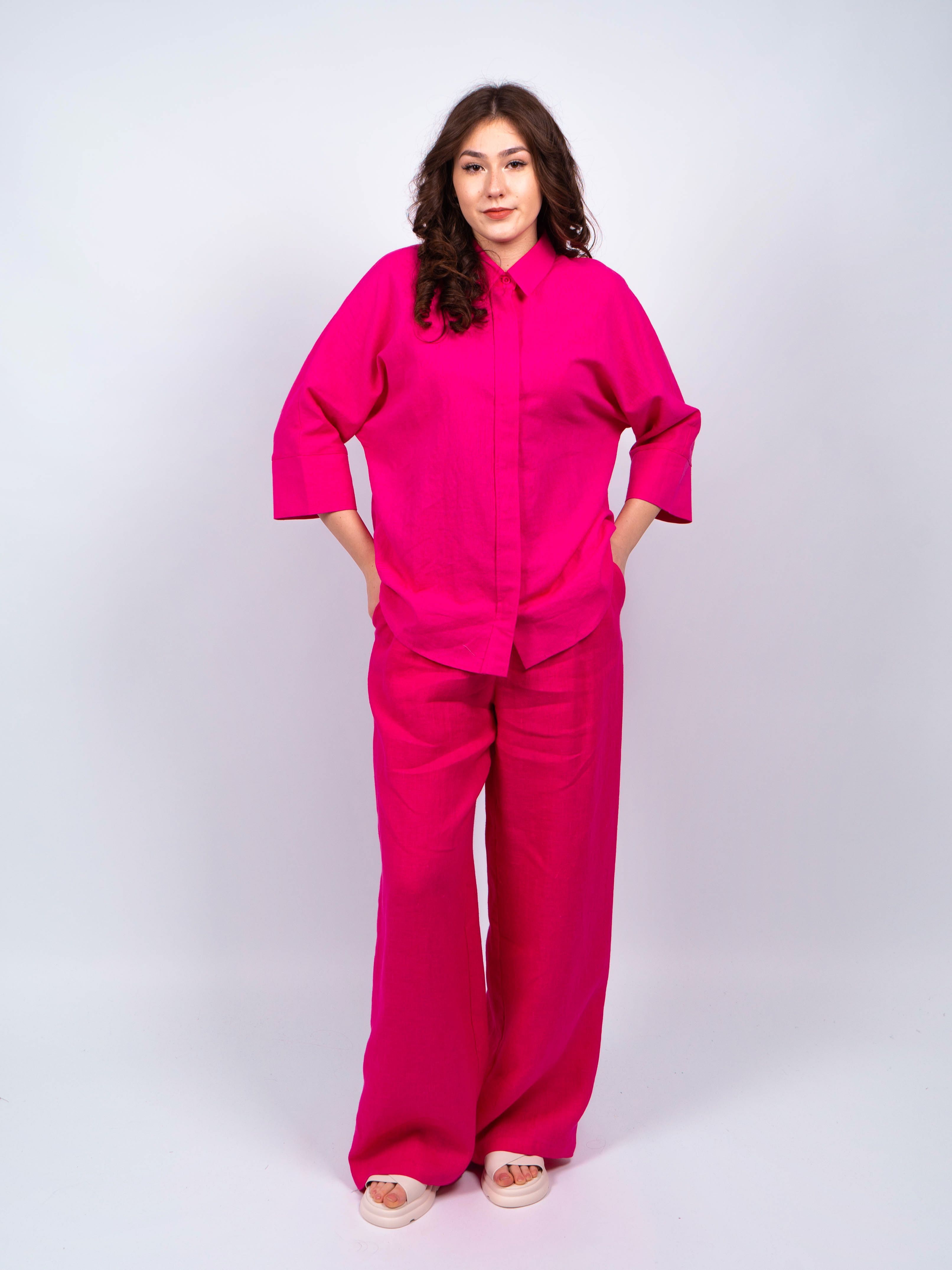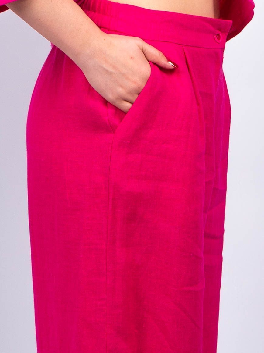 Брюки классические элегантного и стильного образа от obuv365. Брюки легкие и практически невесомые, идеально вписываются в летний образ женщин любого возраста. Брюки льняные фуксия больших размеров женские имеют прямой широкий крой и свободную посадку, обеспечивая свободу движений.