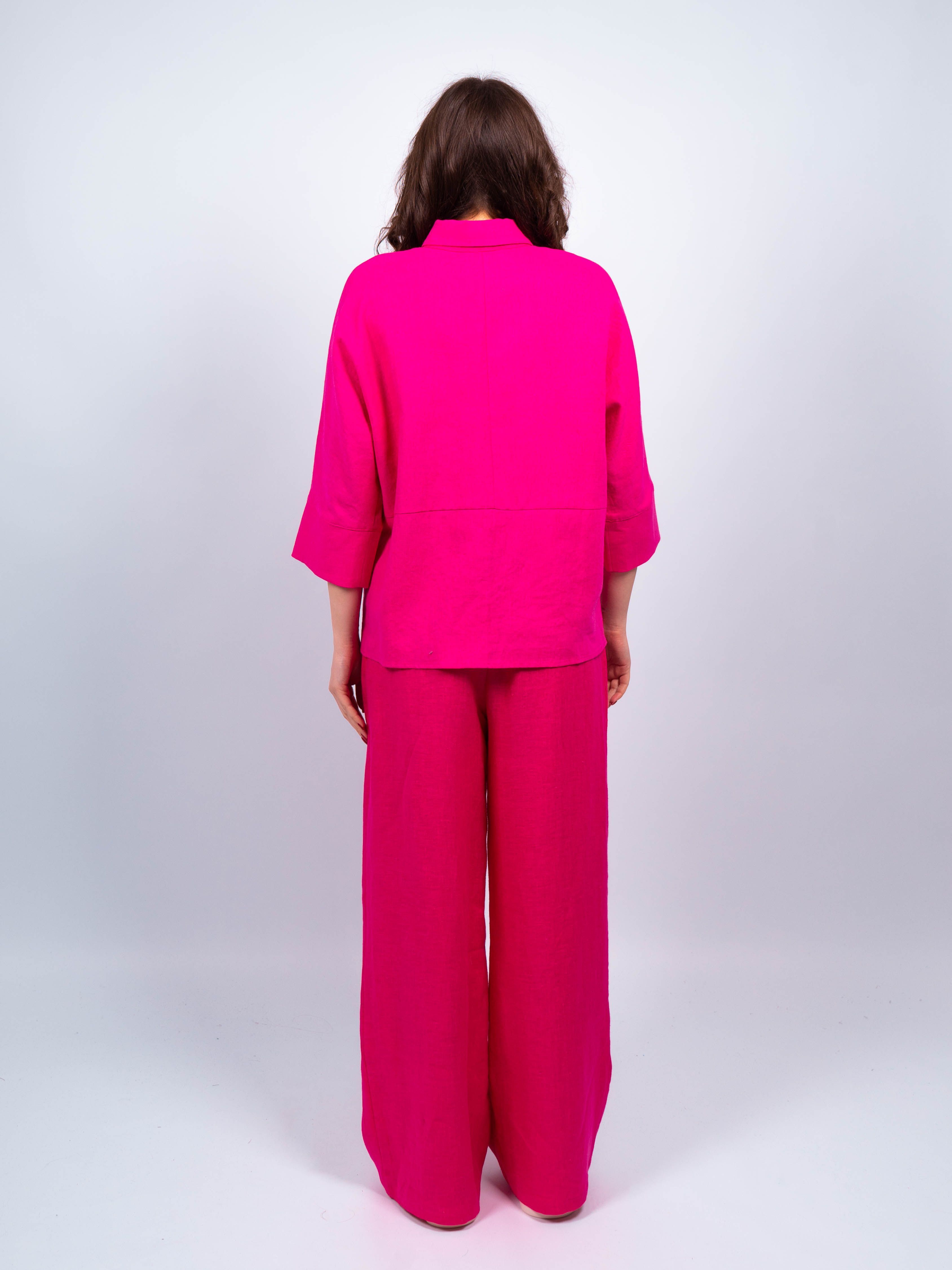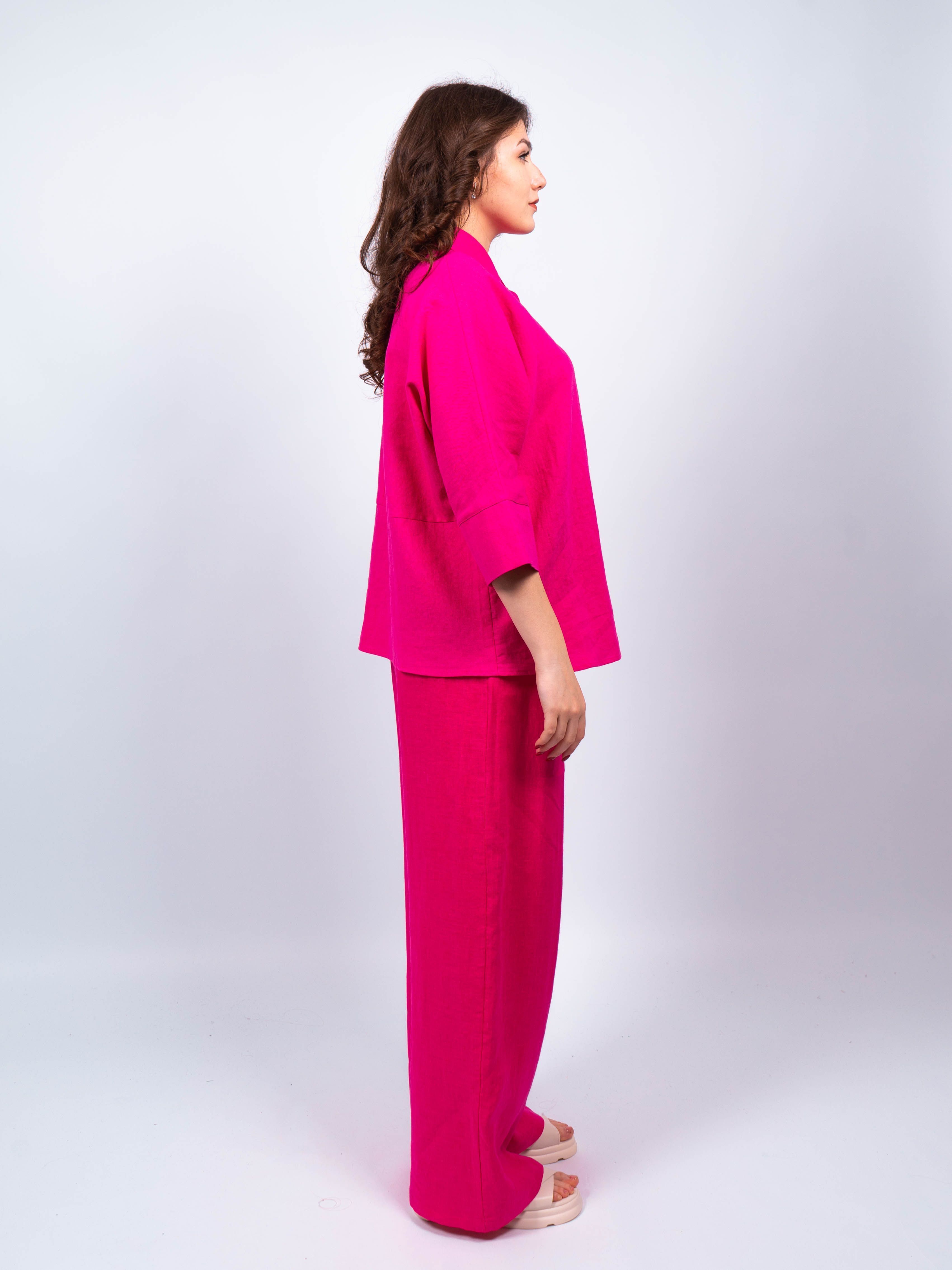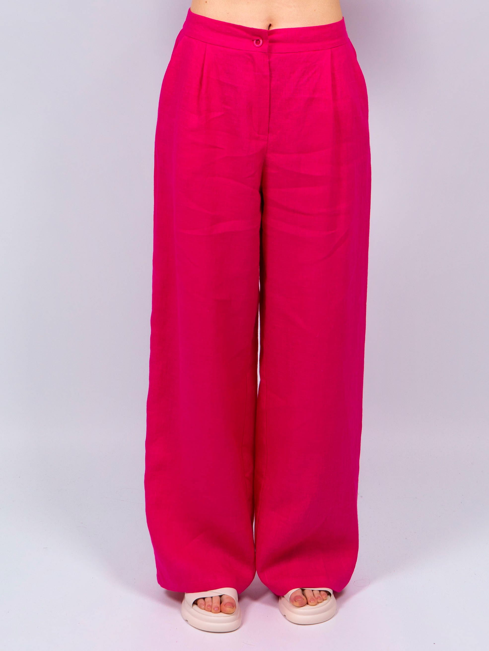 Брюки классические элегантного и стильного образа от obuv365. Брюки легкие и практически невесомые, идеально вписываются в летний образ женщин любого возраста. Брюки льняные фуксия больших размеров женские имеют прямой широкий крой и свободную посадку, обеспечивая свободу движений.