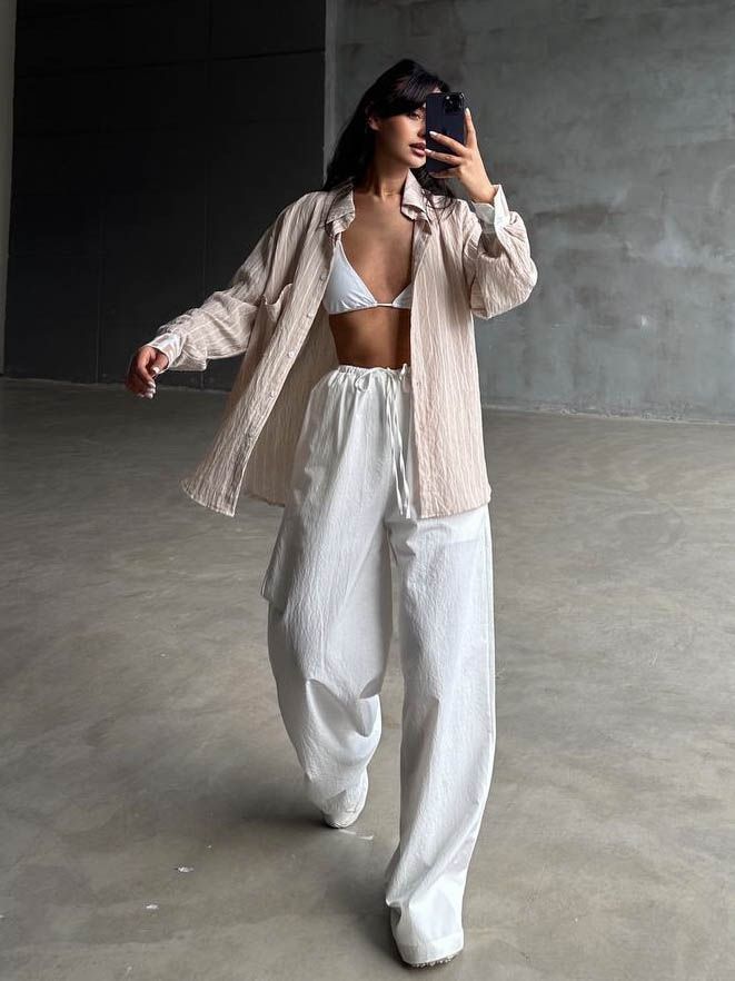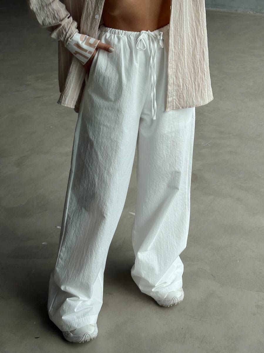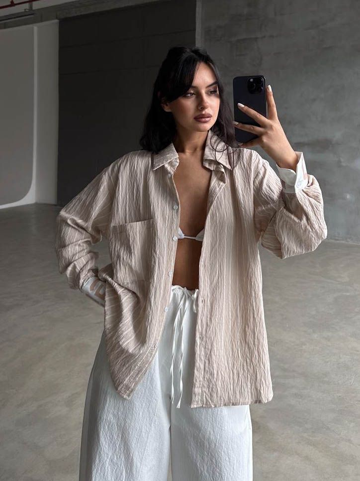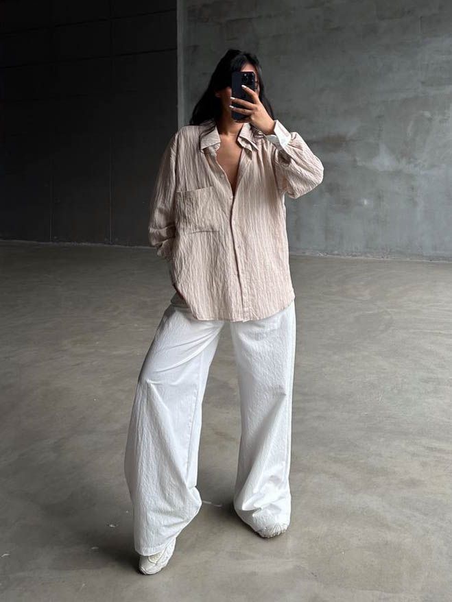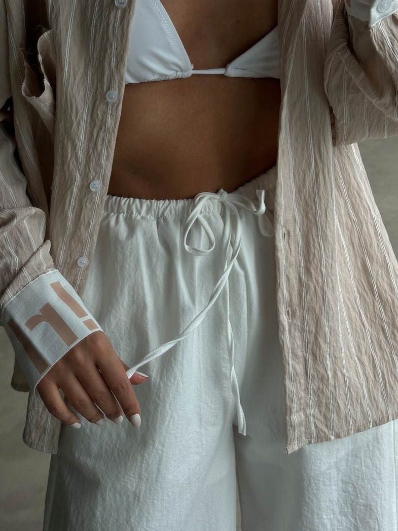 Летний женский легкий брючный костюм свободного кроя. Этот стильный и комфортный костюм станент незаменимым в вашем гардеробе для отпуска, пляжа и повседневных прогулок. Дышащий материал делает костюм максимально комфортным в жаркую погоду. Брюки палаццо однотонные белые отлично сочетаются с классической рубашкой в полоску в пижамном стиле бежевого цвета. Рубашка имеет классический ворот, застежку на пуговицах, длинный рукав с манжетой. Наш женский костюм отличный вариант для женщин всех возрастов и типов фигуры.