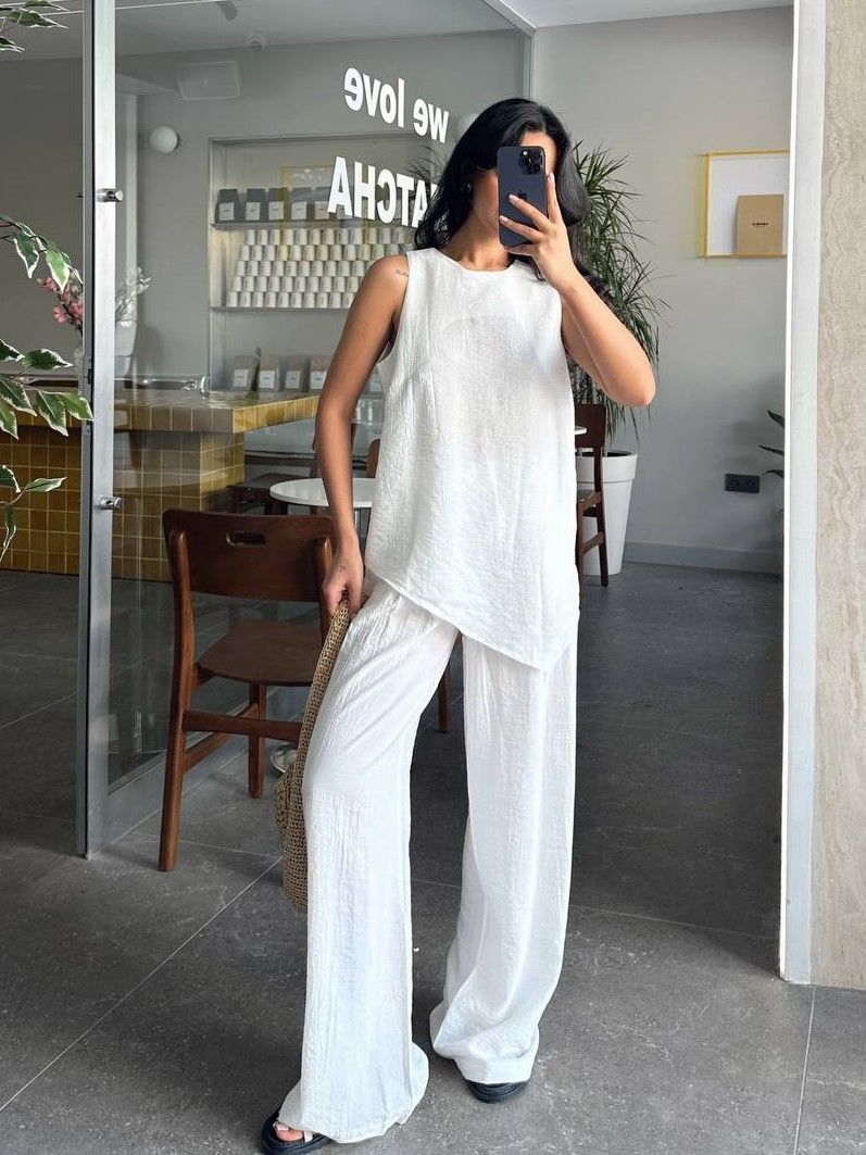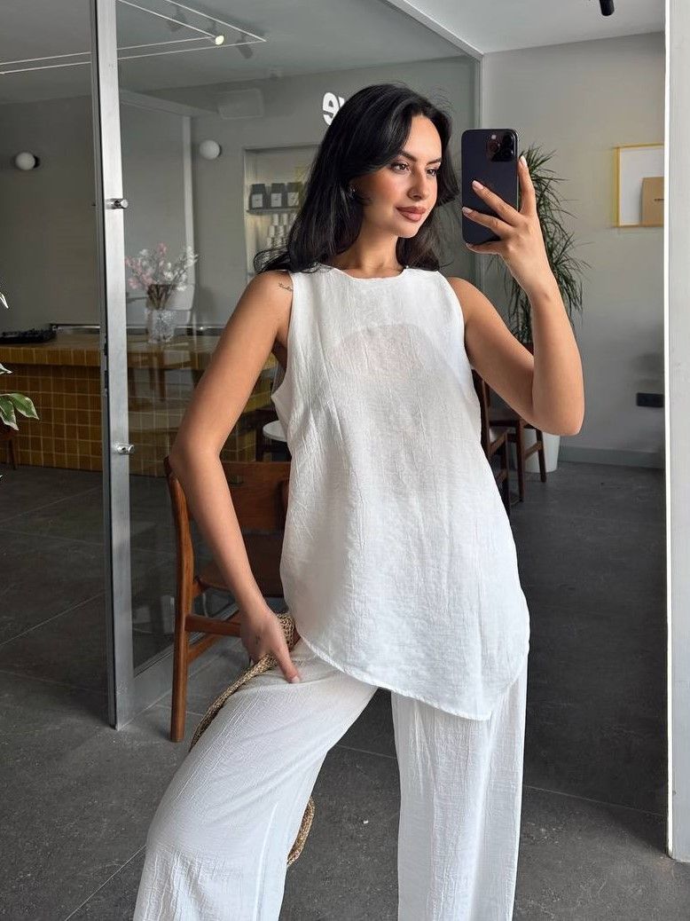 Летний женский легкий брючный костюм белого цвета свободного кроя. Этот стильный и комфортный костюм станент незаменимым в вашем гардеробе для отпуска, пляжа и повседневных прогулок. Дышащий материал делает костюм максимально комфортным в жаркую погоду. Брюки палаццо однотонные на резинке с карманами отлично сочетаются с топом без рукава. Кофта имеет круглый вырез и ассиметричный низ. Наш женский костюм отличный вариант для женщин всех возрастов и типов фигуры.