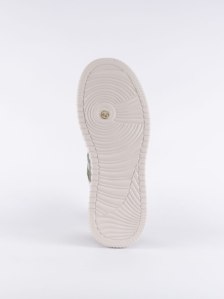 Кеды цвета хаки с белыми и зелеными вставками сочетаются с разной палитрой одежды и сделают Ваш образ более ярким и привлекательным.