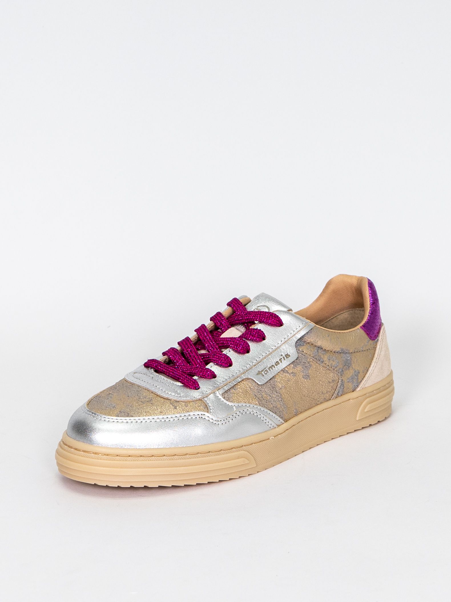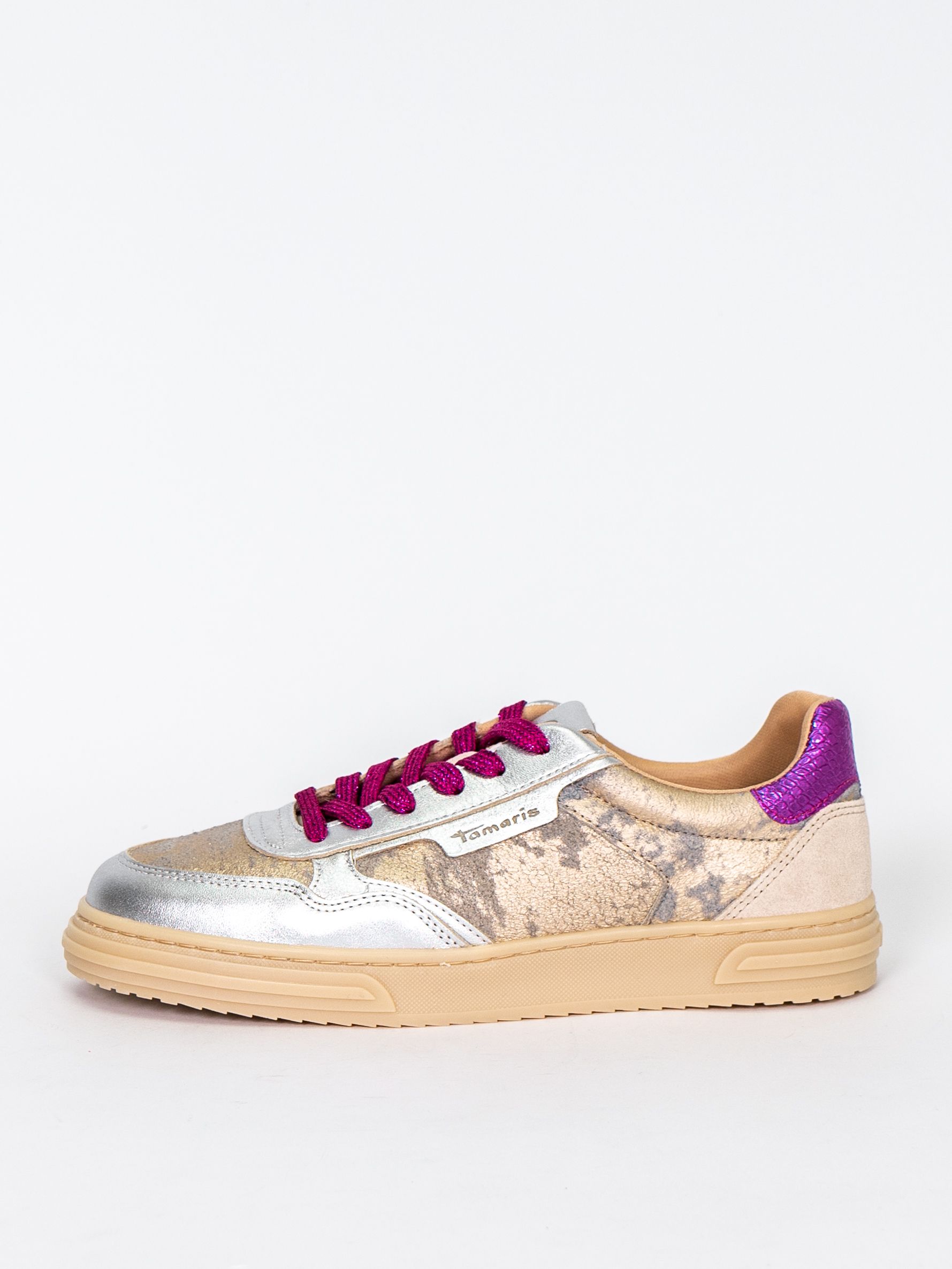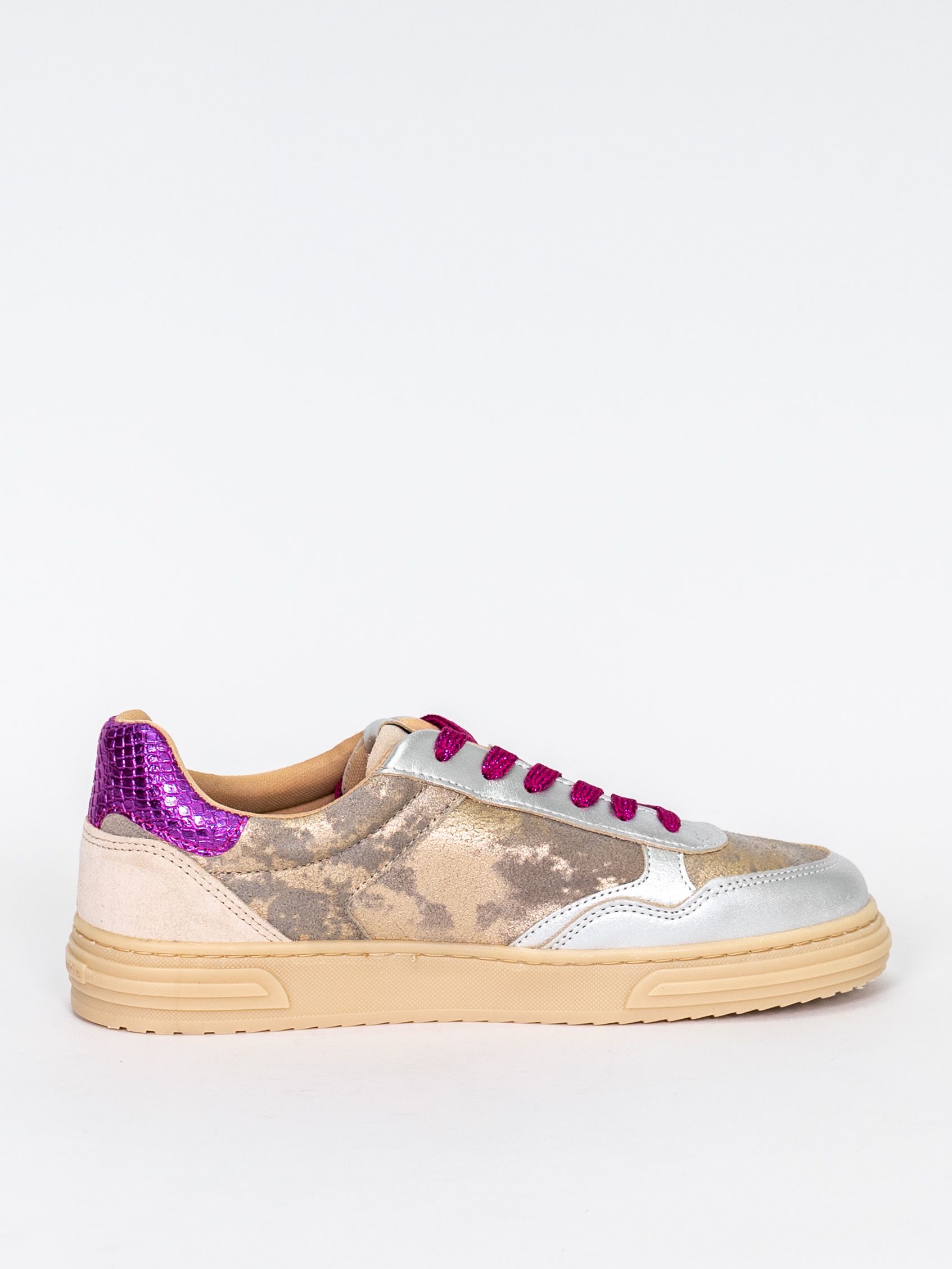 Кеды женские бежевого цвета с серебристыми вставками и малиновыми шнурками с блестками на плоской подошве, разработаны с учетом анатомических особенностей стопы и гарантируют комфорт даже при длительной носке, а мягкая подкладка позволяет ноге находиться в комфорте на протяжении всего времени.