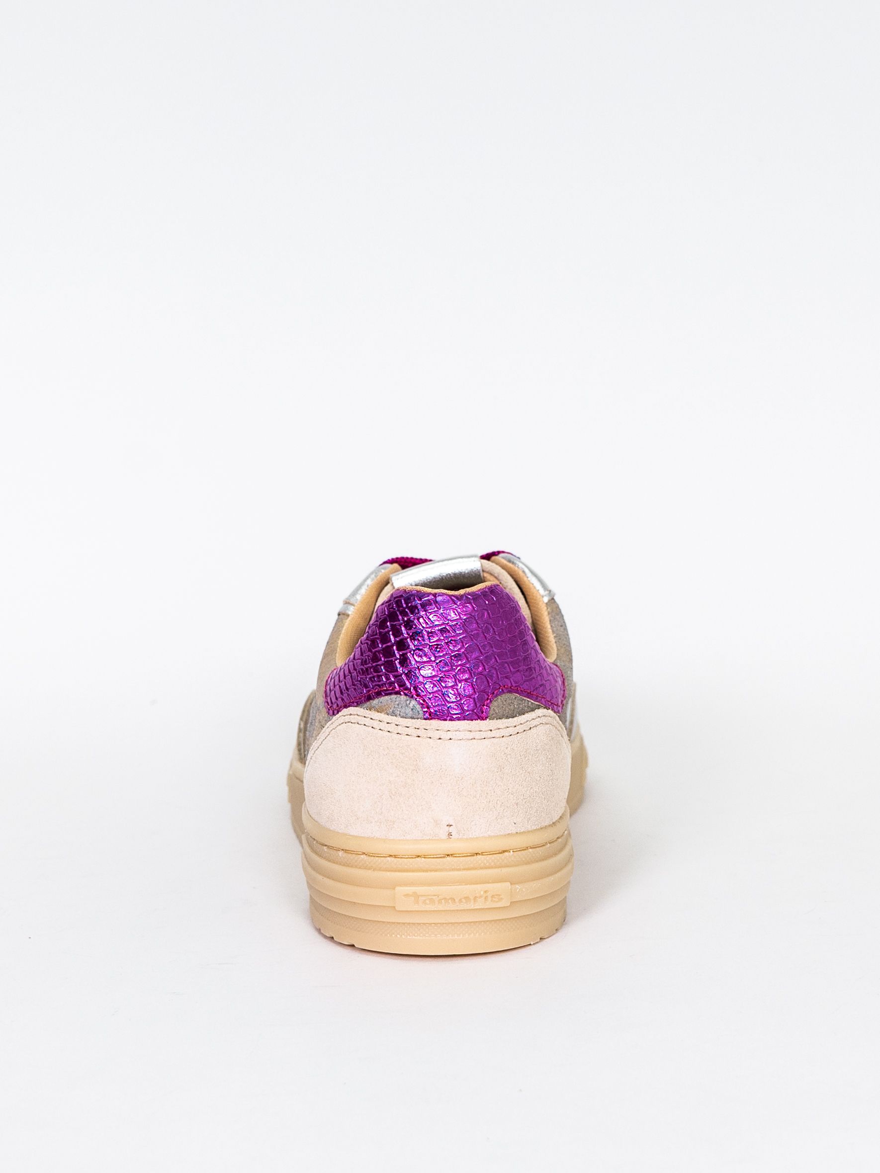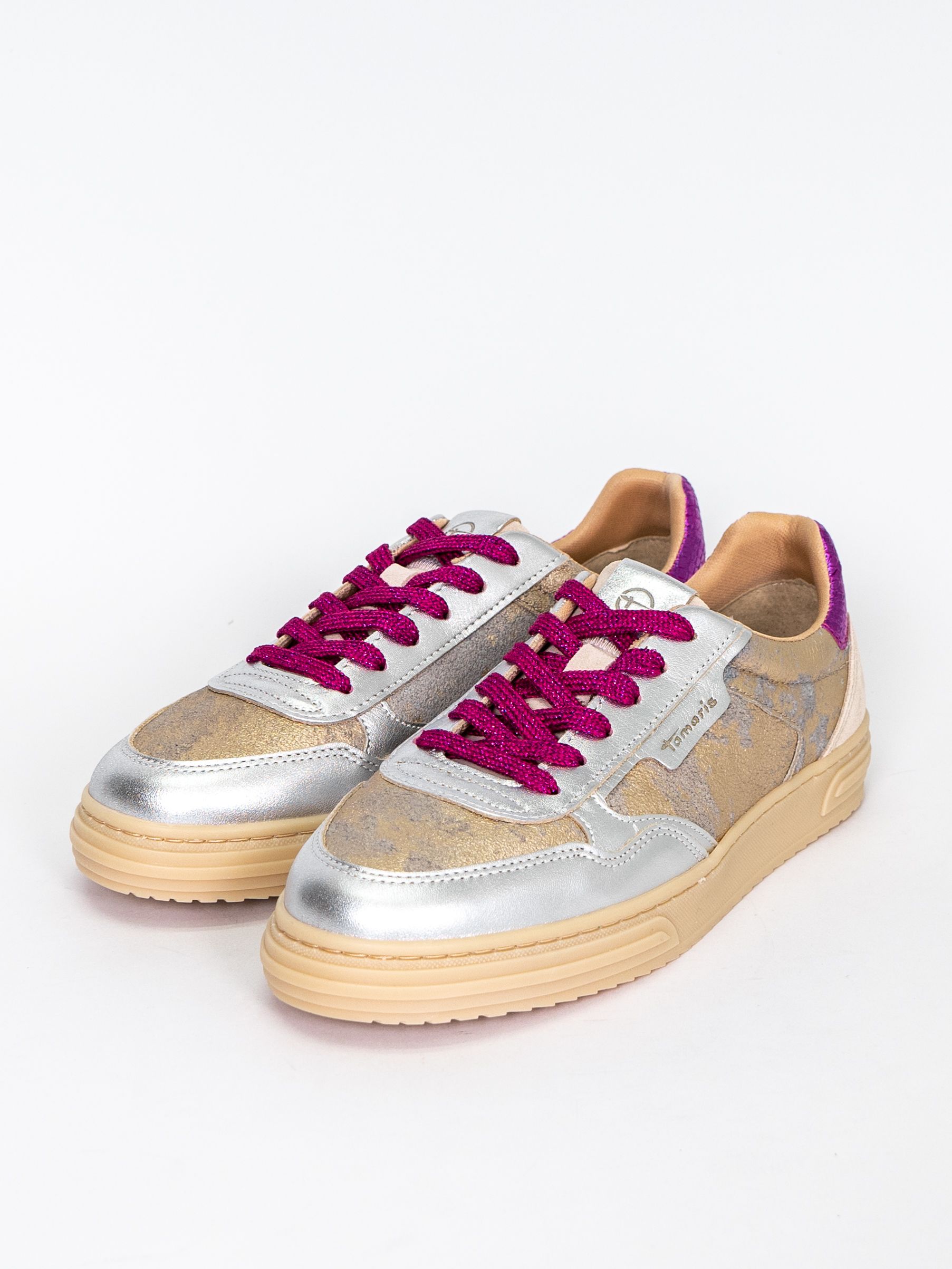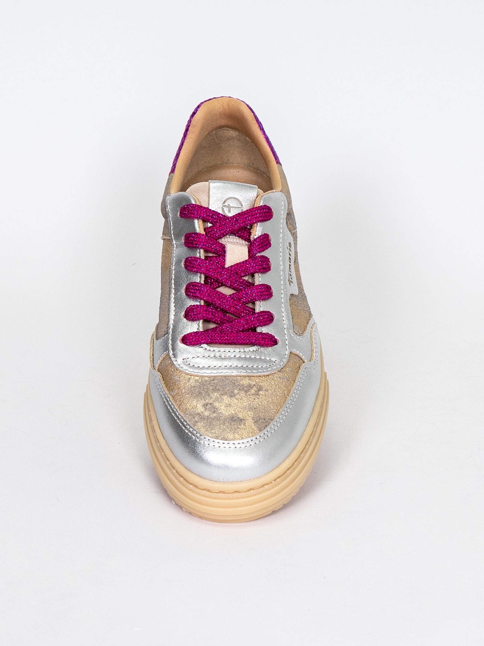 Кеды женские бежевого цвета с серебристыми вставками и малиновыми шнурками с блестками на плоской подошве, разработаны с учетом анатомических особенностей стопы и гарантируют комфорт даже при длительной носке, а мягкая подкладка позволяет ноге находиться в комфорте на протяжении всего времени.