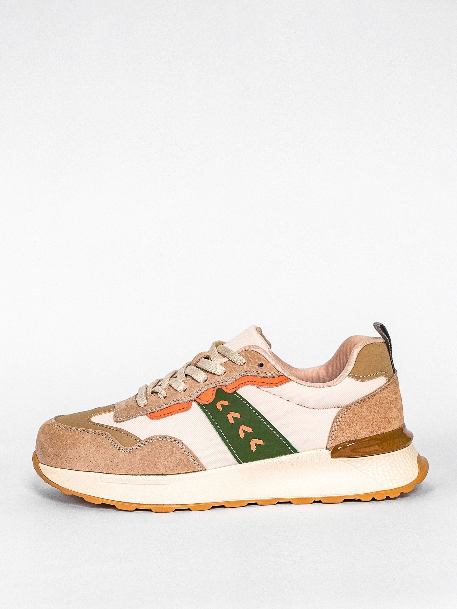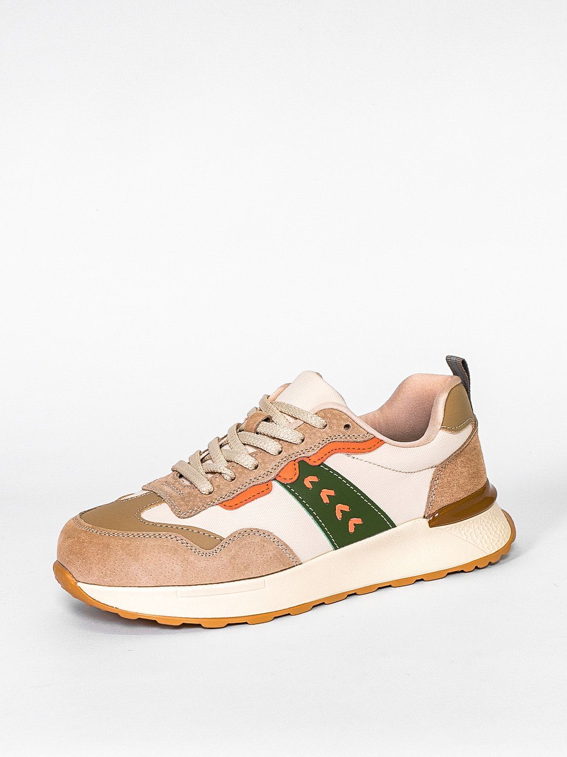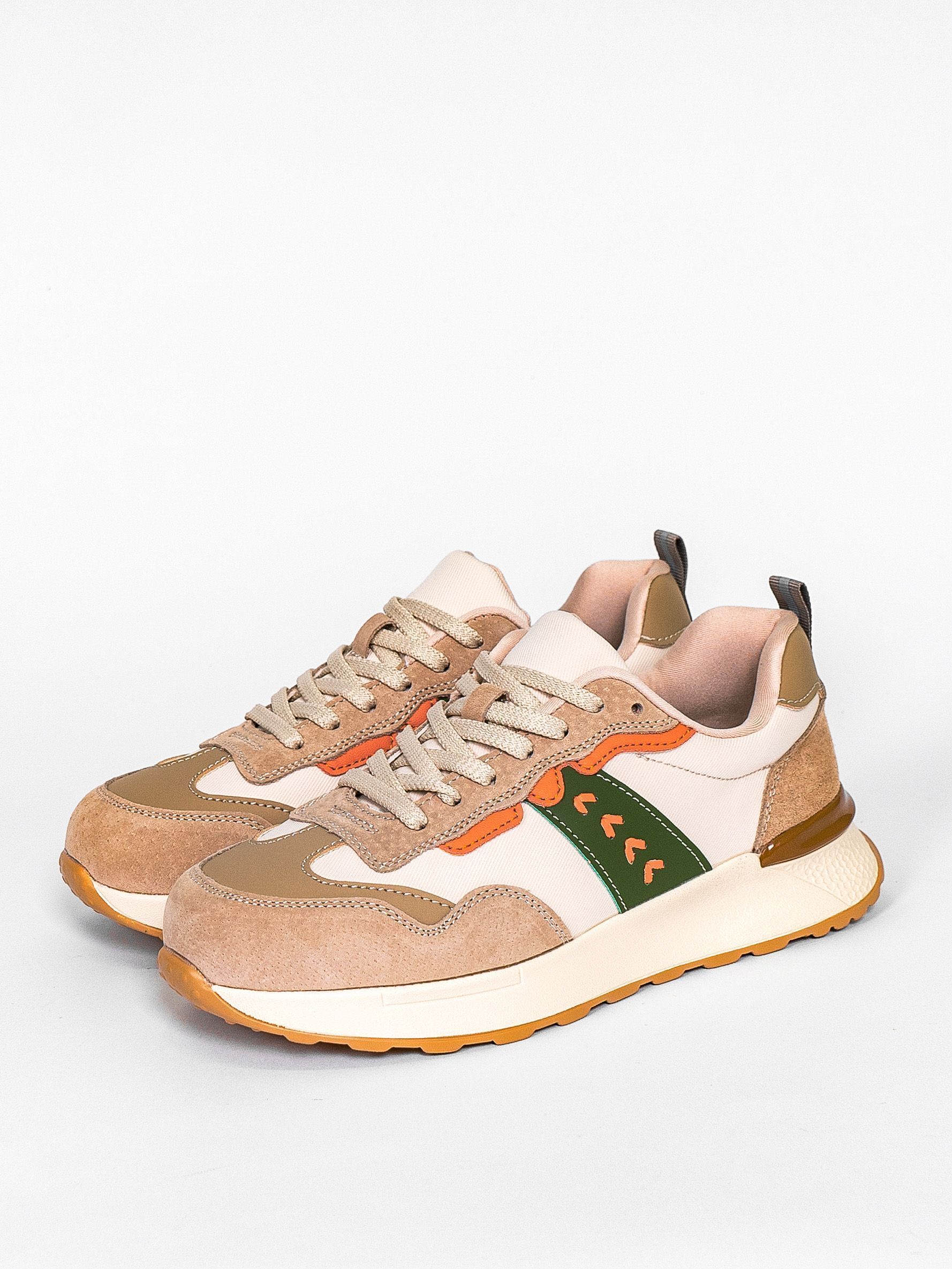 Кроссовки женские бежевого цвета с зелеными и оранжевыми вставками разработаны с учетом анатомических особенностей стопы и гарантируют комфорт даже при длительной носке, а мягкая подкладка позволяет ноге находиться в комфорте на протяжении всего времени.