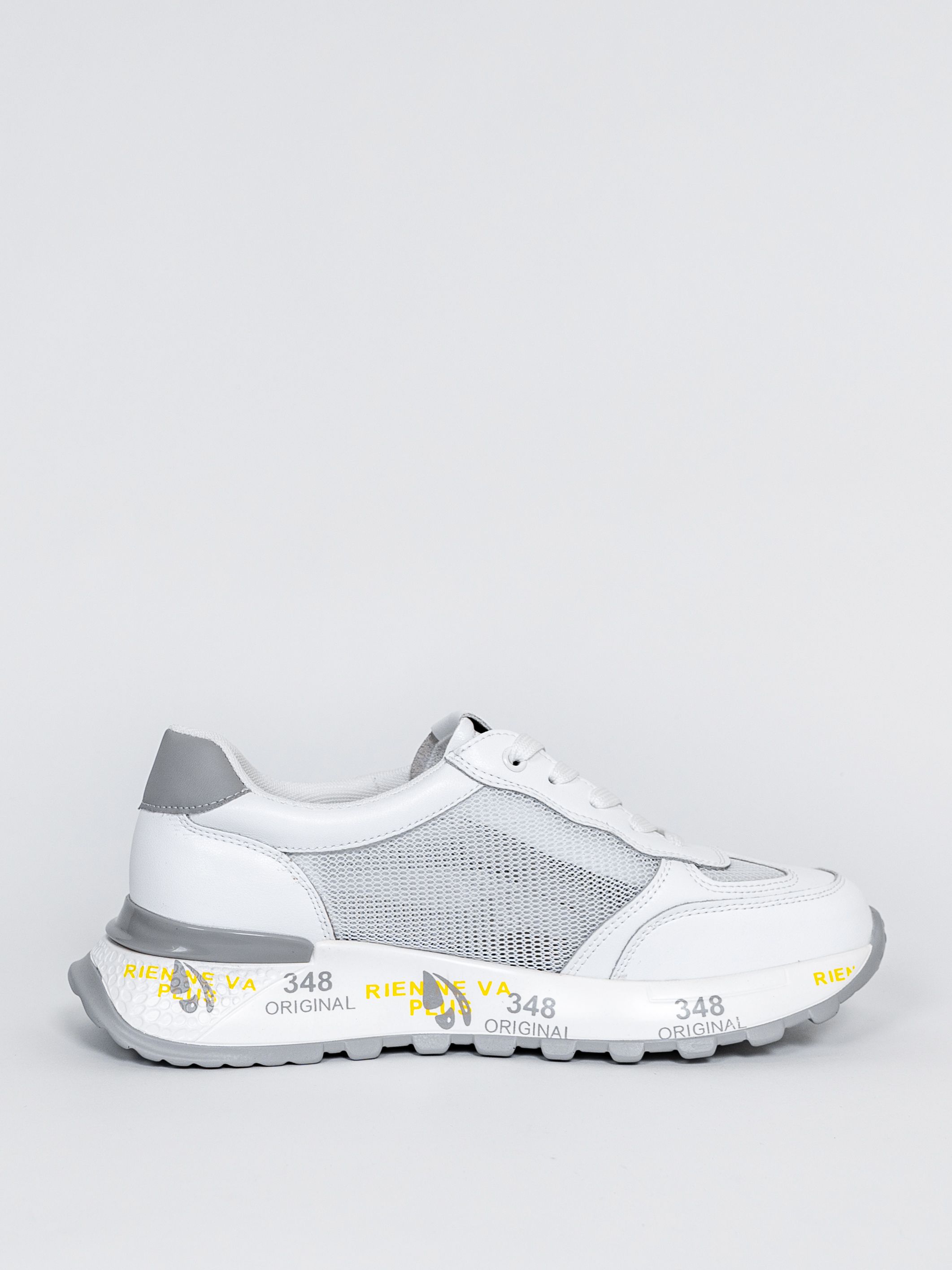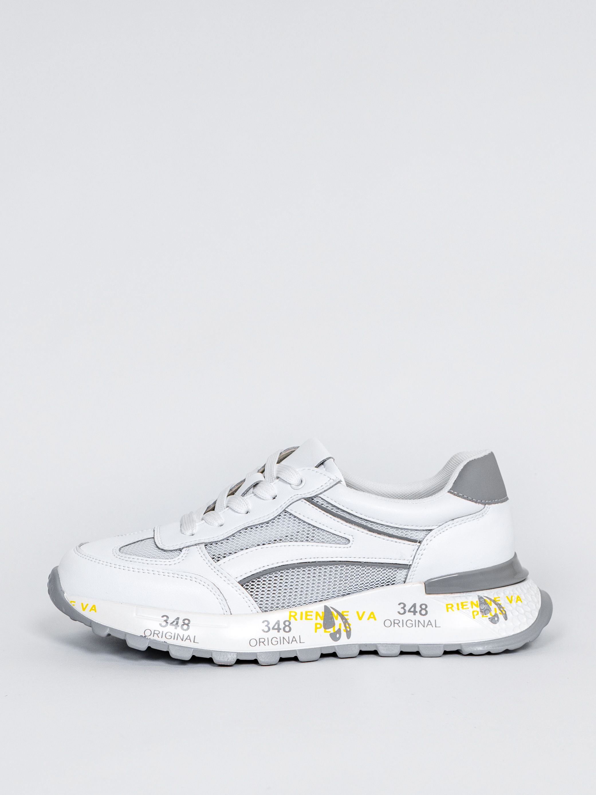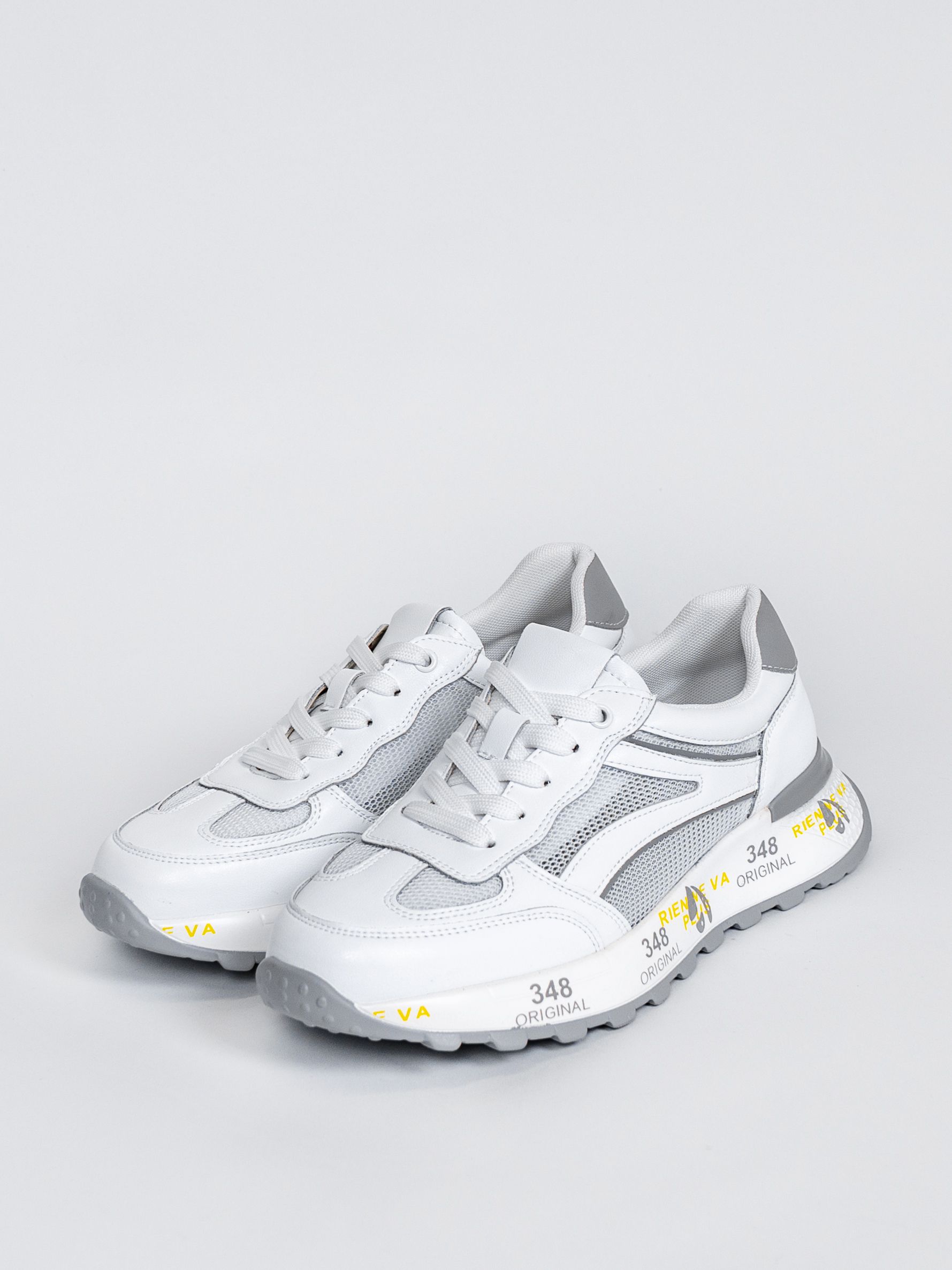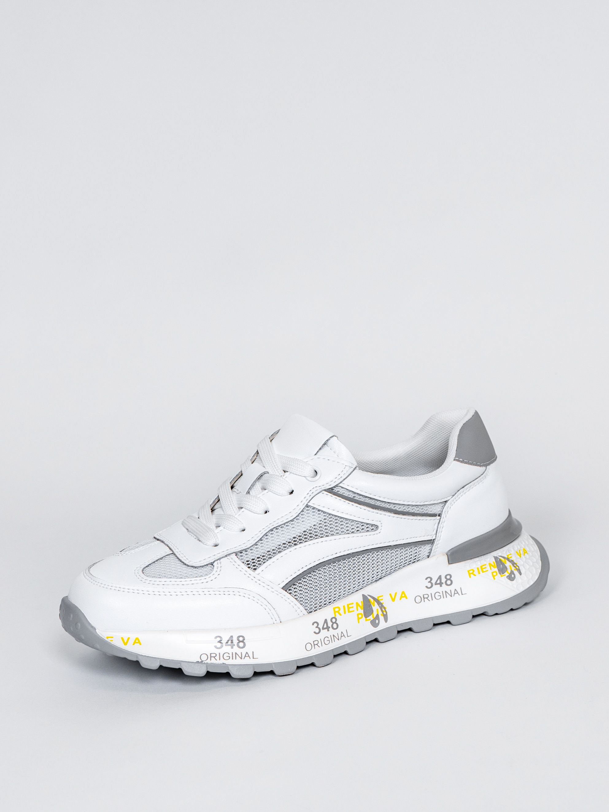 Цветовая гамма представлена в универсальном белом цвете с яркими акцентными надписями и вставками, что позволяет сочетать кроссовки с различными элементами гардероба.