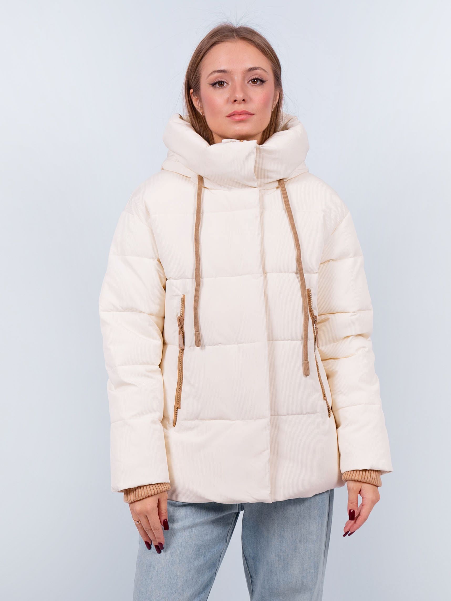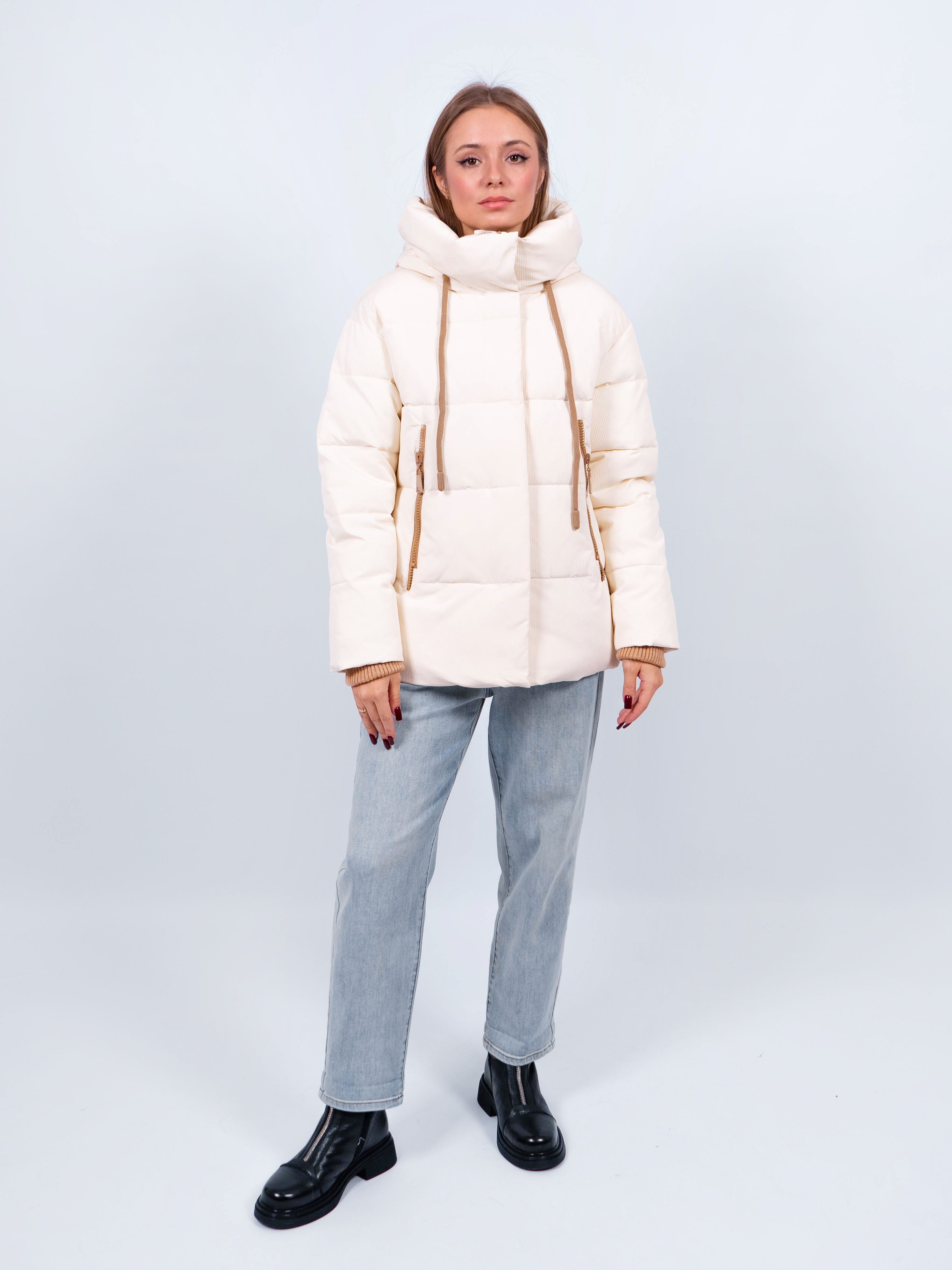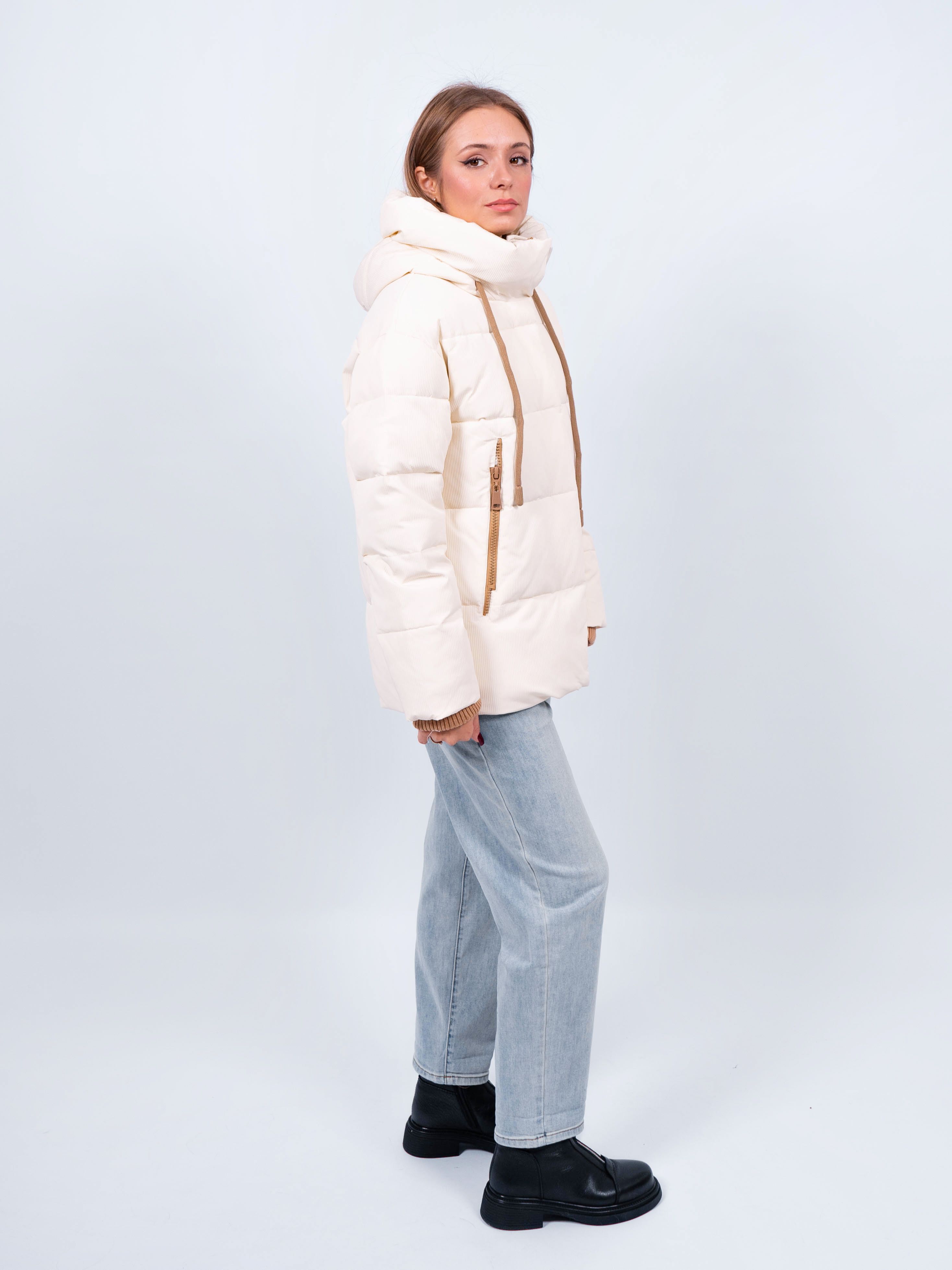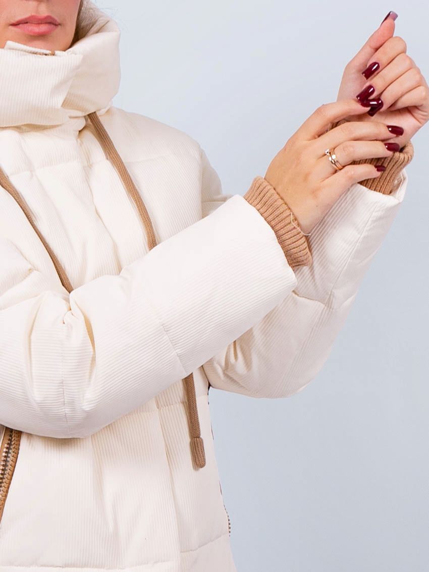Зимняя куртка бежевая имеет удобную застежку - молния, что позволяет легко и быстро надевать и снимать куртку. Рукав прямой втачной, есть трикотажные манжеты. Низ куртки на кулиске. Карманы прорезные на молнии, контрастные, они не только добавляют функциональности, но и являются стильным акцентом. Воротник стойка, капюшон не остегивается, имеет контрастный шнурок-утяжку. Длина изделия до середины бедра - 73 см, подходит на рост 165-170 см. Размерный ряд с 42 по 50. Куртка молочного цвета хорошо сочетается с обувью любого фасона.