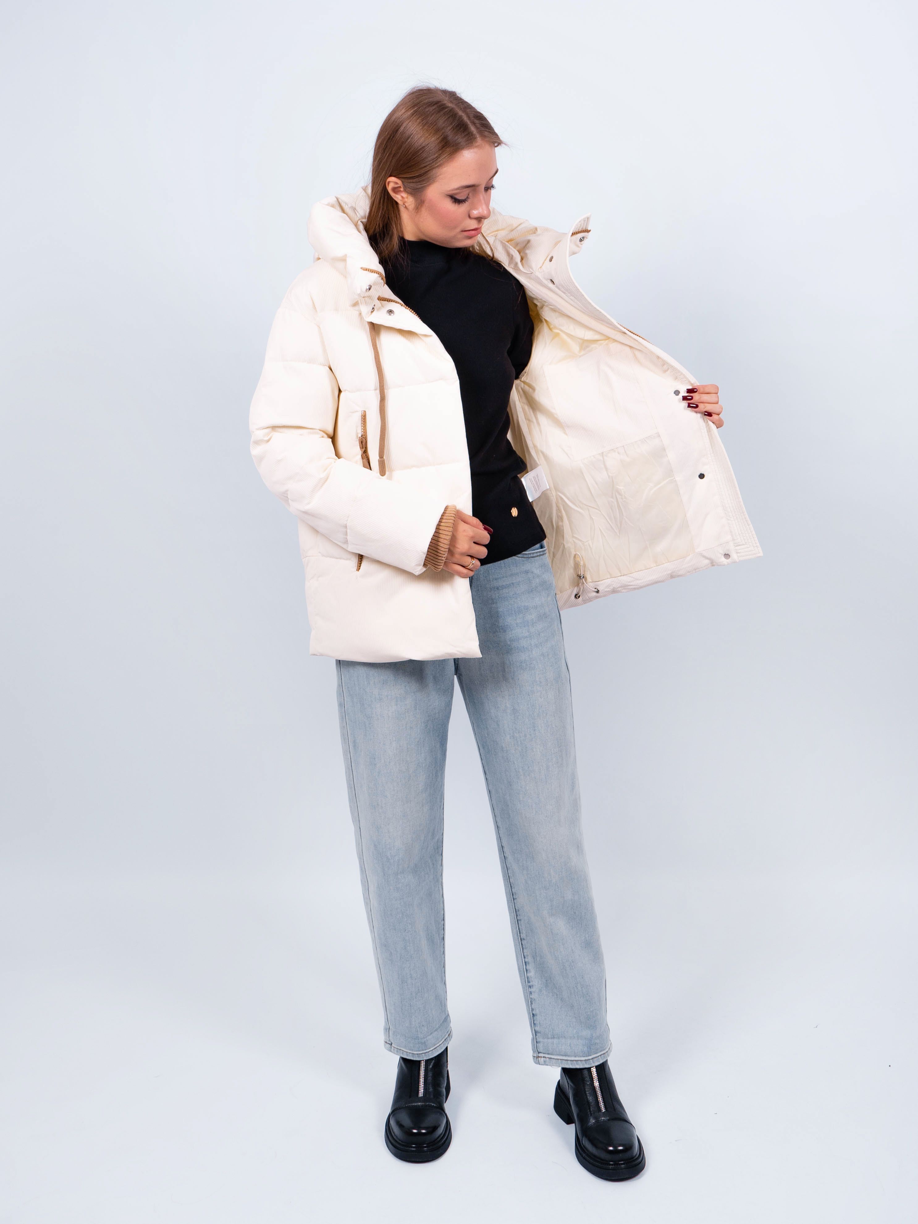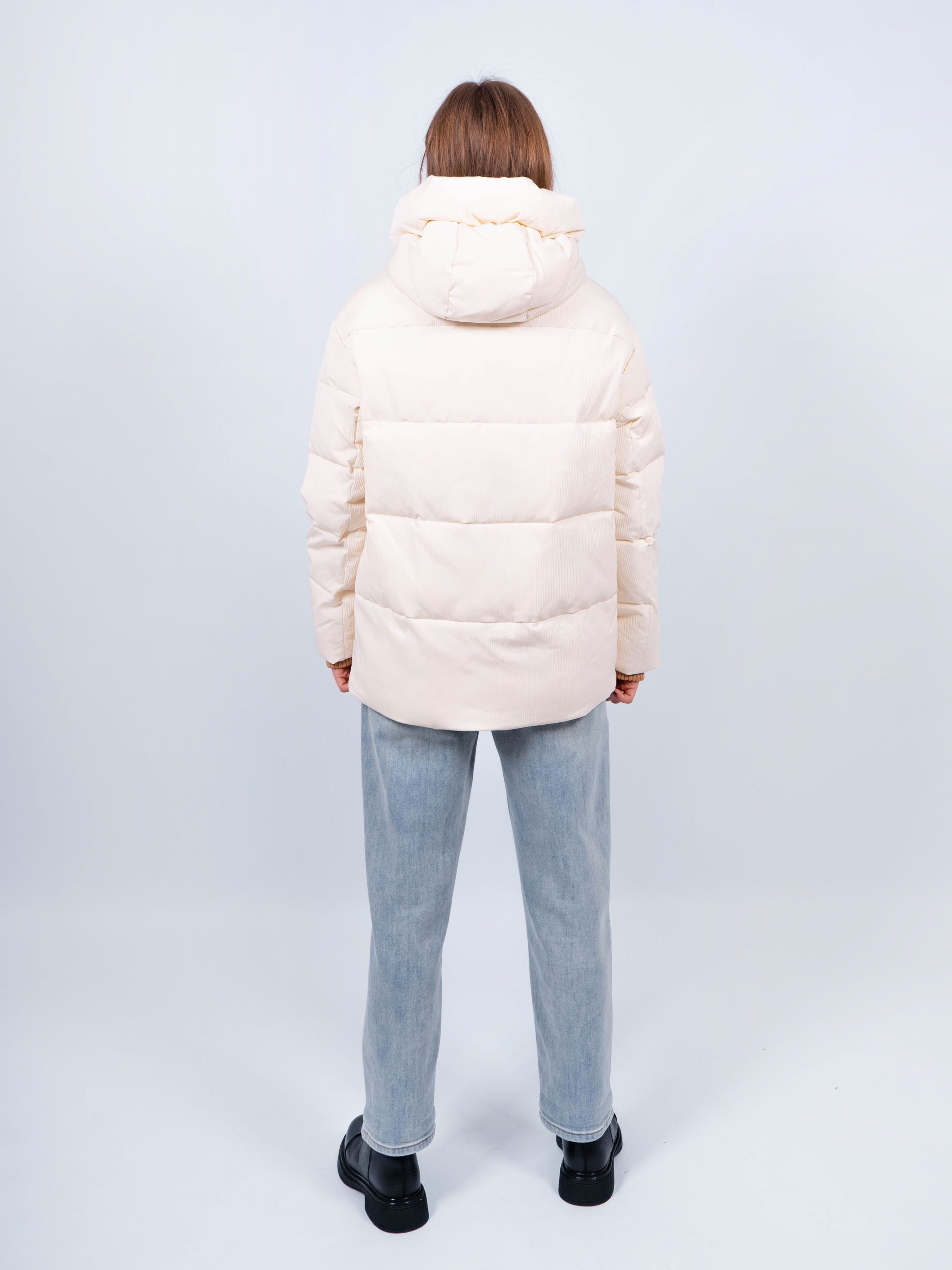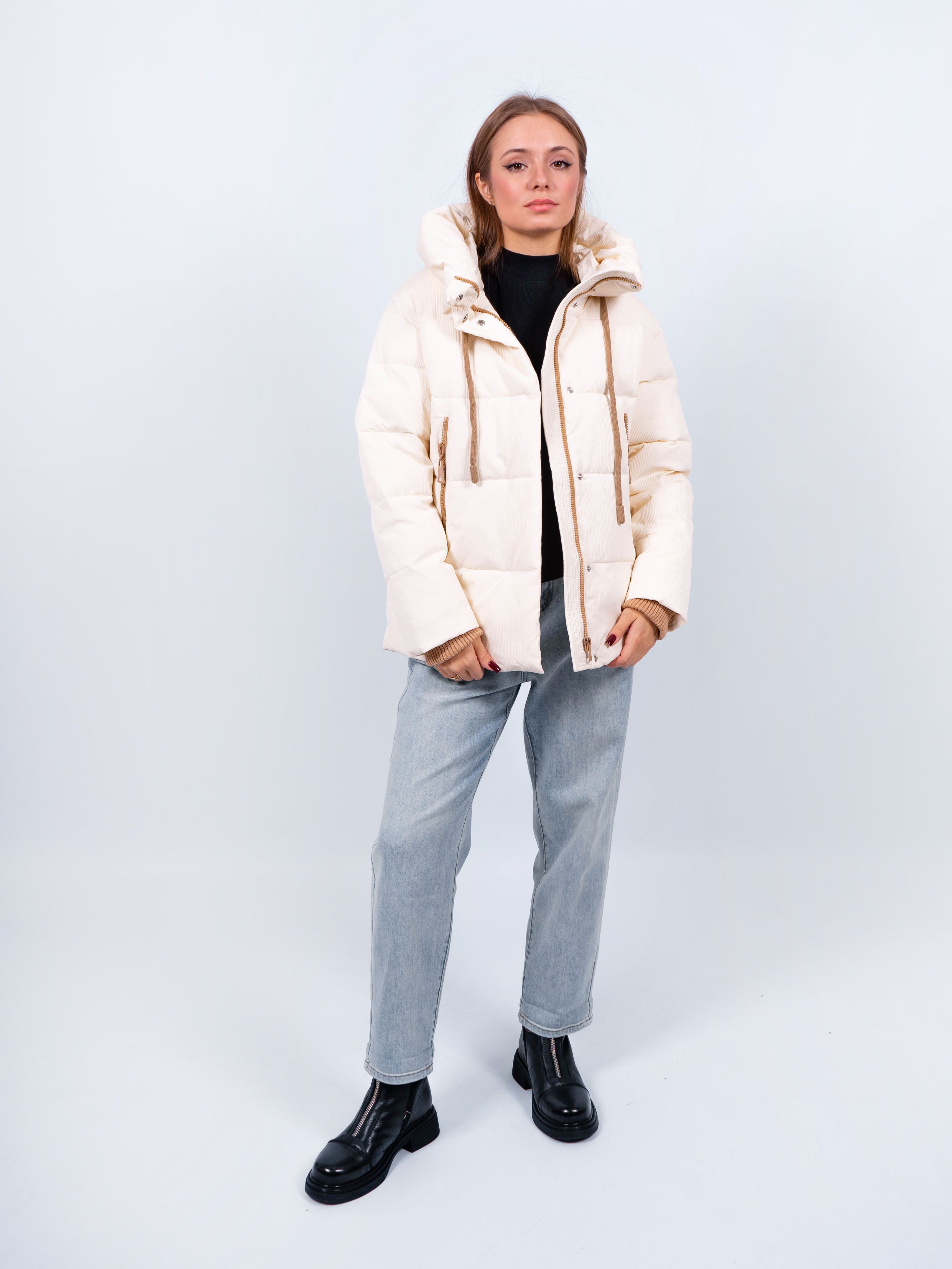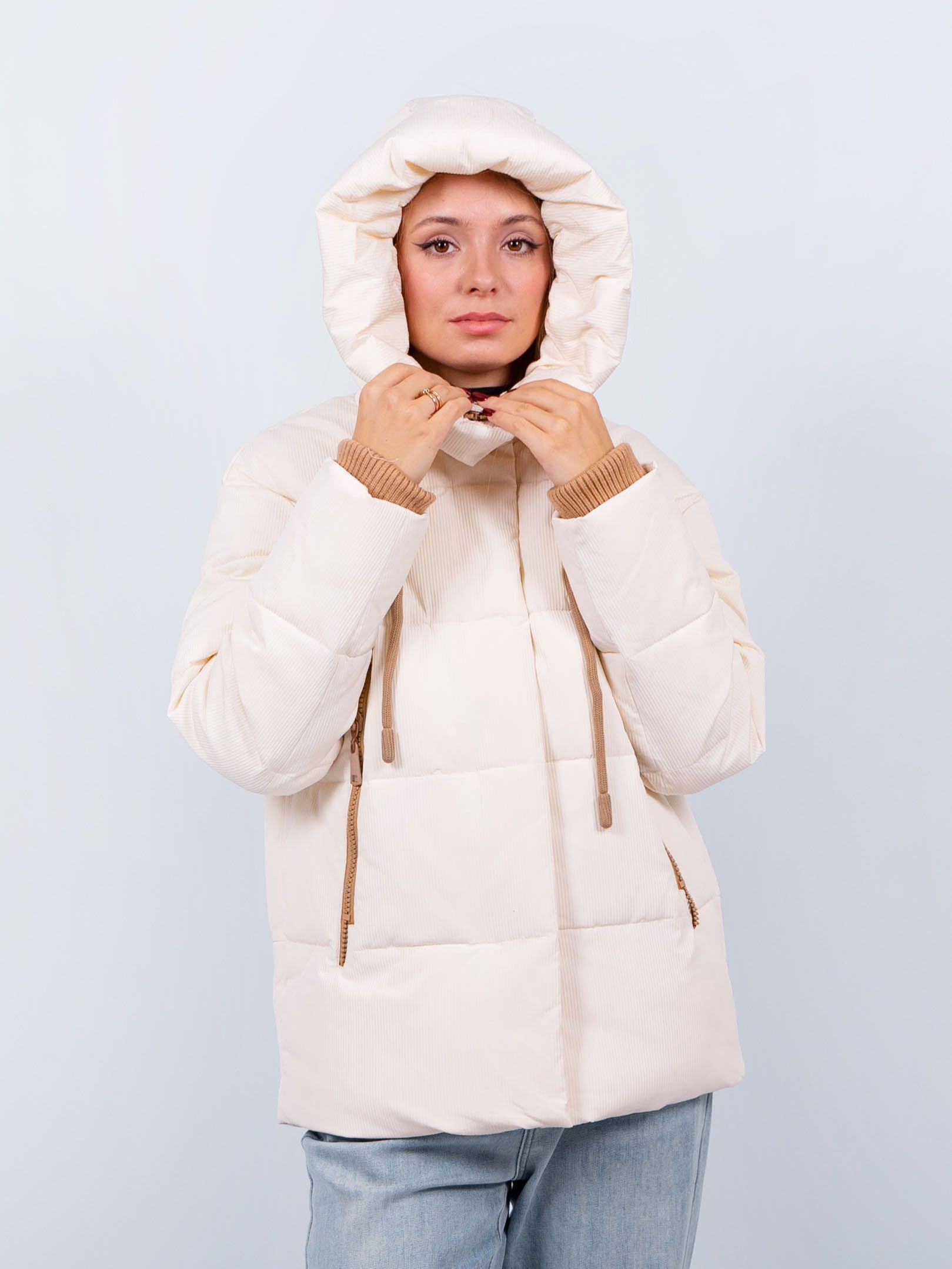 Зимняя куртка бежевая имеет удобную застежку - молния, что позволяет легко и быстро надевать и снимать куртку. Рукав прямой втачной, есть трикотажные манжеты. Низ куртки на кулиске. Карманы прорезные на молнии, контрастные, они не только добавляют функциональности, но и являются стильным акцентом. Воротник стойка, капюшон не остегивается, имеет контрастный шнурок-утяжку. Длина изделия до середины бедра - 73 см, подходит на рост 165-170 см. Размерный ряд с 42 по 50. Куртка молочного цвета хорошо сочетается с обувью любого фасона.
