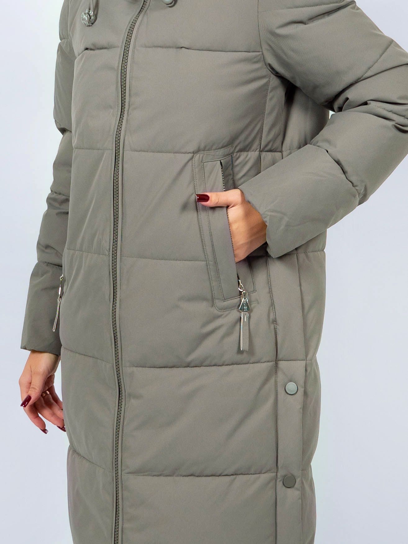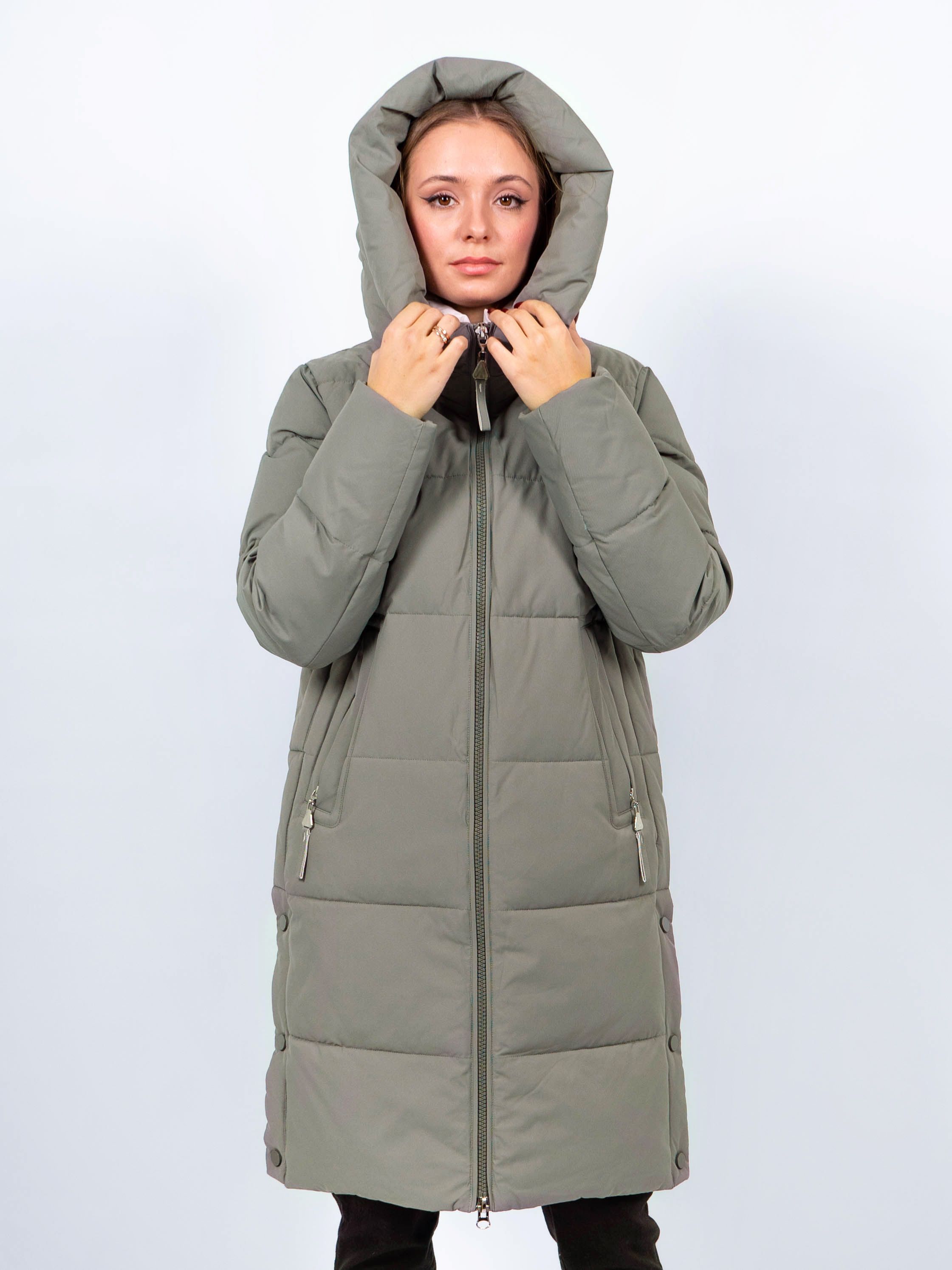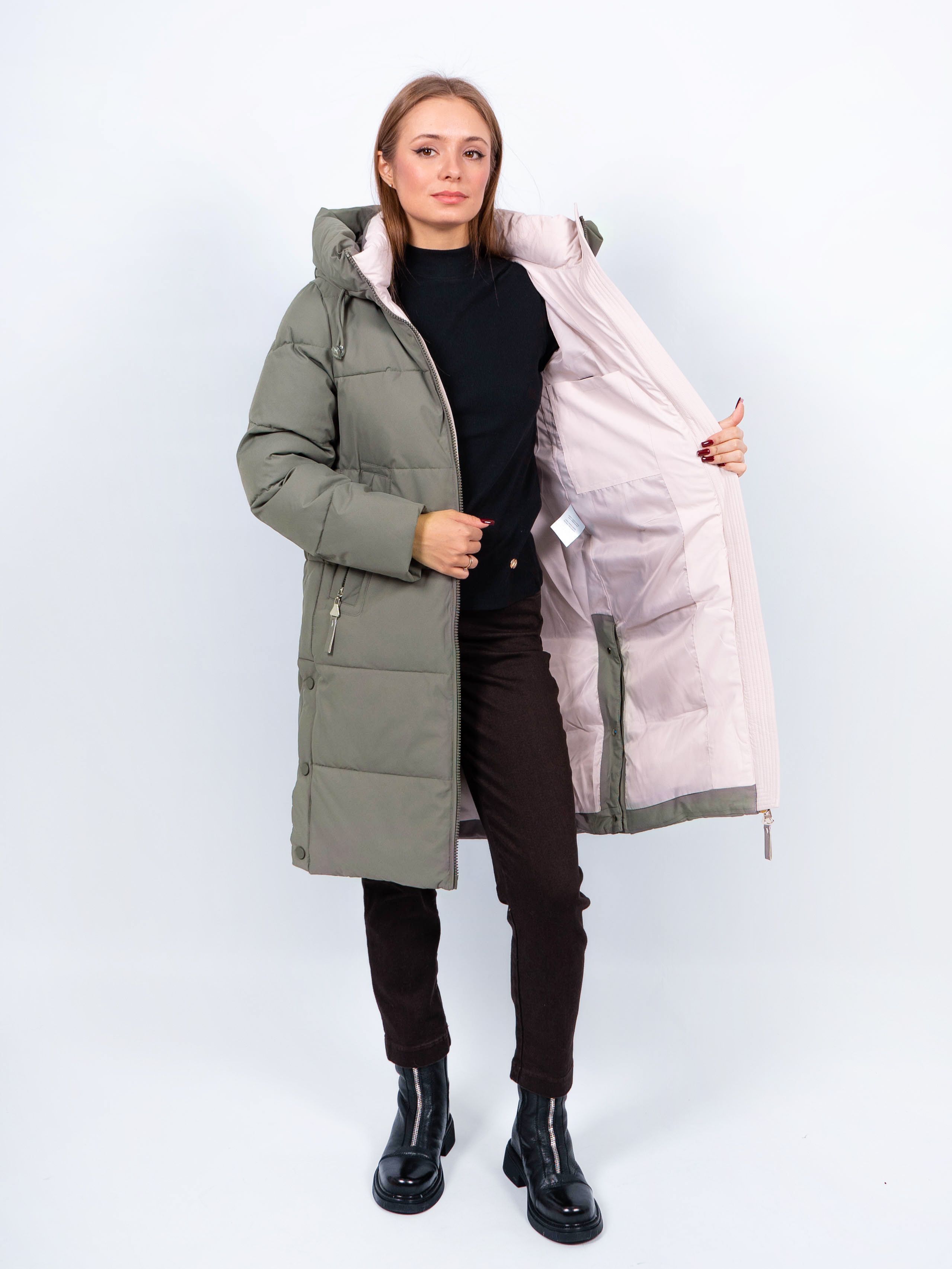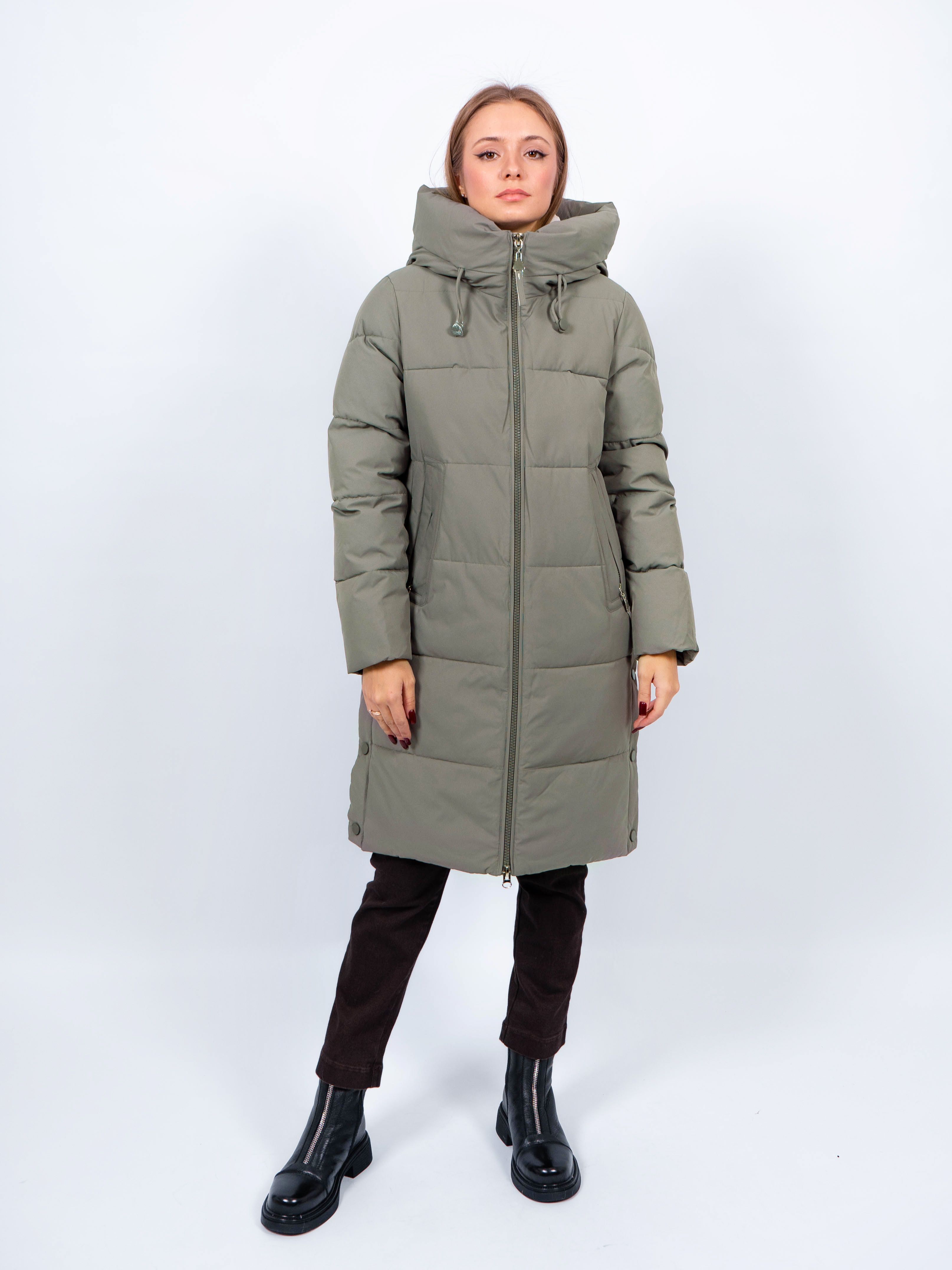 Зимняя куртка имеет удобную застежку - молния, что позволяет легко и быстро надевать и снимать куртку. Рукав втачной прямой, имеет манжеты. Внешние карманы на молнии, имеется внутренний карман. Снизу по бокам имеются функциональные кнопки, расстегиваются, что обеспечивает дополнительное удобство и является стильным акцентом. Воротник стойка. Длина изделия до колена - 90 см, подходит на рост 165-170 см. Размерный ряд с 44 по 52. Пальто зеленого цвета хорошо сочетается с обувью любого фасона.