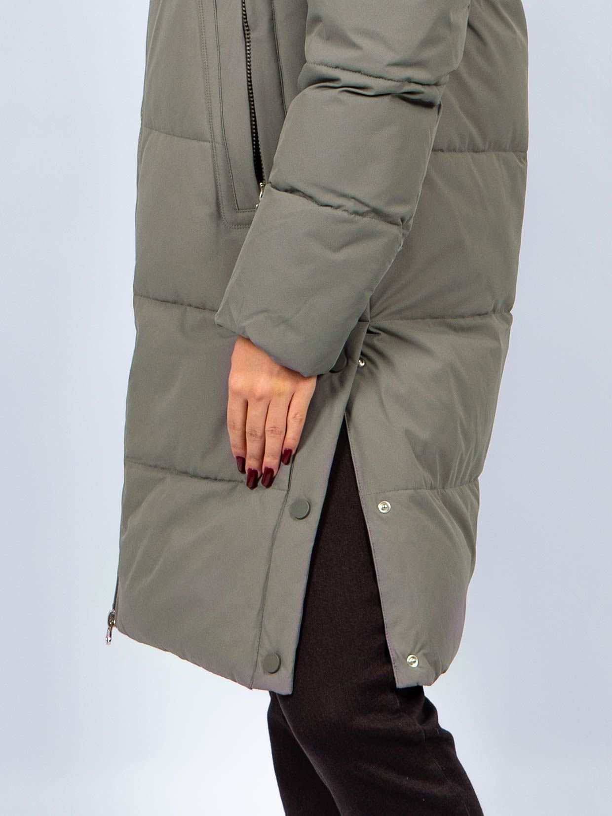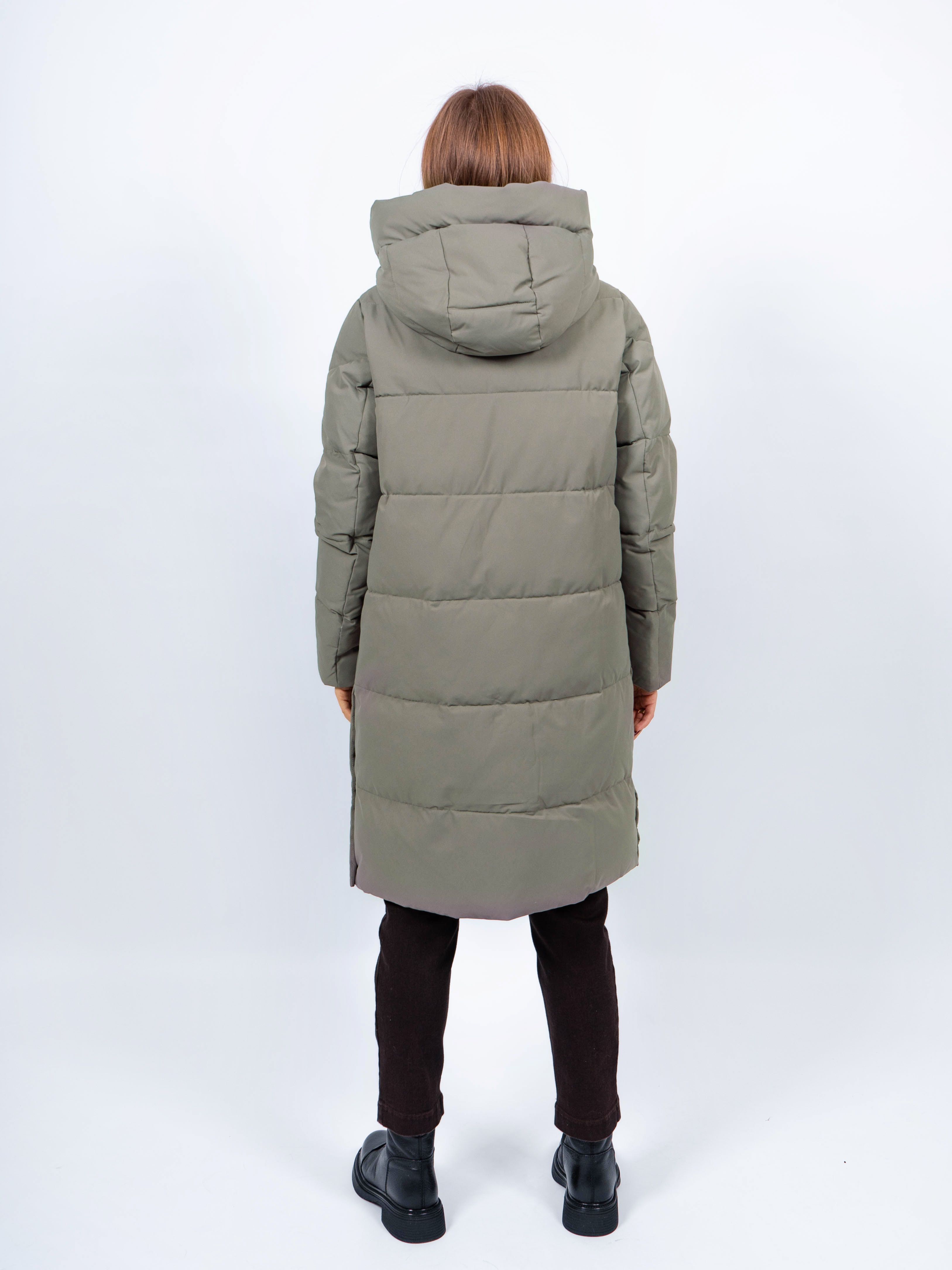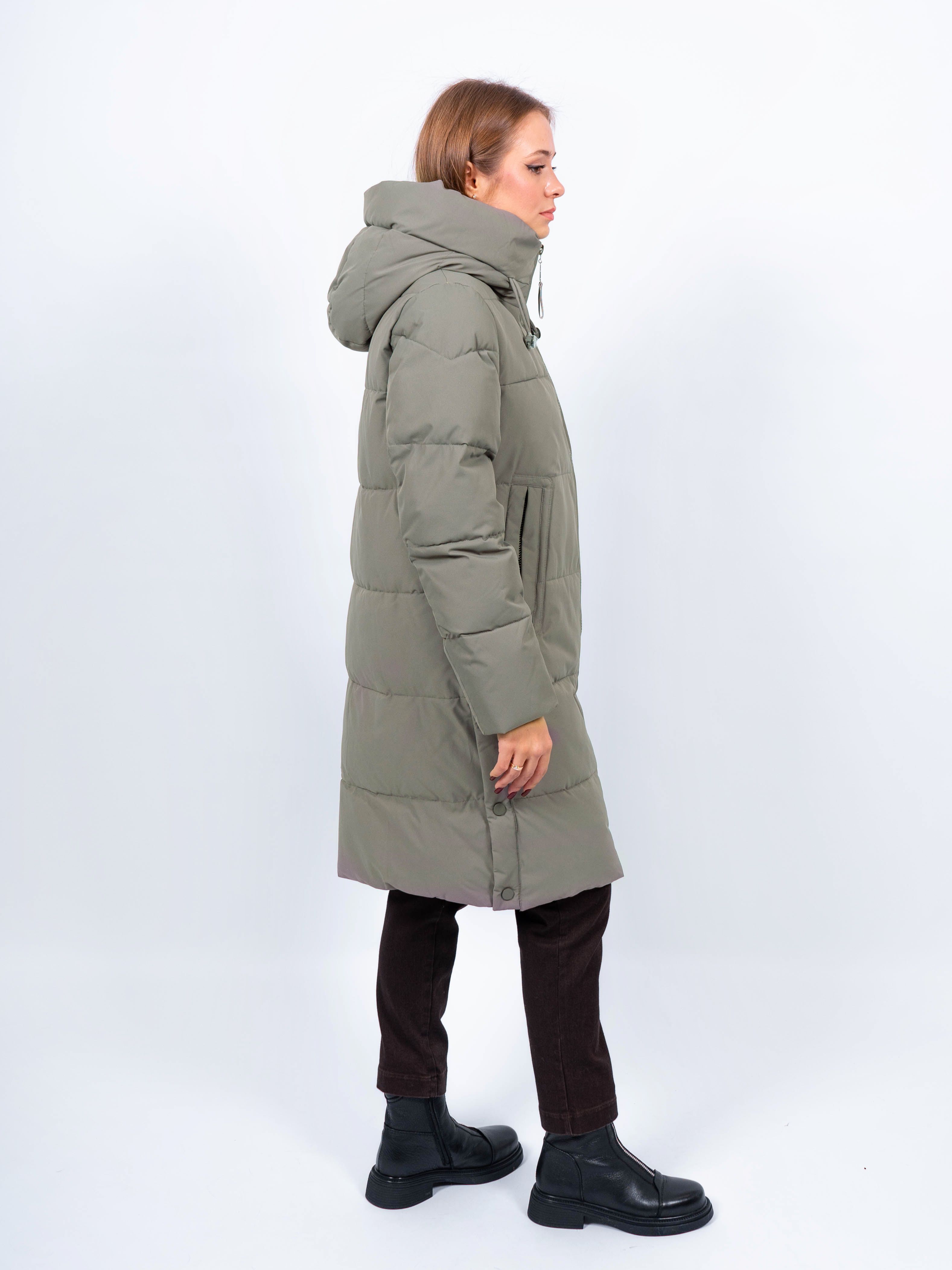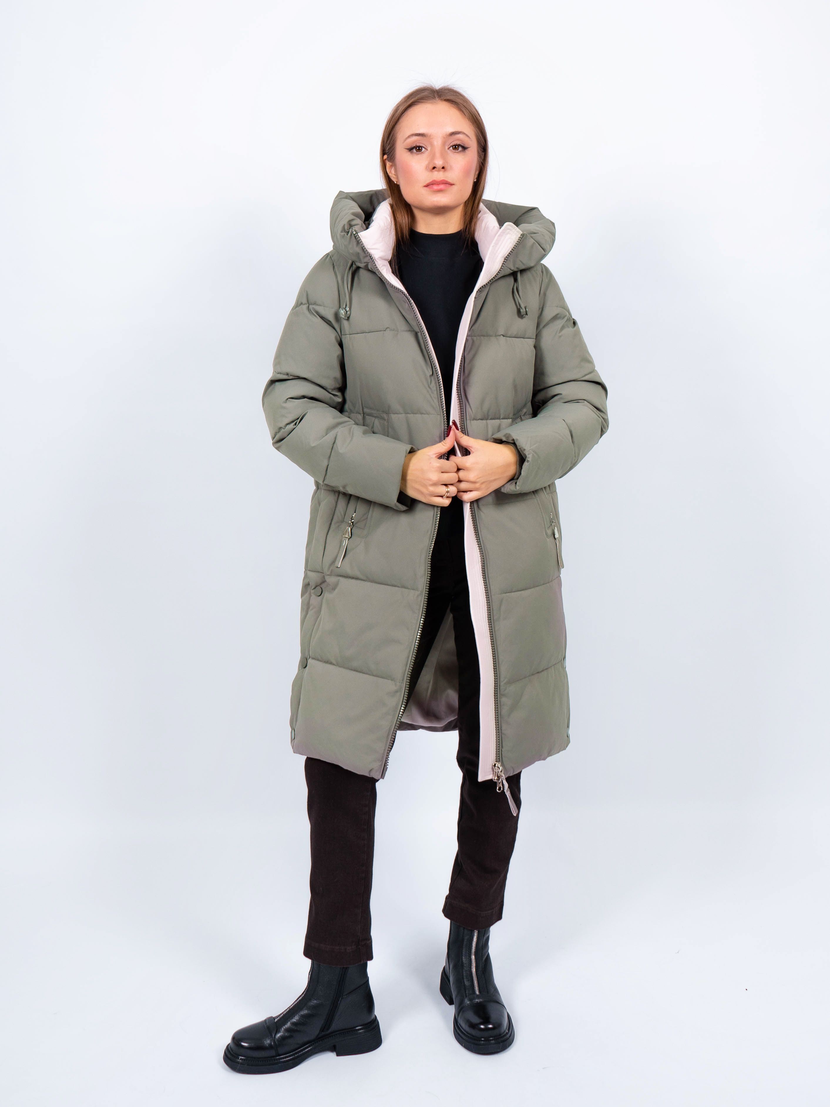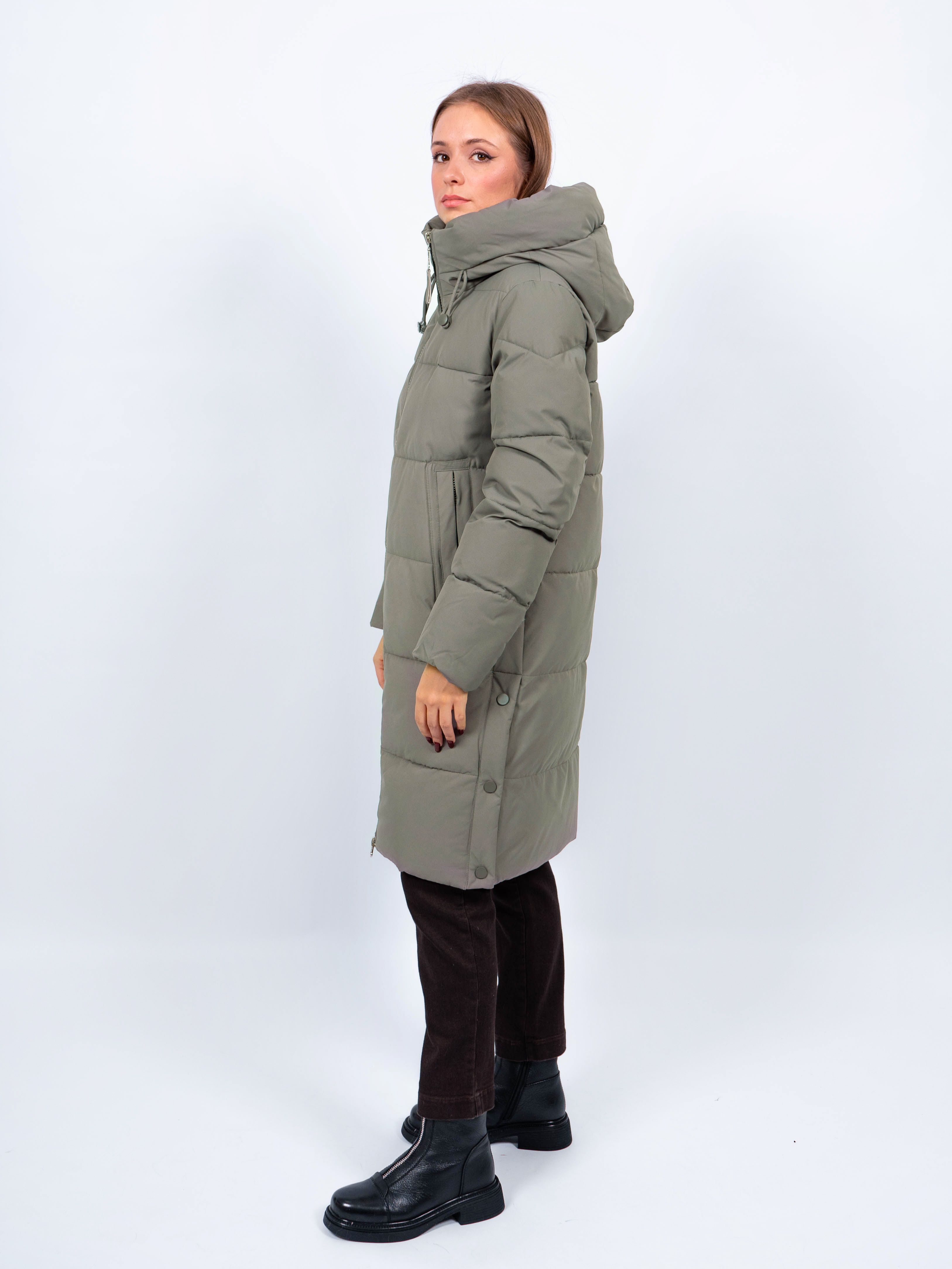 Зимняя куртка имеет удобную застежку - молния, что позволяет легко и быстро надевать и снимать куртку. Рукав втачной прямой, имеет манжеты. Внешние карманы на молнии, имеется внутренний карман. Снизу по бокам имеются функциональные кнопки, расстегиваются, что обеспечивает дополнительное удобство и является стильным акцентом. Воротник стойка. Длина изделия до колена - 90 см, подходит на рост 165-170 см. Размерный ряд с 44 по 52. Пальто зеленого цвета хорошо сочетается с обувью любого фасона.