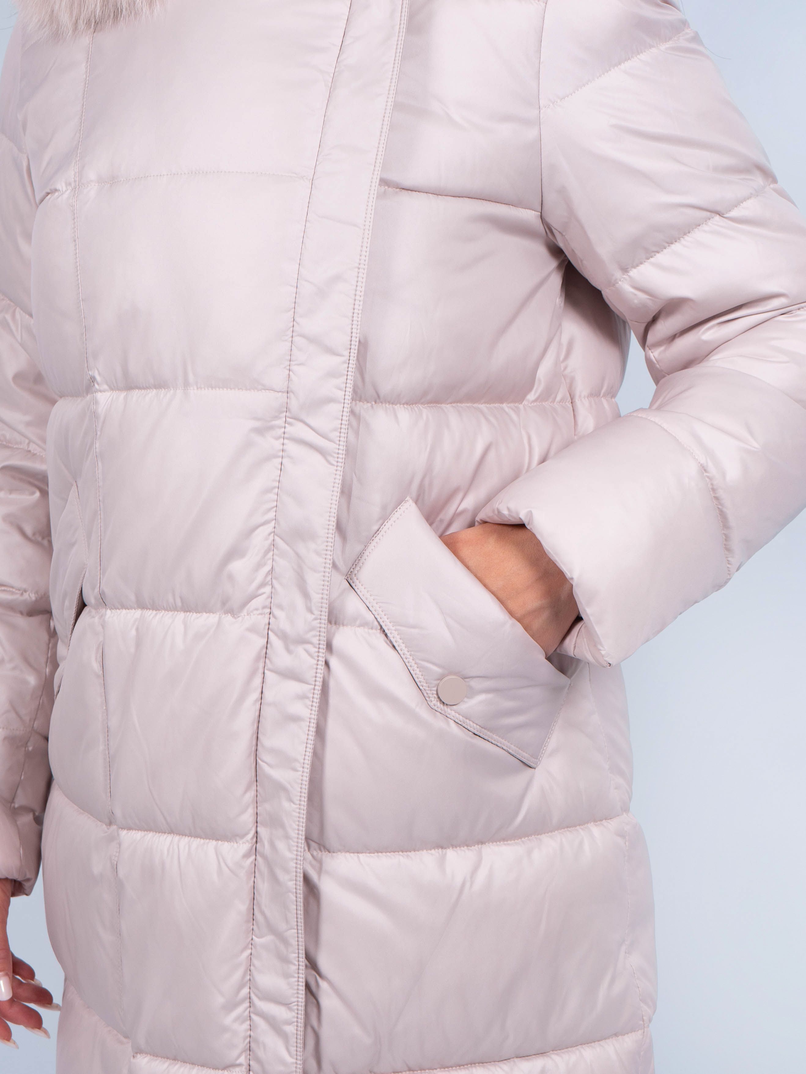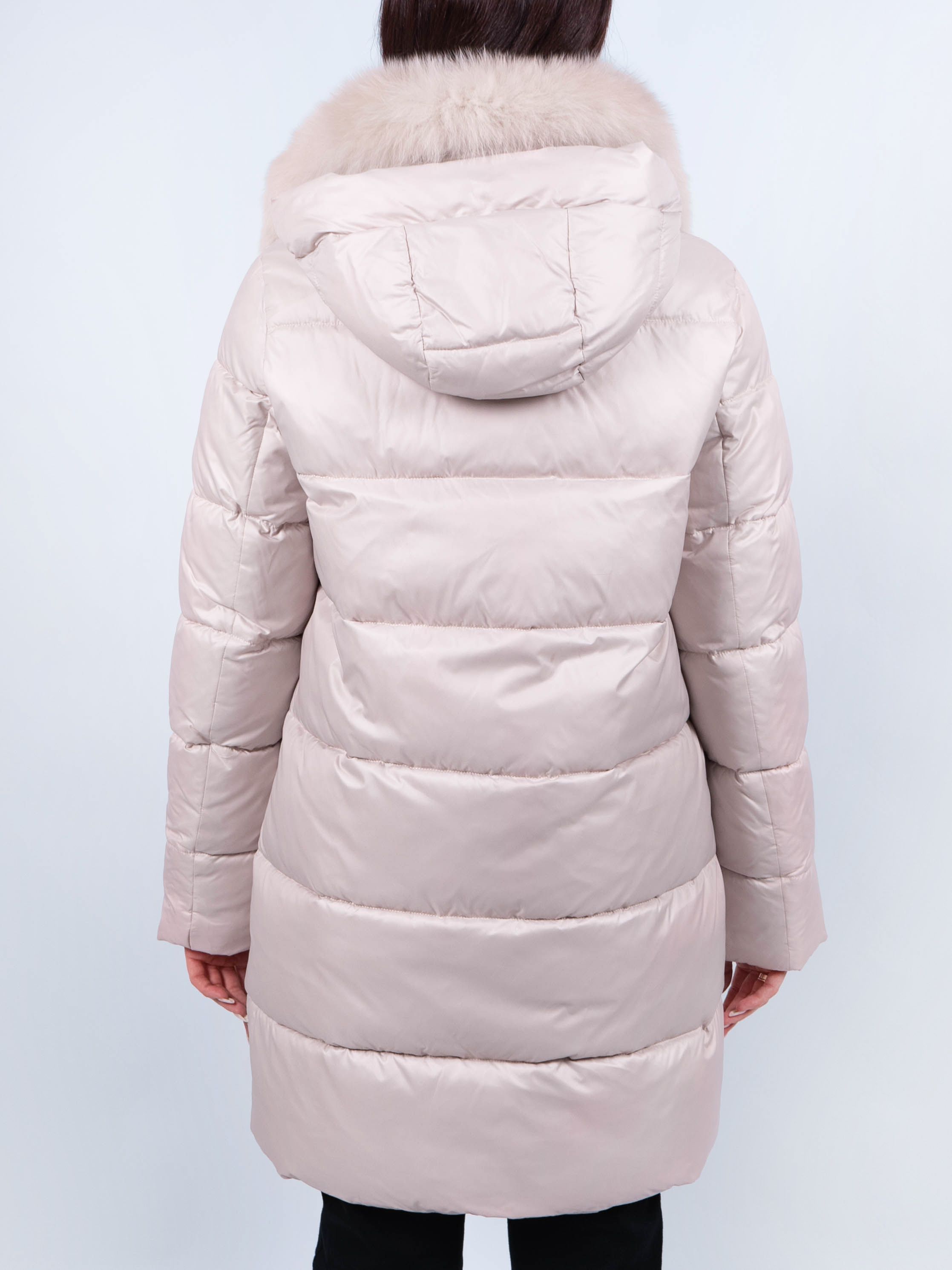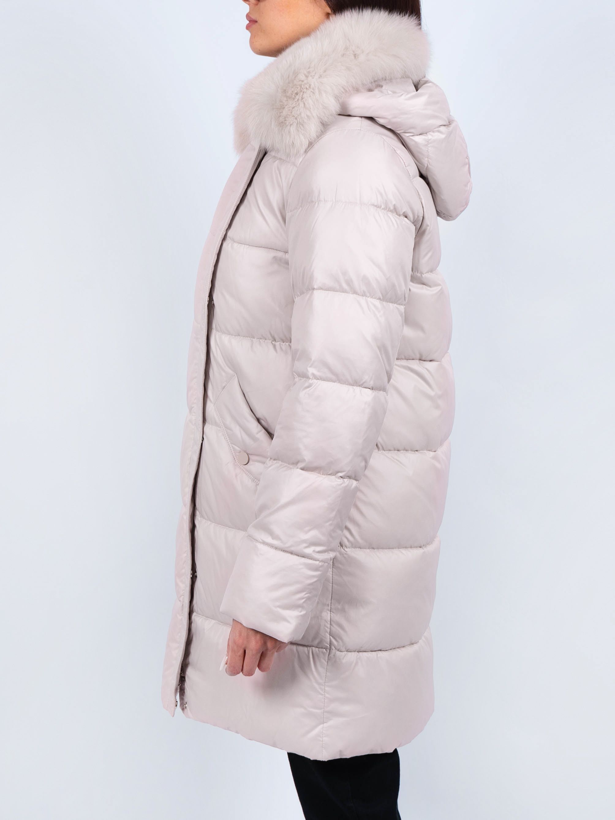Дизайн данного пальто очаровывает своей простотой и изысканностью. Оно имеет удобную застежку на молнию и кнопки, что позволяет легко и быстро надевать и снимать куртку. Мех на капюшоне придает модели особую изящность и подчеркивает женственность образа. Капюшон и мех на капюшоне съемные. А карманы на кнопках не только добавляют функциональности, но и являются стильным акцентом на модели. Вы сможете без проблем хранить в них необходимые мелочи или просто разместить руки для дополнительного комфорта. Длина изделия 90 см.