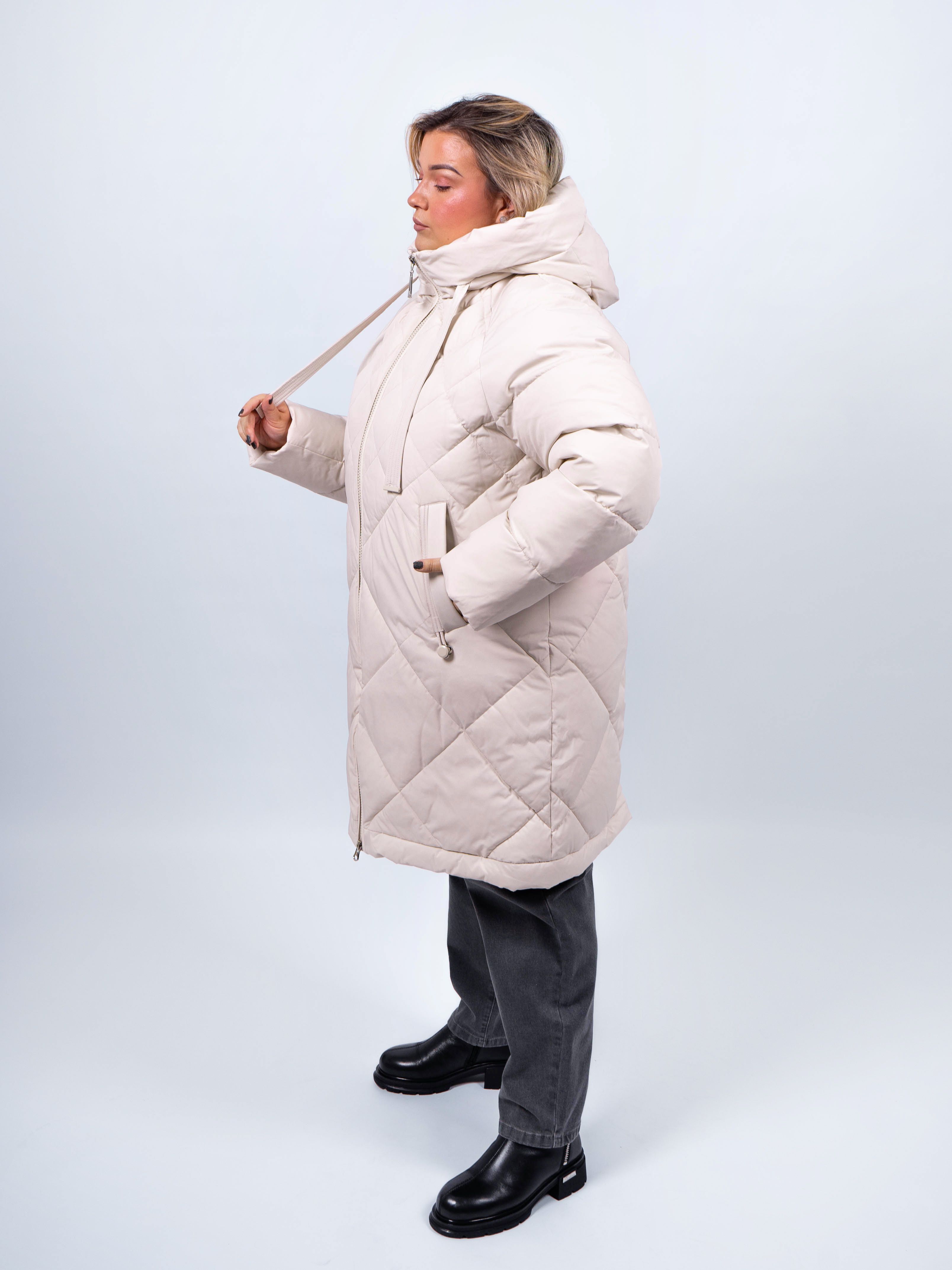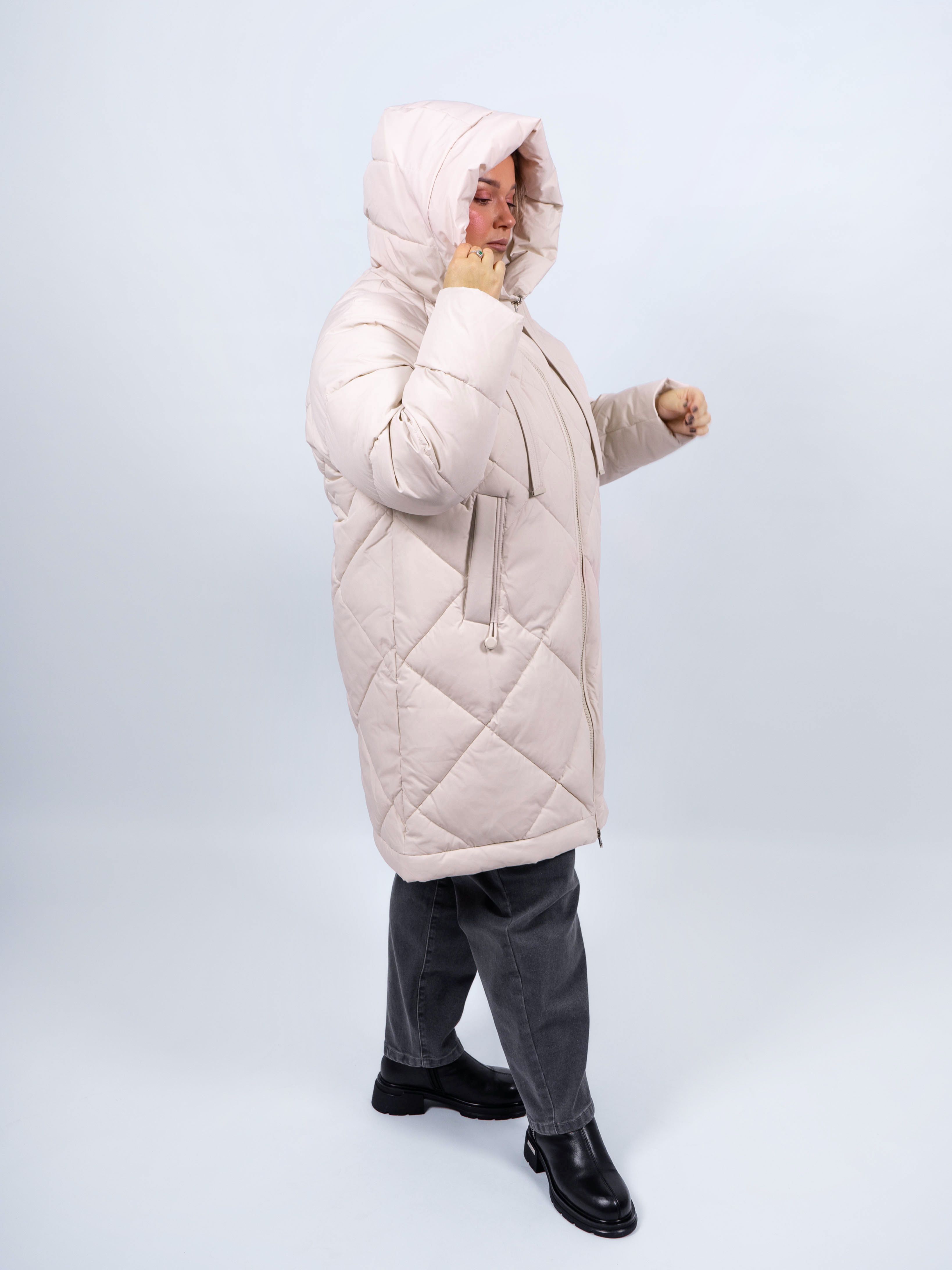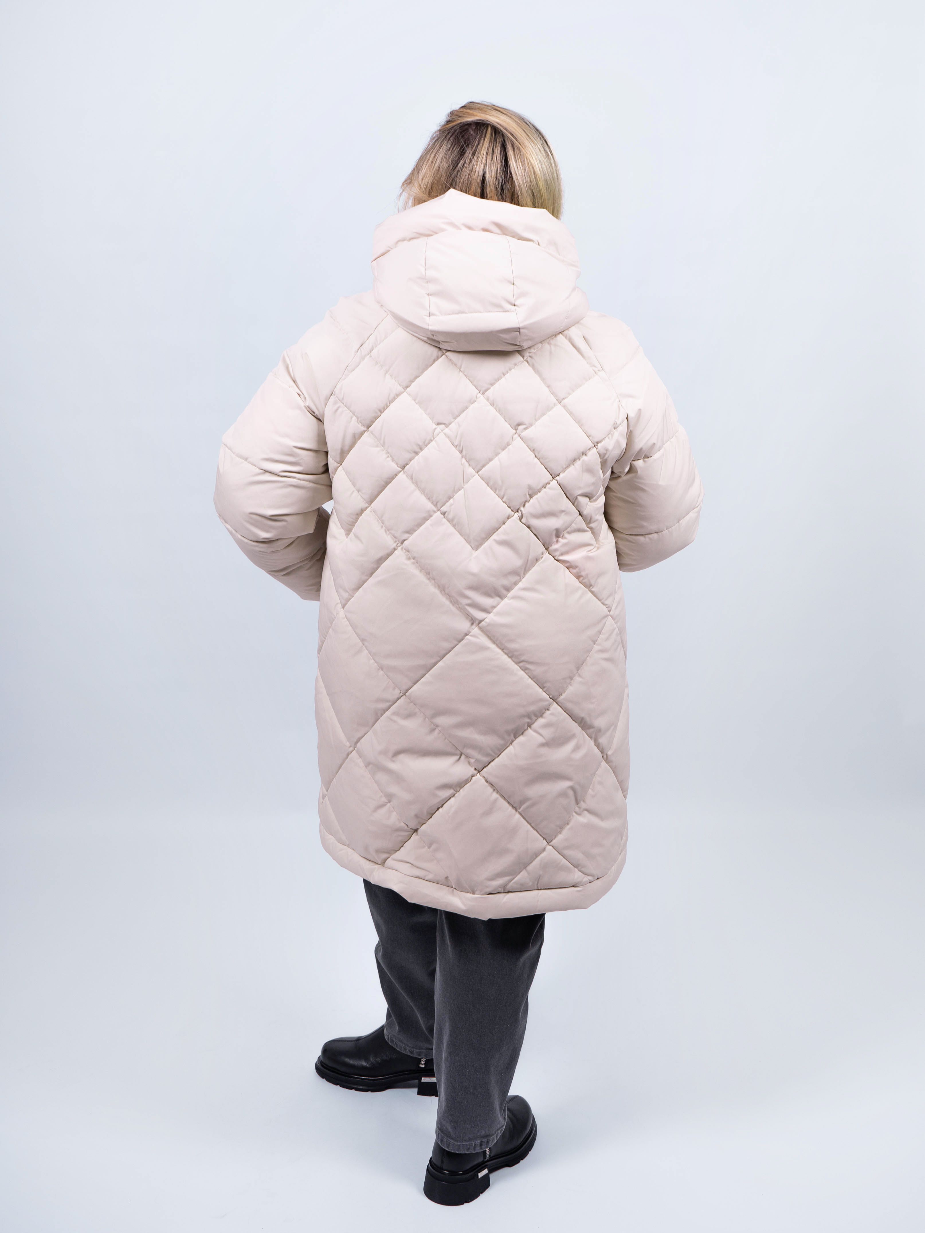 Зимняя куртка имеет удобную застежку - молния, что позволяет легко и быстро надевать и снимать куртку. Рукав реглан, имеет манжеты. Внешние карманы на кнопках, имеется внутренний карман. Куртка имеет утяжку-кулиску. Воротник стойка. Длина изделия до колена - 90 см, подходит на рост 165-170 см. Размерный ряд с 48 по 56. Пальто бежевого цвета хорошо сочетается с обувью любого фасона.