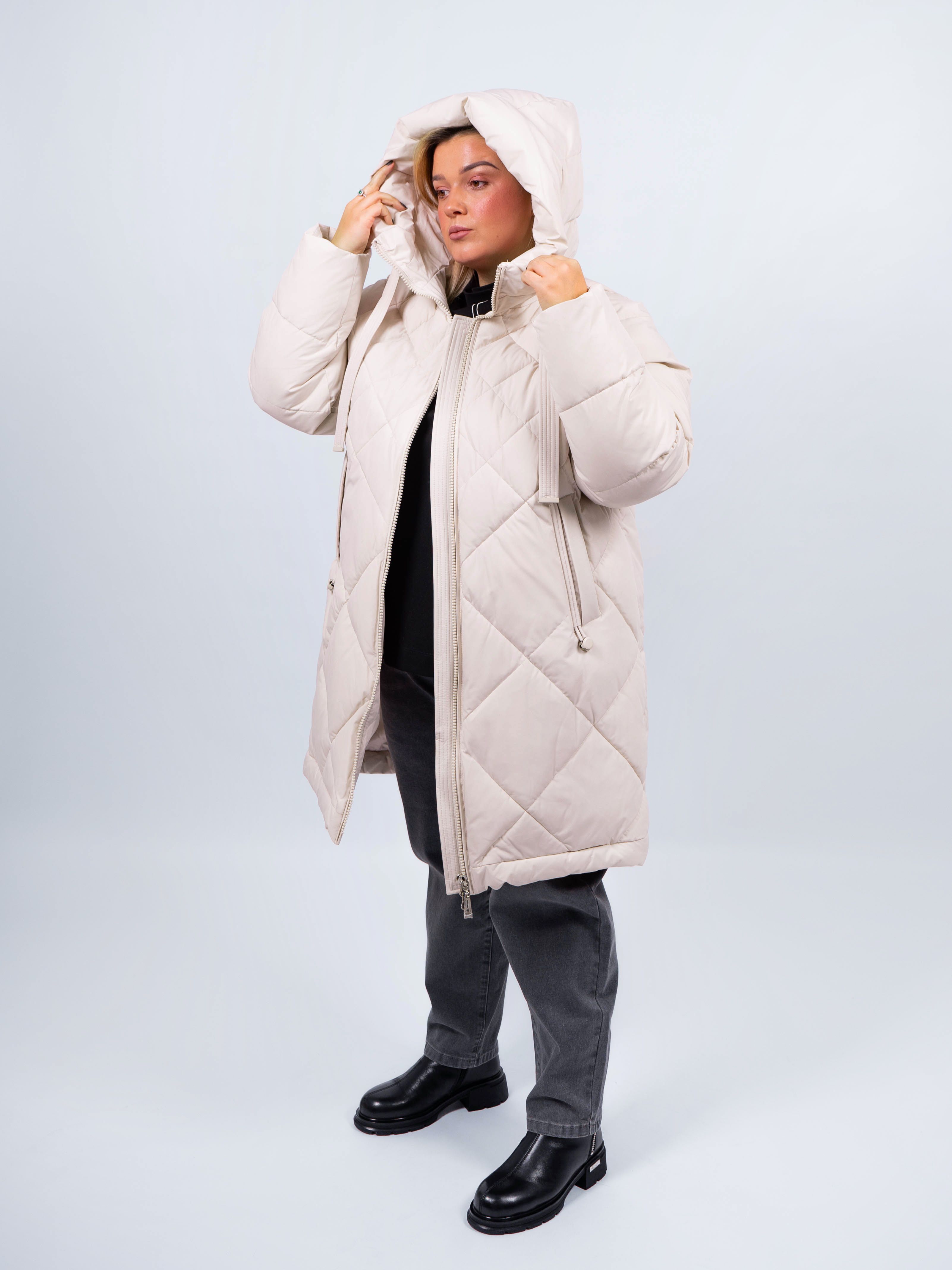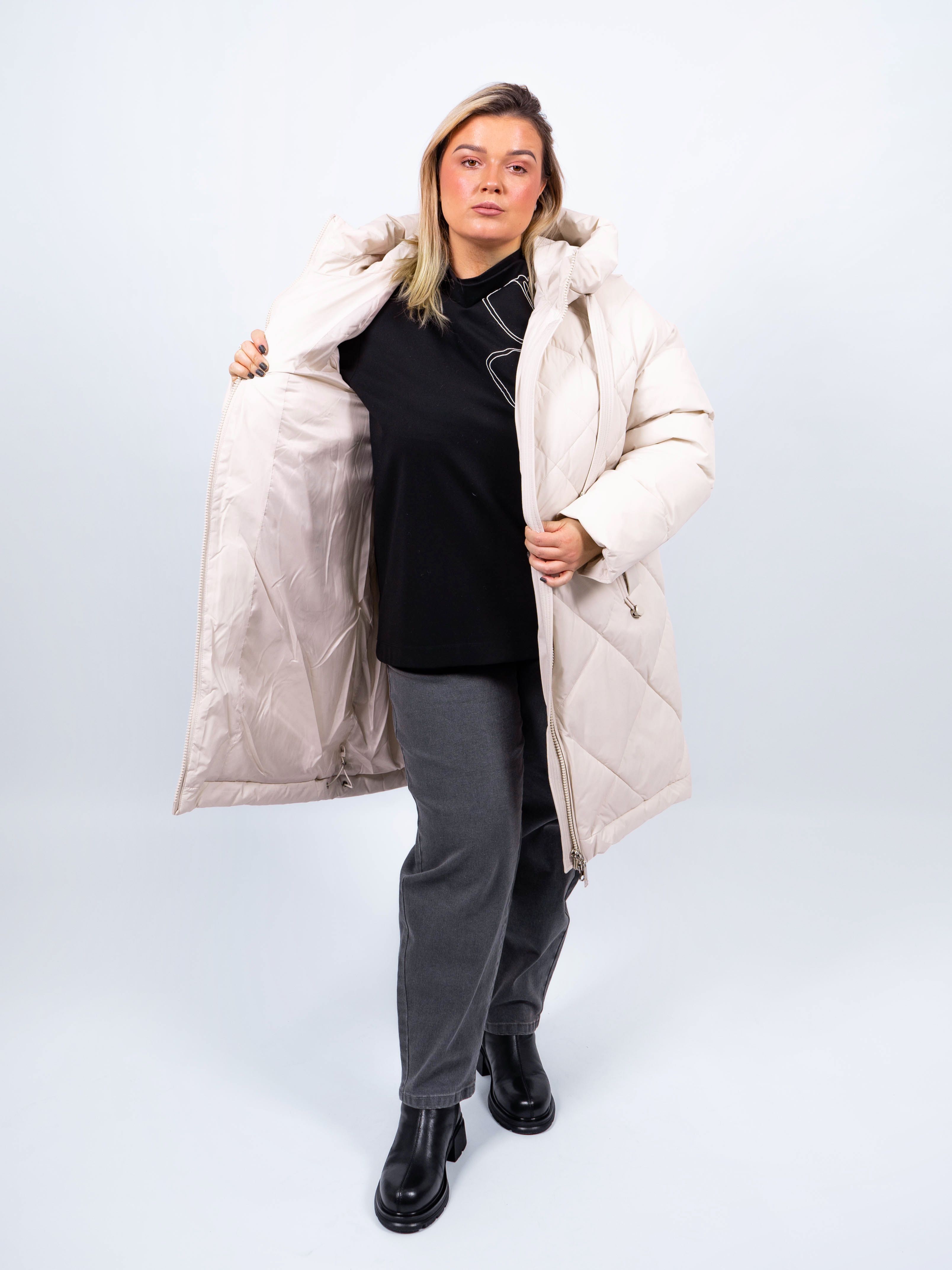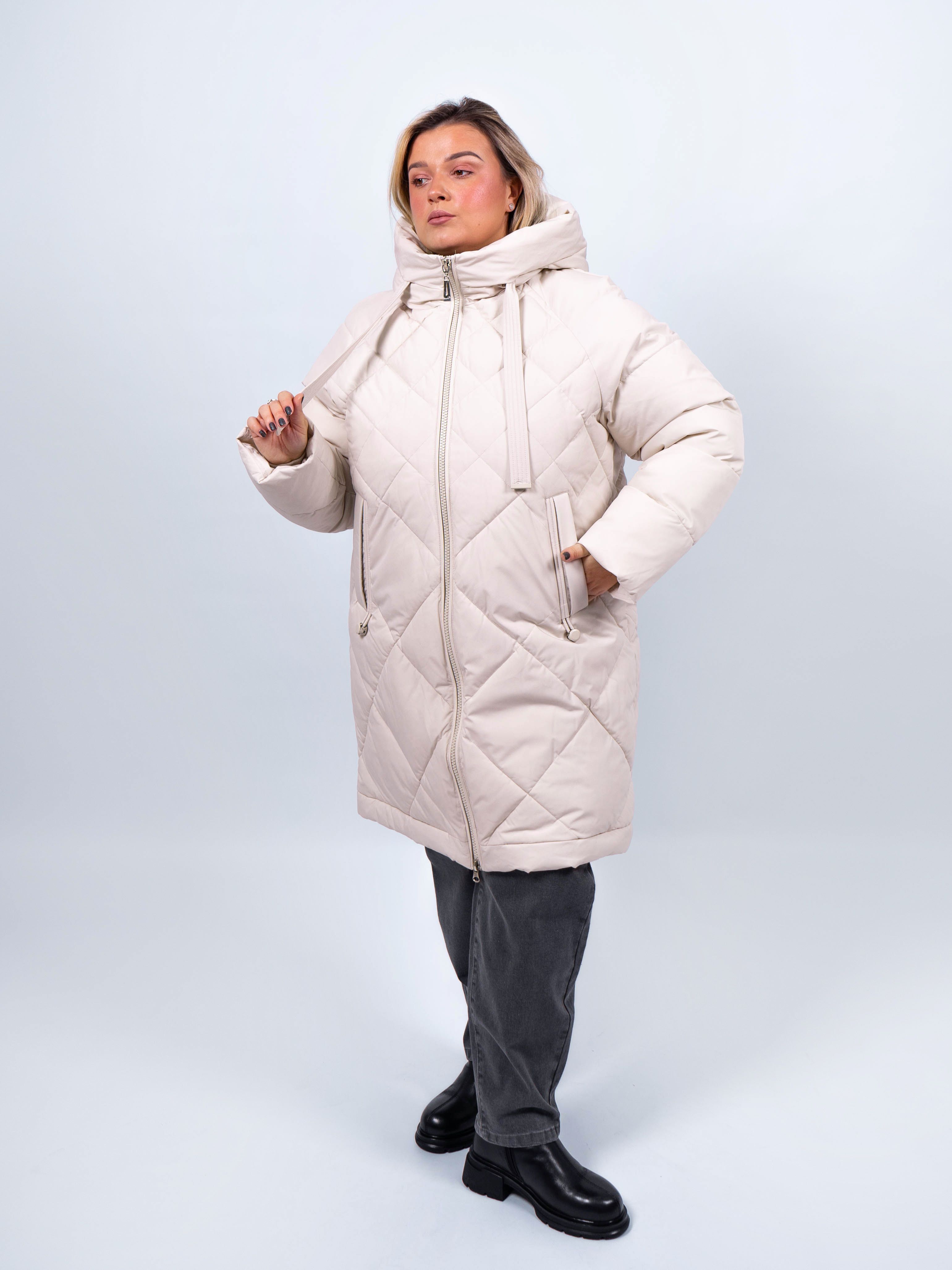 Зимняя куртка имеет удобную застежку - молния, что позволяет легко и быстро надевать и снимать куртку. Рукав реглан, имеет манжеты. Внешние карманы на кнопках, имеется внутренний карман. Куртка имеет утяжку-кулиску. Воротник стойка. Длина изделия до колена - 90 см, подходит на рост 165-170 см. Размерный ряд с 48 по 56. Пальто бежевого цвета хорошо сочетается с обувью любого фасона.