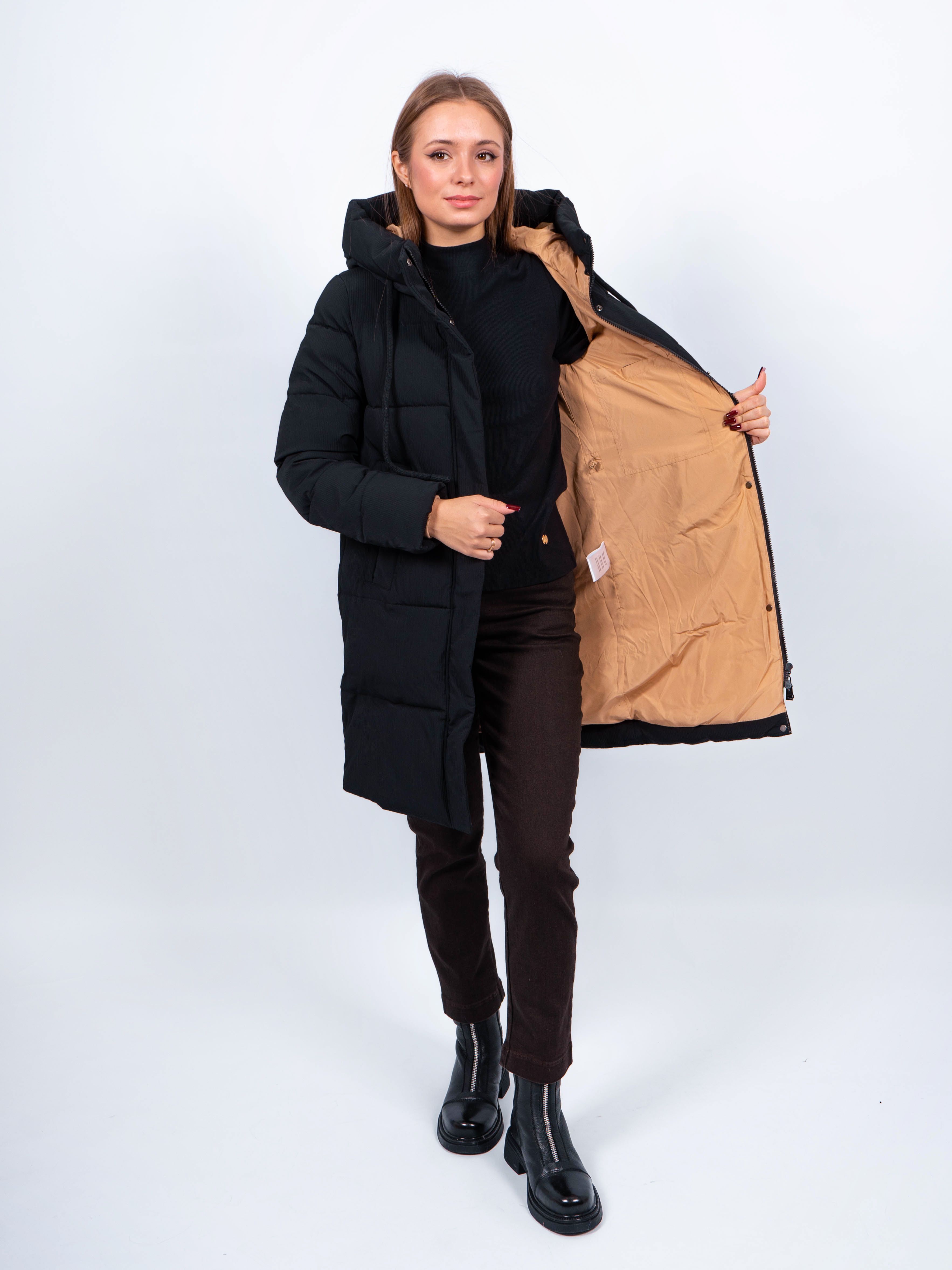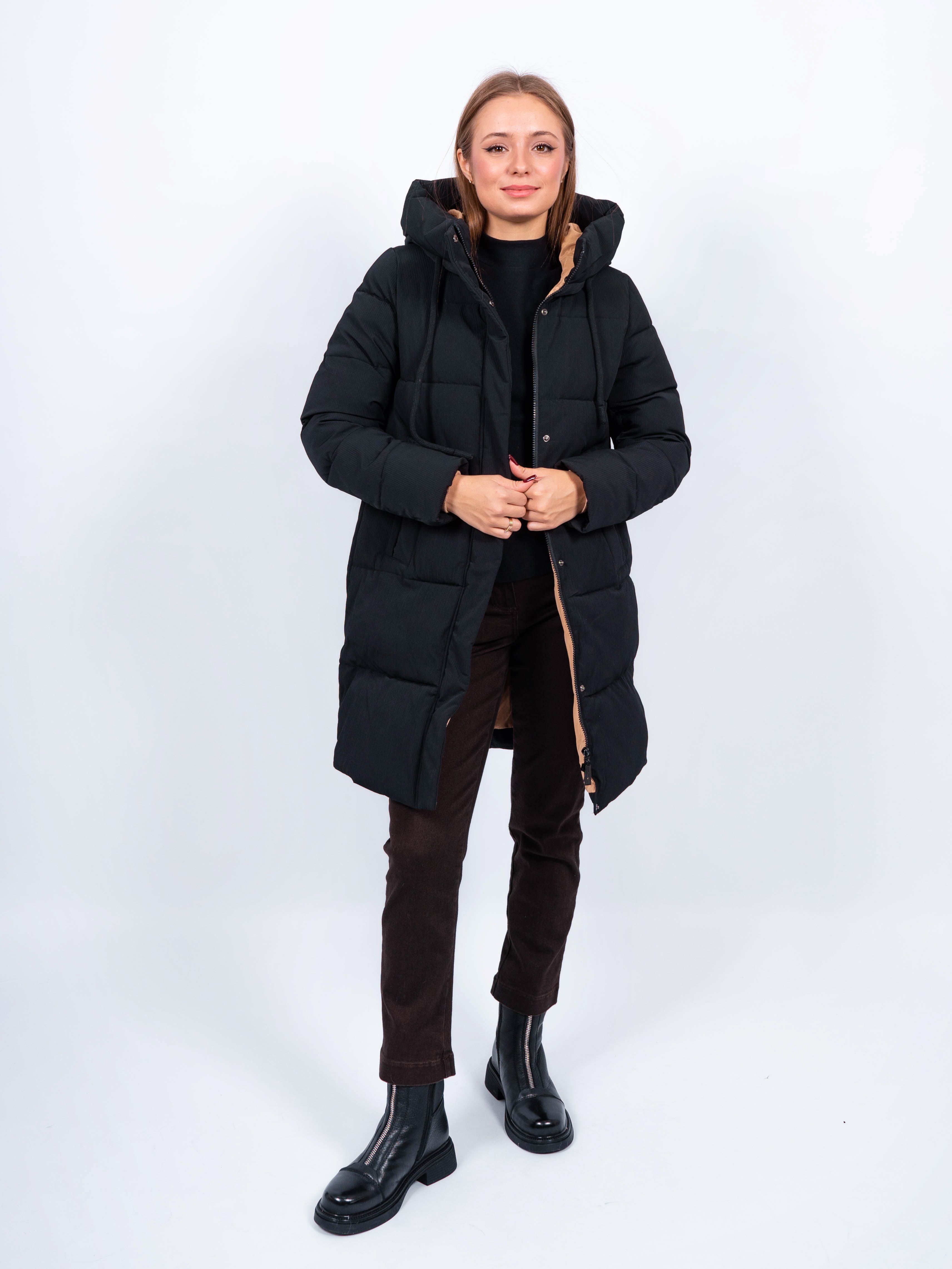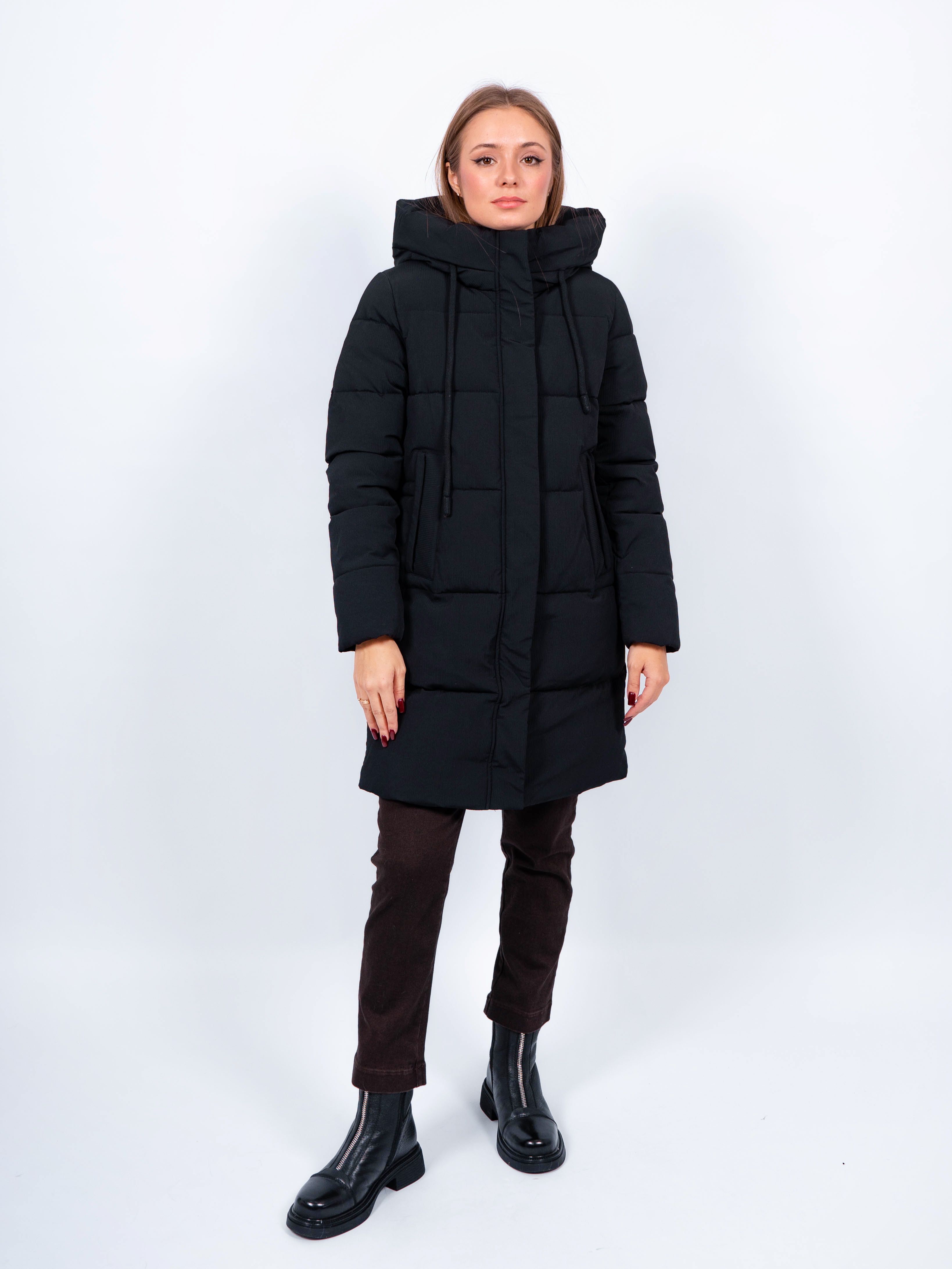 Зимняя куртка имеет удобную застежку - молнию и кнопки, что позволяет легко и быстро надевать и снимать куртку. Рукав втачной прямой, есть манжеты. Карманы на кнопке не только добавляют функциональности, но и являются стильным акцентом. Воротник стойка, капюшон контрастного цвета. Длина изделия до колена - 90 см, подходит на рост 165-170 см. Размерный ряд с 42 по 50. Куртка черного цвета хорошо сочетается с обувью любого фасона.