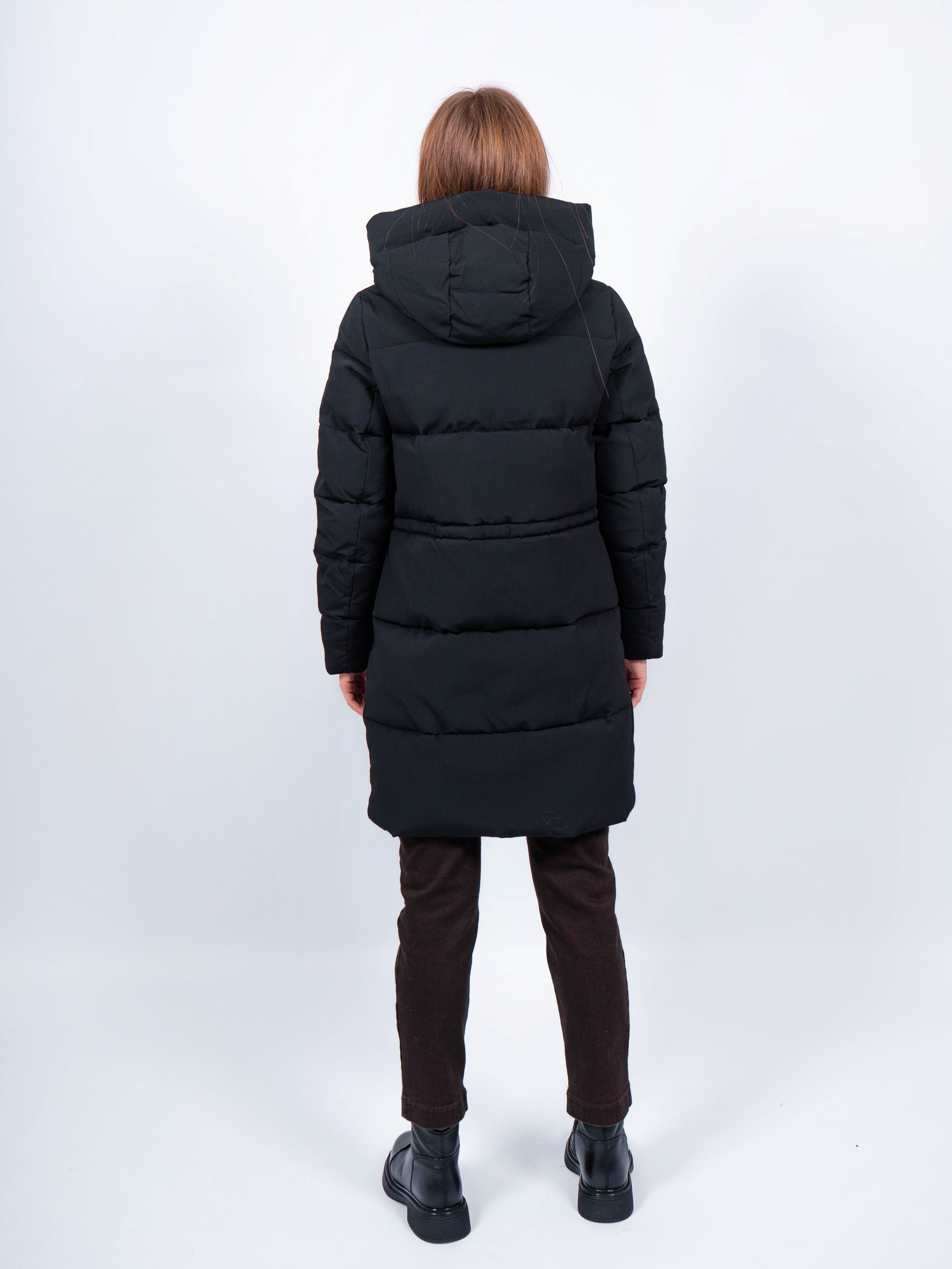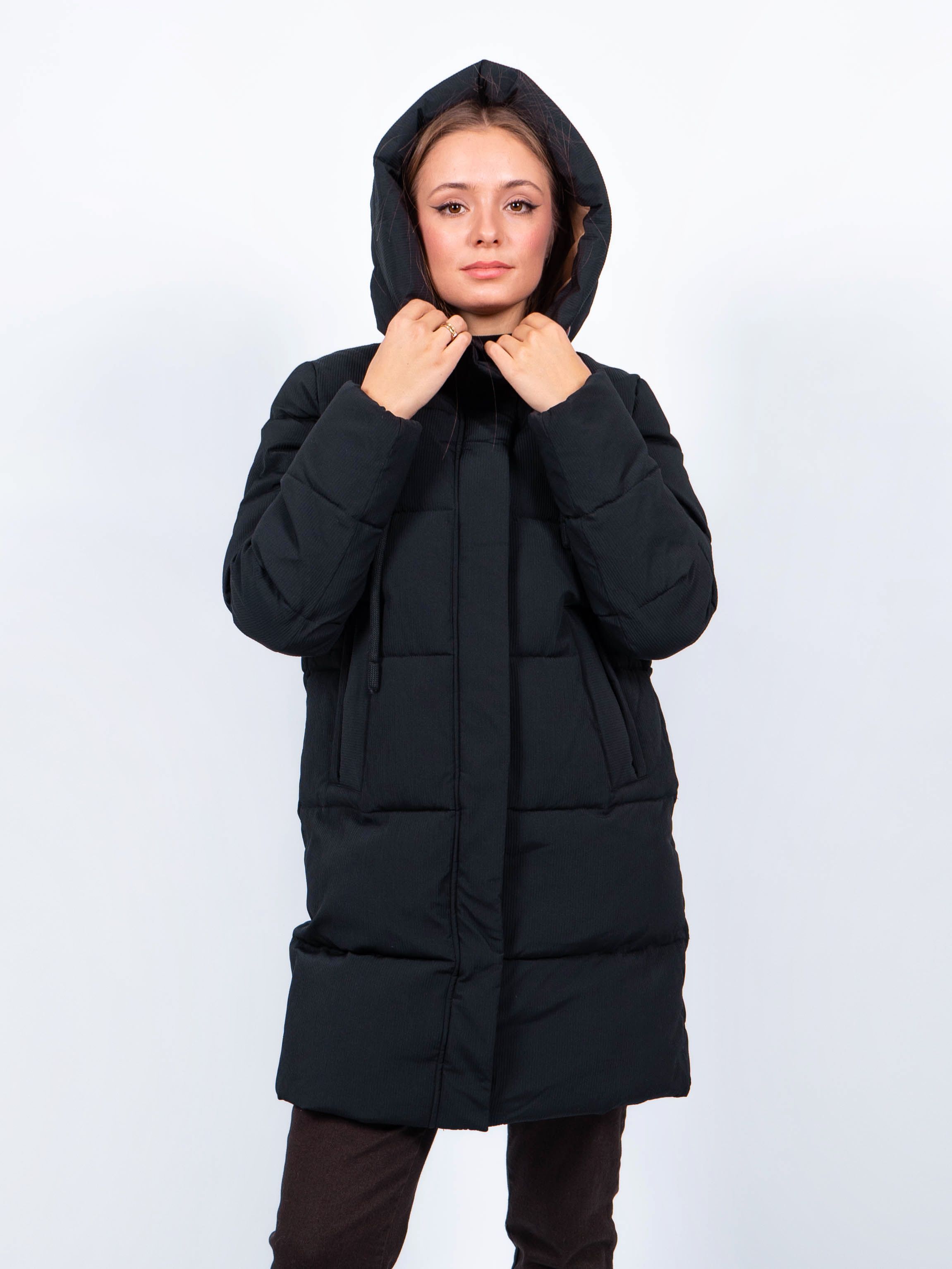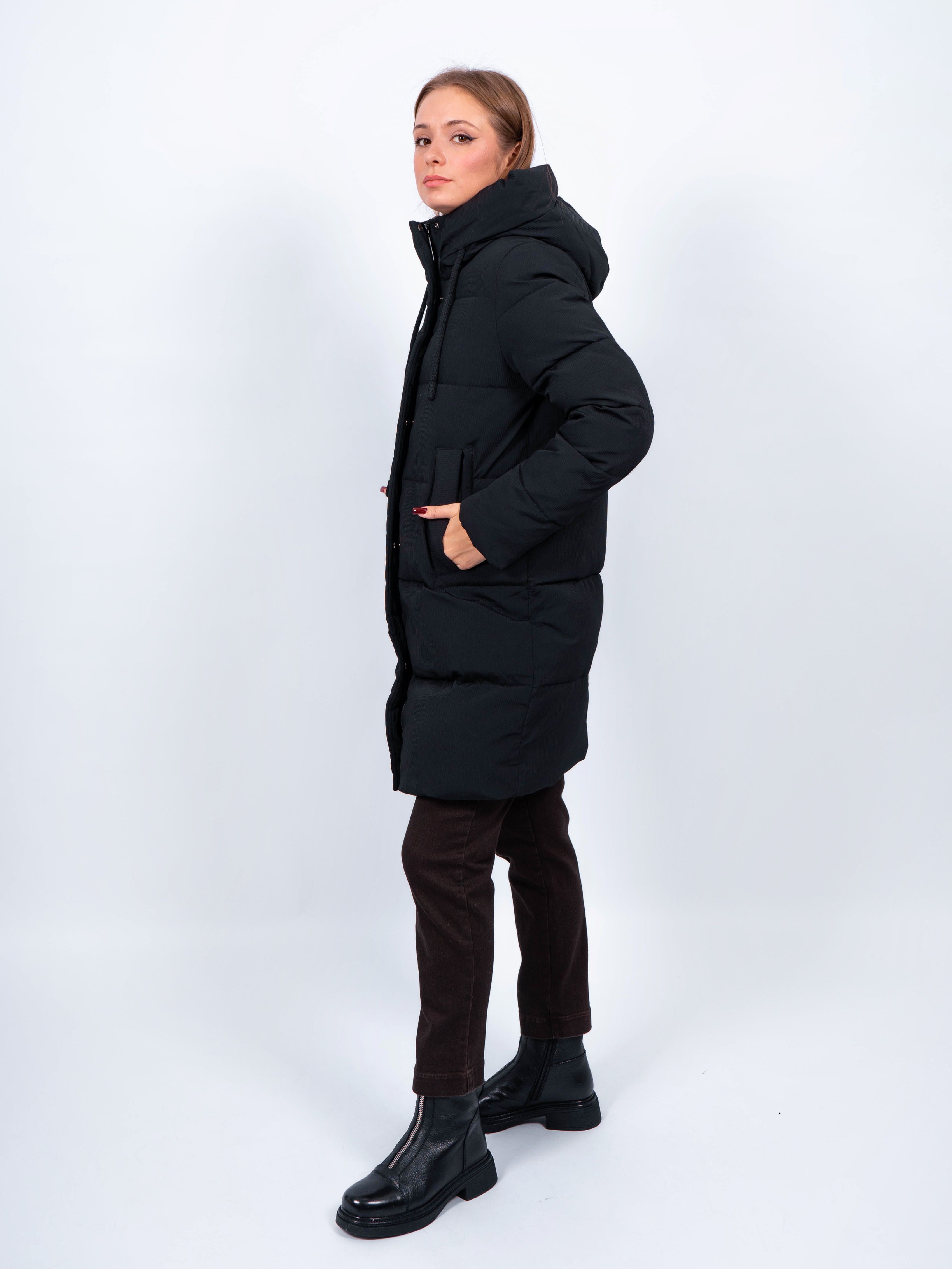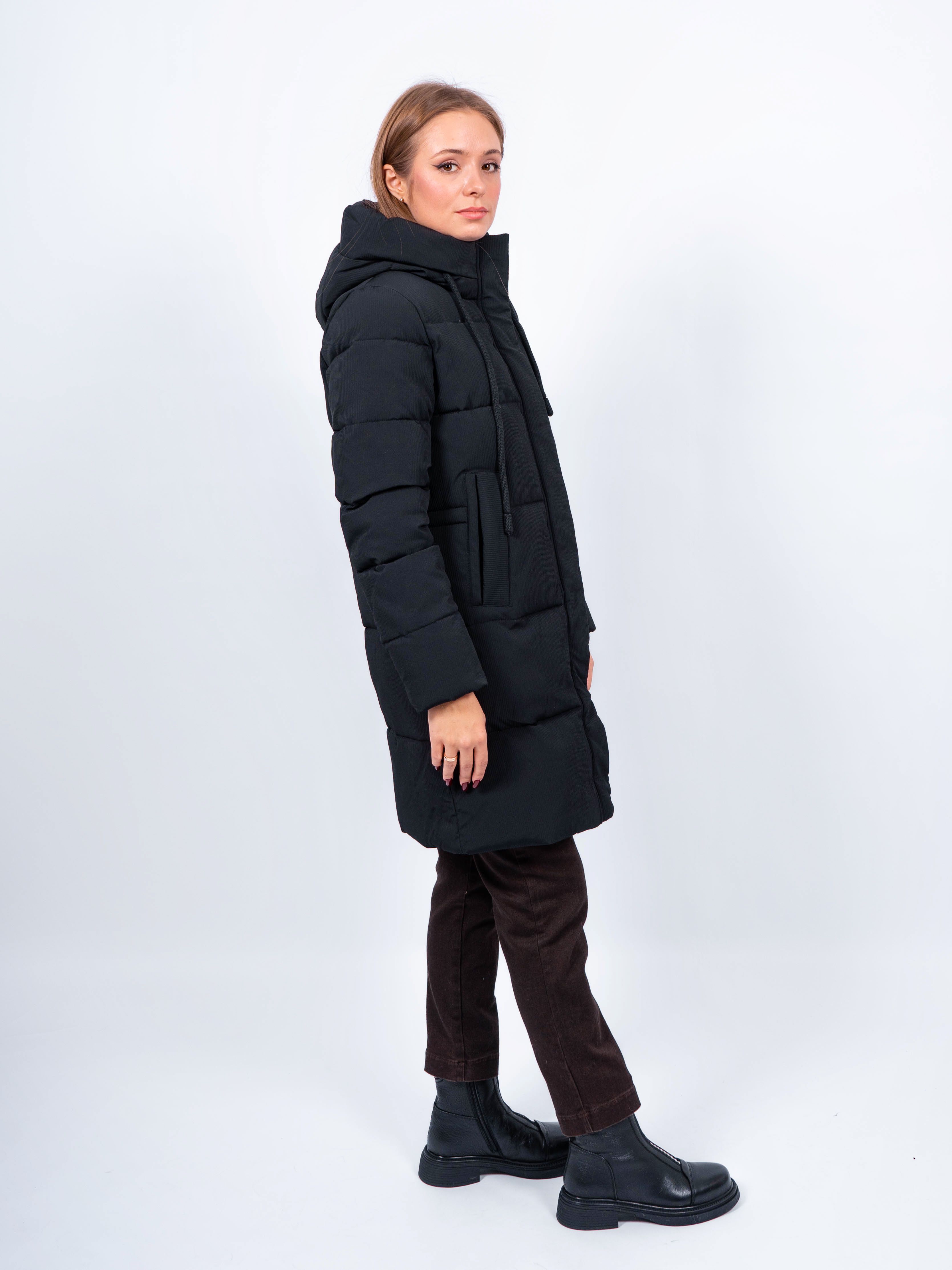 Зимняя куртка имеет удобную застежку - молнию и кнопки, что позволяет легко и быстро надевать и снимать куртку. Рукав втачной прямой, есть манжеты. Карманы на кнопке не только добавляют функциональности, но и являются стильным акцентом. Воротник стойка, капюшон контрастного цвета. Длина изделия до колена - 90 см, подходит на рост 165-170 см. Размерный ряд с 42 по 50. Куртка черного цвета хорошо сочетается с обувью любого фасона.