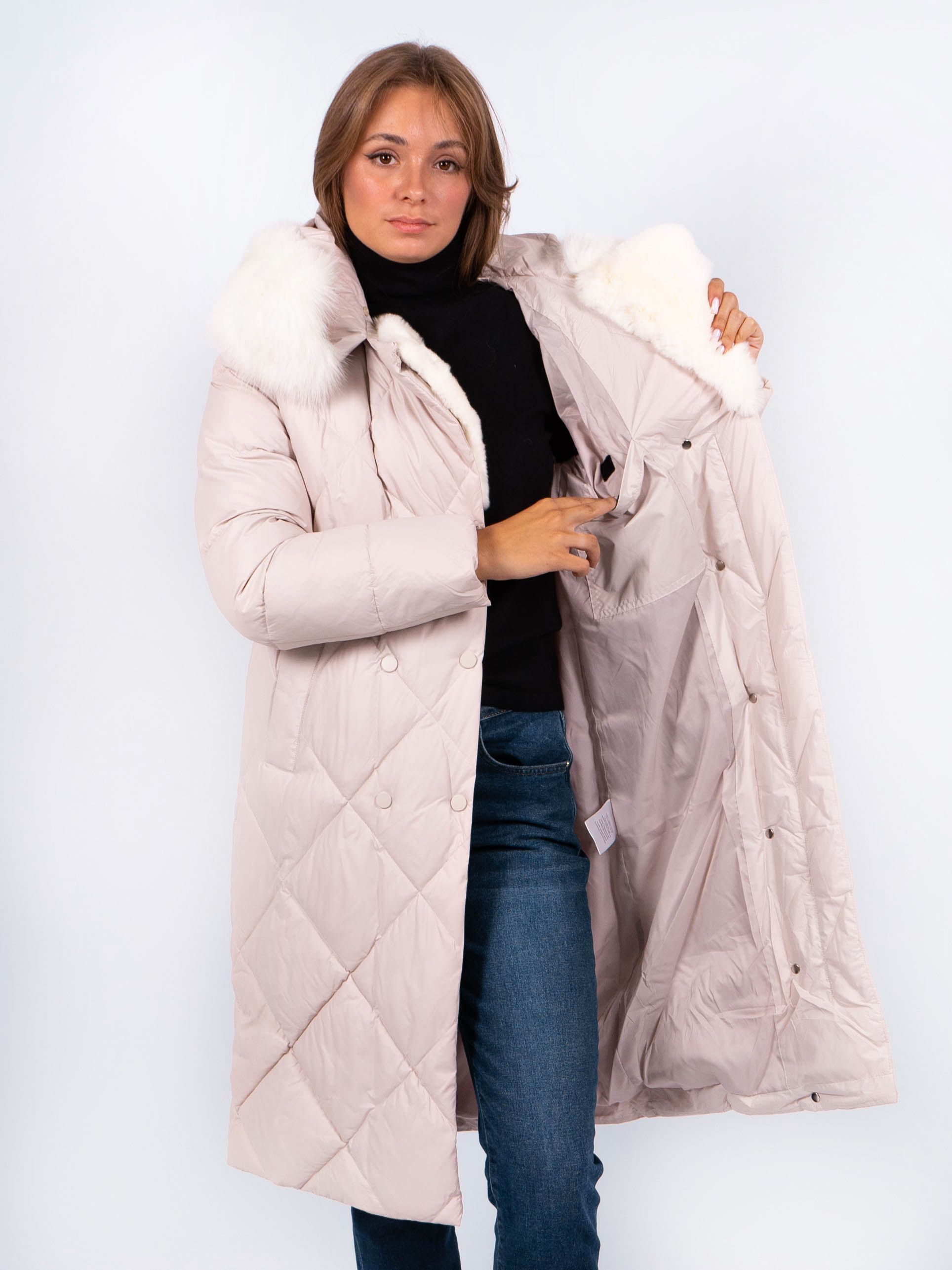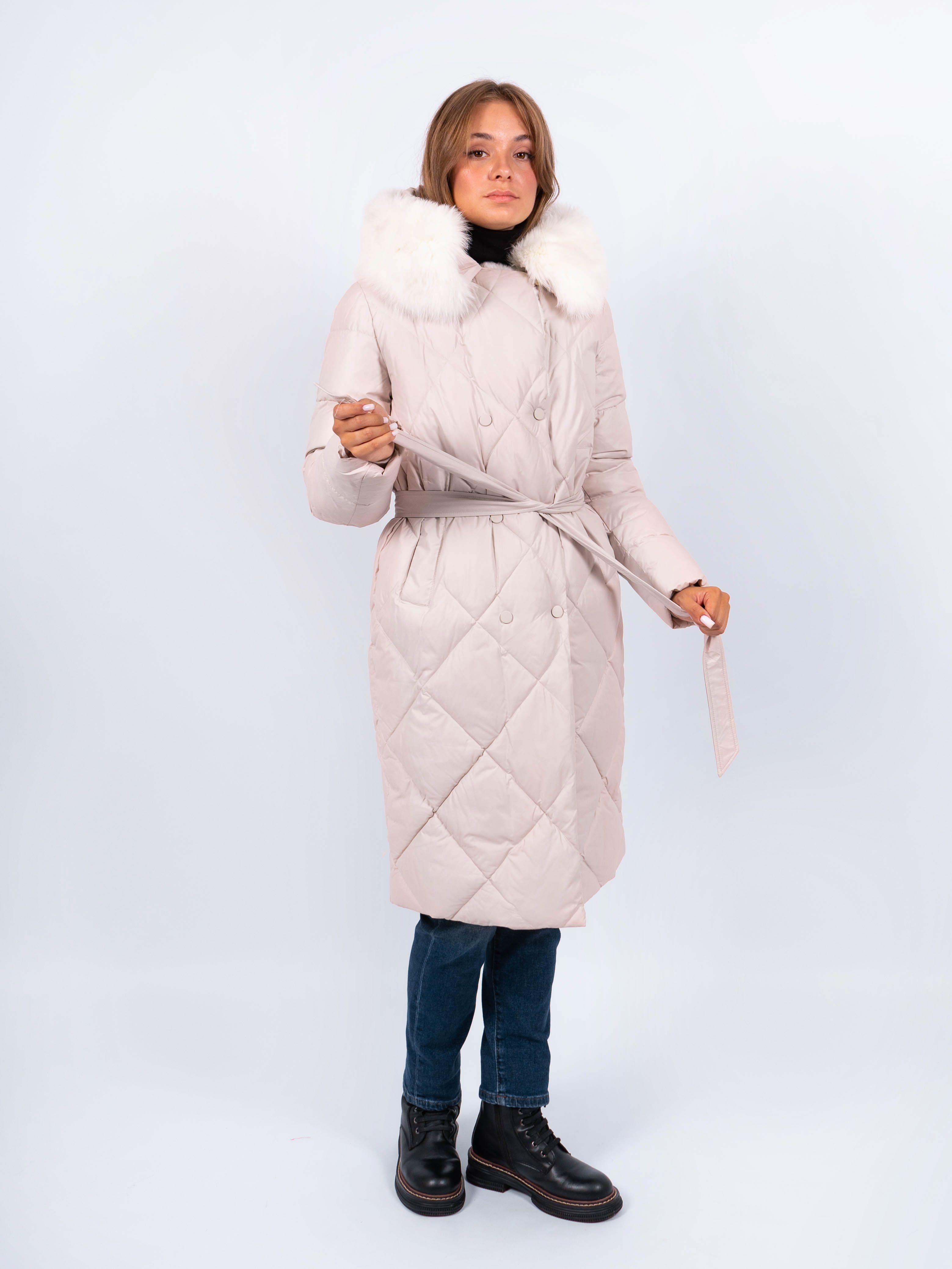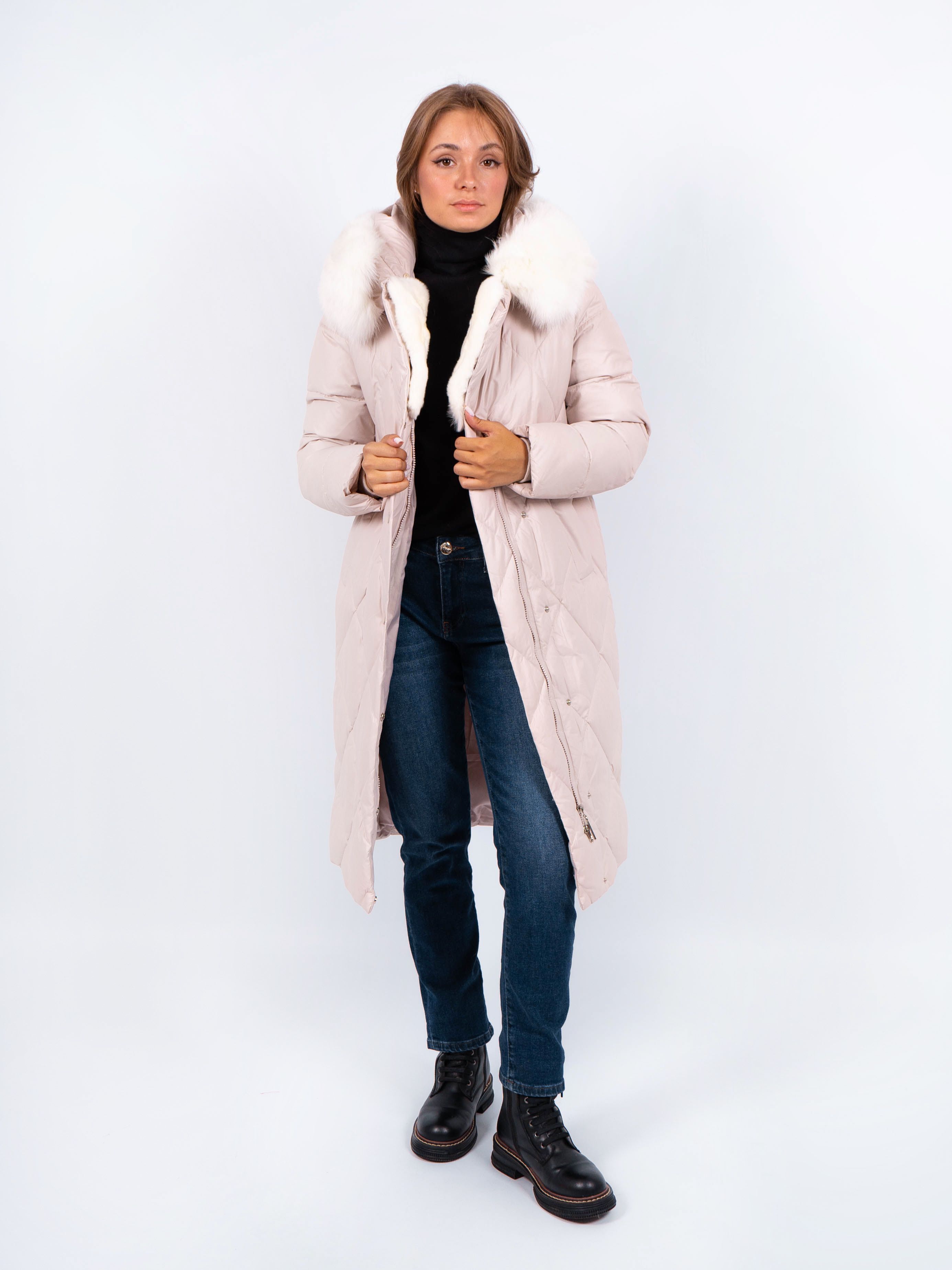 Дизайн данного пальто очаровывает своей простотой и изысканностью. Оно имеет удобную застежку на молнию и кнопки, что позволяет легко и быстро надевать и снимать куртку. Мех на капюшоне придает модели особую изящность и подчеркивает женственность образа. Мех на капюшоне съемный, капюшон не отстегивается. А карманы на кнопках не только добавляют функциональности, но и являются стильным акцентом на модели. Вы сможете без проблем хранить в них необходимые мелочи или просто разместить руки для дополнительного комфорта. Длина изделия 100 см.