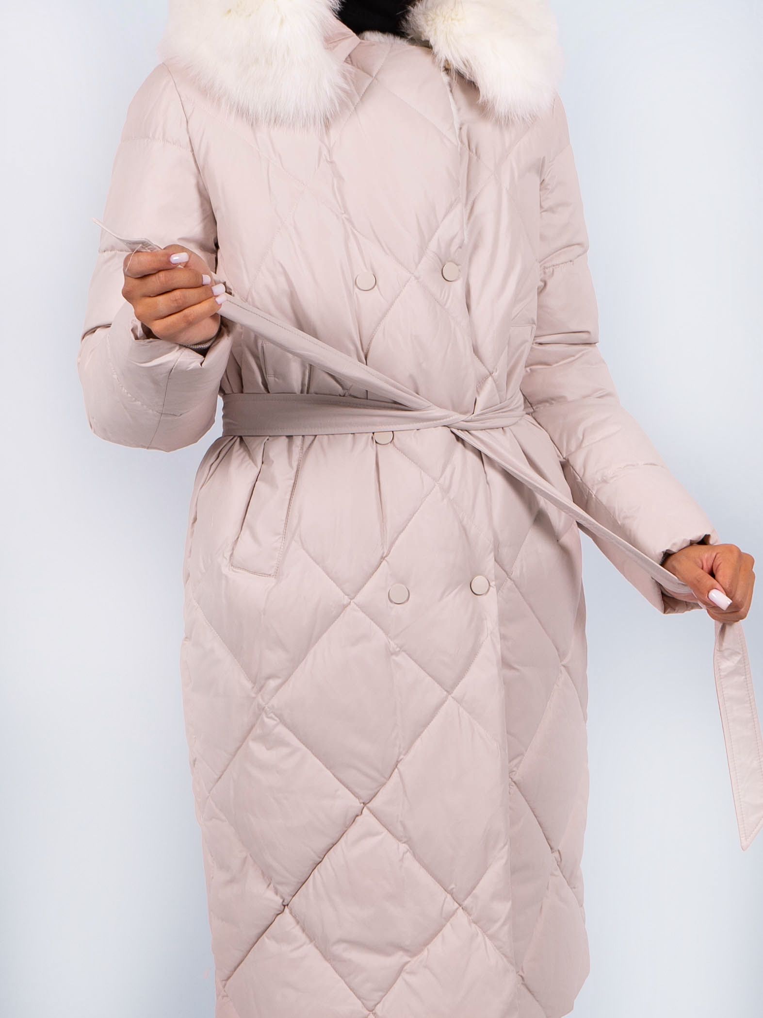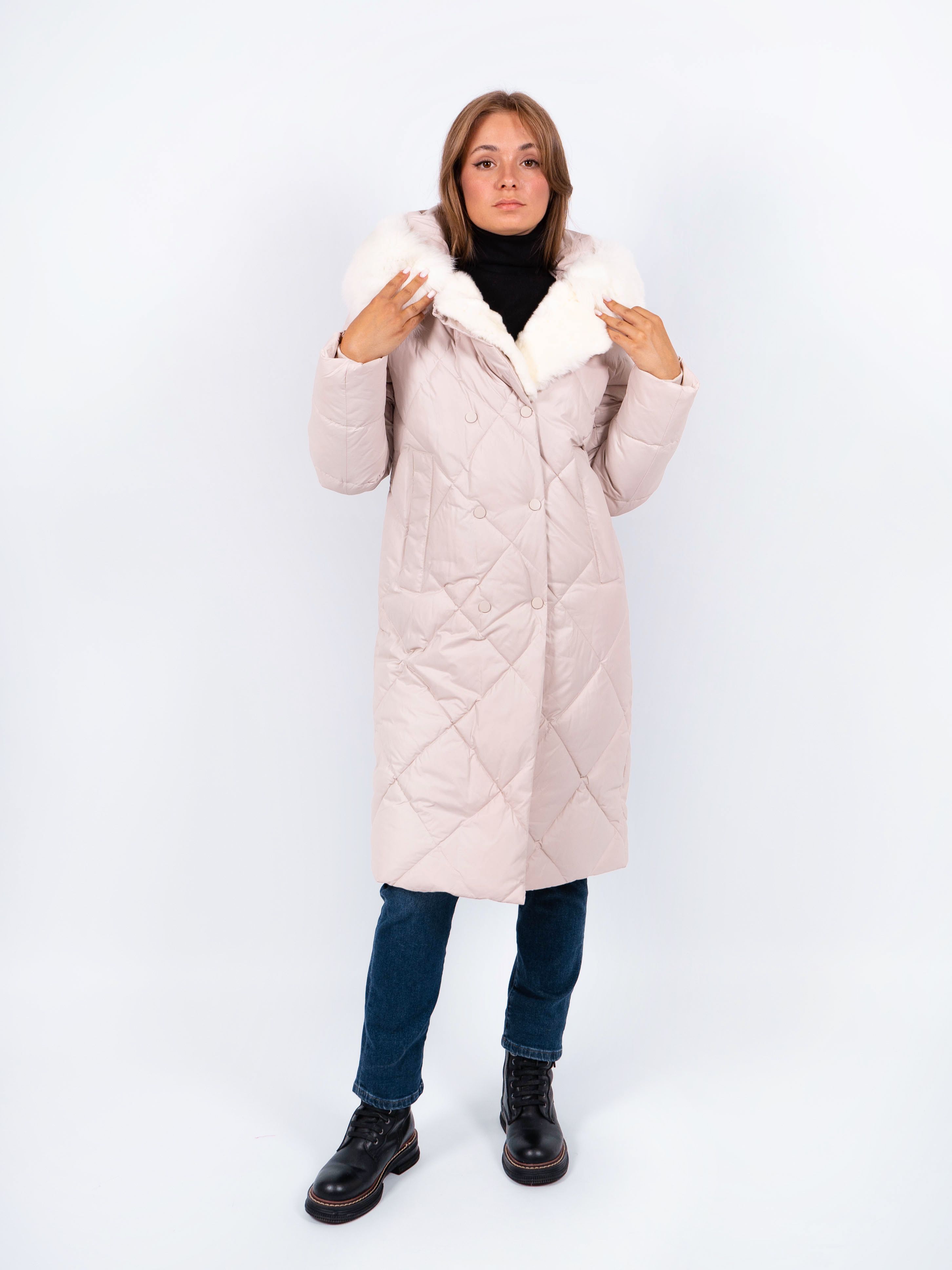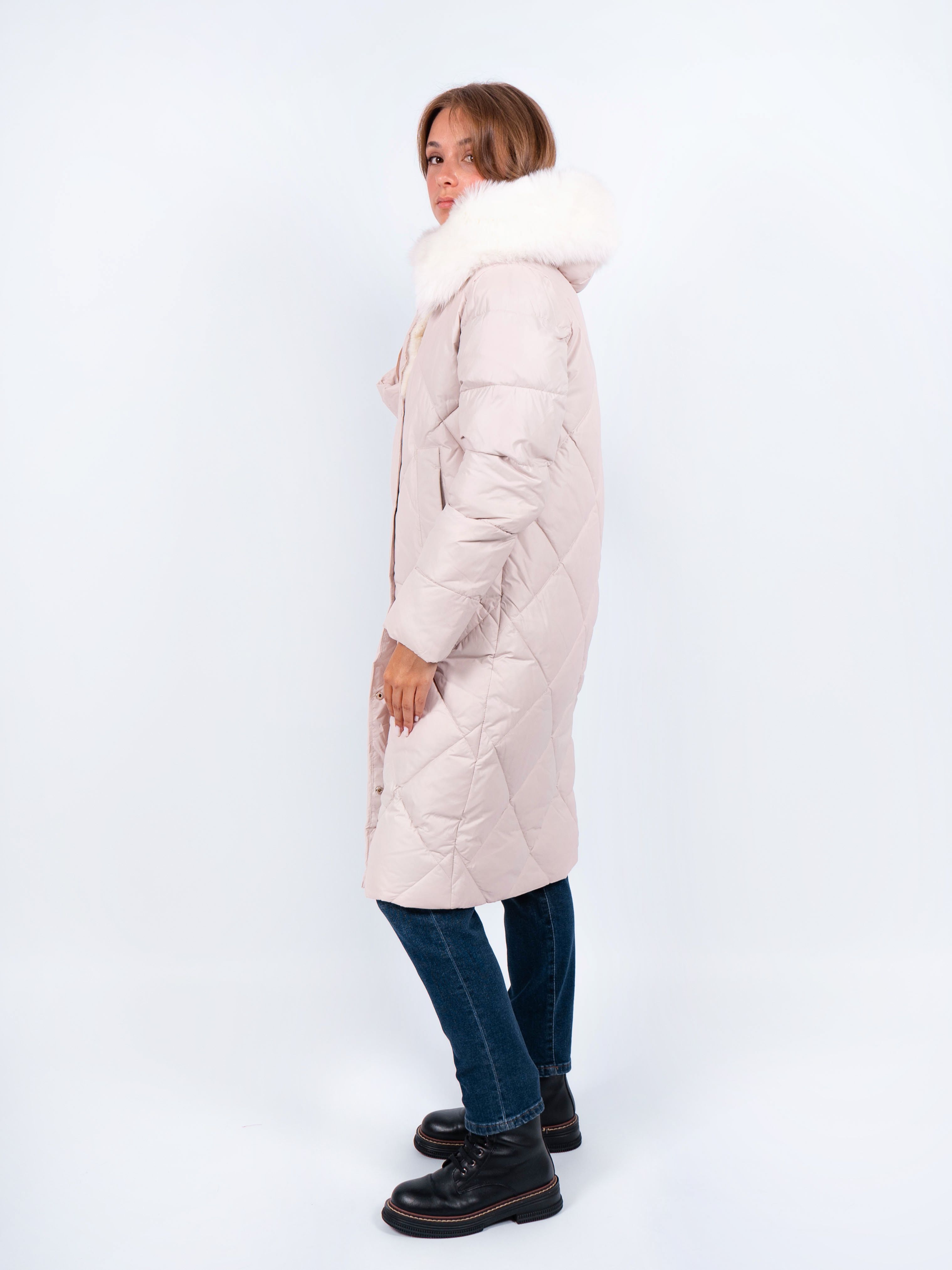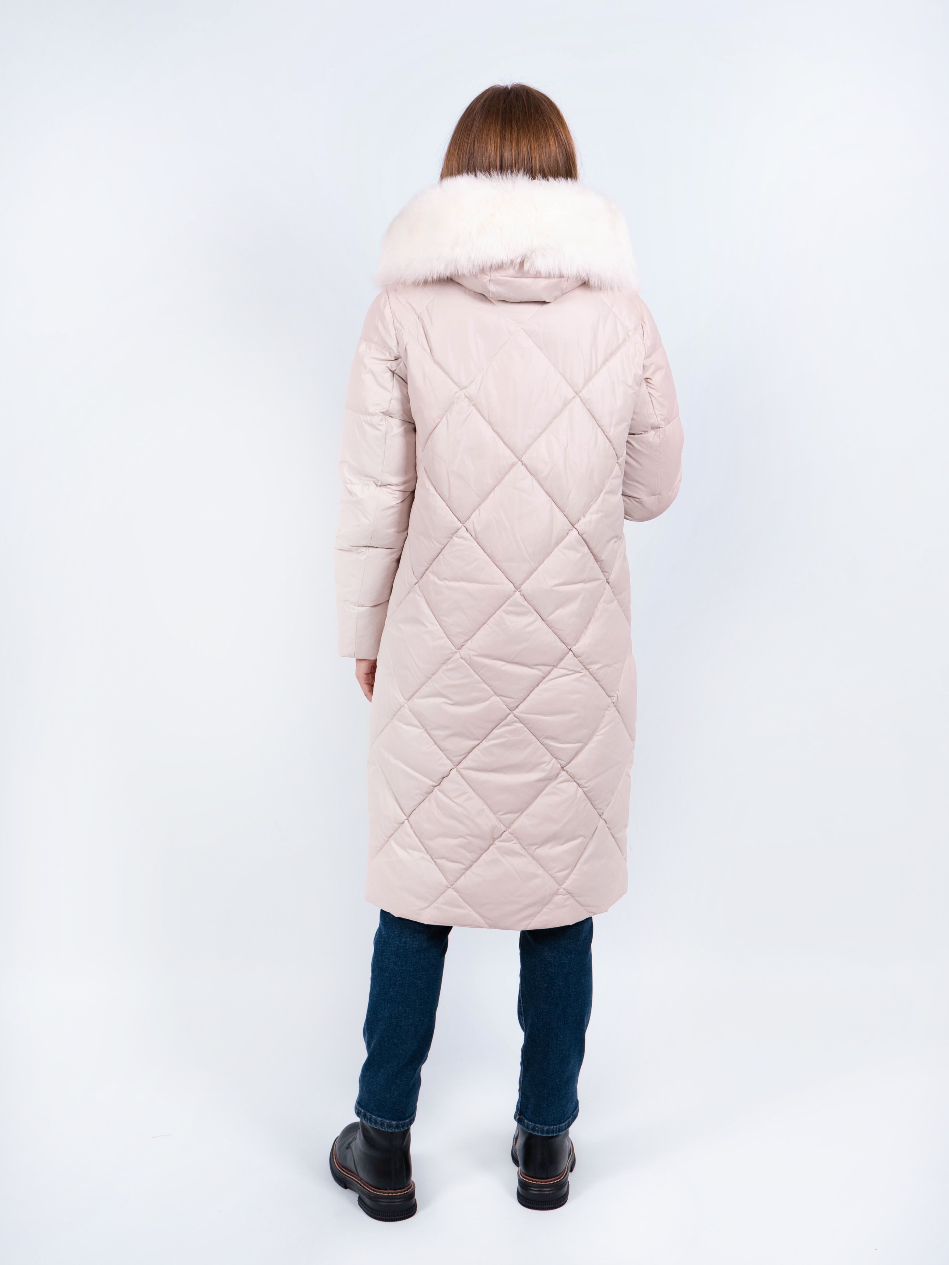 Дизайн данного пальто очаровывает своей простотой и изысканностью. Оно имеет удобную застежку на молнию и кнопки, что позволяет легко и быстро надевать и снимать куртку. Мех на капюшоне придает модели особую изящность и подчеркивает женственность образа. Мех на капюшоне съемный, капюшон не отстегивается. А карманы на кнопках не только добавляют функциональности, но и являются стильным акцентом на модели. Вы сможете без проблем хранить в них необходимые мелочи или просто разместить руки для дополнительного комфорта. Длина изделия 100 см.