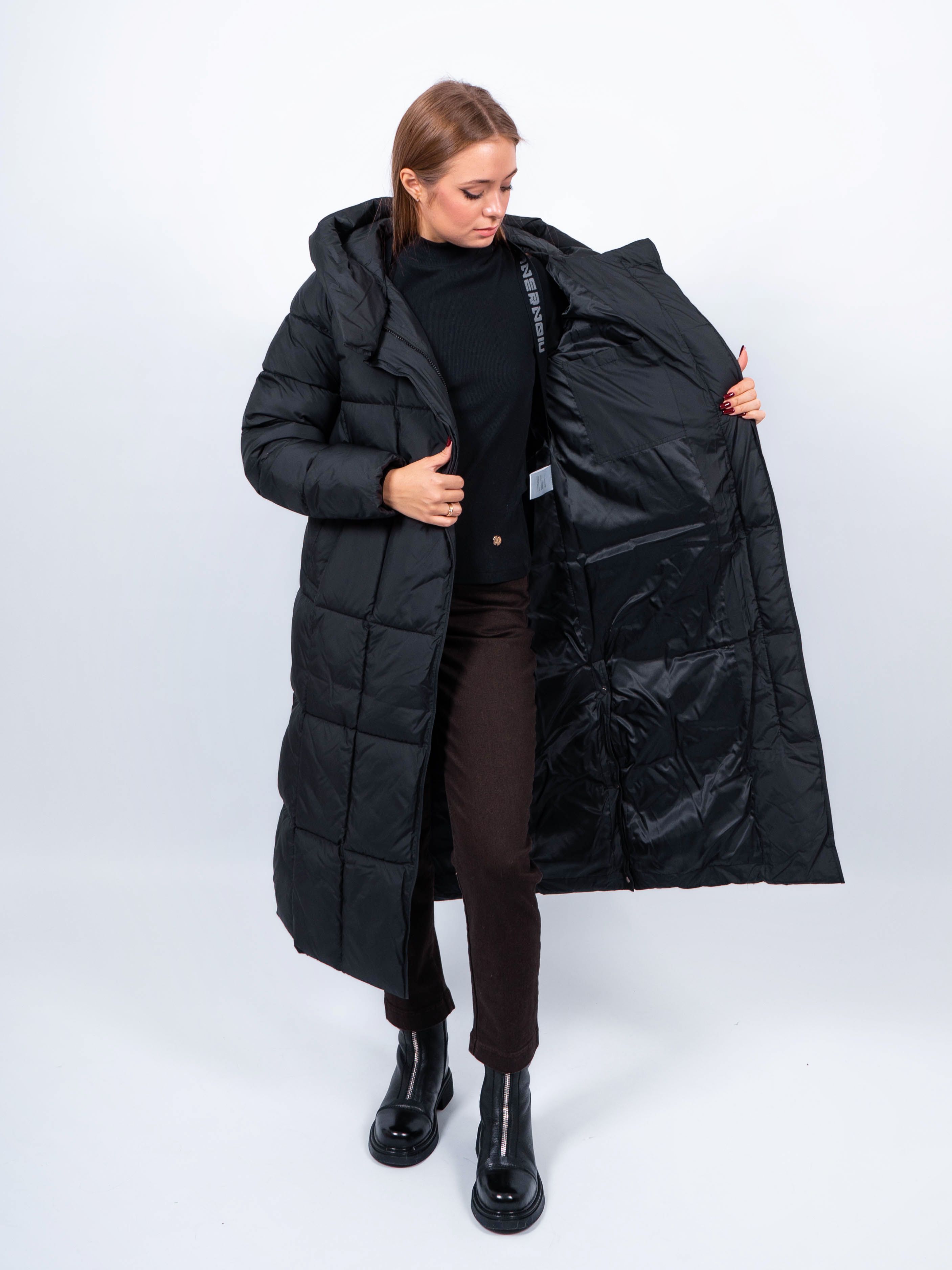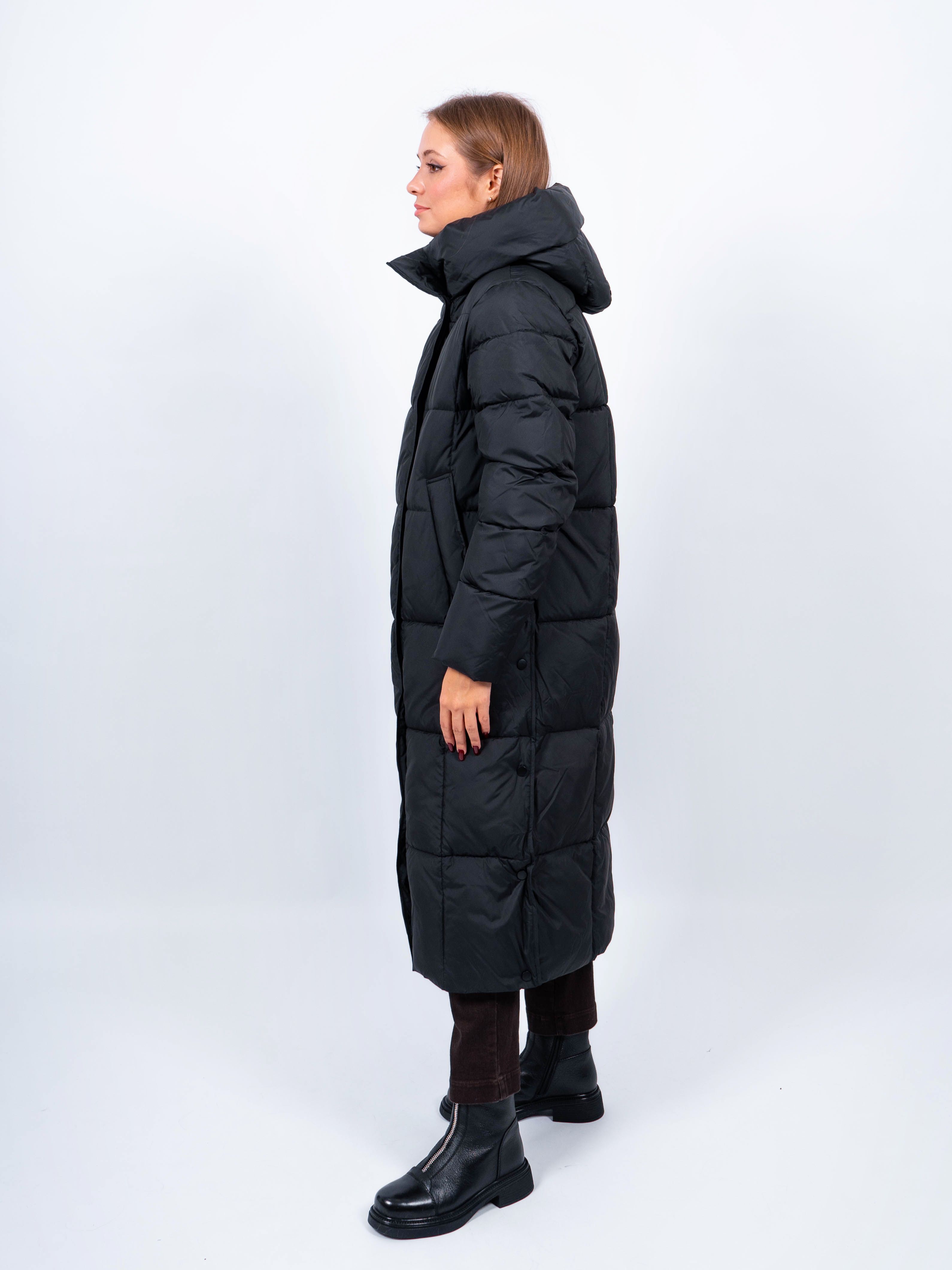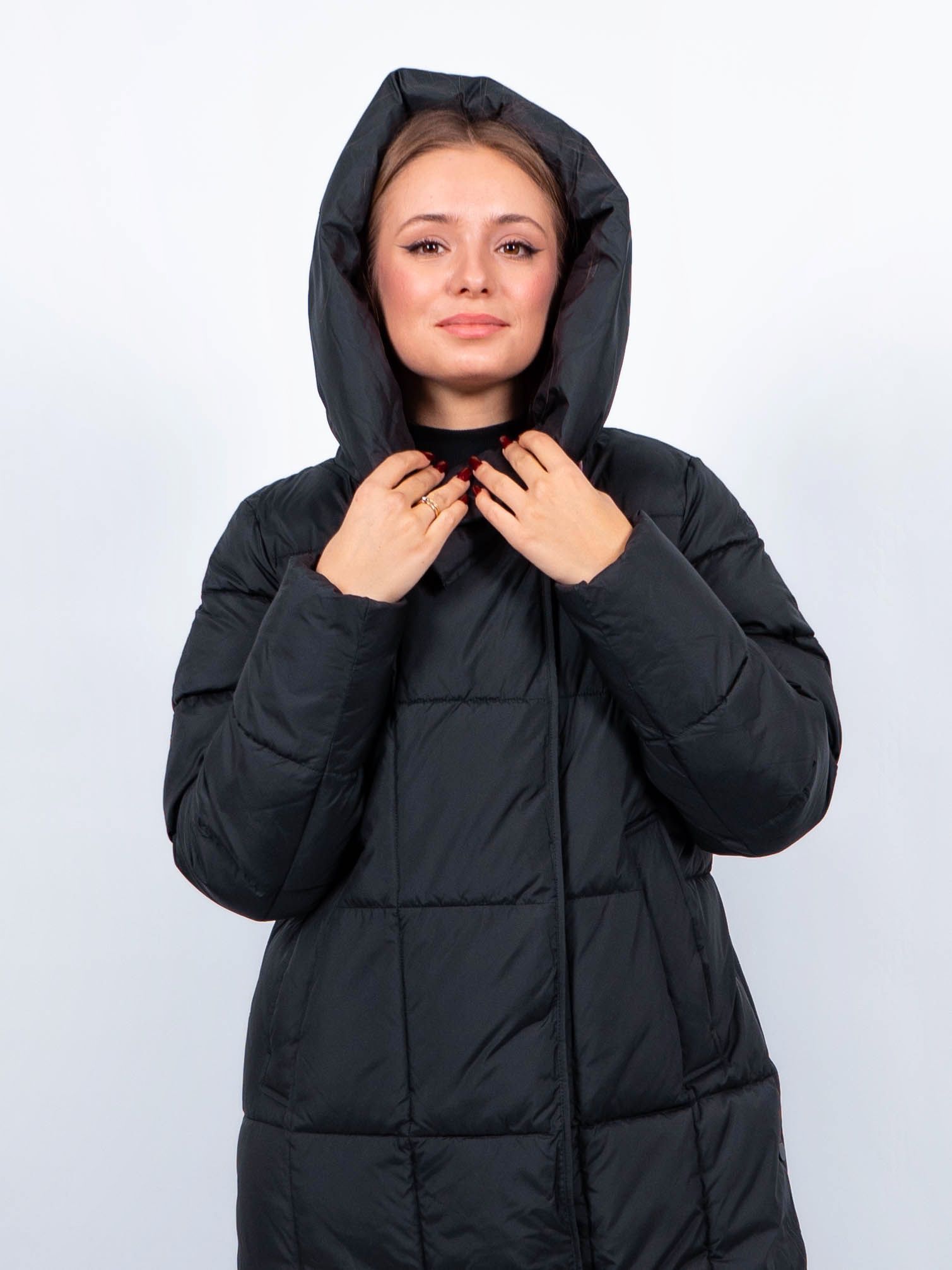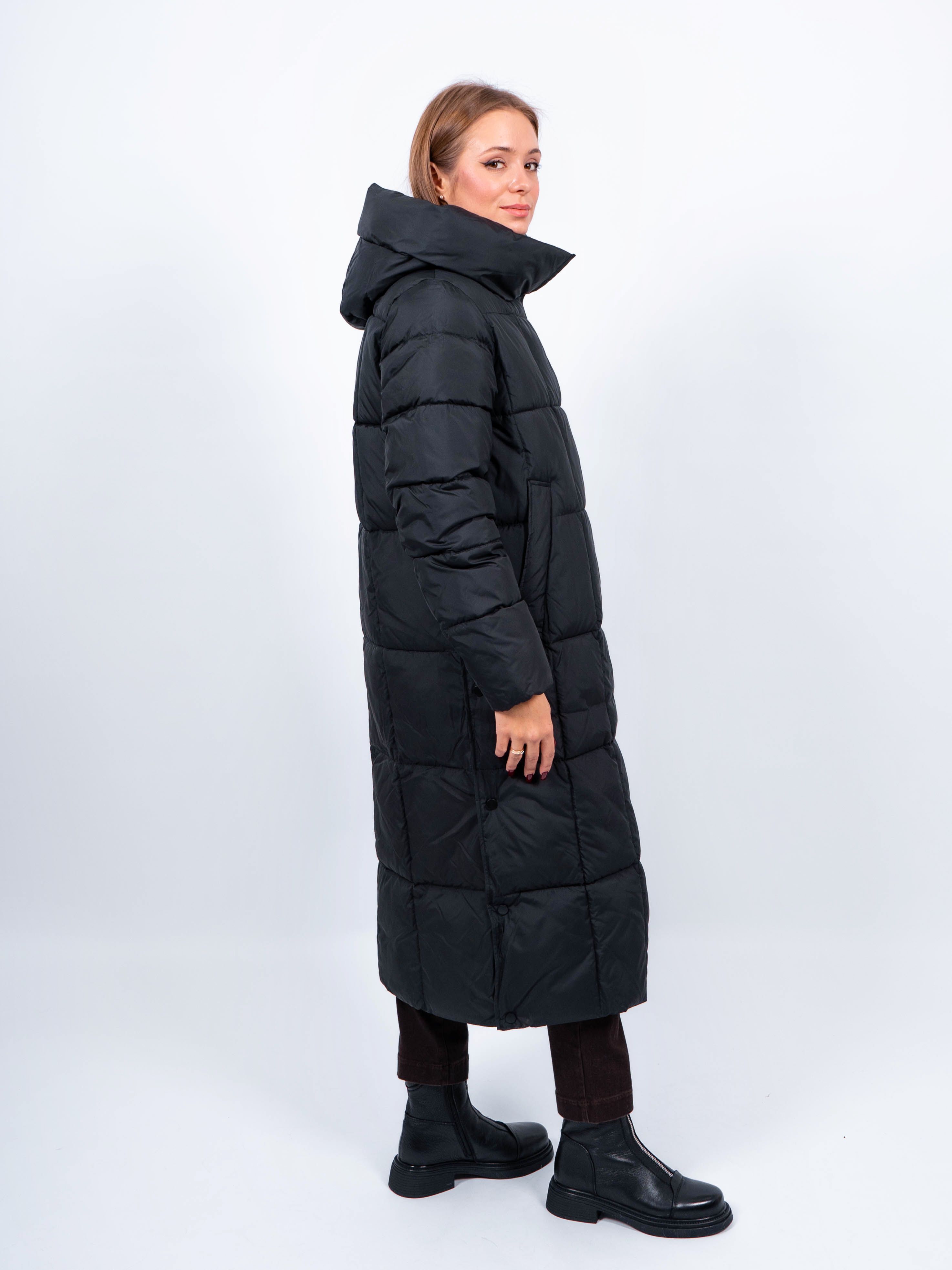 Зимняя куртка имеет удобную застежку - молния и магнитные скрытые кнопки, внутри куртки имеются бретели, что позволяет легко и быстро надевать и снимать куртку. Рукав втачной прямой. Снизу по бокам имеются функциональные кнопки, расстегиваются, что обеспечивает дополнительное удобство и является стильным акцентом. Воротник стойка. Длина изделия до середины икры - 115 см, подходит на рост 165-170 см. Размерный ряд с 42 по 50. Пальто черного цвета хорошо сочетается с обувью любого фасона.