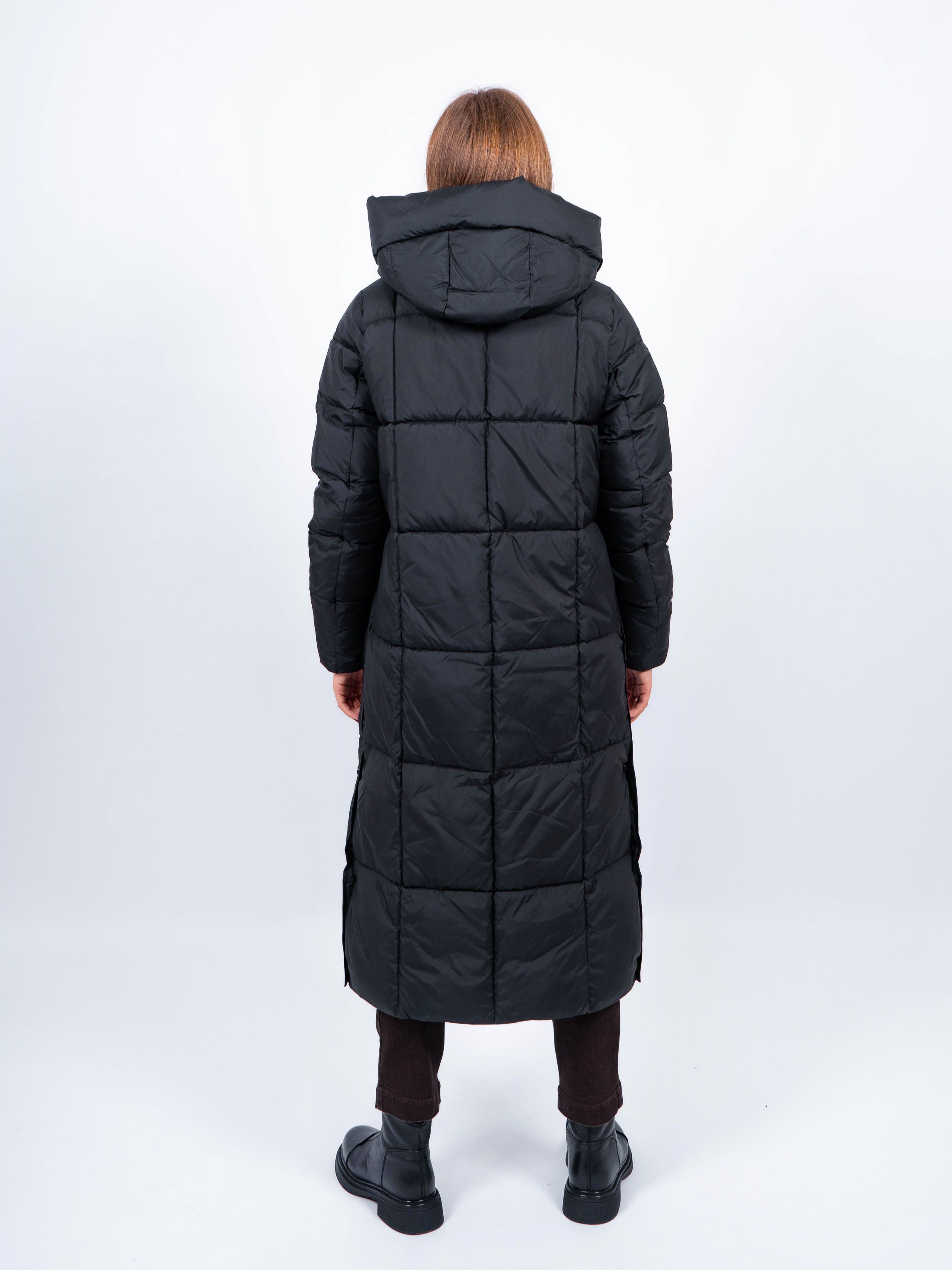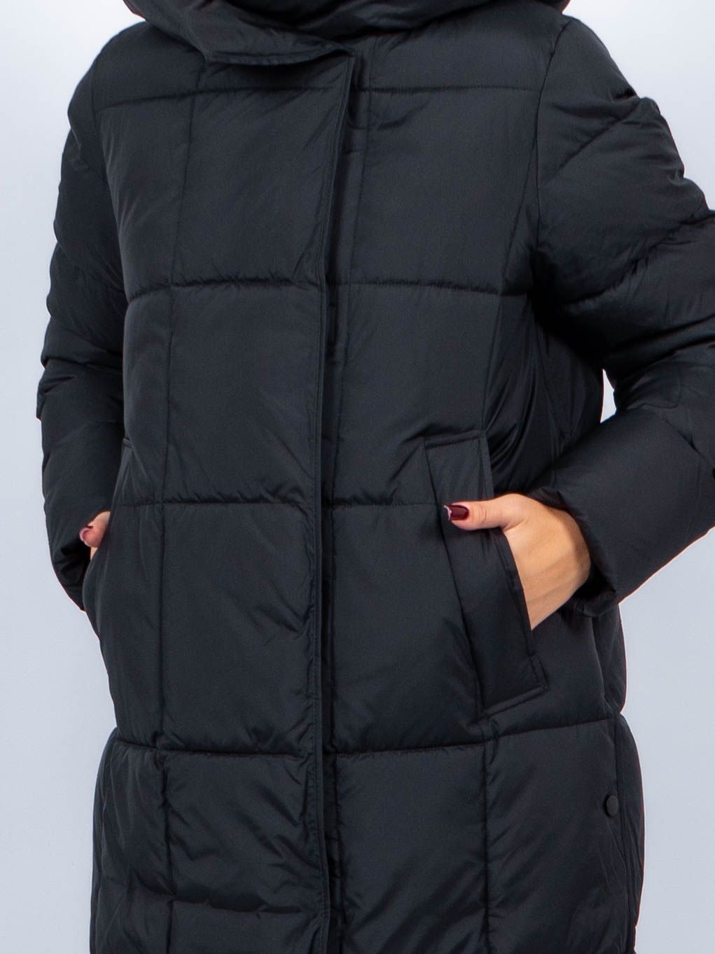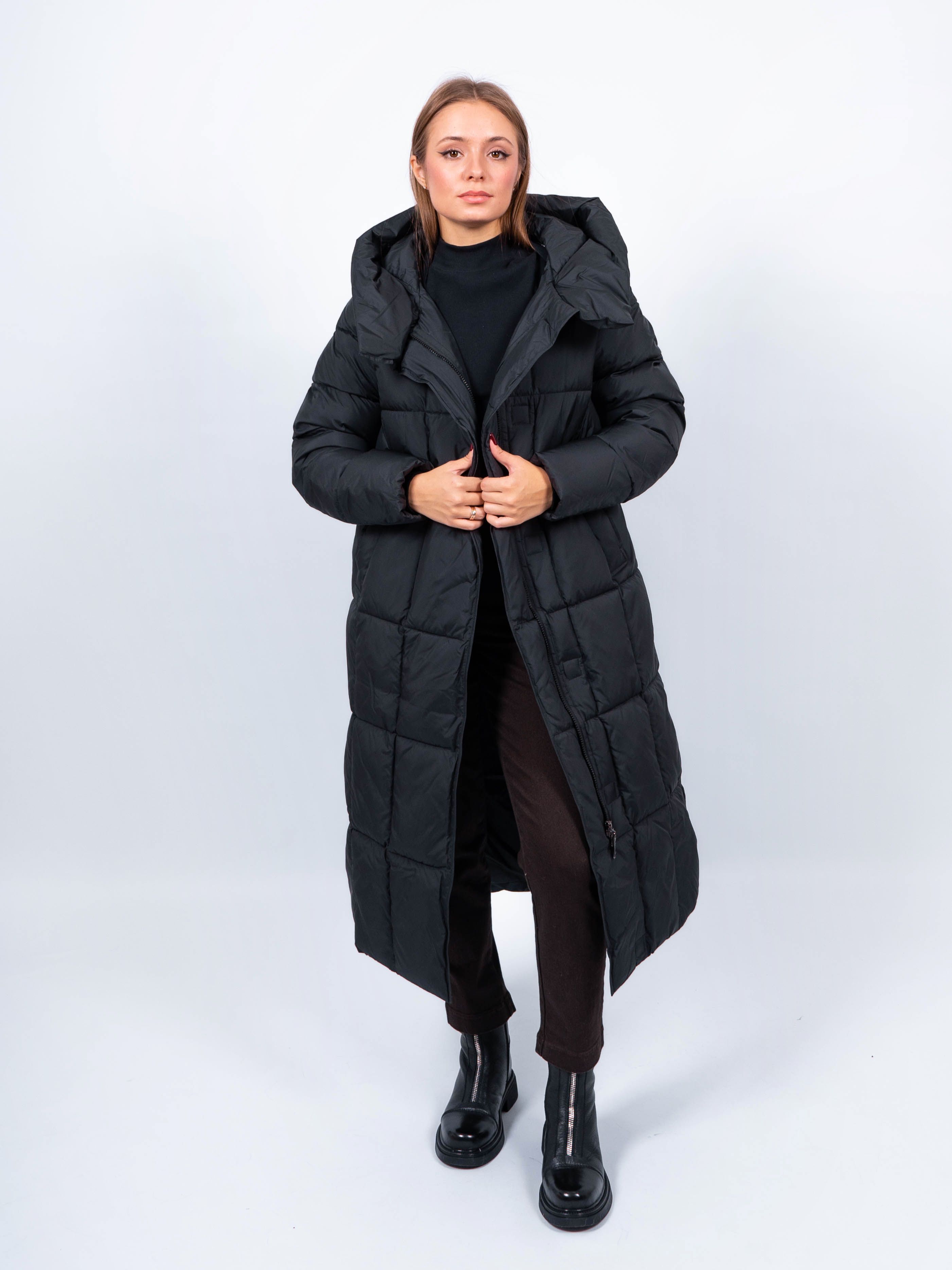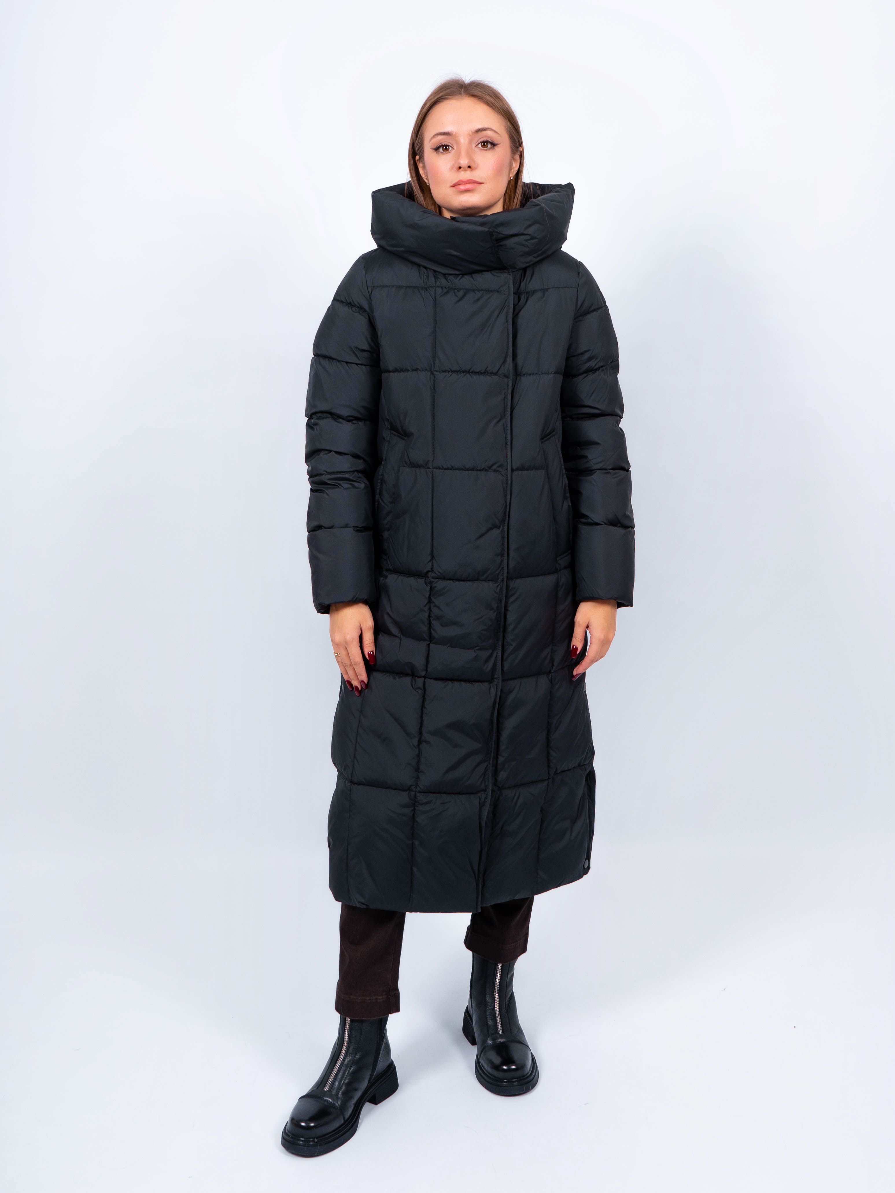 Зимняя куртка имеет удобную застежку - молния и магнитные скрытые кнопки, внутри куртки имеются бретели, что позволяет легко и быстро надевать и снимать куртку. Рукав втачной прямой. Снизу по бокам имеются функциональные кнопки, расстегиваются, что обеспечивает дополнительное удобство и является стильным акцентом. Воротник стойка. Длина изделия до середины икры - 115 см, подходит на рост 165-170 см. Размерный ряд с 42 по 50. Пальто черного цвета хорошо сочетается с обувью любого фасона.