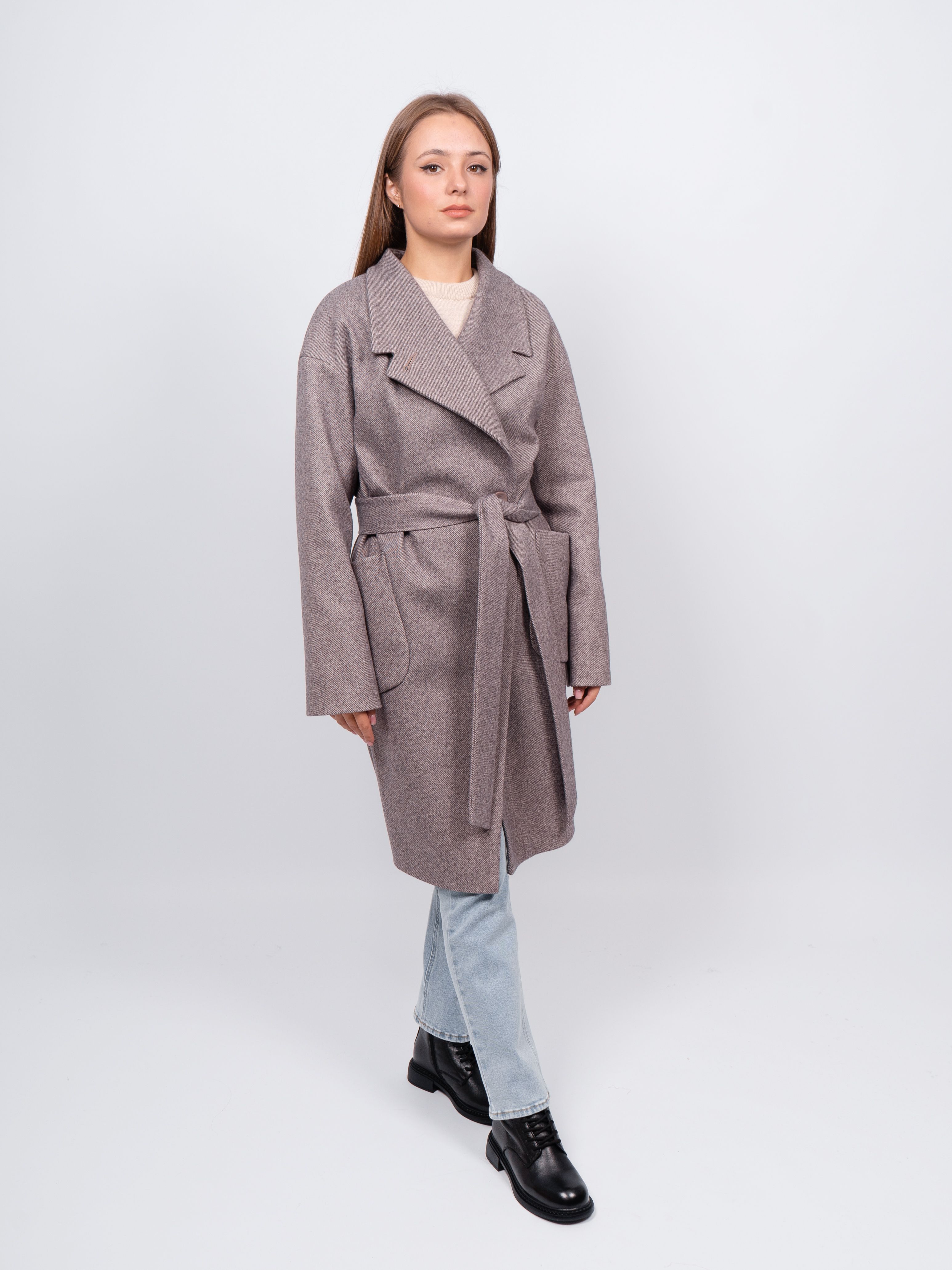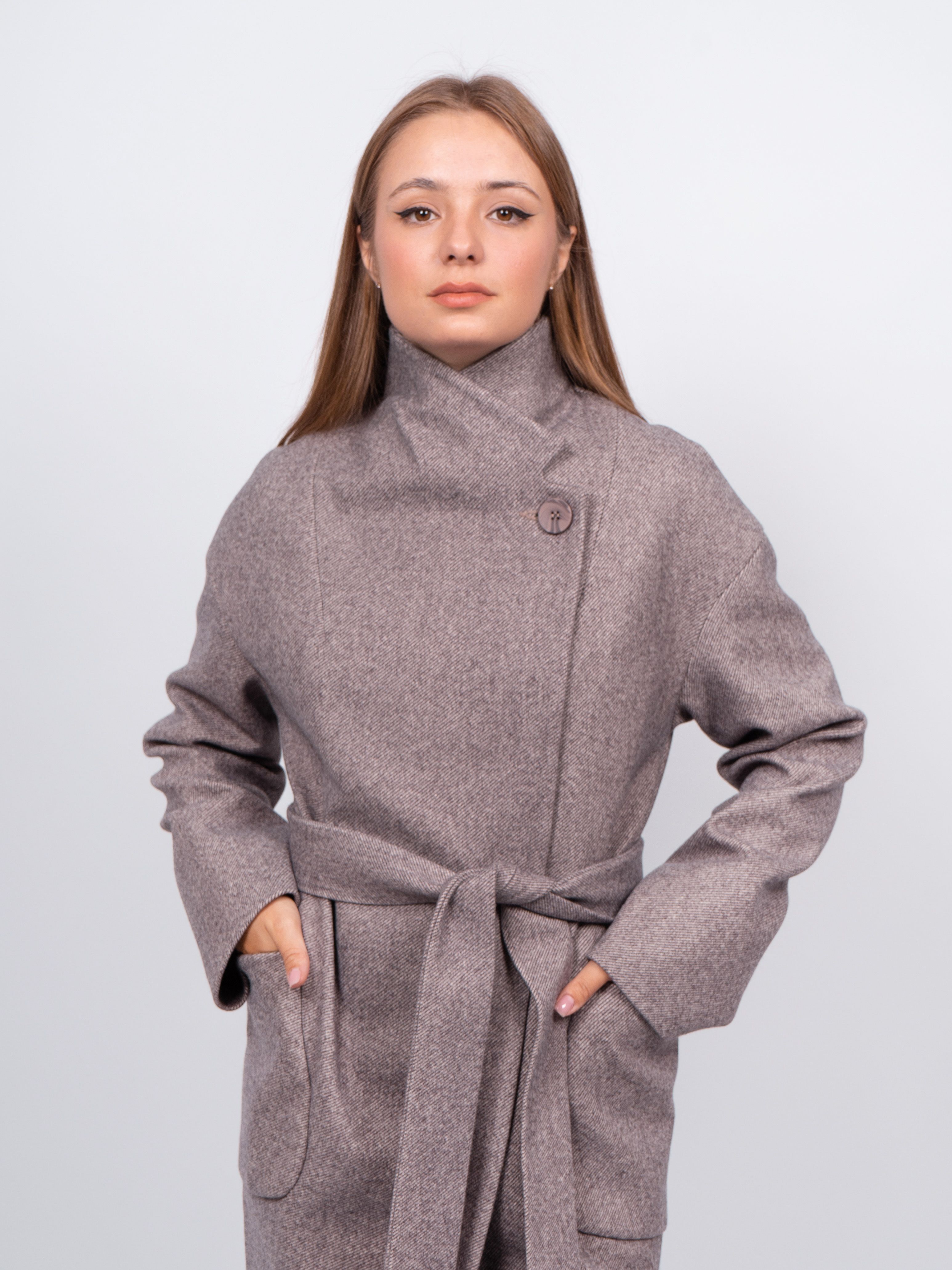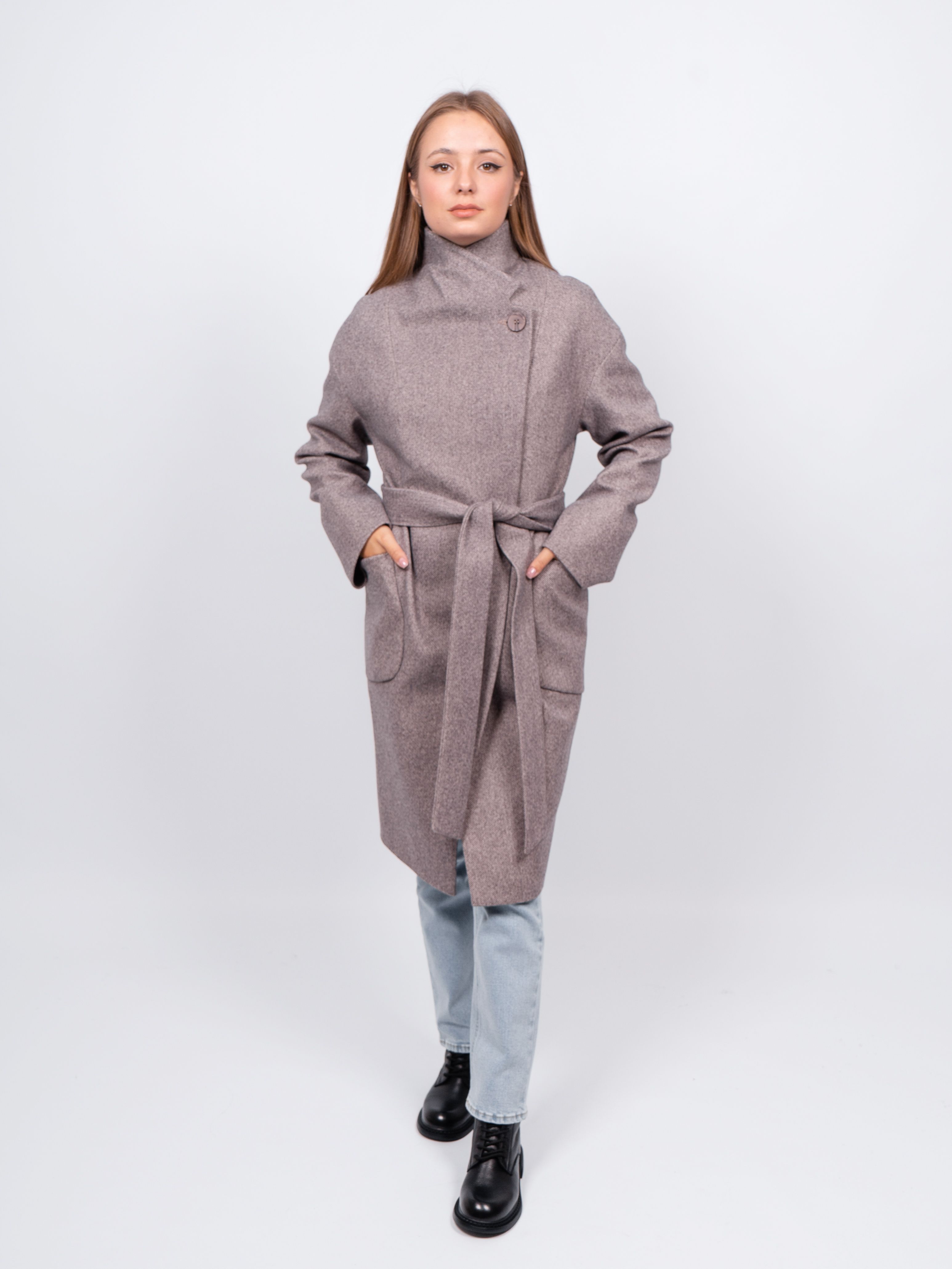 Пальто на запах, прямого силуэта, застежка - пуговицы, имеется широкий пояс. Длина пальто 100 см, размерный ряд с 42 по 50 российский размер, подходит на рост 165-175 см. У пальто имеются два больших накладных кармана, широкий английский воротник, у которого есть на лацканах пуговица и люверс, благодаря которым воротник трансформируется в воротник - стойку.