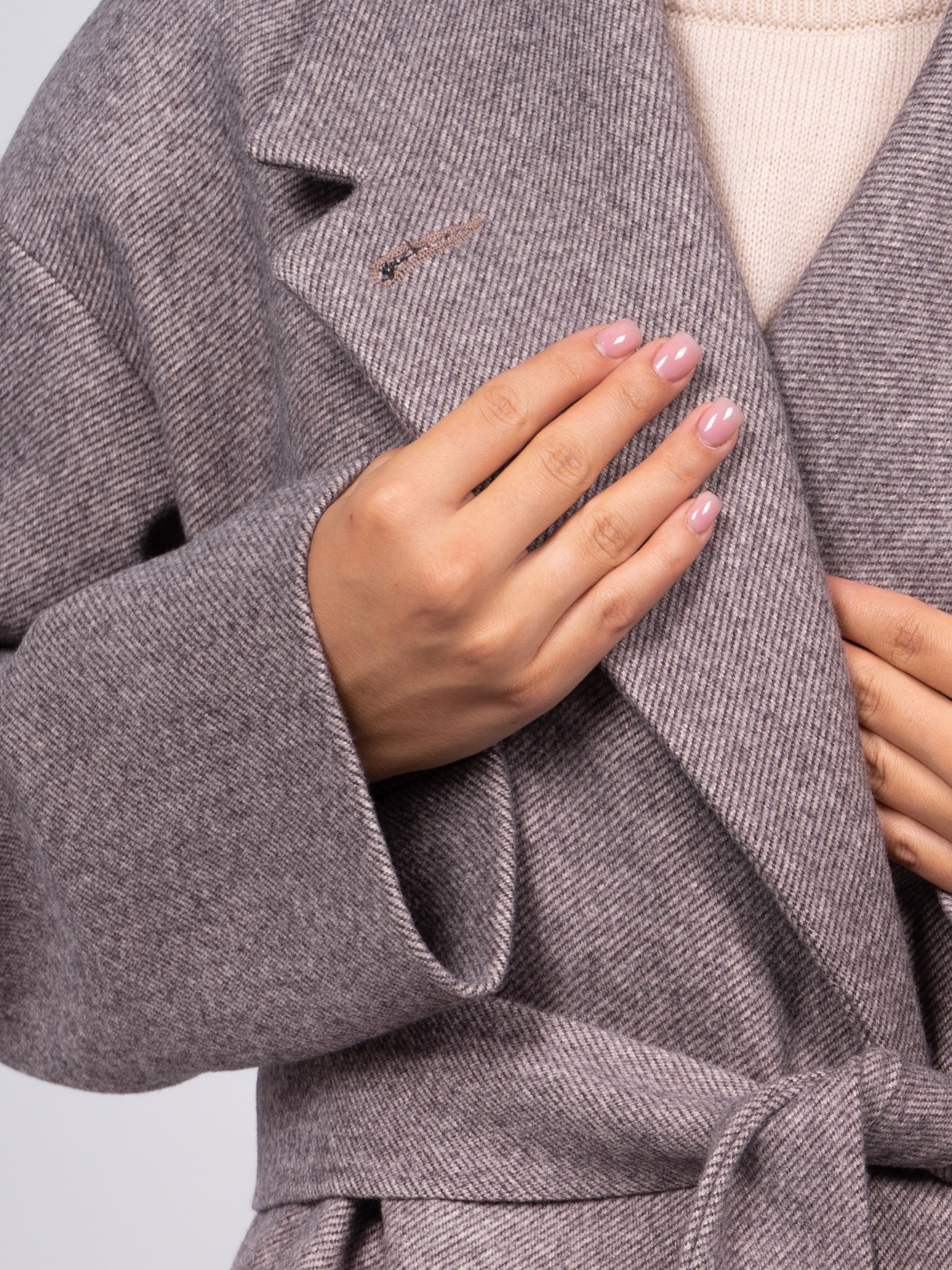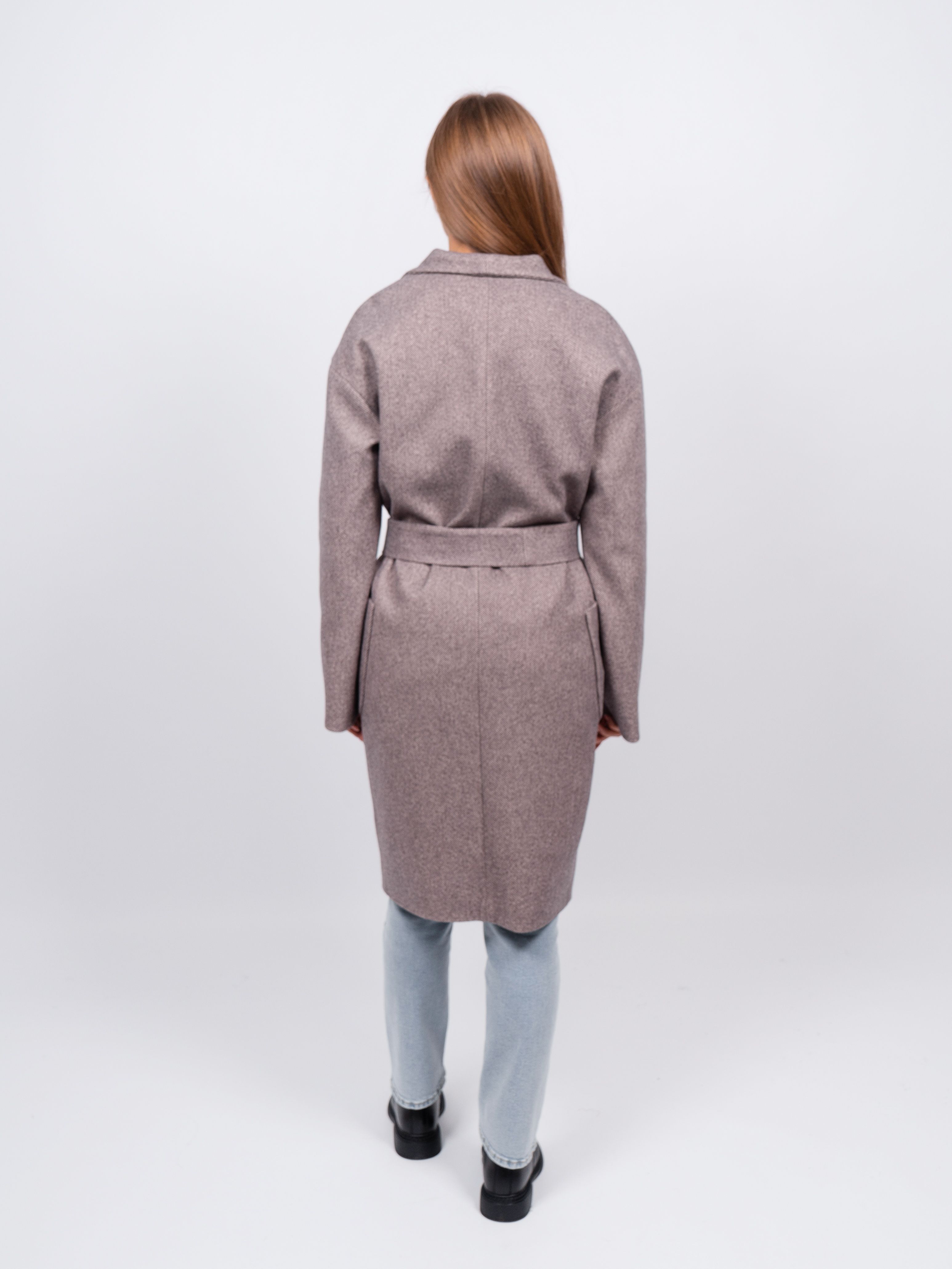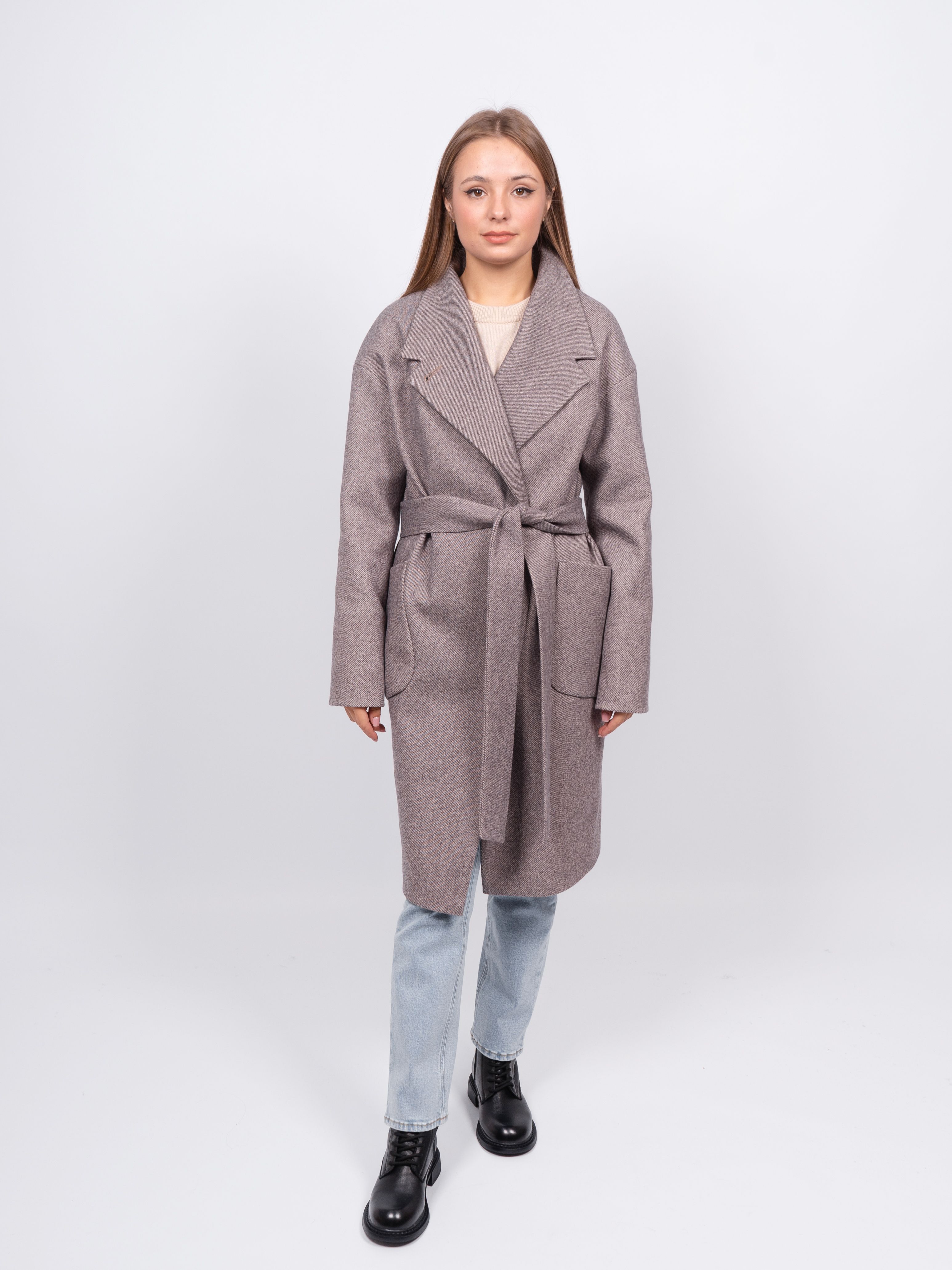 Пальто на запах, прямого силуэта, застежка - пуговицы, имеется широкий пояс. Длина пальто 100 см, размерный ряд с 42 по 50 российский размер, подходит на рост 165-175 см. У пальто имеются два больших накладных кармана, широкий английский воротник, у которого есть на лацканах пуговица и люверс, благодаря которым воротник трансформируется в воротник - стойку.