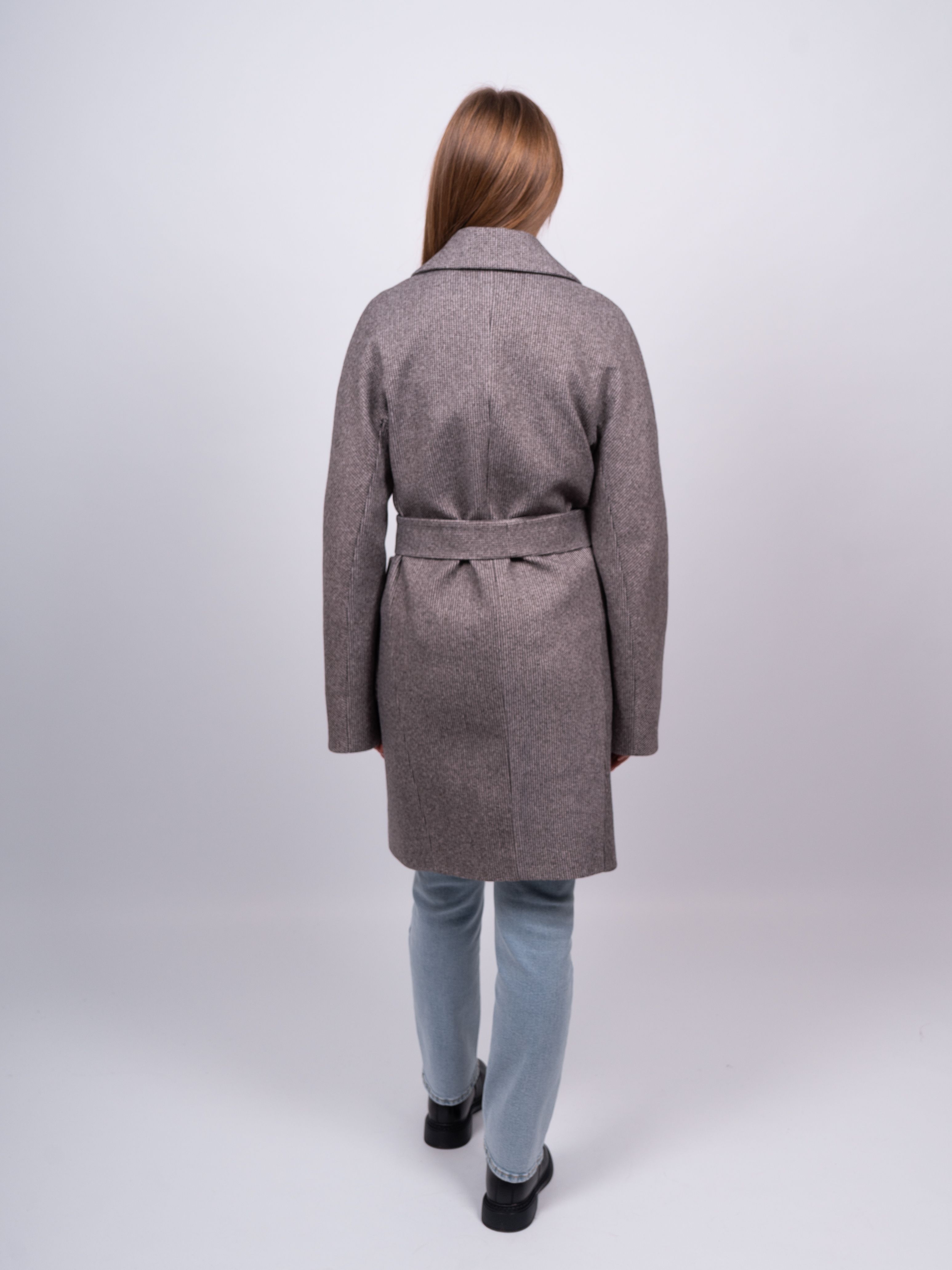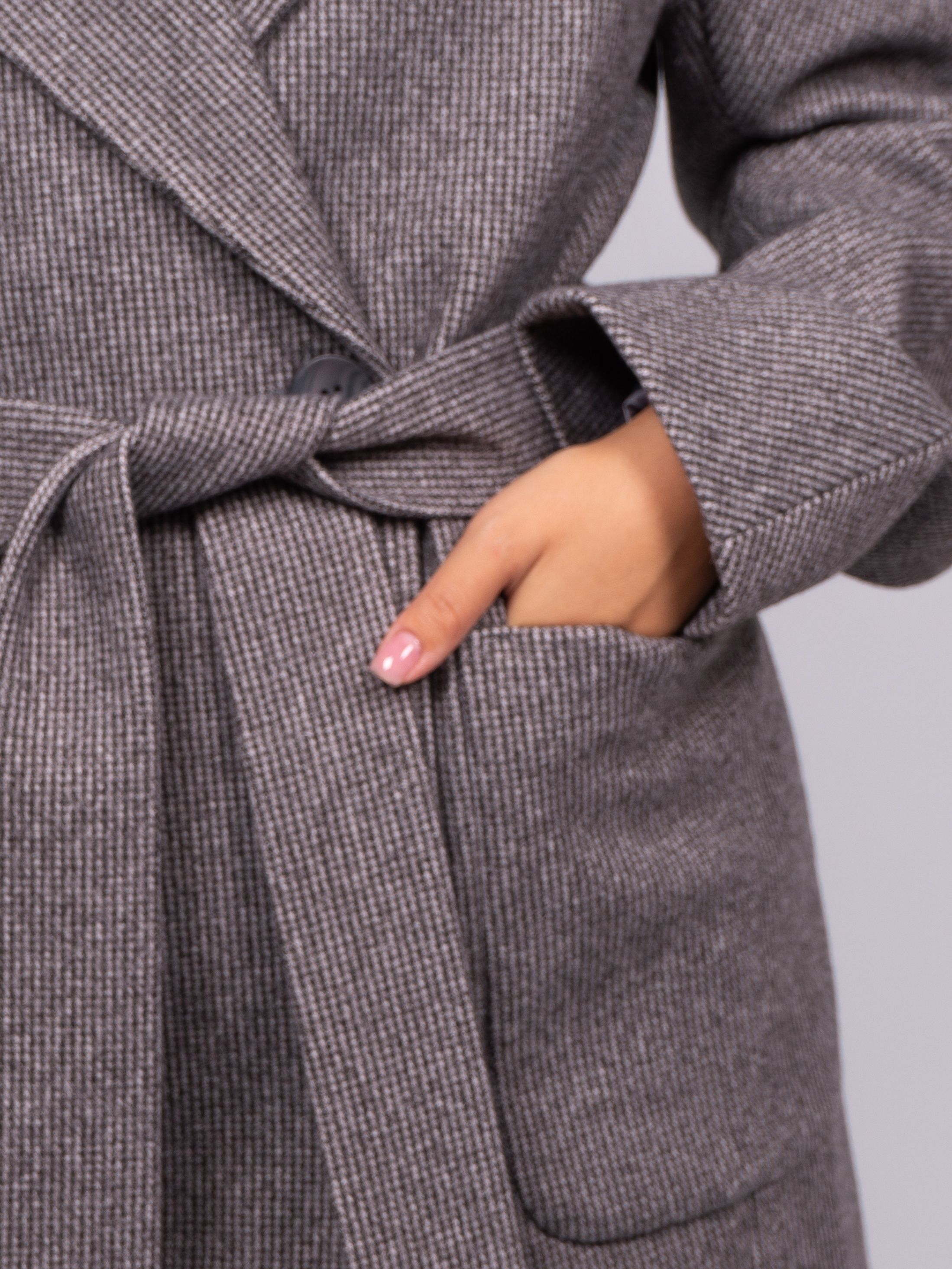 Пальто на запах, прямого силуэта, потайная застежка - пуговицы, имеется широкий пояс. Длина пальто 100 см, размерный ряд с 42 по 48 российский размер, подходит на рост 165-175 см. У пальто имеются два удобных накладных кармана, английский воротник.