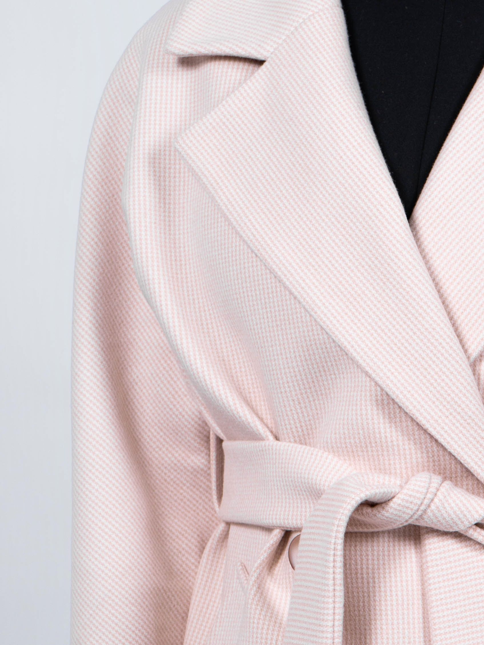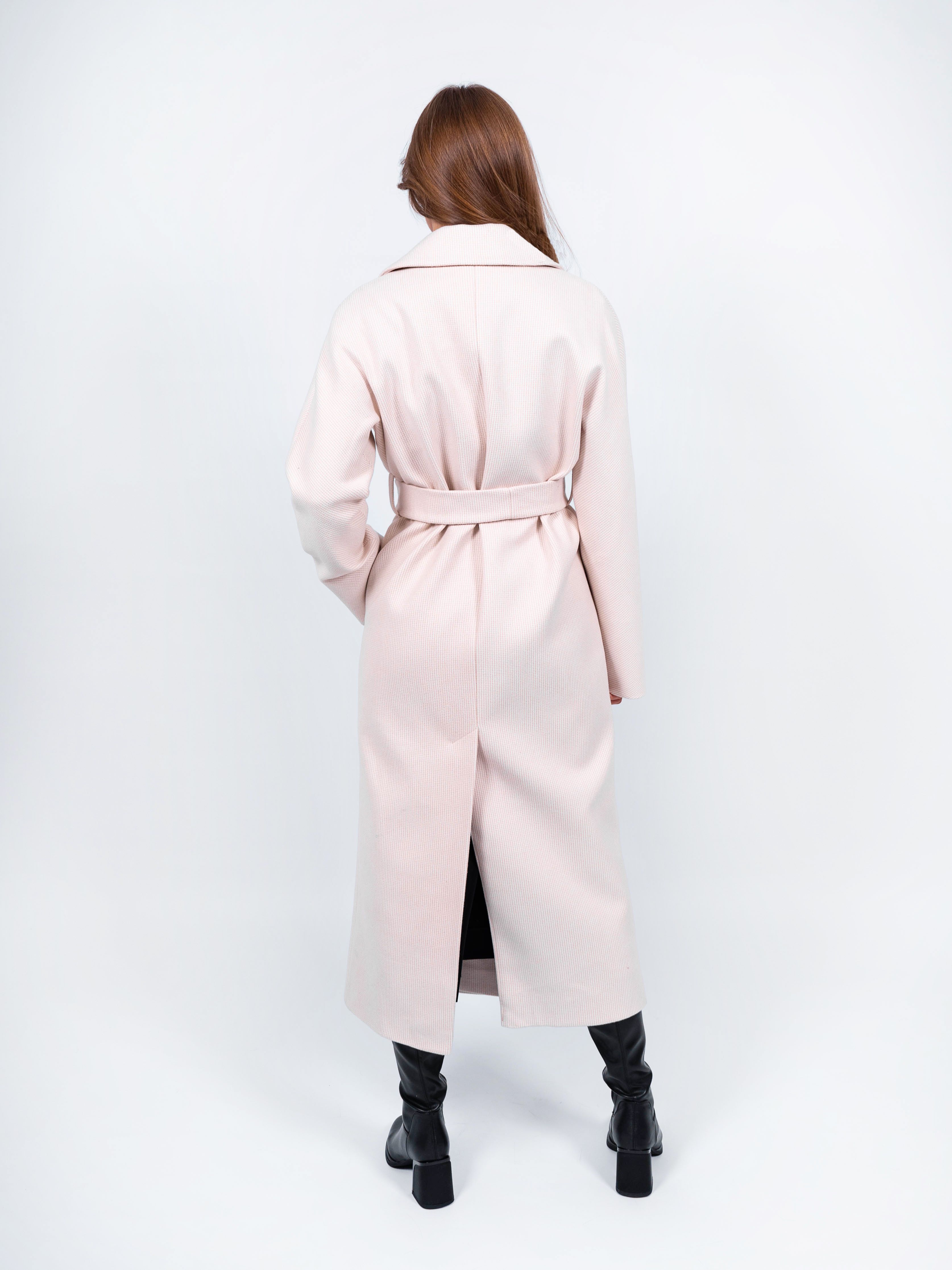Пальто на запах, прямого силуэта, потайная застежка - пуговицы, имеется широкий пояс. Длина пальто 125 см, размерный ряд с 42 по 48 российский размер, подходит на рост 165-175 см. У пальто имеются два удобных накладных кармана, английский воротник.